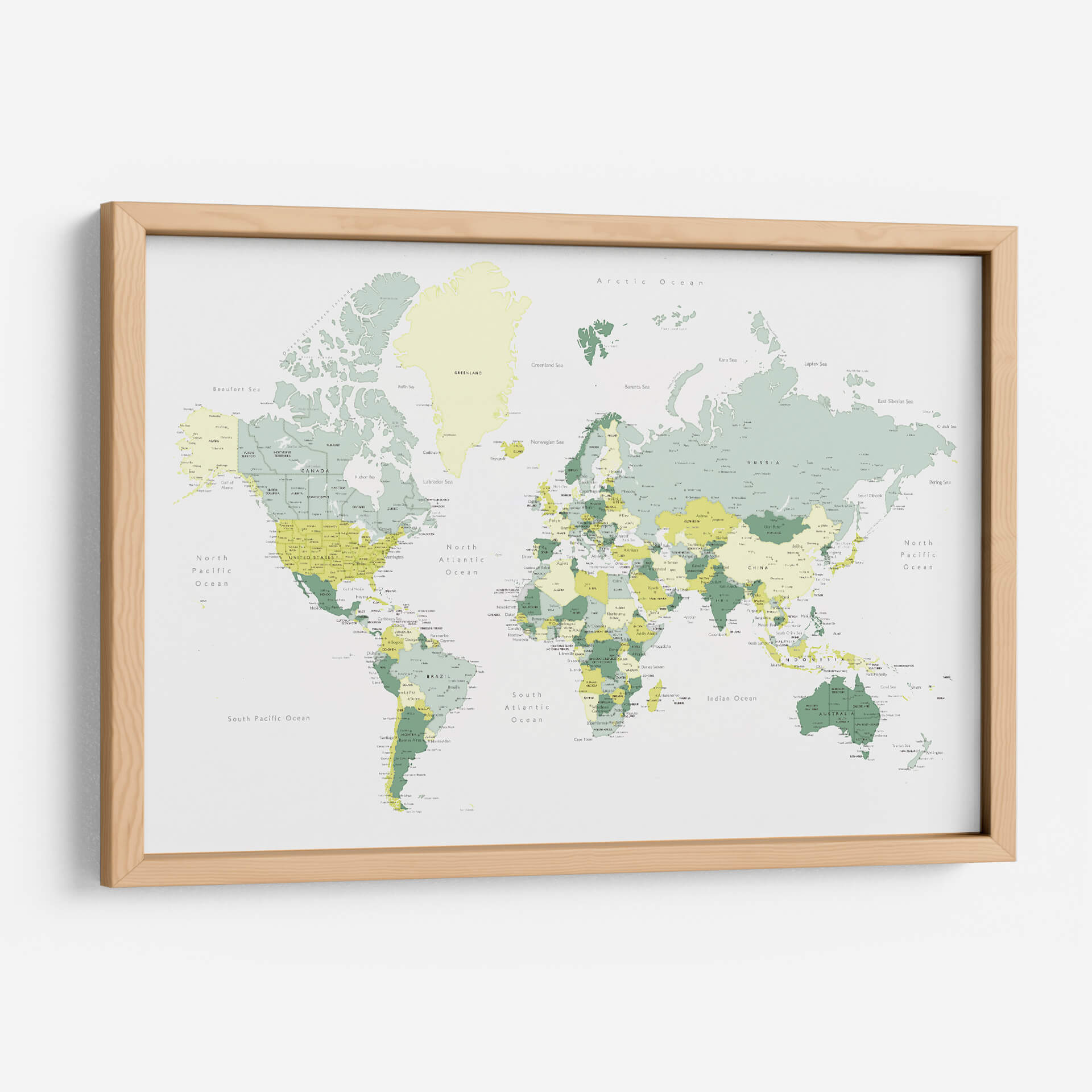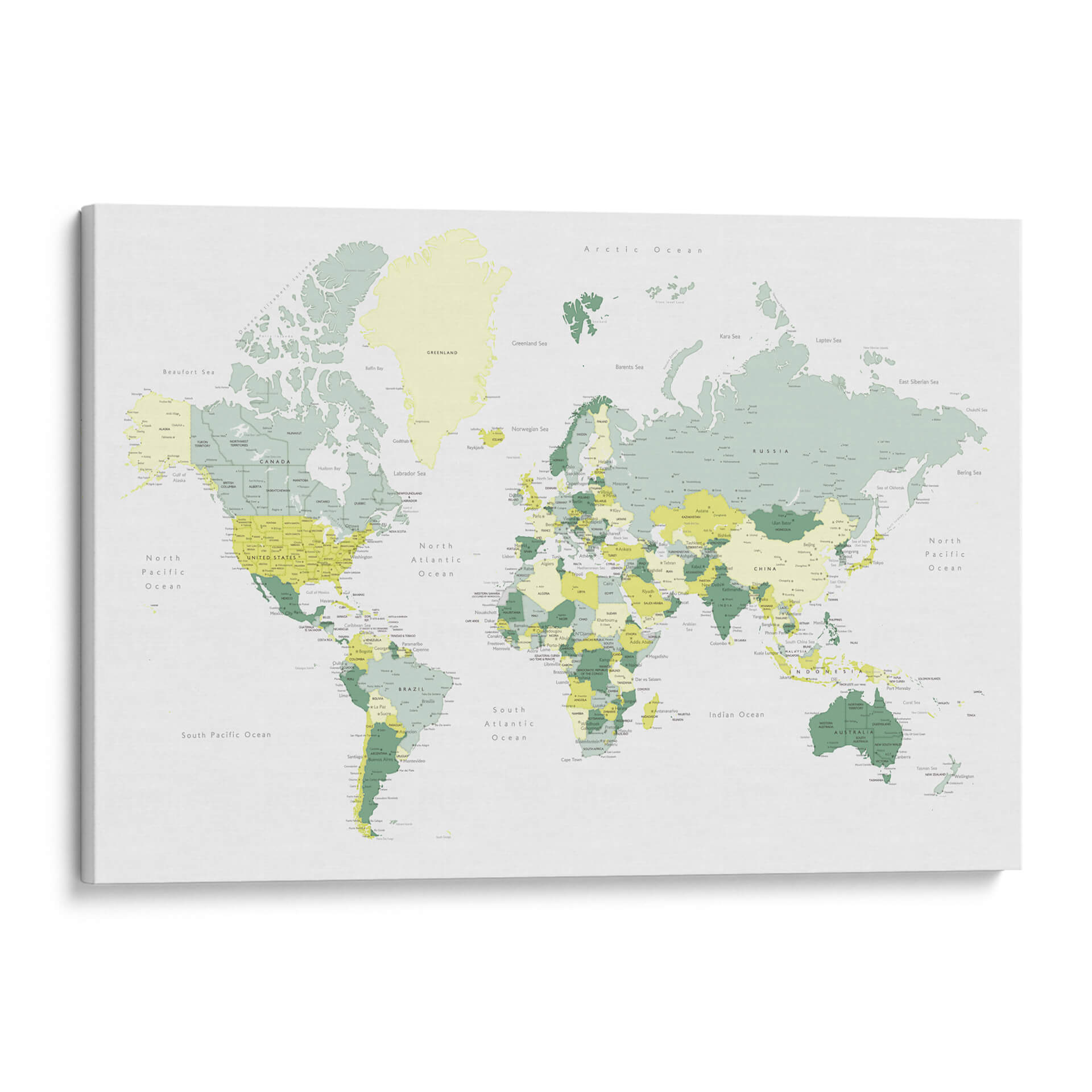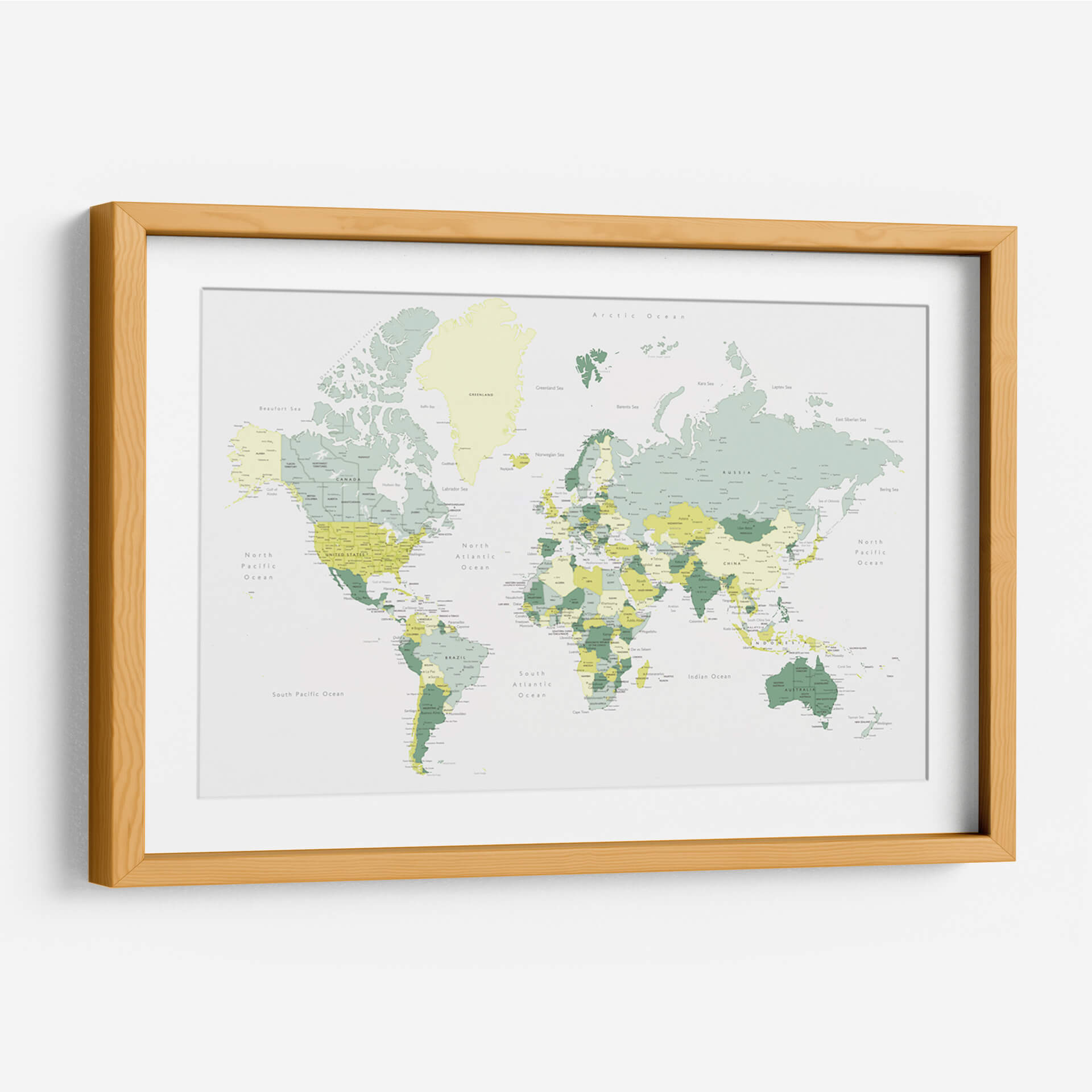 Descubre el mundo con nuestro exclusivo cuadro decorativo 'Mapa mundial verde con ciudades Kapueo', una obra de arte contemporánea de Rosana Laiz Blursbyai. Esta pieza evoca una sensación de exploración y conocimiento global, presentando un mapa del mundo estilizado en una paleta de colores serena que combina verdes suaves y tonos tierra. Los detalles de las ciudades están sutilmente integrados, ofreciendo una visión geográfica moderna y elegante. La composición es clara y equilibrada, ideal para inspirar curiosidad y añadir un toque intelectual a cualquier espacio. Perfecto para oficinas, estudios o salas de estar, este mapa decorativo invita a soñar con viajes y a conectar con la diversidad del planeta. Su diseño minimalista y contemporáneo lo convierte en un punto focal sofisticado que complementa a la perfección una decoración moderna o escandinava. Aporta una perspectiva global a tu hogar u oficina con este impresionante cuadro que celebra la geografía y el descubrimiento.