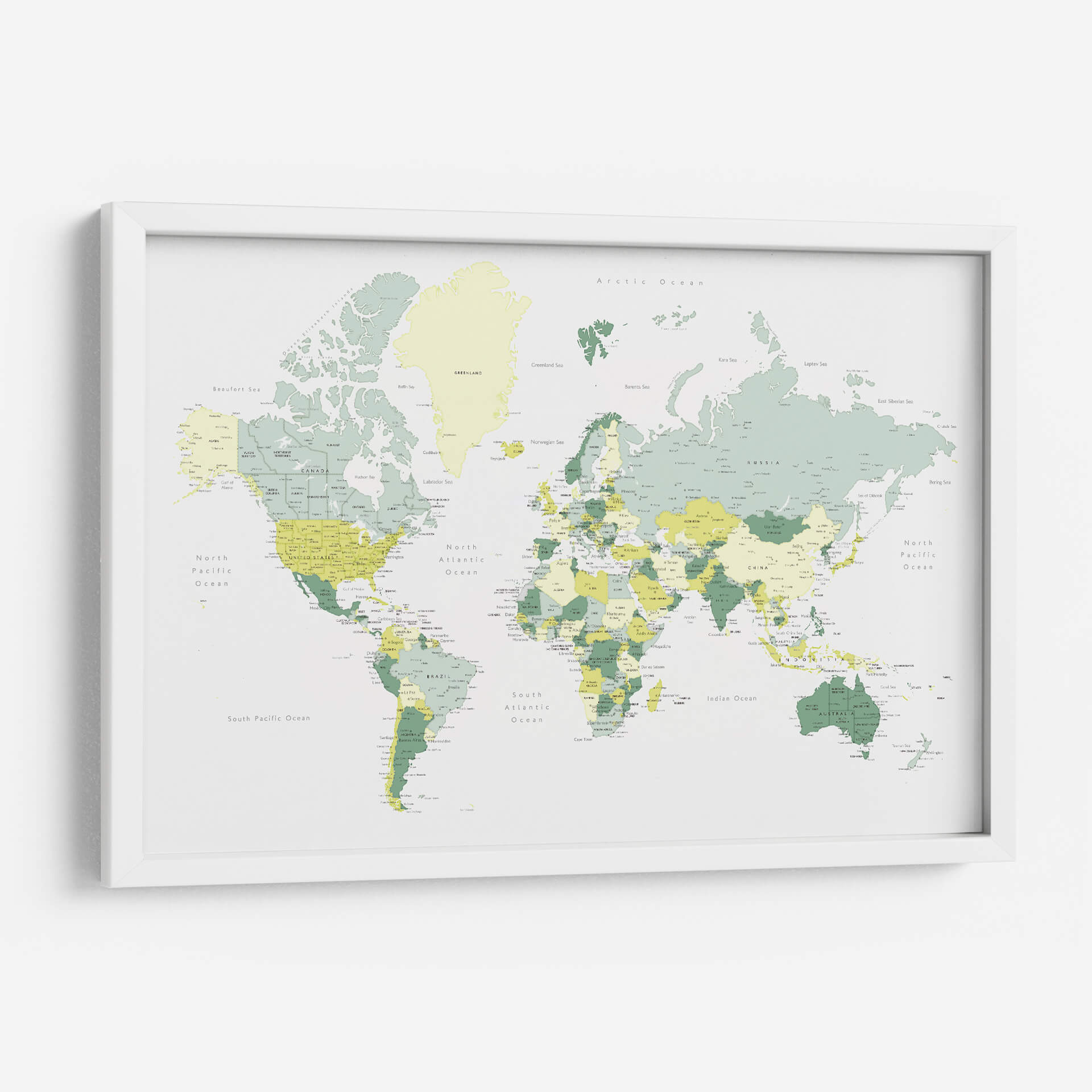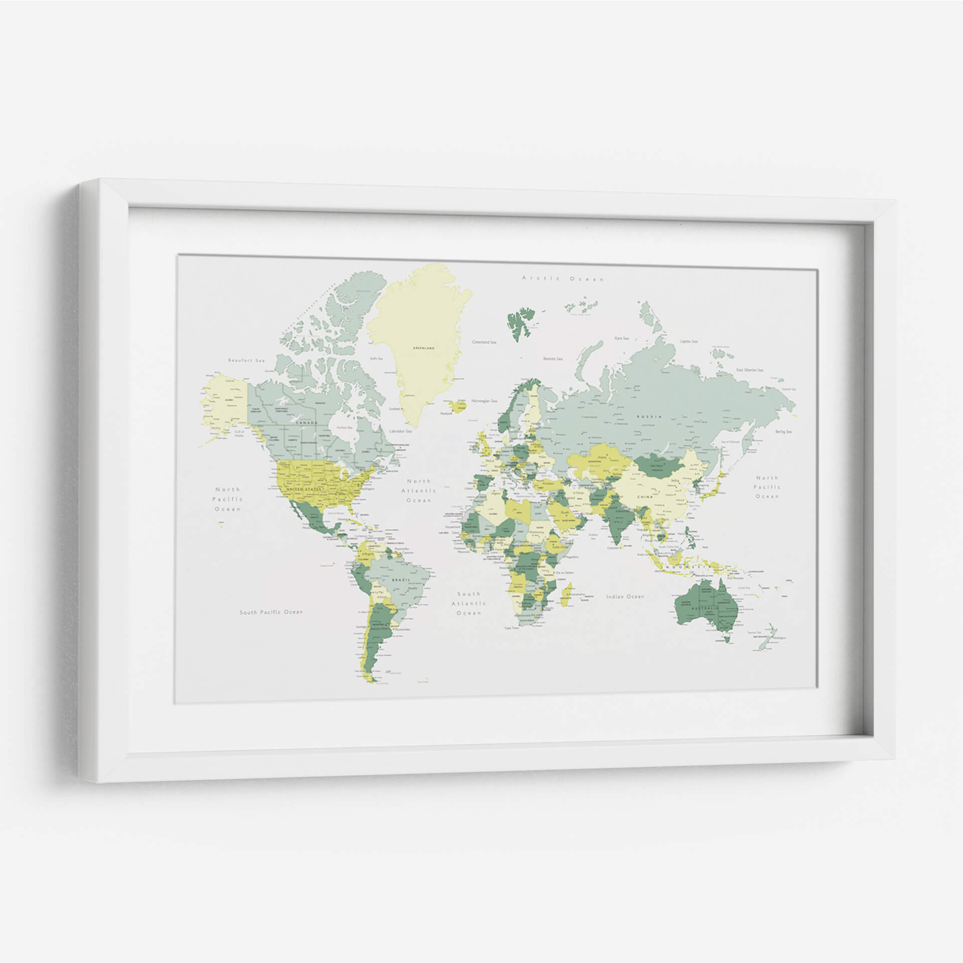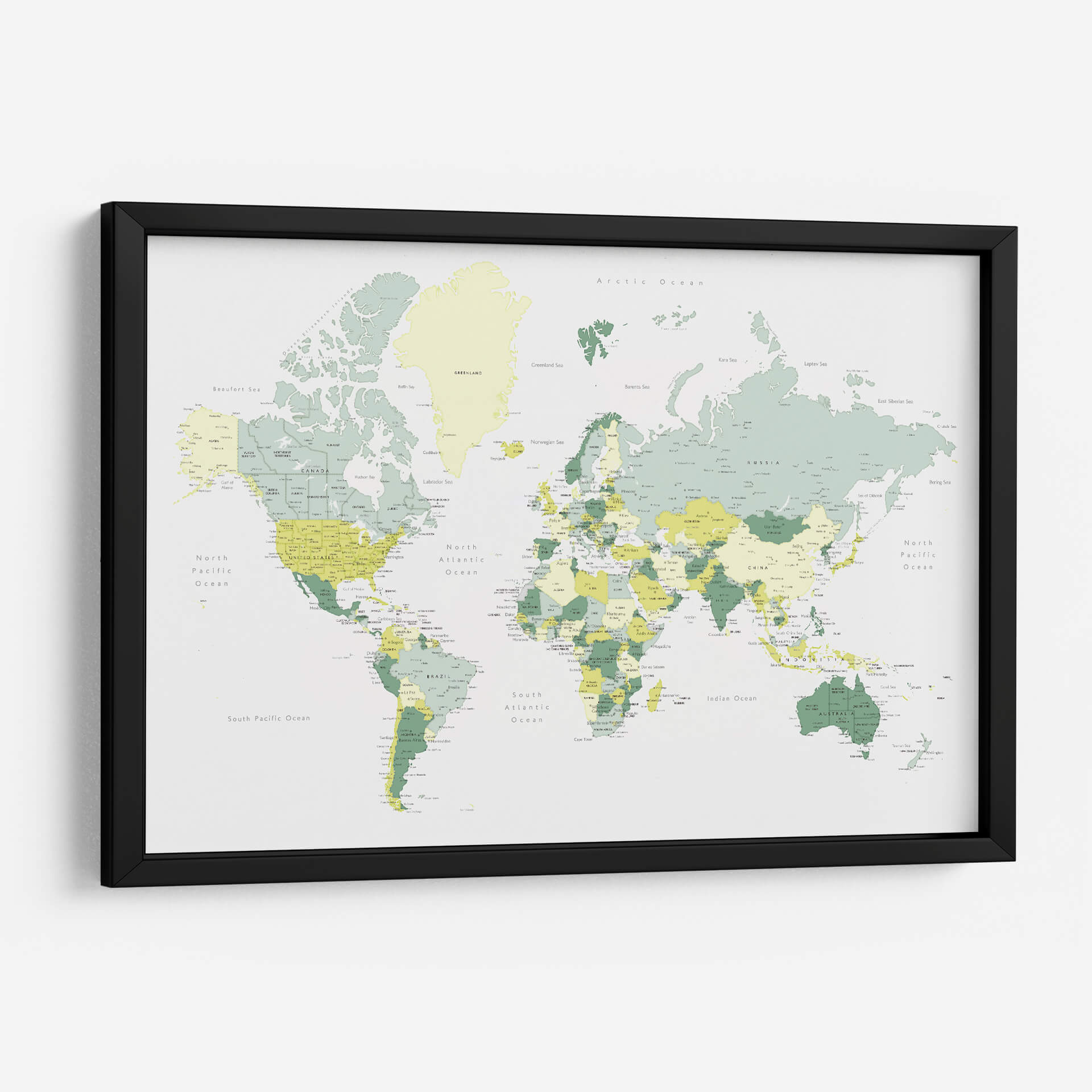 Descubre el mundo con nuestro exclusivo cuadro decorativo 'Mapa mundial verde con ciudades Kapueo', una obra de arte contemporánea de Rosana Laiz Blursbyai. Esta pieza evoca una sensación de exploración y conocimiento global, presentando un mapa del mundo estilizado en una paleta de colores serena que combina verdes suaves y tonos tierra. Los detalles de las ciudades están sutilmente integrados, ofreciendo una visión geográfica moderna y elegante. La composición es clara y equilibrada, ideal para inspirar curiosidad y añadir un toque intelectual a cualquier espacio. Perfecto para oficinas, estudios o salas de estar, este mapa decorativo invita a soñar con viajes y a conectar con la diversidad del planeta. Su diseño minimalista y contemporáneo lo convierte en un punto focal sofisticado que complementa a la perfección una decoración moderna o escandinava. Aporta una perspectiva global a tu hogar u oficina con este impresionante cuadro que celebra la geografía y el descubrimiento.