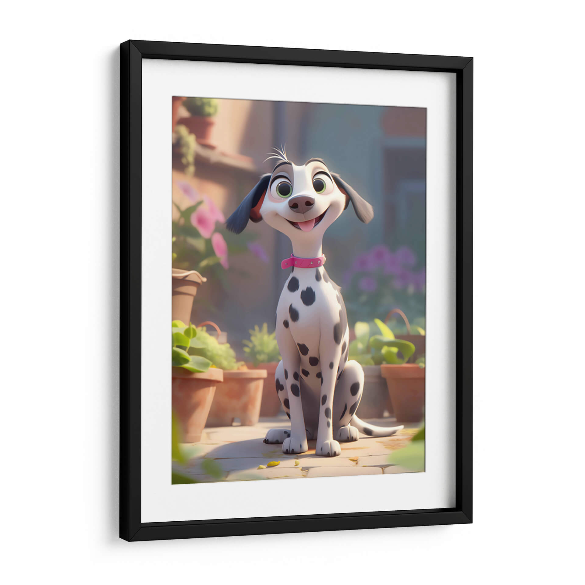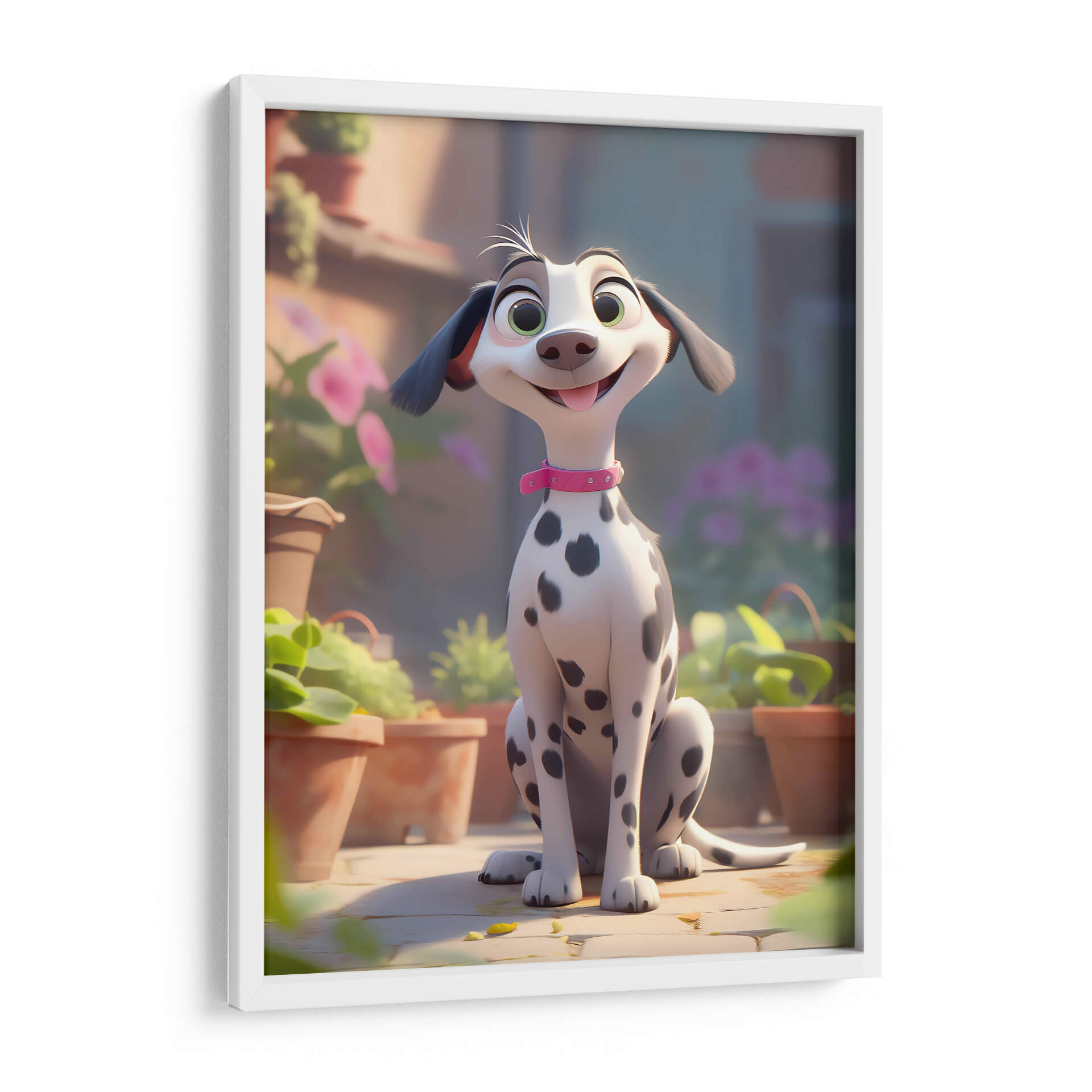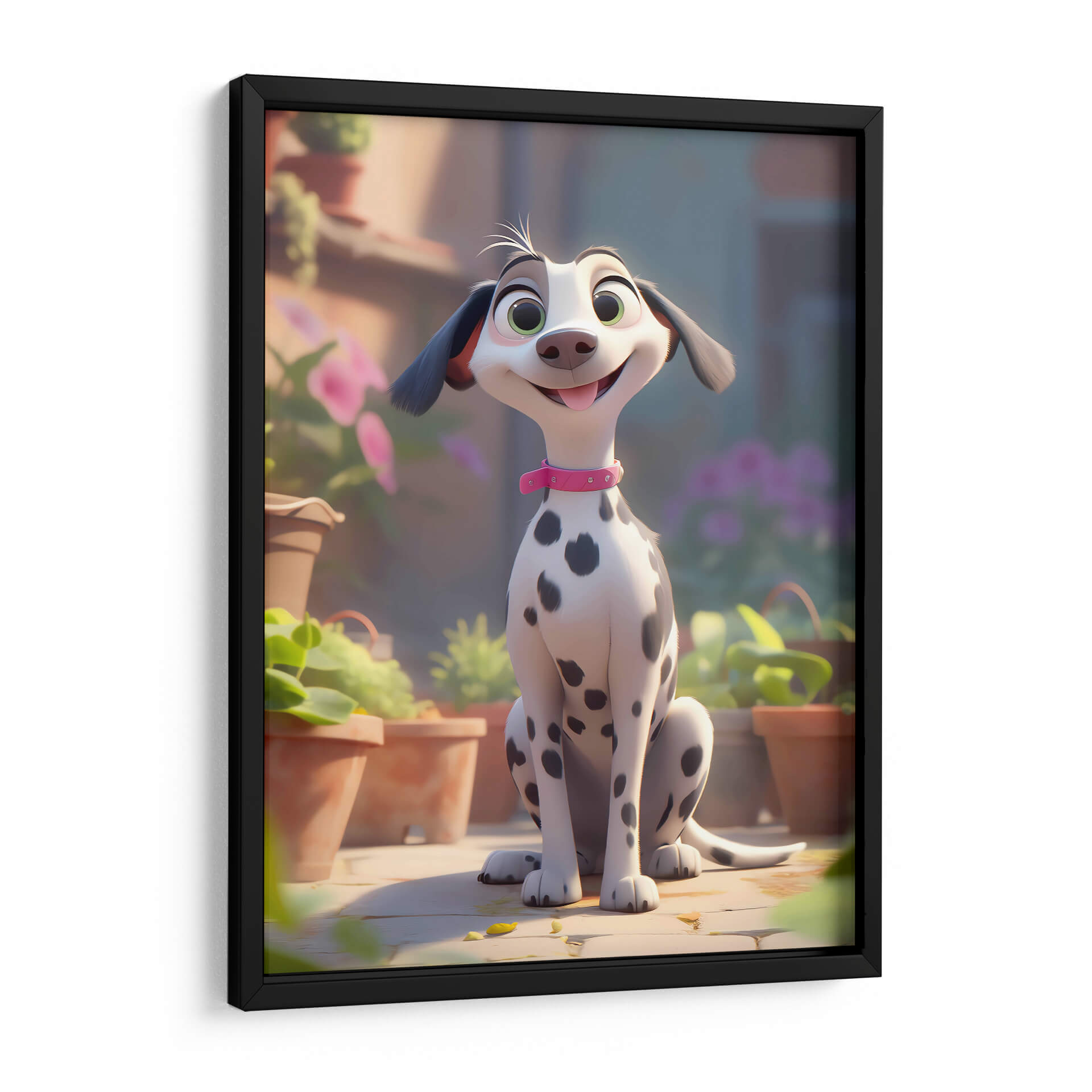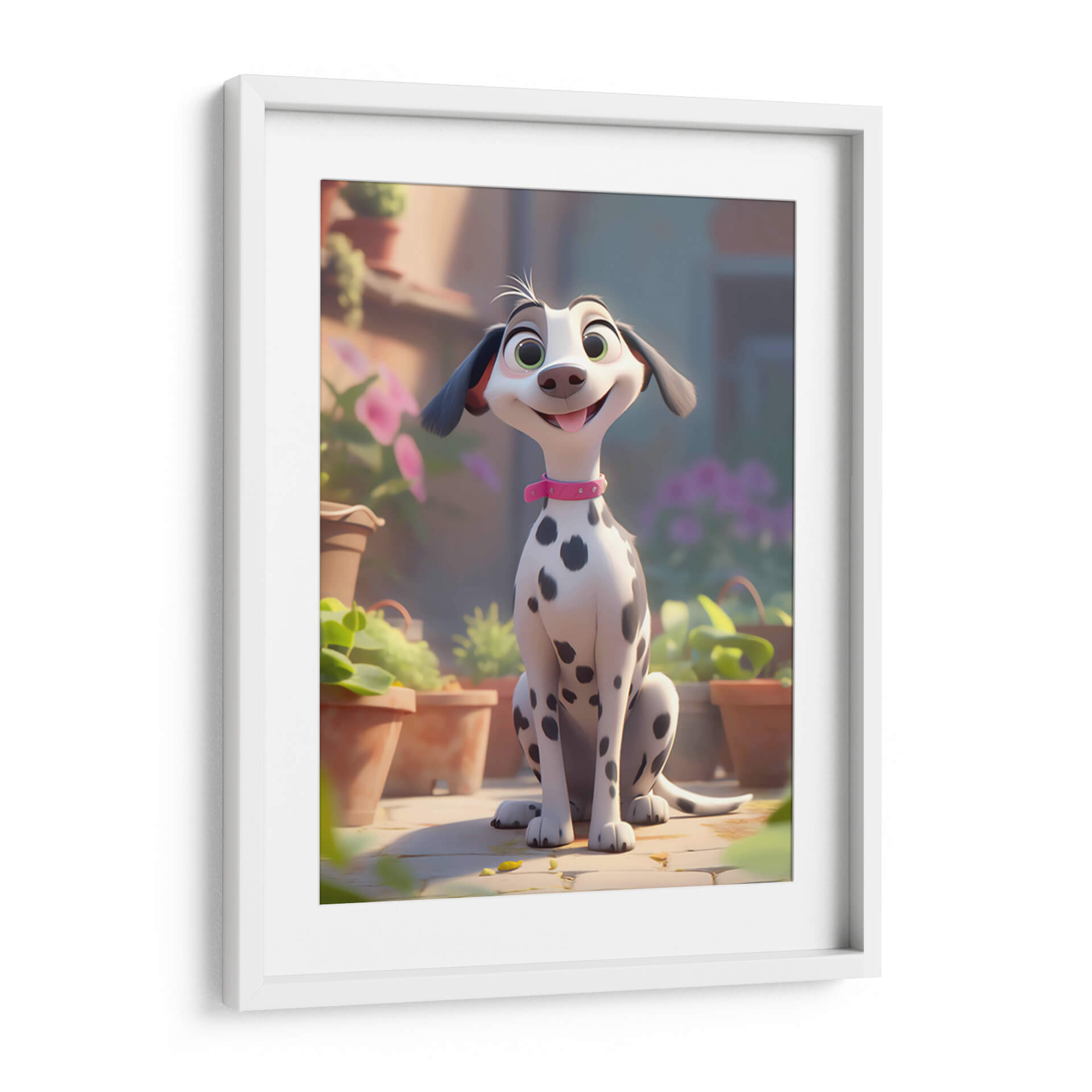 Celebra la alegría incondicional de la amistad con este encantador cuadro decorativo, "Mi Perro Amigo - 7", de DeLaVegaGaming. Esta obra digital captura la esencia de un dálmata animado, con sus distintivas manchas negras sobre un pelaje blanco y brillante, adornado con un collar rosa que añade un toque de color y personalidad. Sus grandes ojos verdes y su sonrisa juguetona transmiten una sensación de felicidad pura y travesura, mientras que su postura sentada, rodeada de macetas y vegetación exuberante, evoca un ambiente de día soleado y al aire libre. La paleta de colores, dominada por tonos cálidos y terrosos, se complementa con toques de verde vibrante y el suave morado de las flores en el fondo, creando una atmósfera acogedora y alegre. El estilo artístico, de corte animado y moderno, lo convierte en una pieza ideal para espacios que buscan un toque de diversión y calidez, como habitaciones infantiles, estudios o salas de estar informales. Este cuadro decorativo no solo añade un punto de interés visual, sino que también infunde un espíritu de camaradería y optimismo en cualquier entorno, recordándonos los momentos felices compartidos con nuestros leales compañeros.