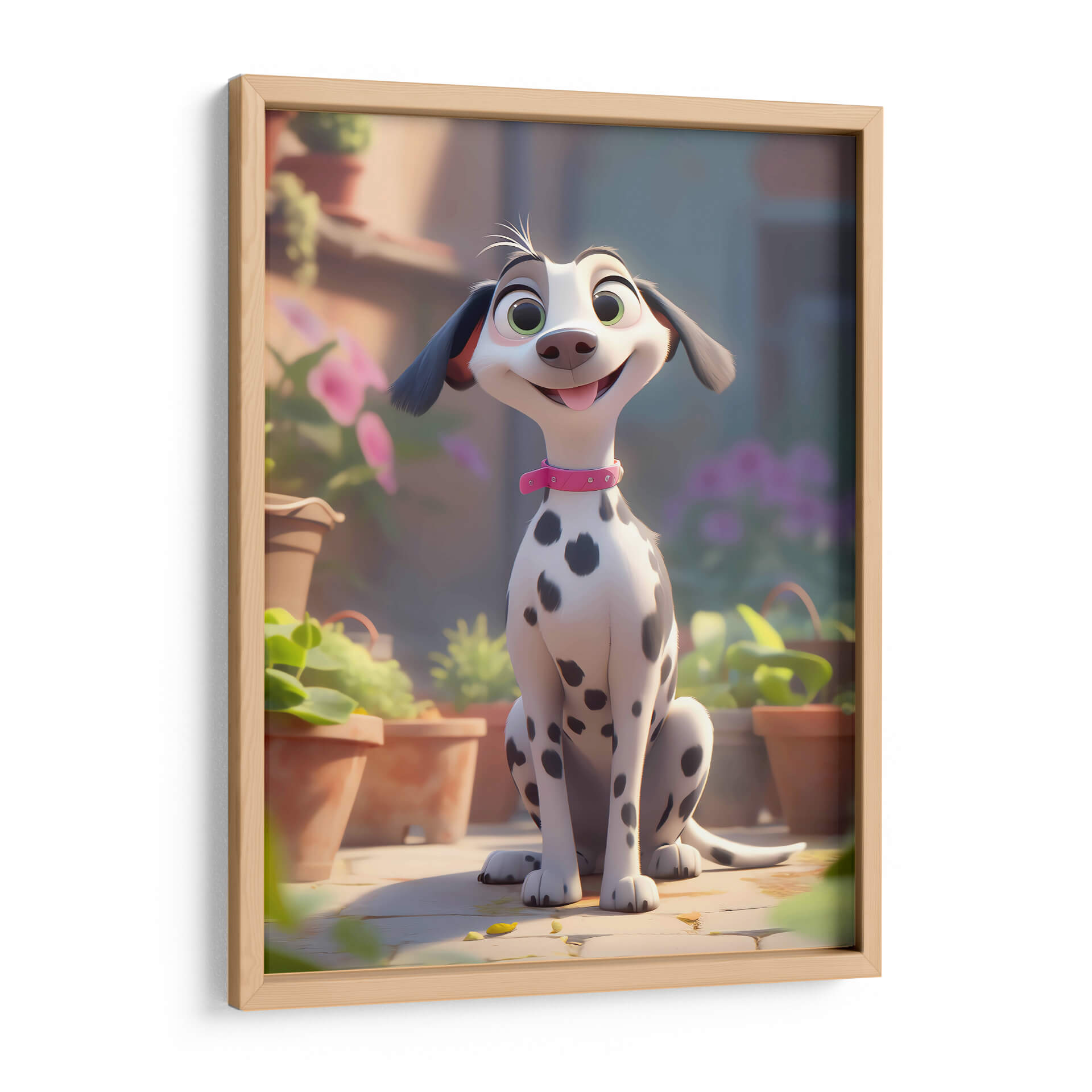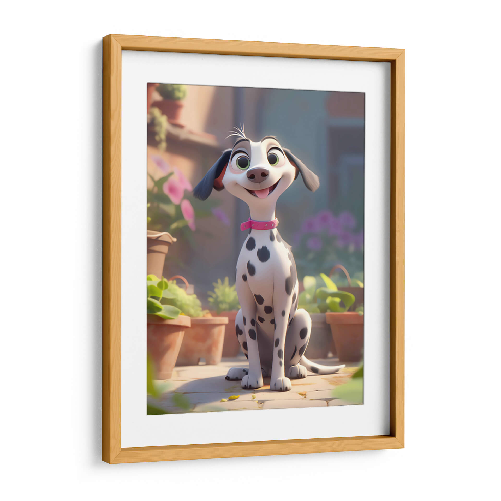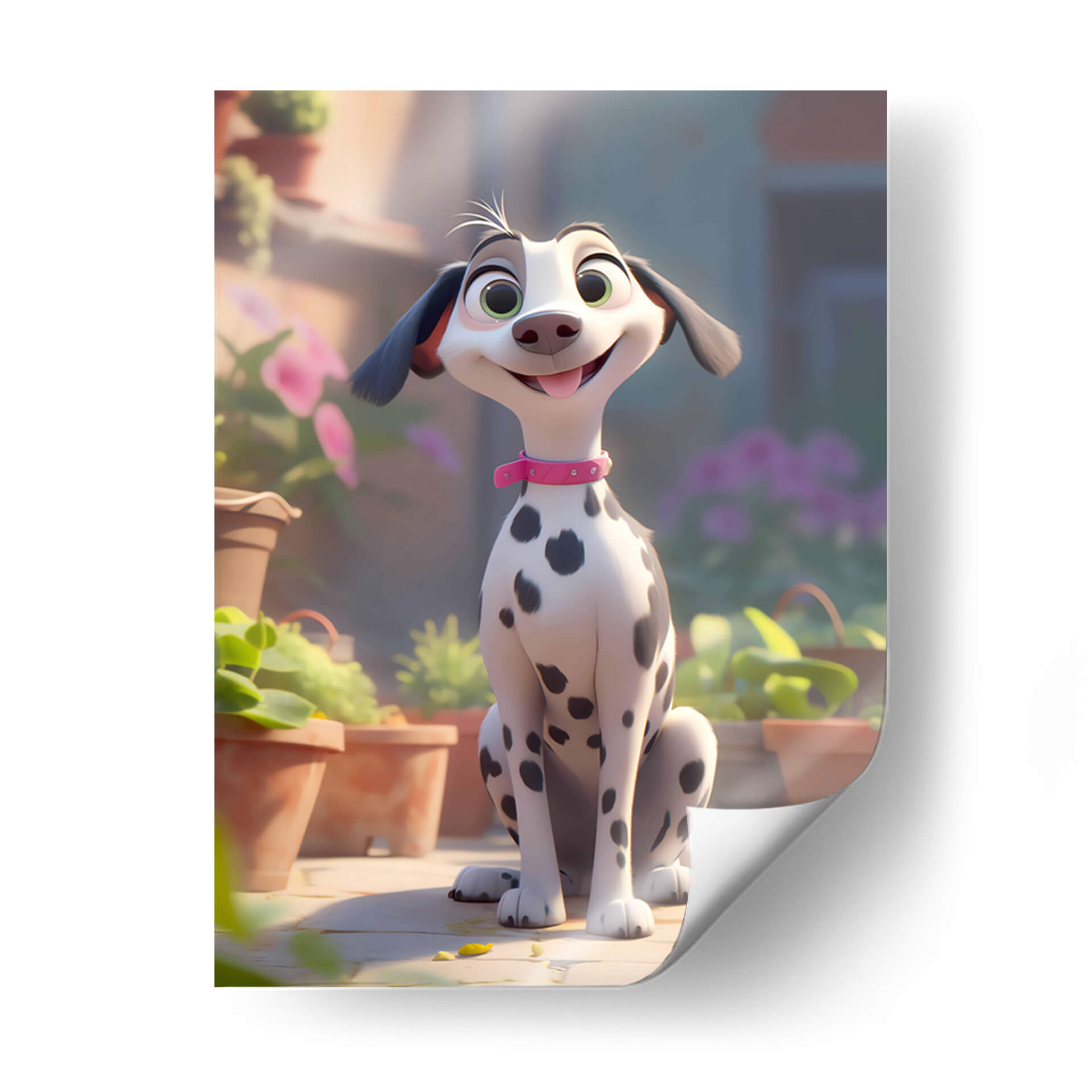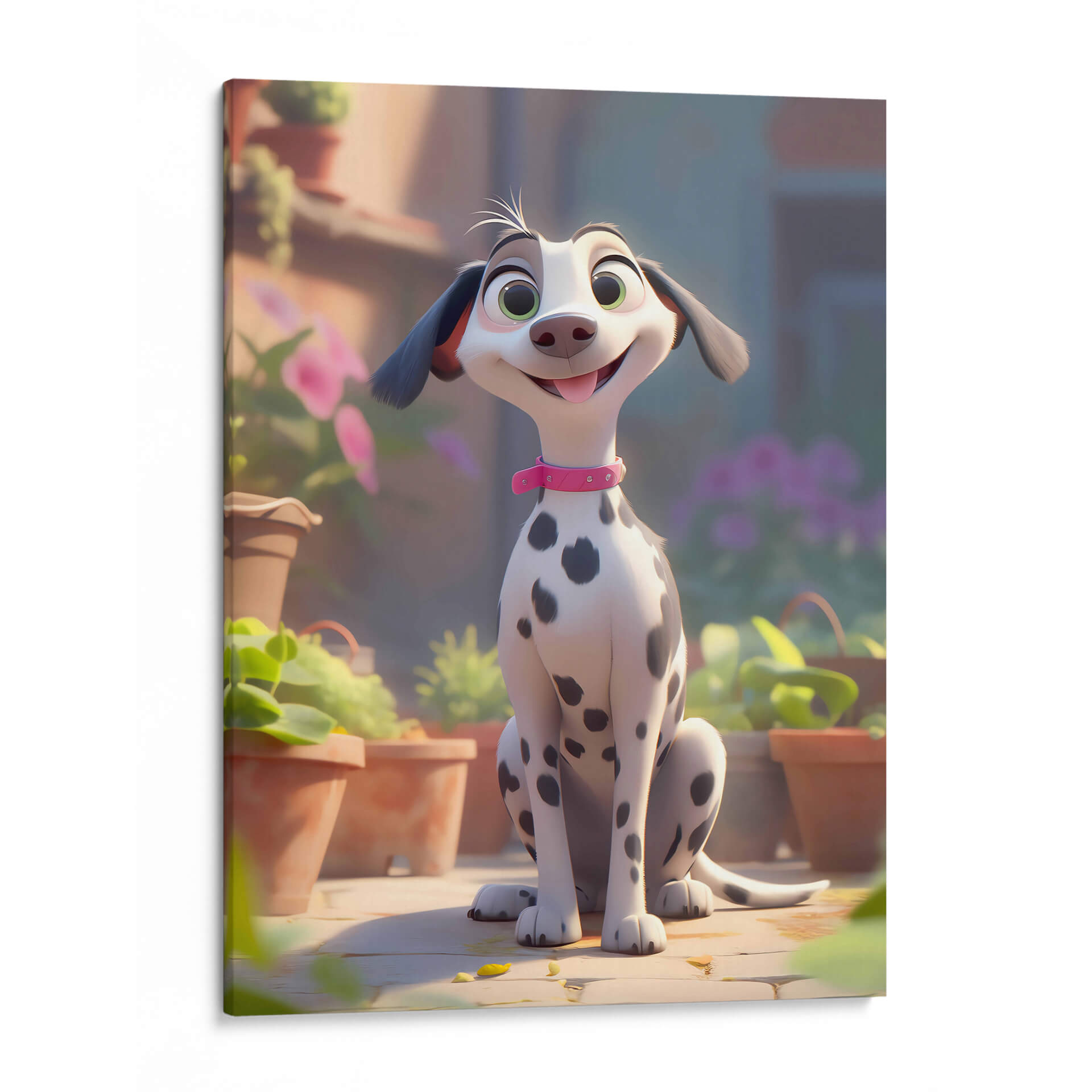 Celebra la alegría incondicional de la amistad con este encantador cuadro decorativo, "Mi Perro Amigo - 7", de DeLaVegaGaming. Esta obra digital captura la esencia de un dálmata animado, con sus distintivas manchas negras sobre un pelaje blanco y brillante, adornado con un collar rosa que añade un toque de color y personalidad. Sus grandes ojos verdes y su sonrisa juguetona transmiten una sensación de felicidad pura y travesura, mientras que su postura sentada, rodeada de macetas y vegetación exuberante, evoca un ambiente de día soleado y al aire libre. La paleta de colores, dominada por tonos cálidos y terrosos, se complementa con toques de verde vibrante y el suave morado de las flores en el fondo, creando una atmósfera acogedora y alegre. El estilo artístico, de corte animado y moderno, lo convierte en una pieza ideal para espacios que buscan un toque de diversión y calidez, como habitaciones infantiles, estudios o salas de estar informales. Este cuadro decorativo no solo añade un punto de interés visual, sino que también infunde un espíritu de camaradería y optimismo en cualquier entorno, recordándonos los momentos felices compartidos con nuestros leales compañeros.