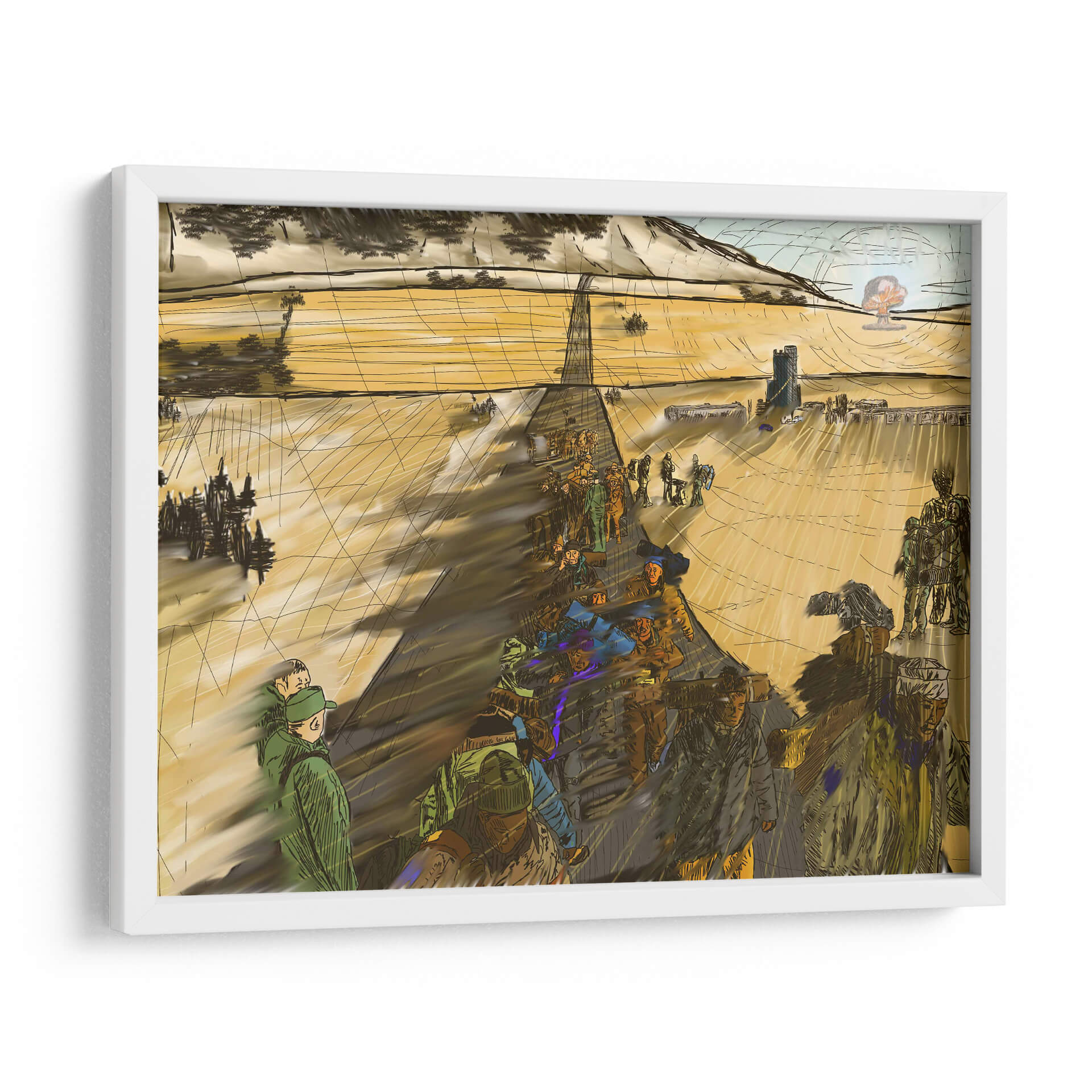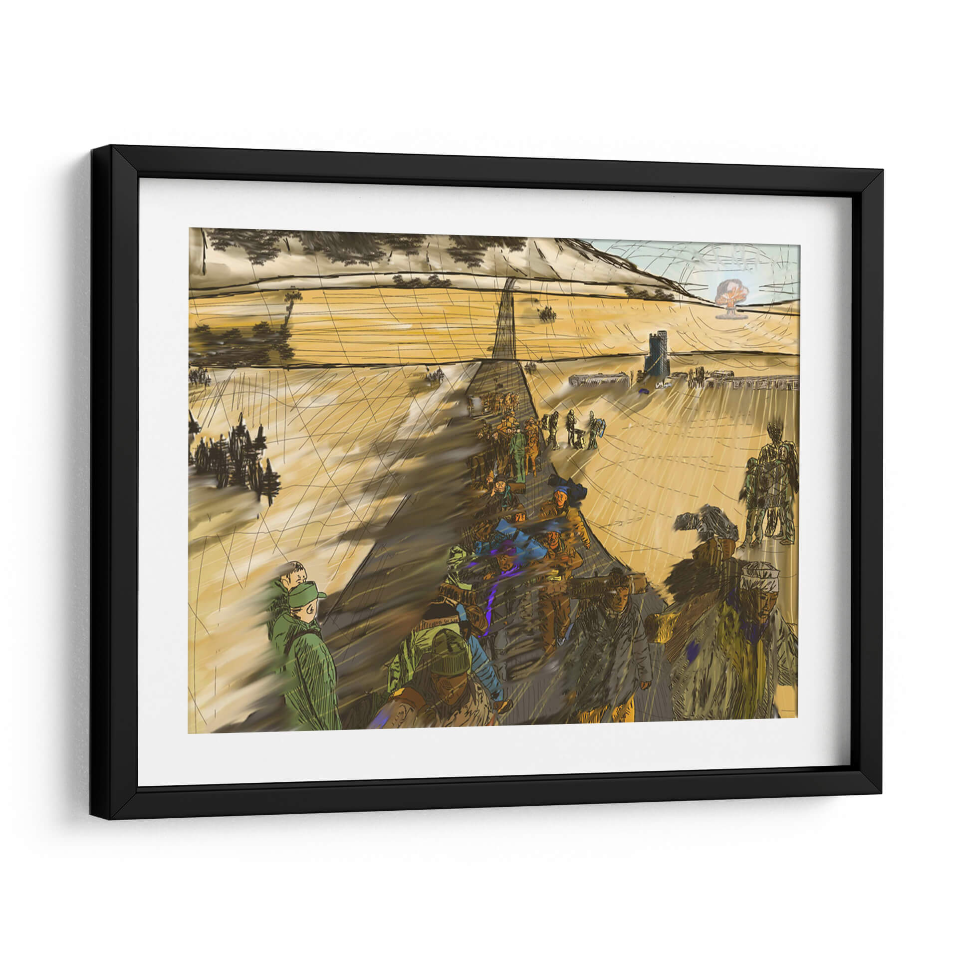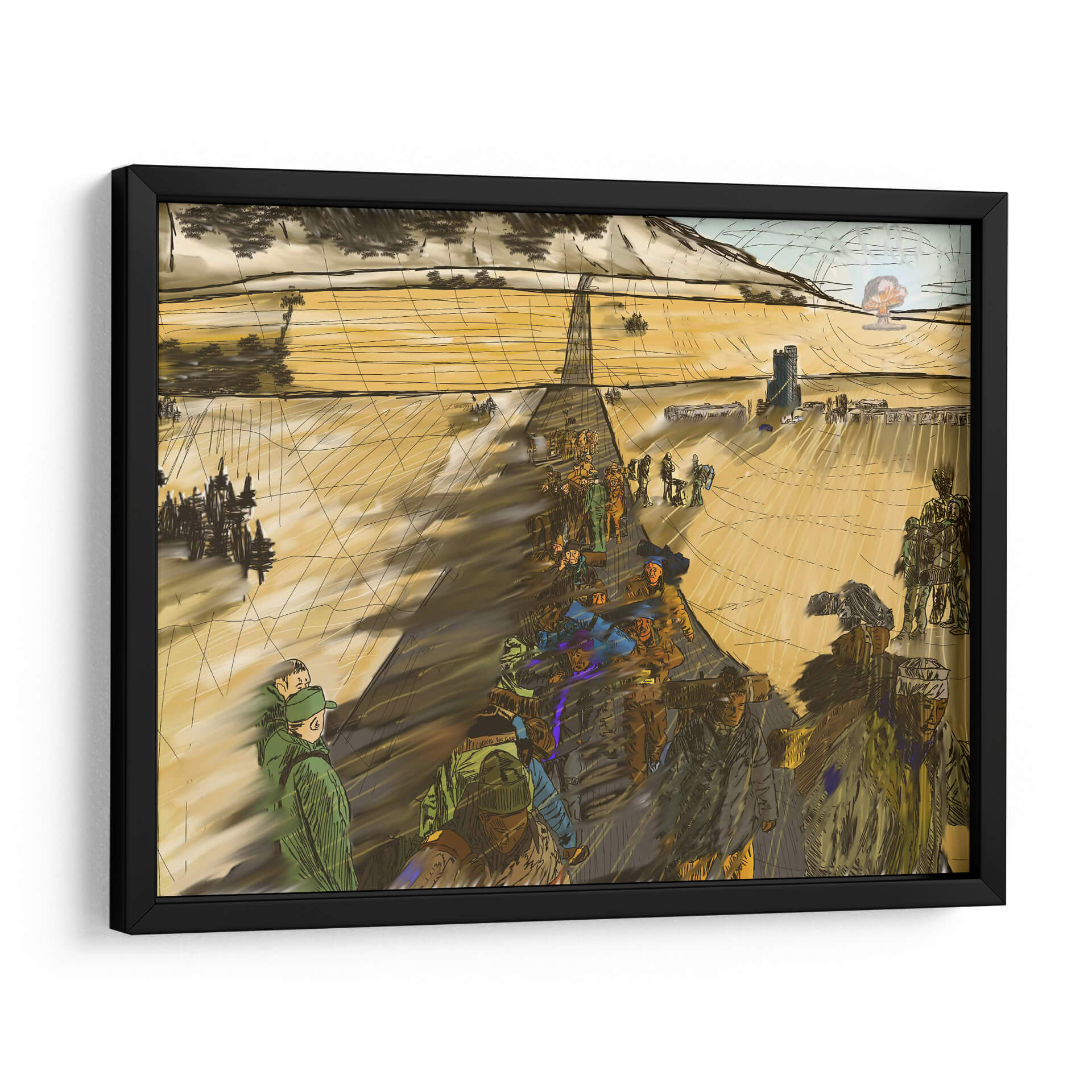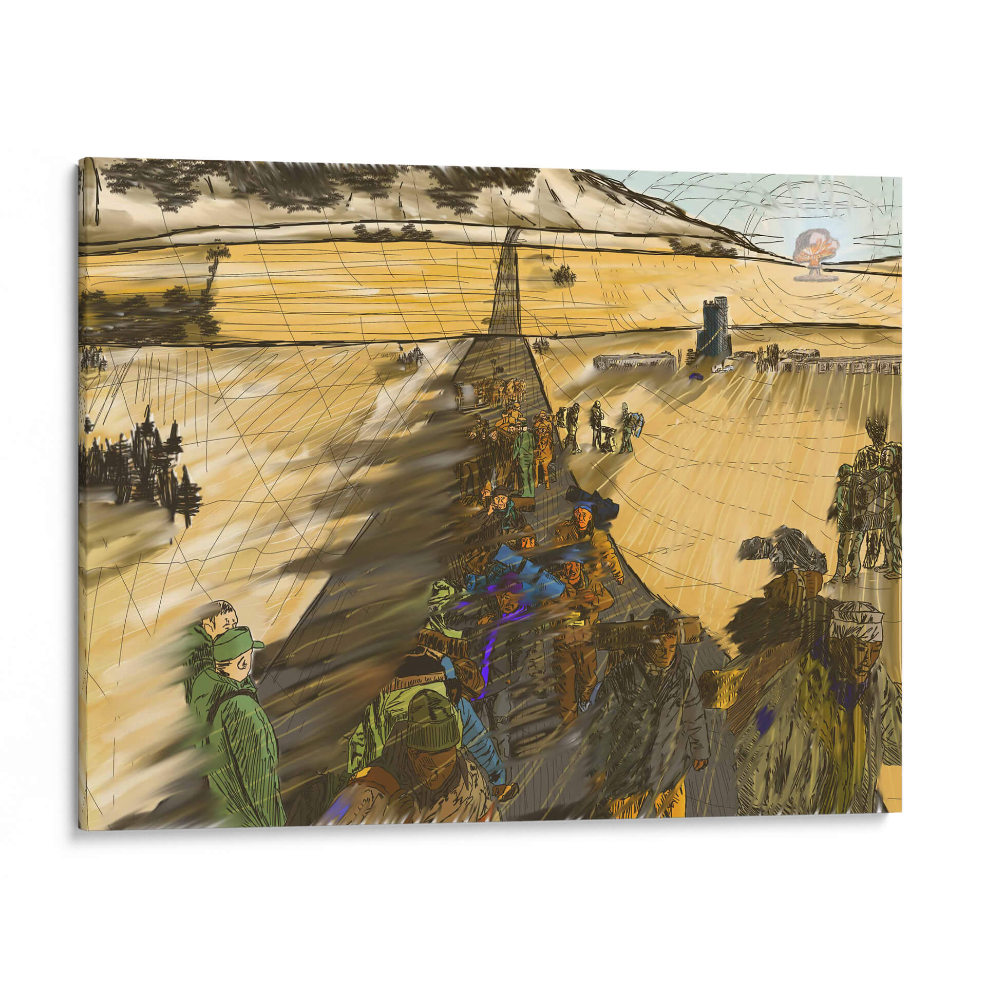 Sumérgete en la narrativa visual de "Migración, 2050 2" de 2HumanKind, una obra de arte contemporáneo que captura la esencia de un viaje colectivo. Esta pieza evoca una atmósfera de movimiento y propósito, con figuras humanas representadas en una marcha que se extiende hacia un horizonte abierto. La paleta de colores, dominada por tonos tierra y ocres cálidos, crea una sensación de amplitud y continuidad, acentuada por las sombras alargadas que sugieren el paso del tiempo o la distancia recorrida. La composición, con una perspectiva lineal que guía la mirada, resalta la escala humana frente a un vasto paisaje, quizás desértico o rural, con elementos arquitectónicos discretos en la distancia, insinuando un destino o un punto de partida. El estilo distintivo, con trazos enérgicos y una representación semi-abstracta de las figuras, confiere a la obra un carácter dinámico y reflexivo. Este cuadro decorativo es ideal para espacios que buscan inspirar contemplación sobre el viaje humano, la perseverancia y la búsqueda de un nuevo comienzo, añadiendo profundidad y un toque de intriga a cualquier sala de estar, estudio u oficina.