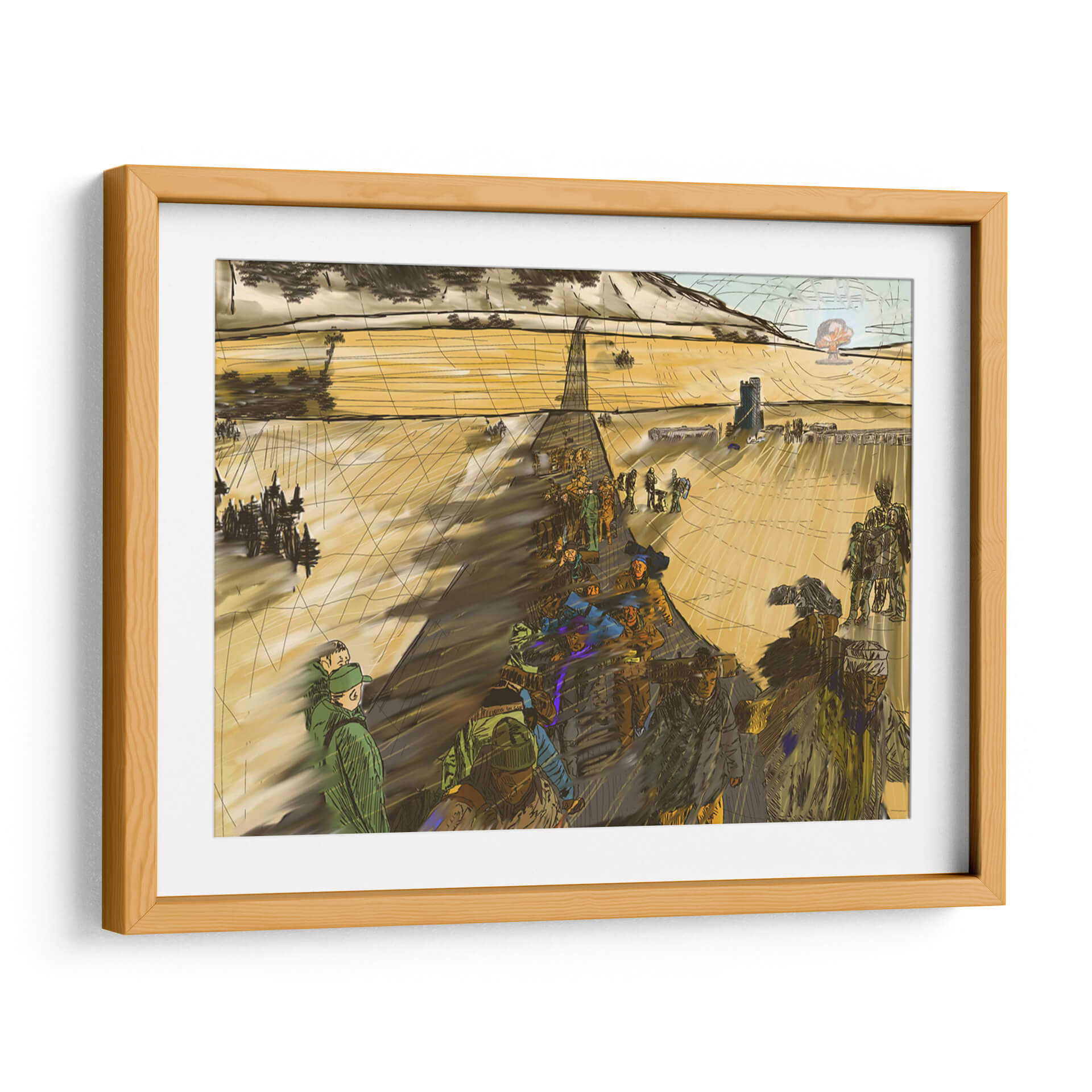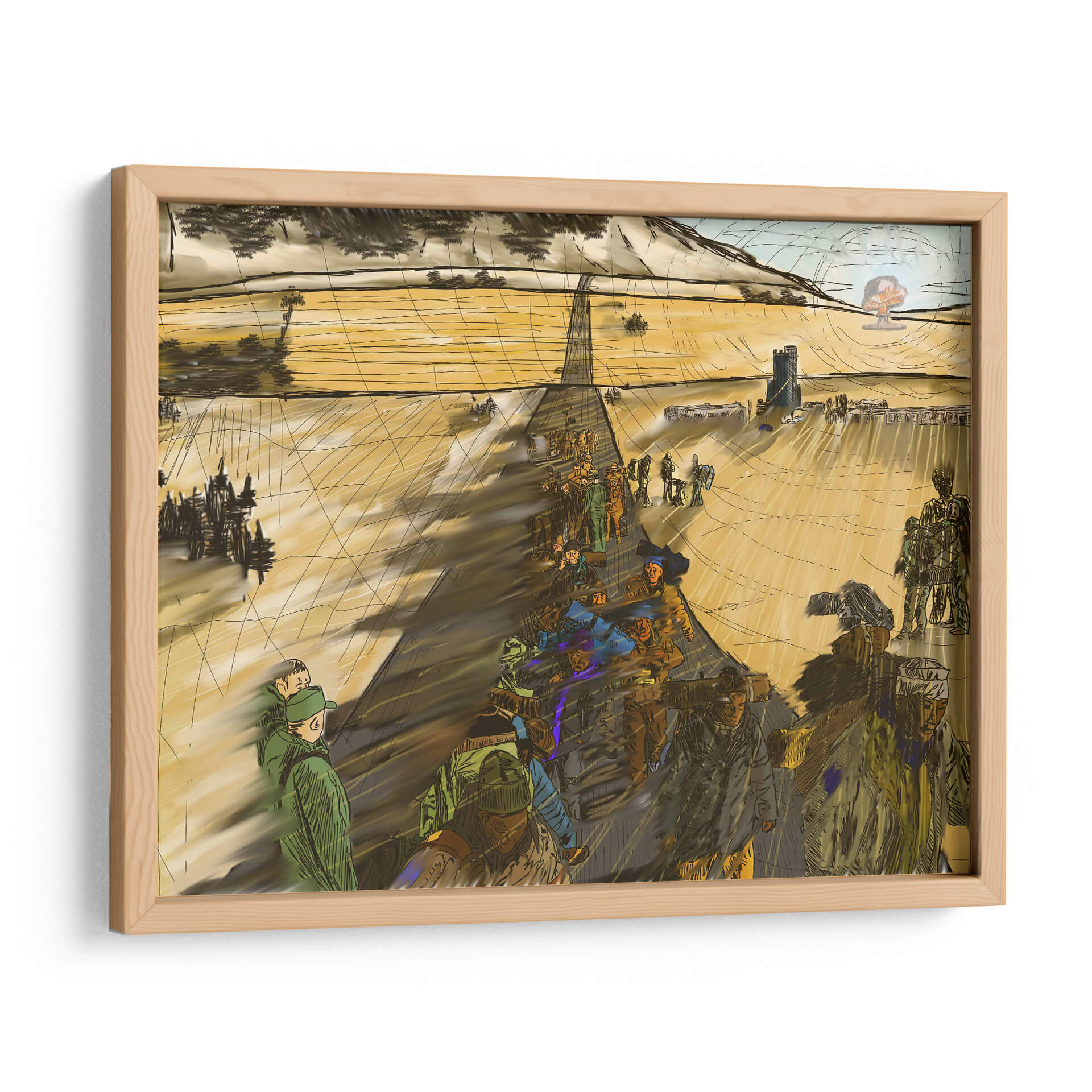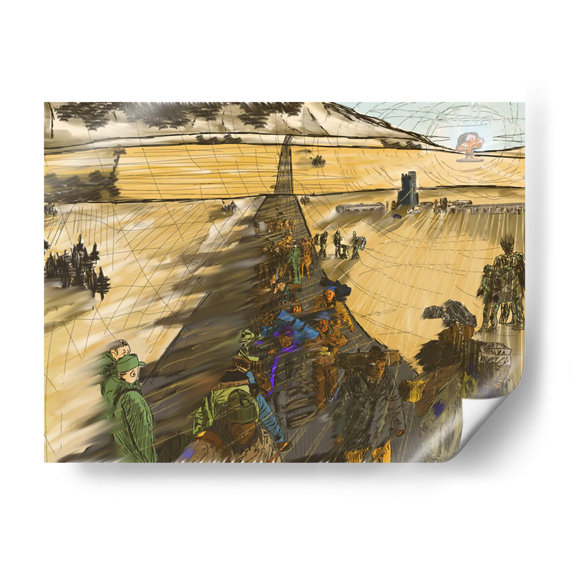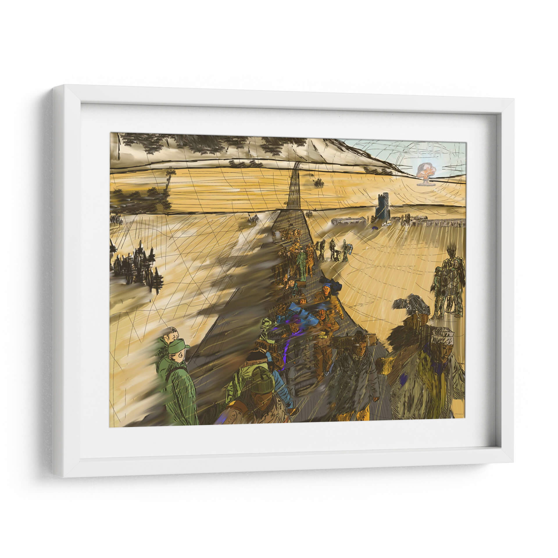 Sumérgete en la narrativa visual de "Migración, 2050 2" de 2HumanKind, una obra de arte contemporáneo que captura la esencia de un viaje colectivo. Esta pieza evoca una atmósfera de movimiento y propósito, con figuras humanas representadas en una marcha que se extiende hacia un horizonte abierto. La paleta de colores, dominada por tonos tierra y ocres cálidos, crea una sensación de amplitud y continuidad, acentuada por las sombras alargadas que sugieren el paso del tiempo o la distancia recorrida. La composición, con una perspectiva lineal que guía la mirada, resalta la escala humana frente a un vasto paisaje, quizás desértico o rural, con elementos arquitectónicos discretos en la distancia, insinuando un destino o un punto de partida. El estilo distintivo, con trazos enérgicos y una representación semi-abstracta de las figuras, confiere a la obra un carácter dinámico y reflexivo. Este cuadro decorativo es ideal para espacios que buscan inspirar contemplación sobre el viaje humano, la perseverancia y la búsqueda de un nuevo comienzo, añadiendo profundidad y un toque de intriga a cualquier sala de estar, estudio u oficina.