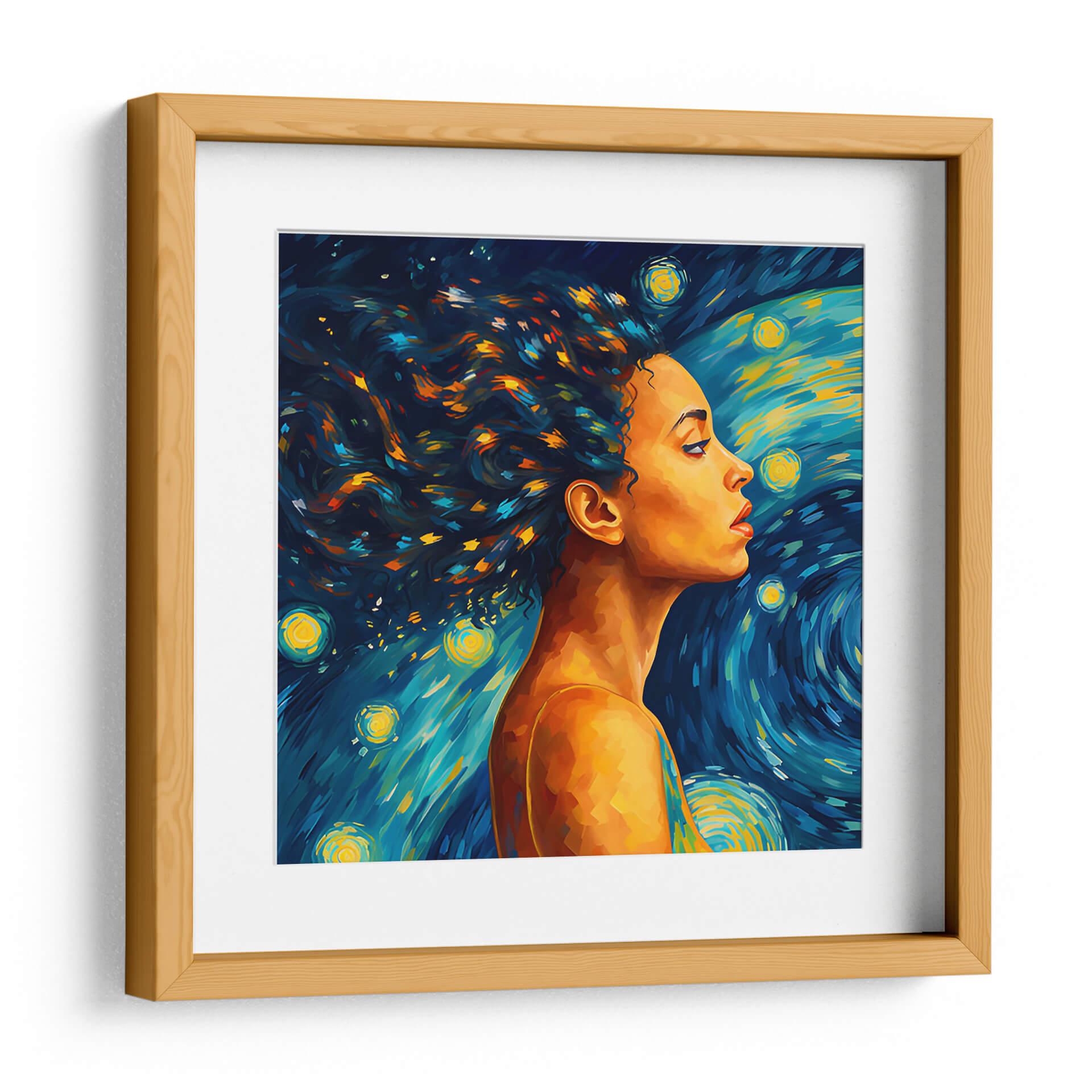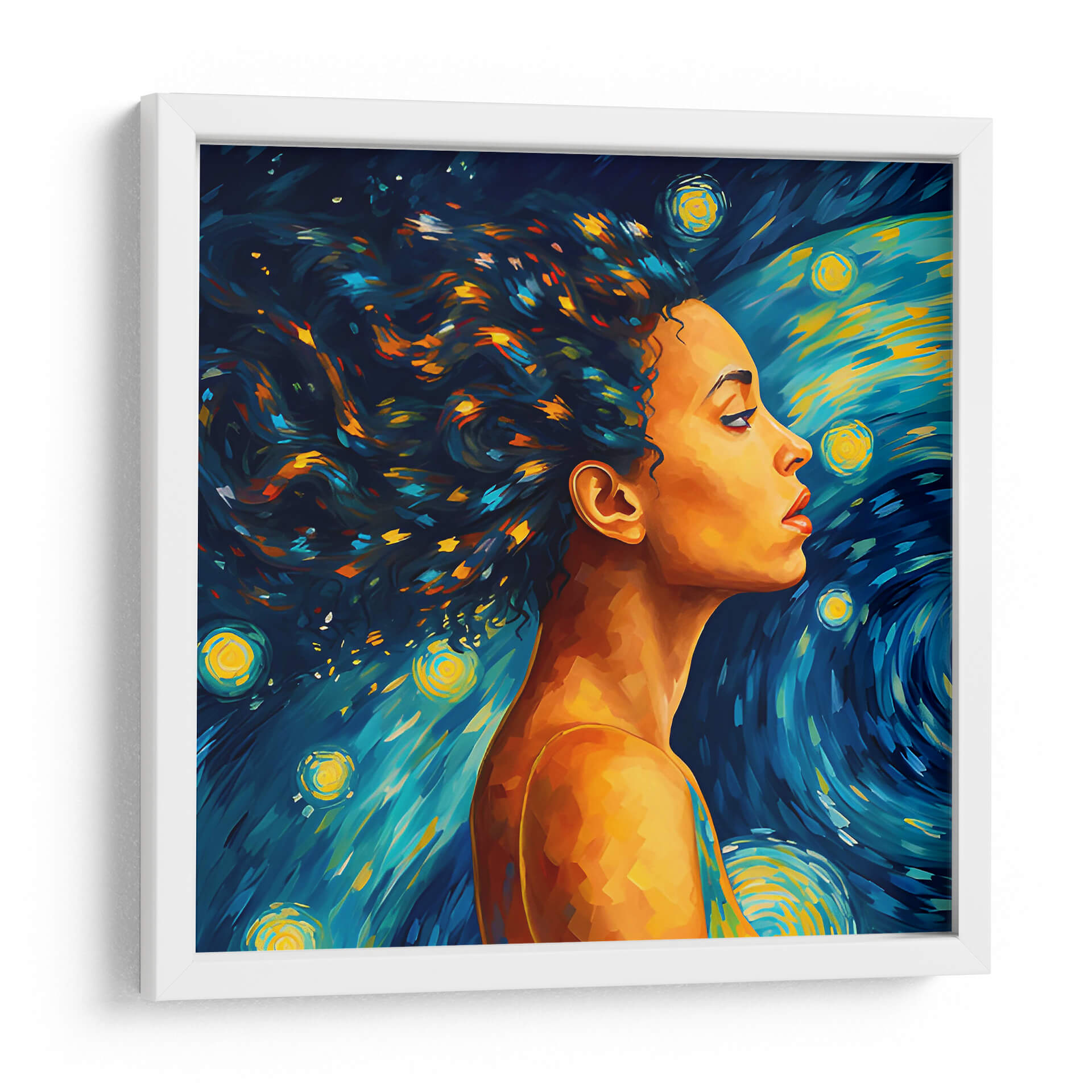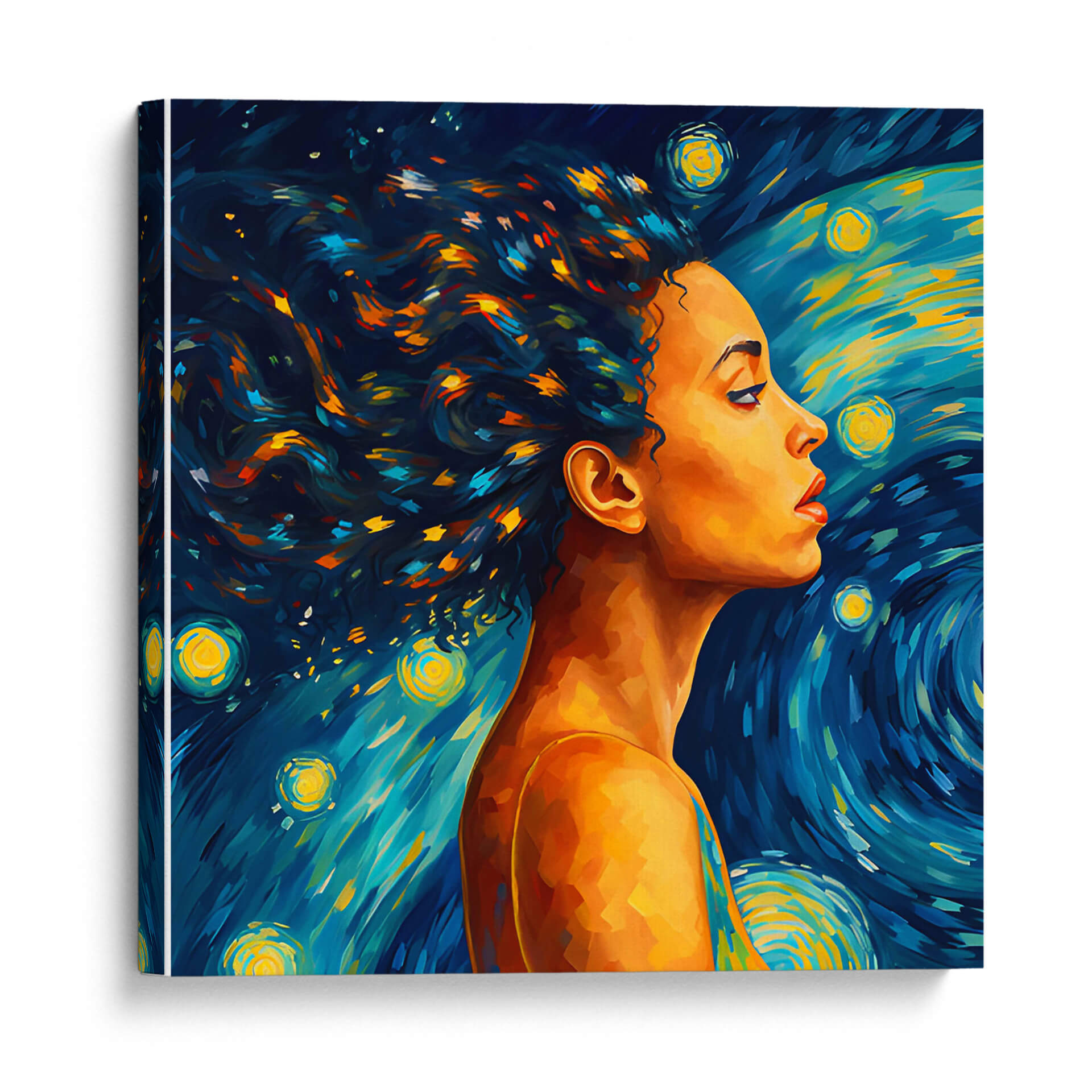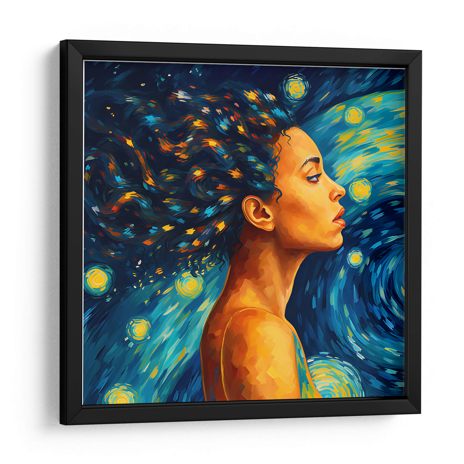 Sumérgete en la enigmática belleza de "Mujer en la Noche Estrellada", una obra de arte digital que evoca la intensidad emocional y el dinamismo del cosmos. Este cuadro decorativo presenta el perfil de una mujer cuya melena se funde con un cielo nocturno vibrante, inspirado en el estilo postimpresionista. Los trazos audaces y la paleta de colores contrastante, dominada por profundos azules, amarillos brillantes y toques de naranja y turquesa, crean una atmósfera de ensueño y misterio. Las estrellas circulares y las pinceladas arremolinadas en el fondo recuerdan la icónica obra de Van Gogh, pero con una interpretación moderna y cautivadora. La piel dorada de la mujer contrasta magníficamente con el fondo cósmico, aportando calidez y un punto focal humano a la escena celestial. Esta pieza es ideal para añadir un toque de sofisticación artística y un aire de introspección a cualquier espacio, ya sea una sala de estar contemporánea, un estudio creativo o un dormitorio que busque serenidad y un toque de magia nocturna. Transforma tu hogar en una galería personal con este lienzo inspirador que captura la conexión entre la figura humana y la inmensidad del universo.