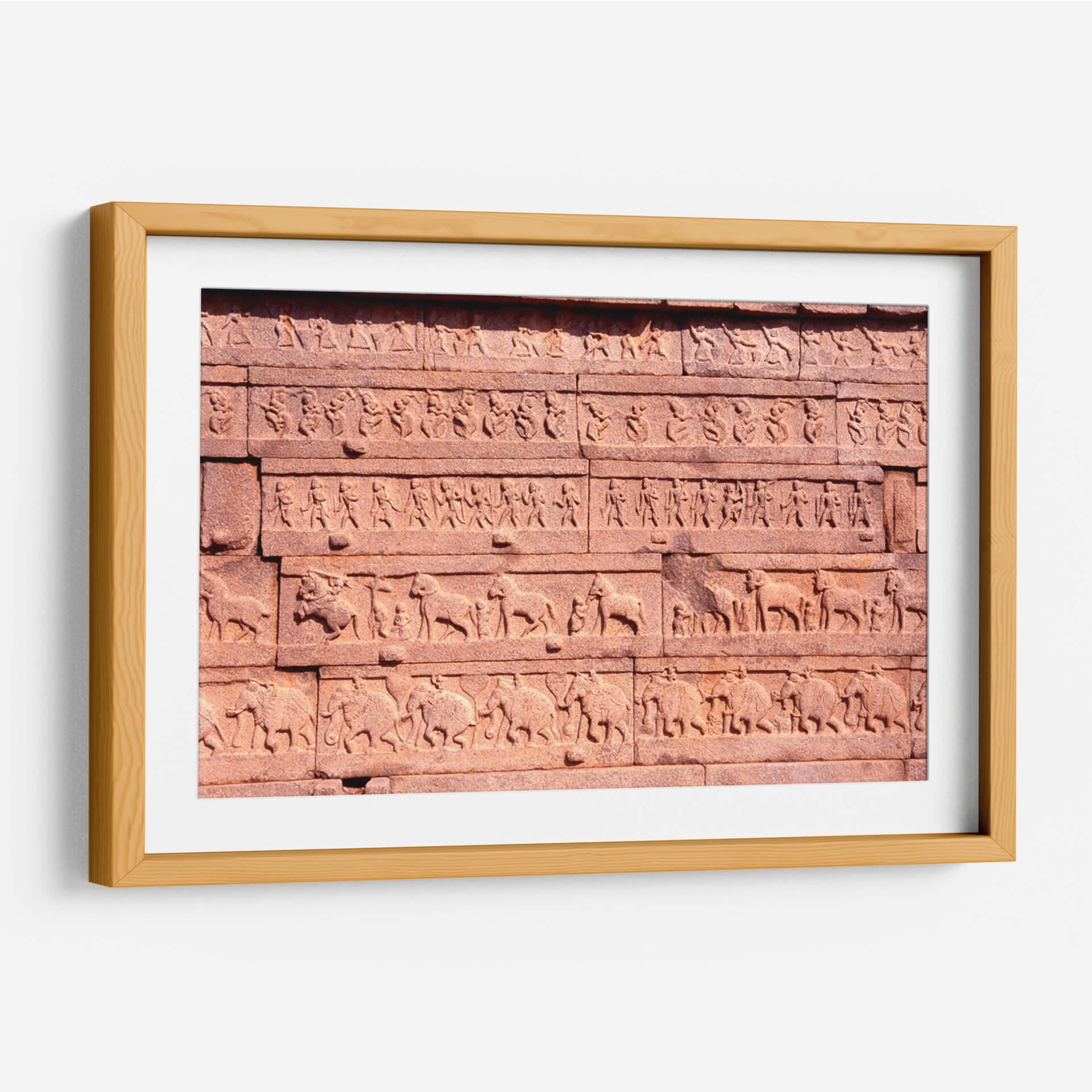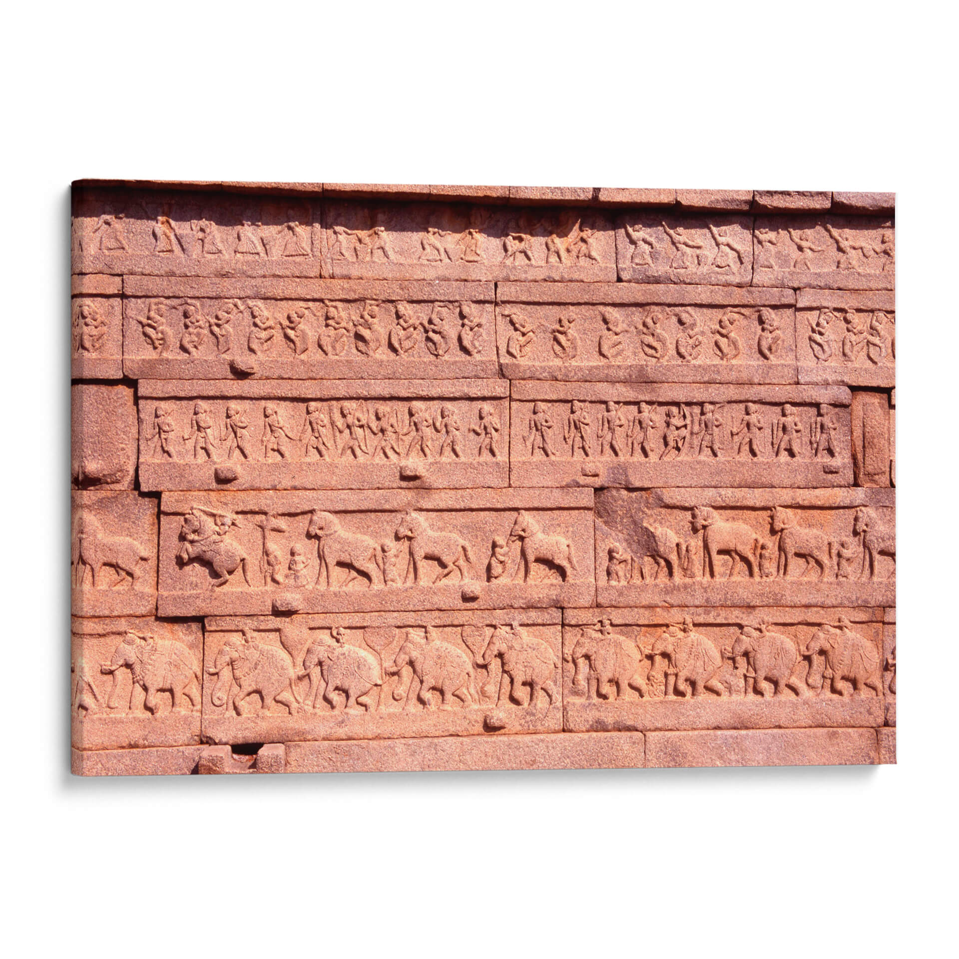 Sumérgete en la rica historia y la majestuosidad del arte antiguo con este cautivador cuadro decorativo, 'Muro de piedra tallado en Hampi, Karnataka, India'. Esta obra maestra captura la esencia de las intrincadas tallas que adornan las antiguas estructuras de la India, transportando la magnificencia de Hampi directamente a tu hogar u oficina. La composición presenta una serie de registros superpuestos, cada uno detallando figuras humanas estilizadas, animales majestuosos como elefantes y caballos, y patrones geométricos que narran historias de una civilización pasada. La paleta de colores, dominada por tonos tierra cálidos y rojizos extraídos de la piedra arenisca, evoca una sensación de calidez, solidez y una conexión profunda con la naturaleza y la historia. El estilo, aunque detallado, posee una cualidad rústica y atemporal, característica de las esculturas monumentales. Este cuadro decorativo es ideal para aquellos que buscan añadir un toque de exotismo, espiritualidad y profundidad cultural a sus espacios. Transmite una atmósfera de legado y artesanía ancestral, perfecta para crear un punto focal intrigante en una sala de estar, un estudio o un comedor. Con este arte mural, no solo adornas tu pared, sino que también introduces una pieza de conversación que evoca admiración y curiosidad por las maravillas del mundo.