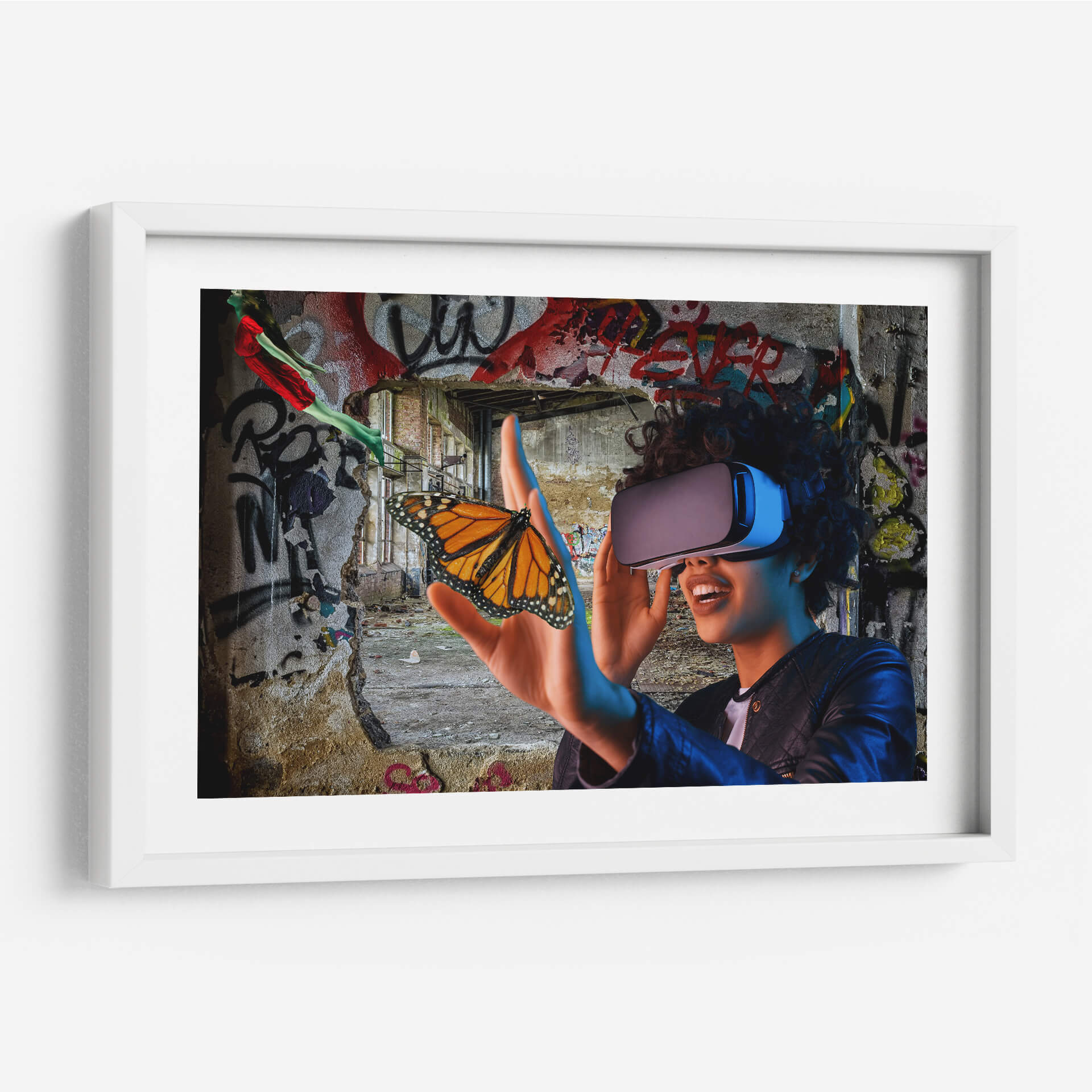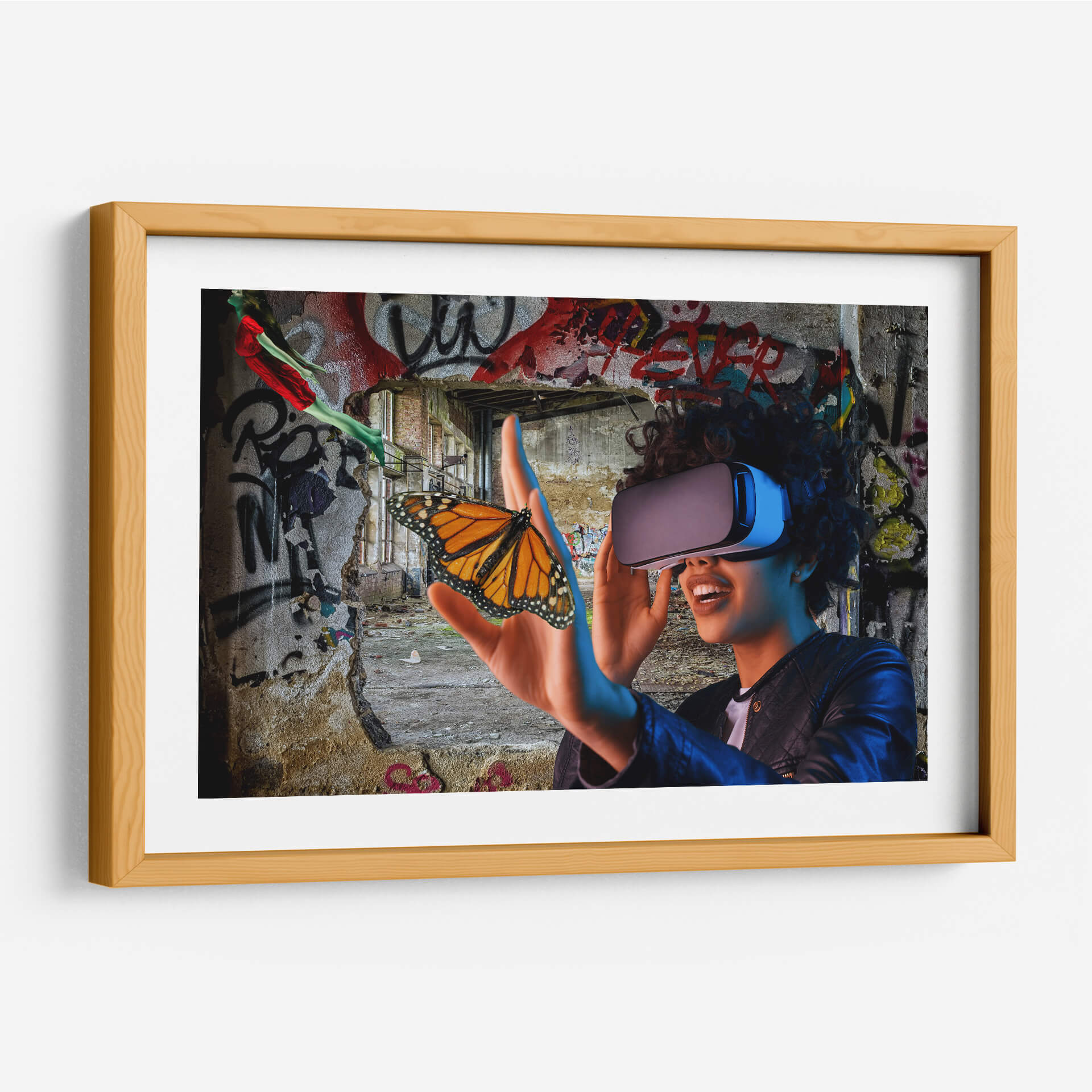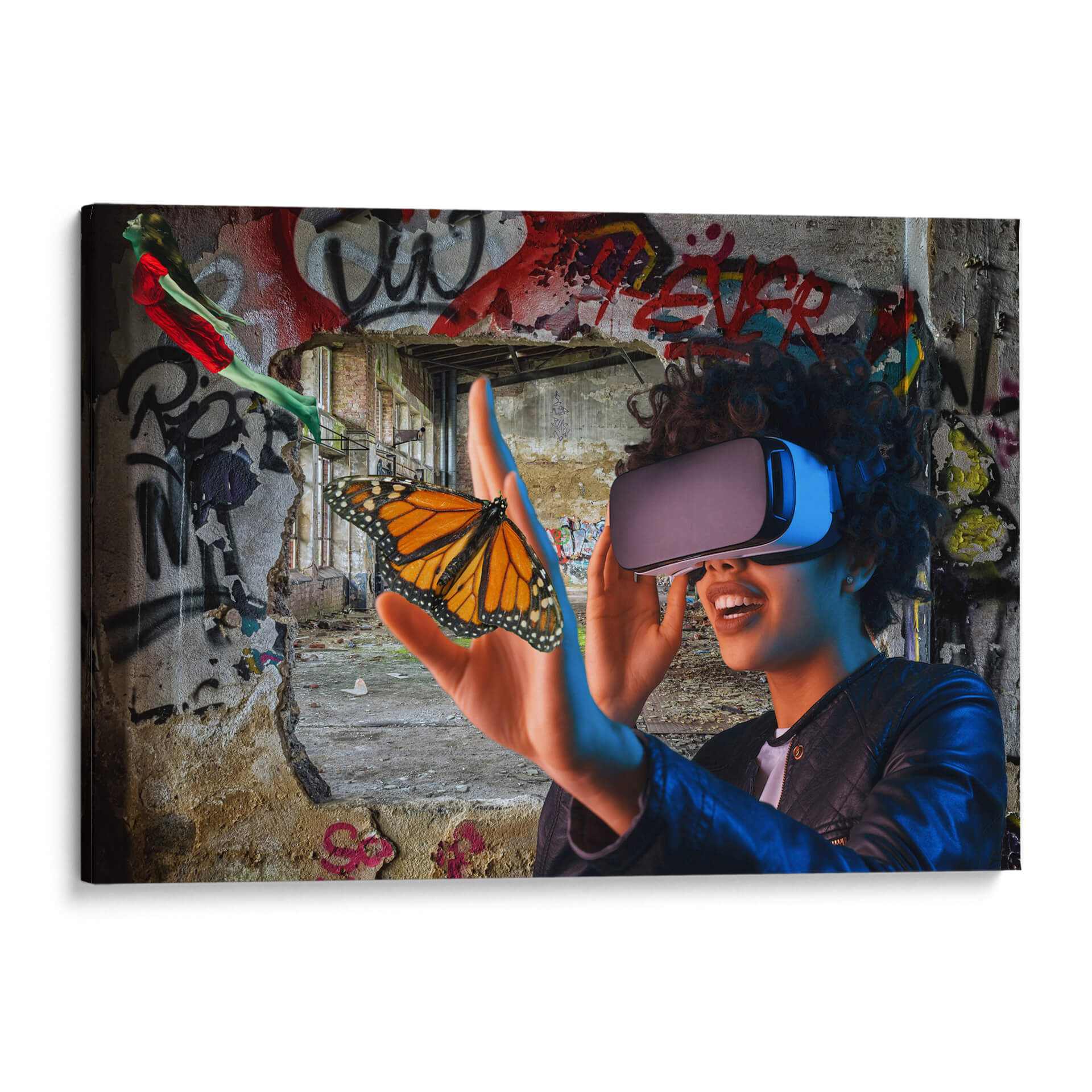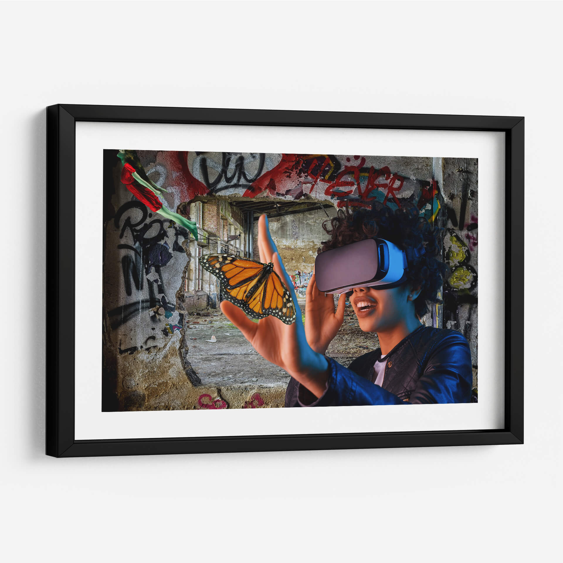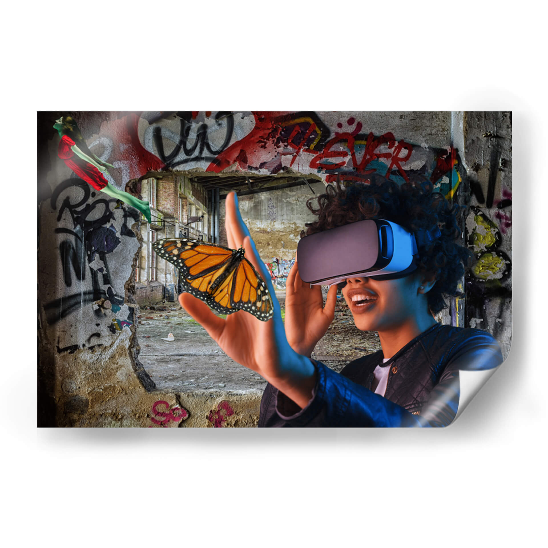 Sumérgete en la fascinación de la realidad virtual y la delicadeza de la naturaleza con "Negación", una obra de arte digital del artista Danilo Guio R. Este cuadro decorativo captura un momento surrealista donde una joven, inmersa en el mundo digital a través de unas gafas de realidad virtual, interactúa con una mariposa monarca en su mano. El contraste entre la tecnología moderna y la belleza efímera del mundo natural crea una narrativa visual intrigante. El fondo, una pared desgastada y grafitada, añade una capa de textura urbana y cruda que acentúa la atmósfera onírica de la escena. Los vibrantes tonos anaranjados de la mariposa y el azul eléctrico que ilumina el rostro de la joven contrastan con los grises y rojos del grafiti, generando una composición dinámica y llena de simbolismo. "Negación" es una pieza contemporánea perfecta para estimular la conversación y añadir un toque de modernidad audaz a tu sala de estar, oficina o cualquier espacio que busque una declaración artística única. Este cuadro es una invitación a reflexionar sobre la conexión entre lo real y lo virtual, la tecnología y la vida, y la belleza que podemos encontrar en los lugares más inesperados. Ideal para amantes del arte digital, la cultura pop y las piezas que desafían la percepción.