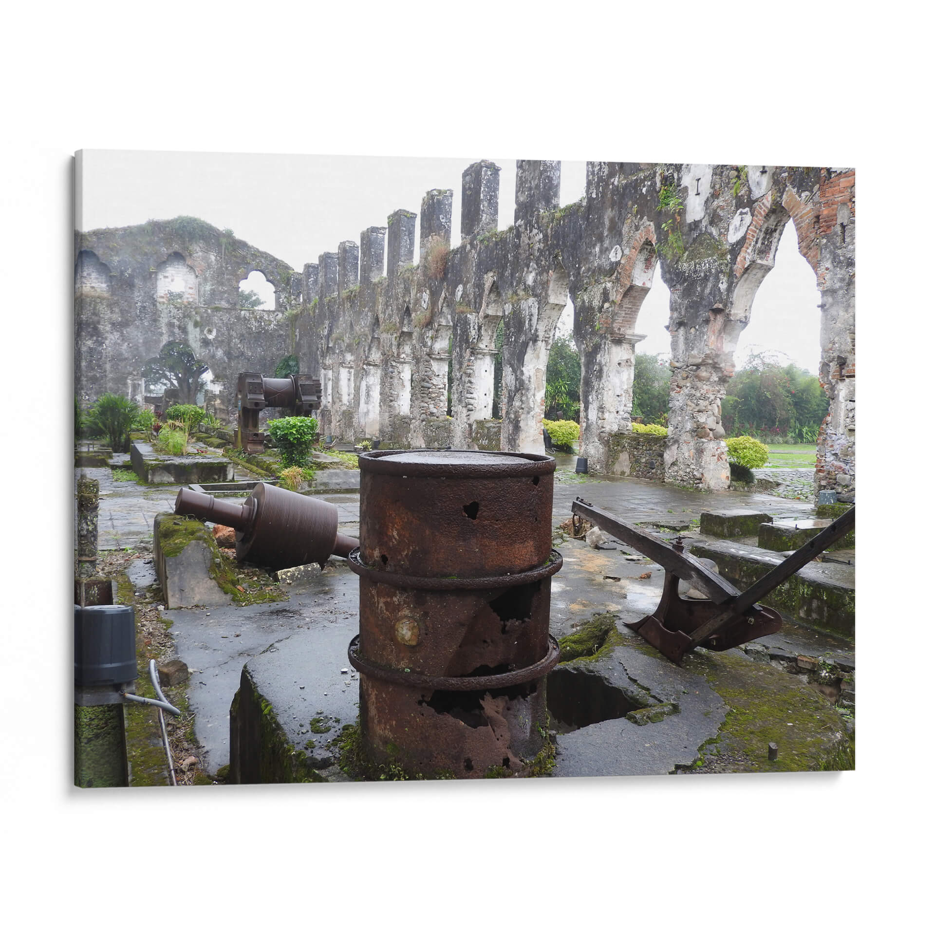 Sumérgete en la melancolía y la fuerza del tiempo con "Óxido", una obra de arte visual de Hugo Segura que captura la esencia de la decadencia industrial y la belleza inherente en lo olvidado. Este cuadro decorativo transporta al espectador a un espacio donde las ruinas de un pasado industrial cobran vida a través de texturas ricas y una paleta de colores dominada por tonos tierra, ocres y grises, acentuados por la pátina del óxido que cuenta historias de abandono y resistencia. Las imponentes estructuras de piedra, con sus arcos erosionados y vegetación que reclama su espacio, se entrelazan con vestigios de maquinaria antigua, creando una atmósfera de introspección y contemplación. La composición, con elementos que sugieren un pasado de actividad y ahora en reposo, evoca una sensación de nostalgia y a la vez de perdurabilidad. "Óxido" es ideal para espacios que buscan un toque de carácter industrial, histórico o rústico, aportando profundidad y un diálogo visual con la historia. Perfecto para salones, estudios o incluso espacios comerciales que deseen evocar una estética única y reflexiva, este cuadro decorativo es una pieza que invita a la admiración y al pensamiento.