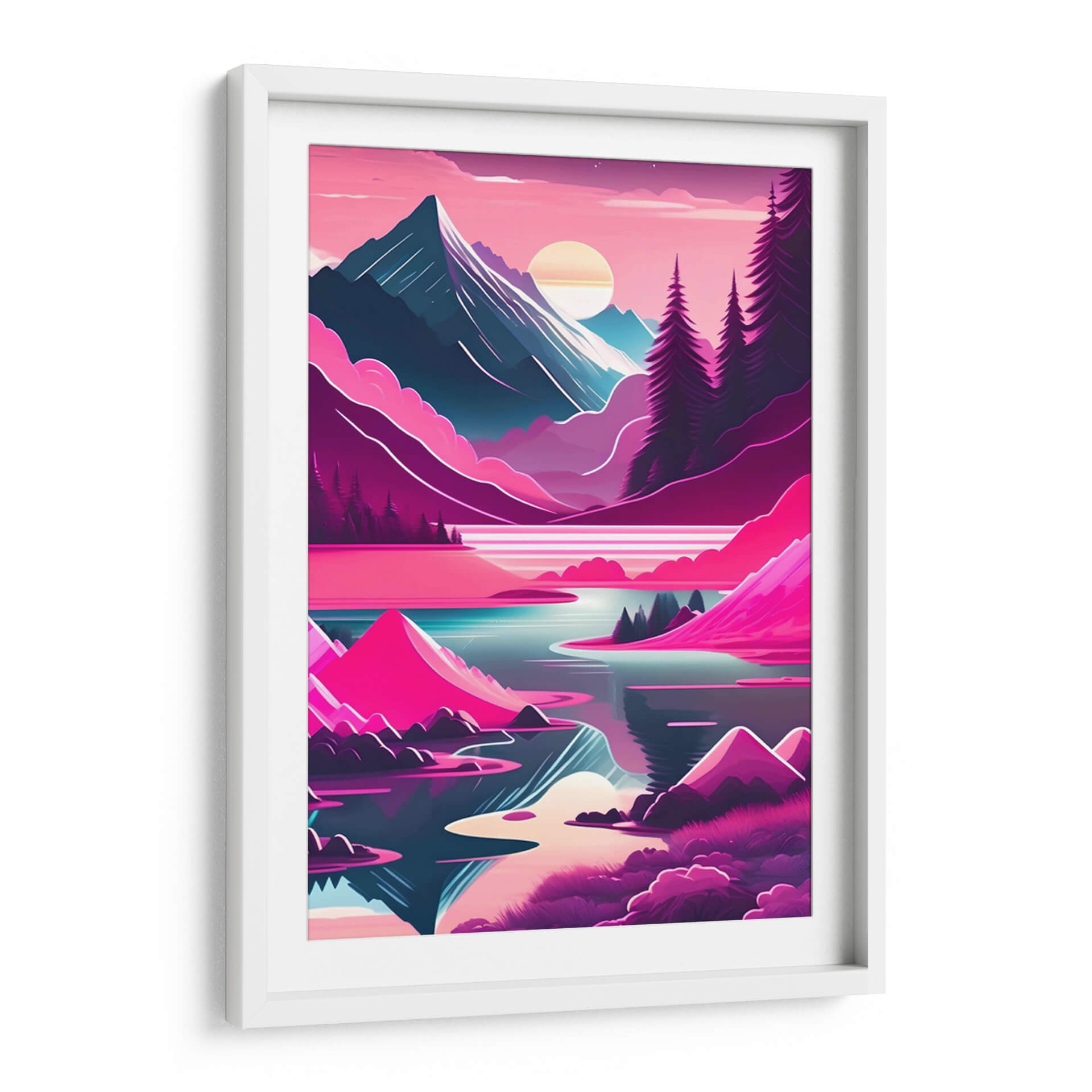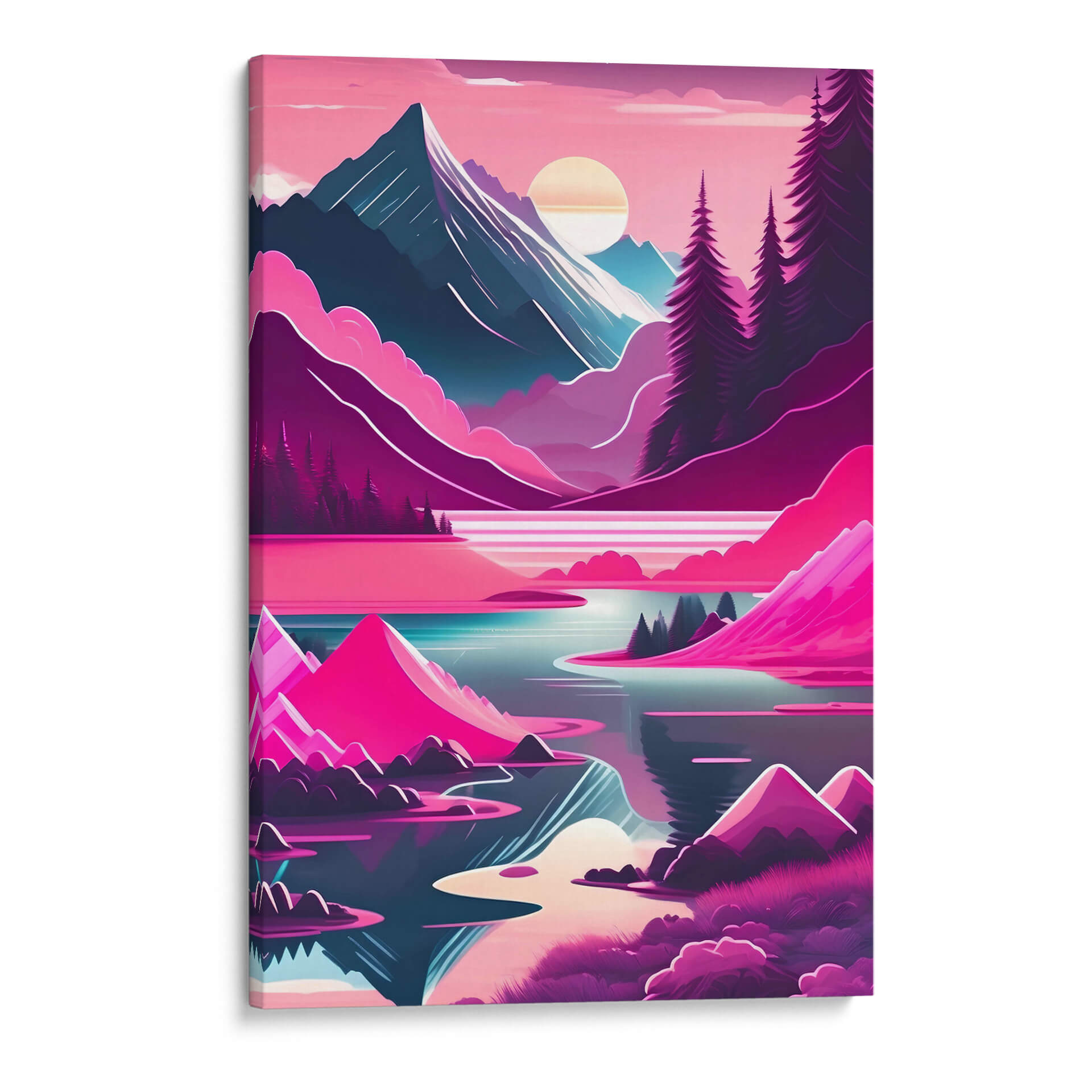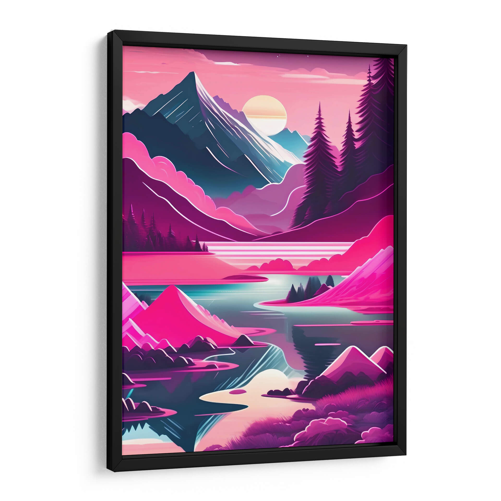 Sumérgete en la atmósfera vibrante de "Paisaje Rosa Plástico", una obra de arte digital que redefine la serenidad montañosa con una audaz paleta de colores. Este cuadro decorativo presenta una visión estilizada de majestuosas montañas que se reflejan en aguas tranquilas, bañadas por la luz cálida de un sol poniente. Las nubes rosadas y púrpuras, junto con los tonos profundos de azul y verde azulado de los picos, crean un contraste hipnótico que atrae la mirada y evoca una sensación de calma y asombro. Los árboles de coníferas oscuros añaden un toque de misterio y profundidad al paisaje. El estilo artístico, una mezcla de abstracción y realismo estilizado, permite que la pieza se adapte a una variedad de decoraciones, desde modernas hasta contemporáneas. Este cuadro es ideal para infundir energía y un toque de fantasía a tu sala de estar, dormitorio u oficina, convirtiéndose en un punto focal que inspira conversación y admiración. Su diseño único y su composición dinámica invitan a la contemplación, ofreciendo una escapada visual a un mundo imaginario lleno de color y serenidad.