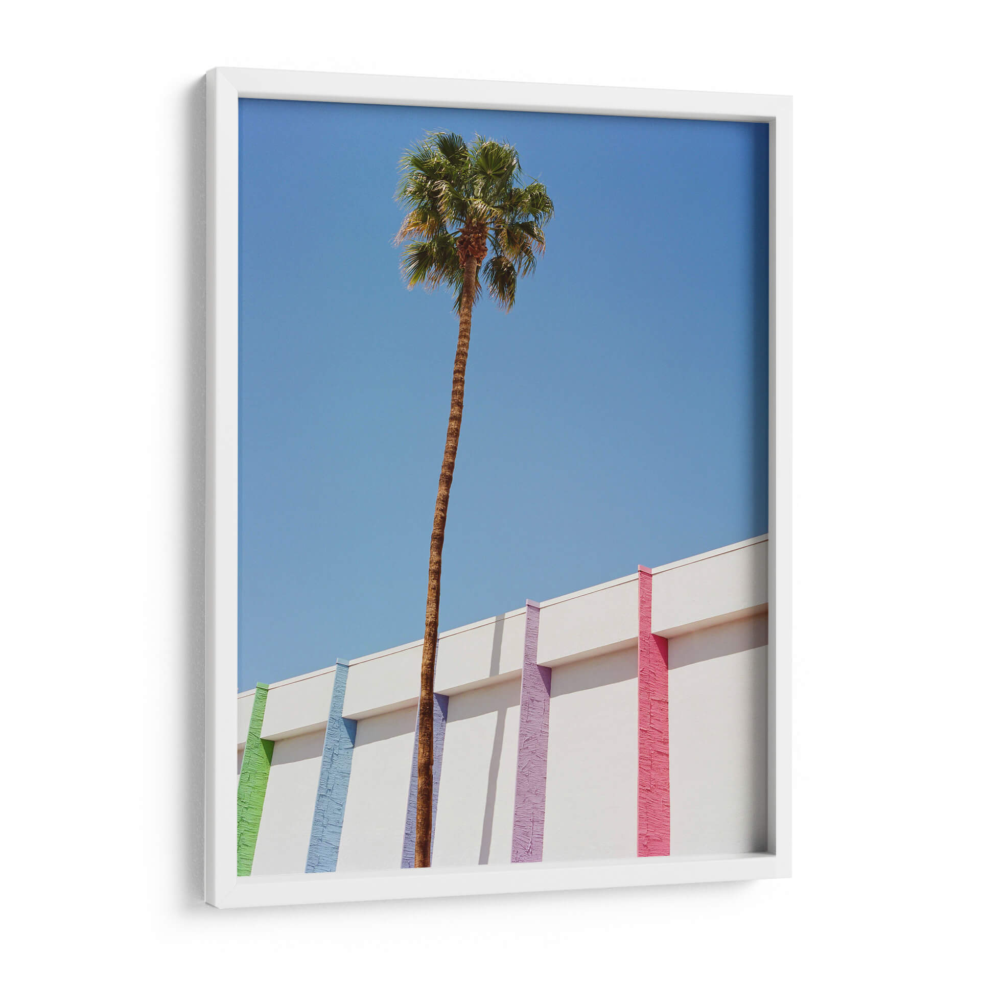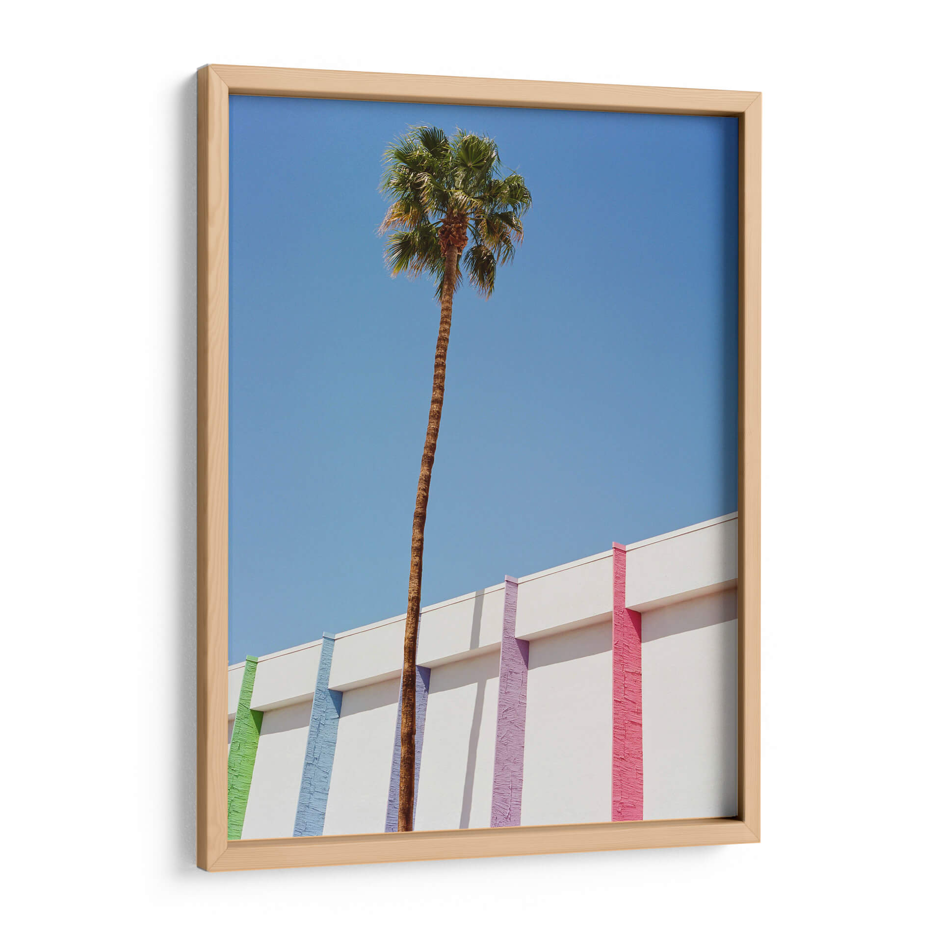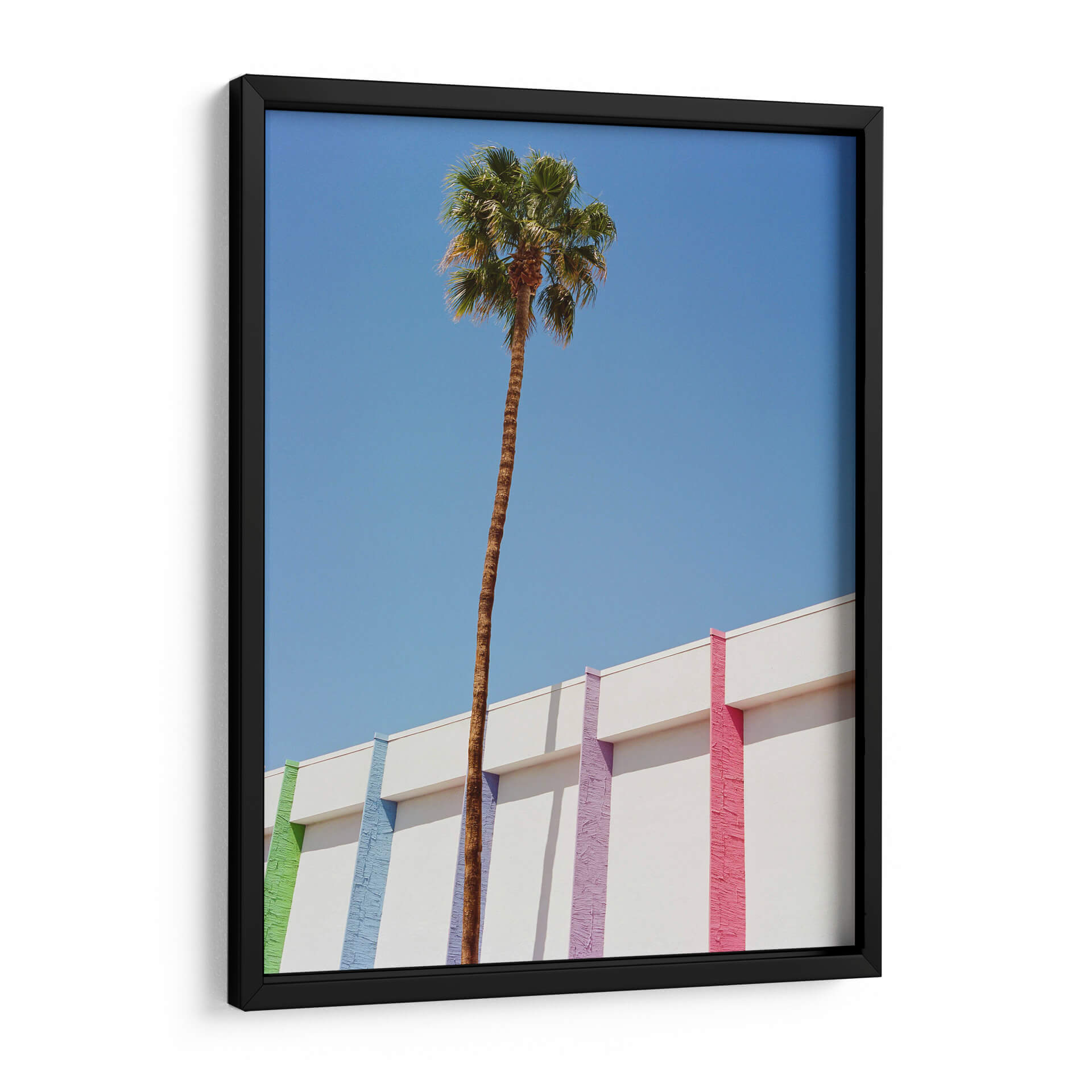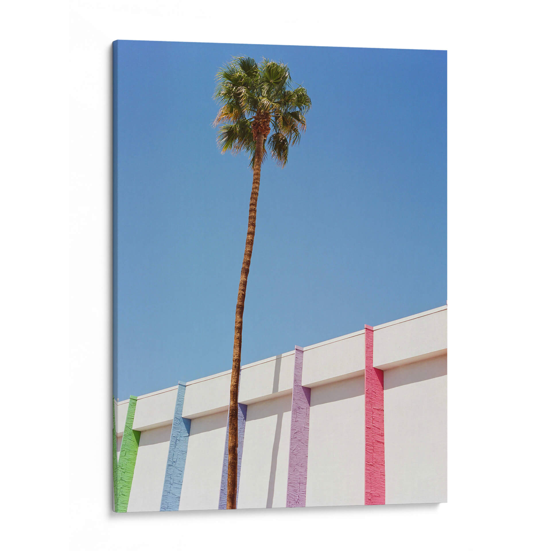 Sumérgete en la vibrante energía de 'Palm Springs II', una obra de arte que captura la esencia icónica de la arquitectura moderna y la exuberante naturaleza. Esta pieza, creada por Bethany Young, presenta una imponente palmera solitaria elevándose contra un cielo azul despejado, un símbolo de tranquilidad y verano eterno. La base de la composición se define por una estructura arquitectónica de líneas limpias, acentuada por franjas verticales de colores vivos: verde esmeralda, azul cielo, lavanda y fucsia. Estos toques de color añaden un dinamismo y un aire retro-chic a la escena, contrastando armoniosamente con la paleta más sobria del tronco de la palmera y el blanco de la pared. El estilo fotográfico y la composición minimalista dirigen la mirada hacia la interacción entre lo natural y lo construido, evocando una sensación de escapismo y sofisticación. Este cuadro decorativo es ideal para aportar un toque de color y personalidad a salones modernos, estudios o incluso espacios exteriores cubiertos. Su atmósfera de cálido sol y brisa suave invita a la relajación y al optimismo, convirtiéndola en una adición inspiradora para cualquier hogar u oficina que busque un reflejo de estilo de vida relajado y estético. 'Palm Springs II' es más que una imagen; es una invitación a la contemplación y a la celebración de la belleza.
