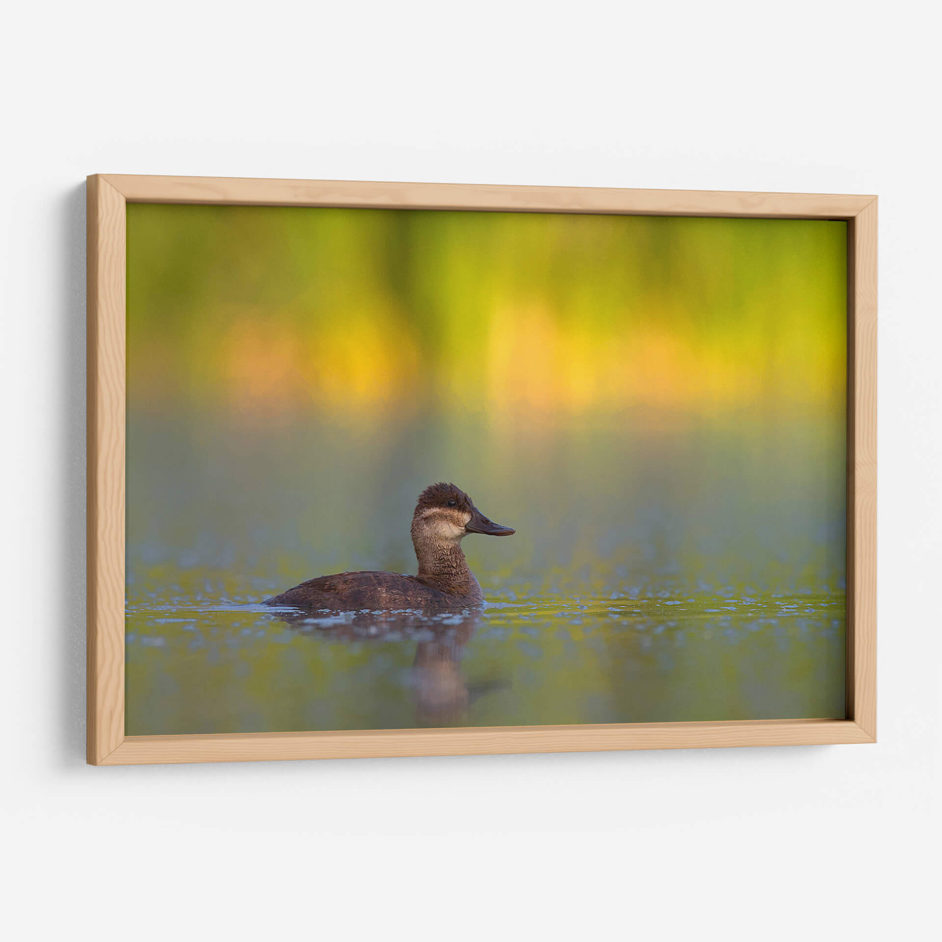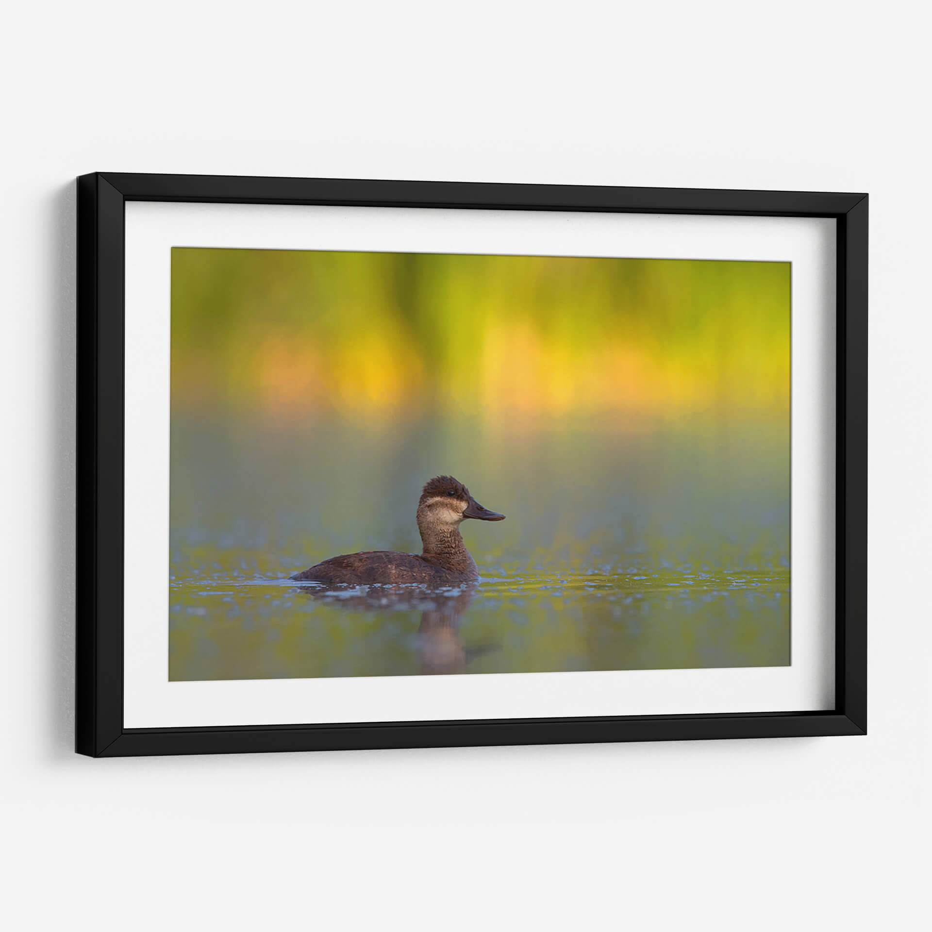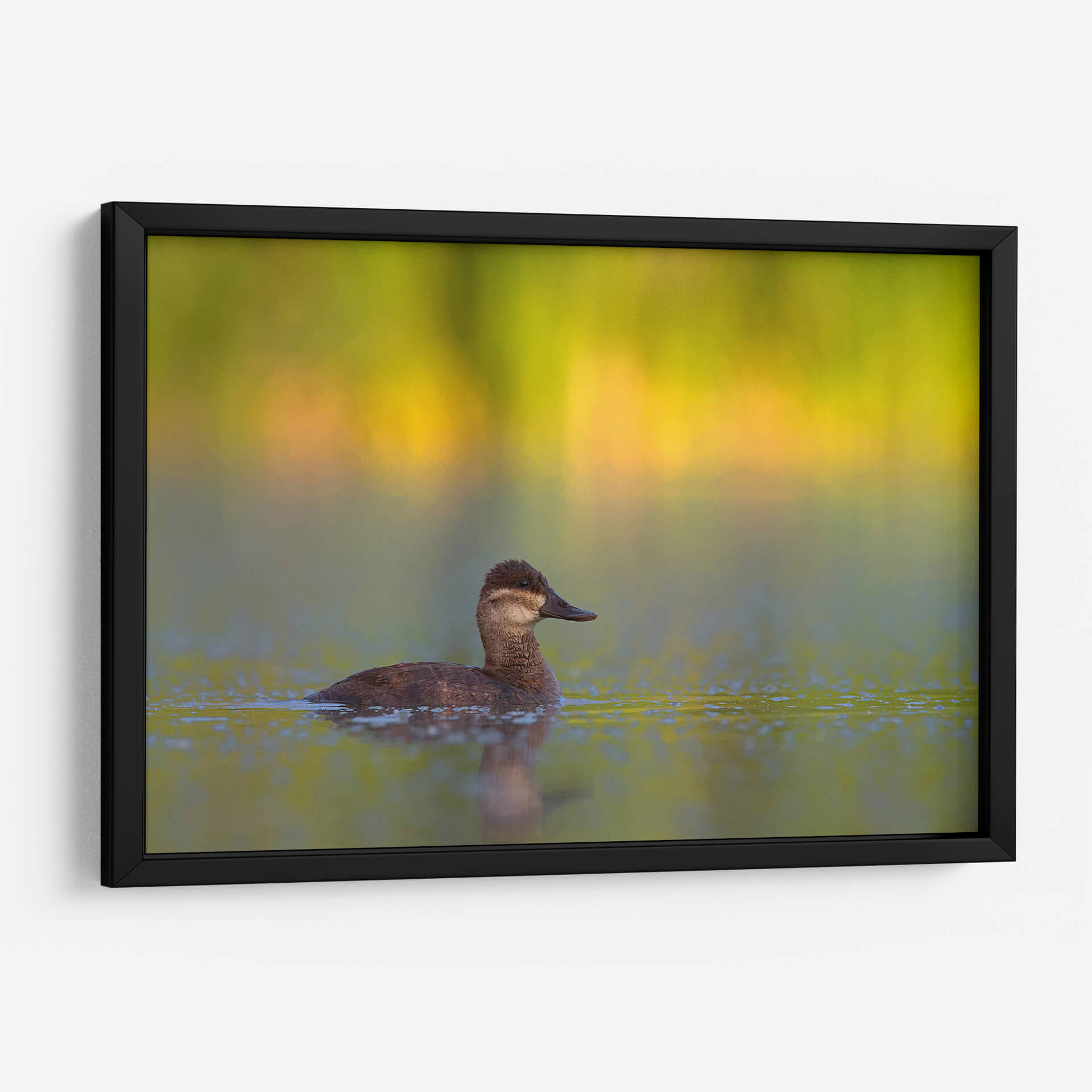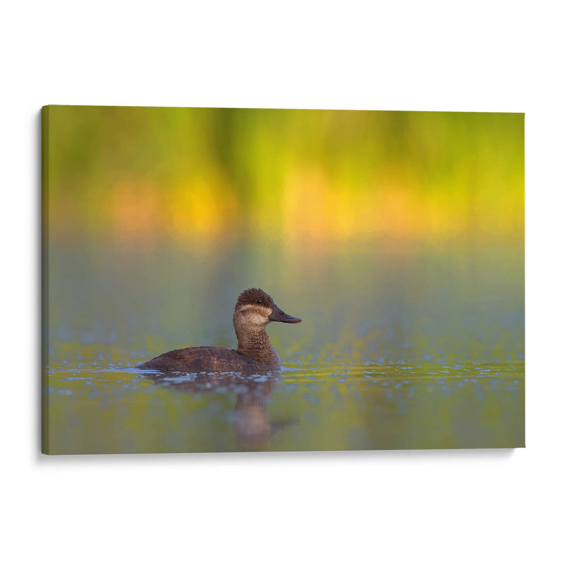 Captura la serenidad del amanecer con este cautivador cuadro decorativo de un pato nadando en aguas tranquilas. La obra de arte, titulada "Pato Tepalcate al amanecer" del artista Cuauhtli.foto, transporta al espectador a un momento de paz natural. La paleta de colores, dominada por verdes y amarillos vibrantes que evocan la luz del sol naciente, se combina con suaves tonos grises y azules en el agua, creando un ambiente relajante y armónico. El pato, representado con detalle en un suave enfoque, es el protagonista de la composición, invitando a la contemplación. Este cuadro es ideal para añadir un toque de naturaleza y calma a cualquier espacio, ya sea una sala de estar moderna, un dormitorio acogedor o una oficina que necesite un respiro visual. Su estilo fotográfico realista con un toque impresionista en el fondo lo convierte en una pieza versátil que complementará decoraciones contemporáneas y orgánicas. Descubre la belleza efímera de un nuevo día con esta obra que promete infundir tranquilidad y una conexión sutil con el mundo natural en tu hogar.