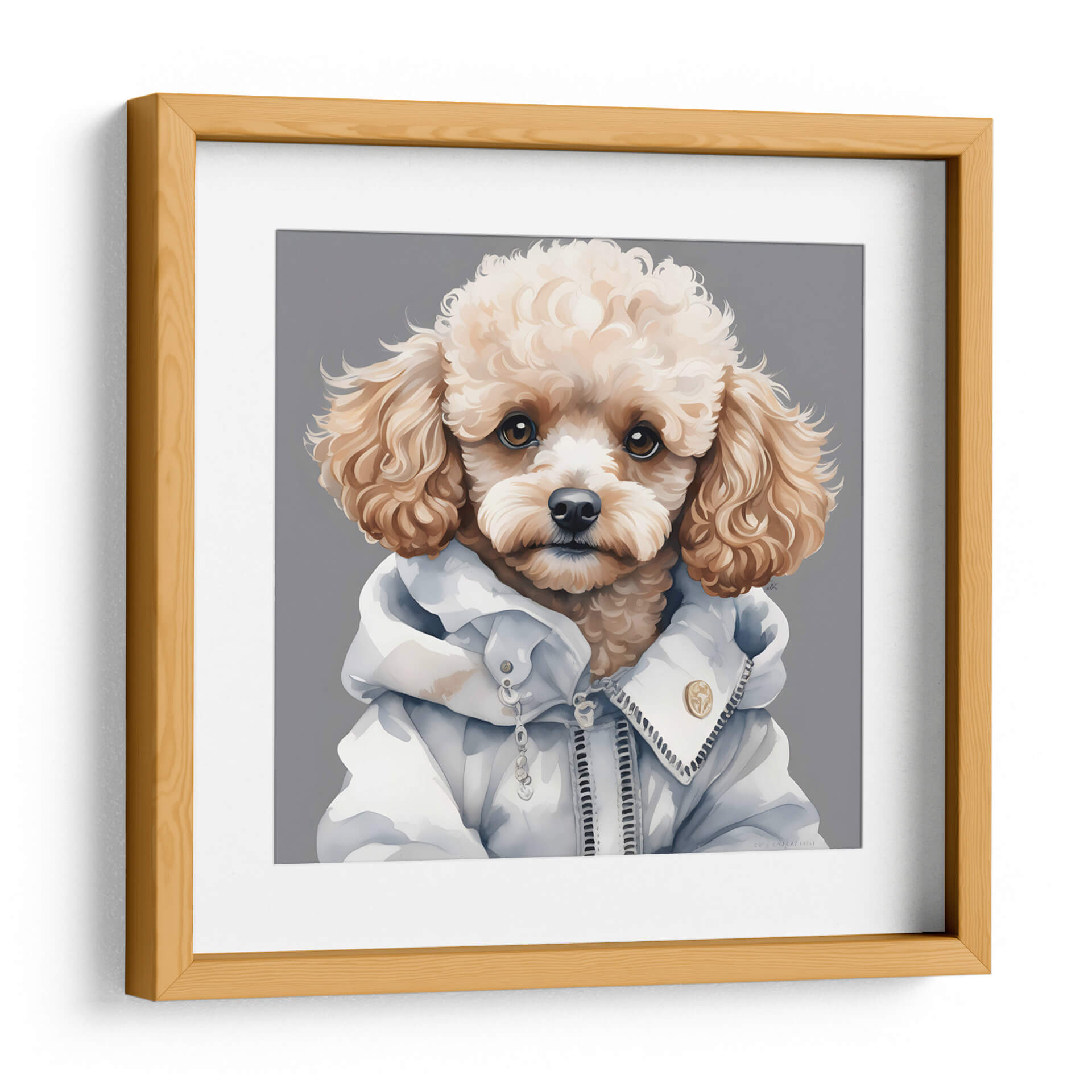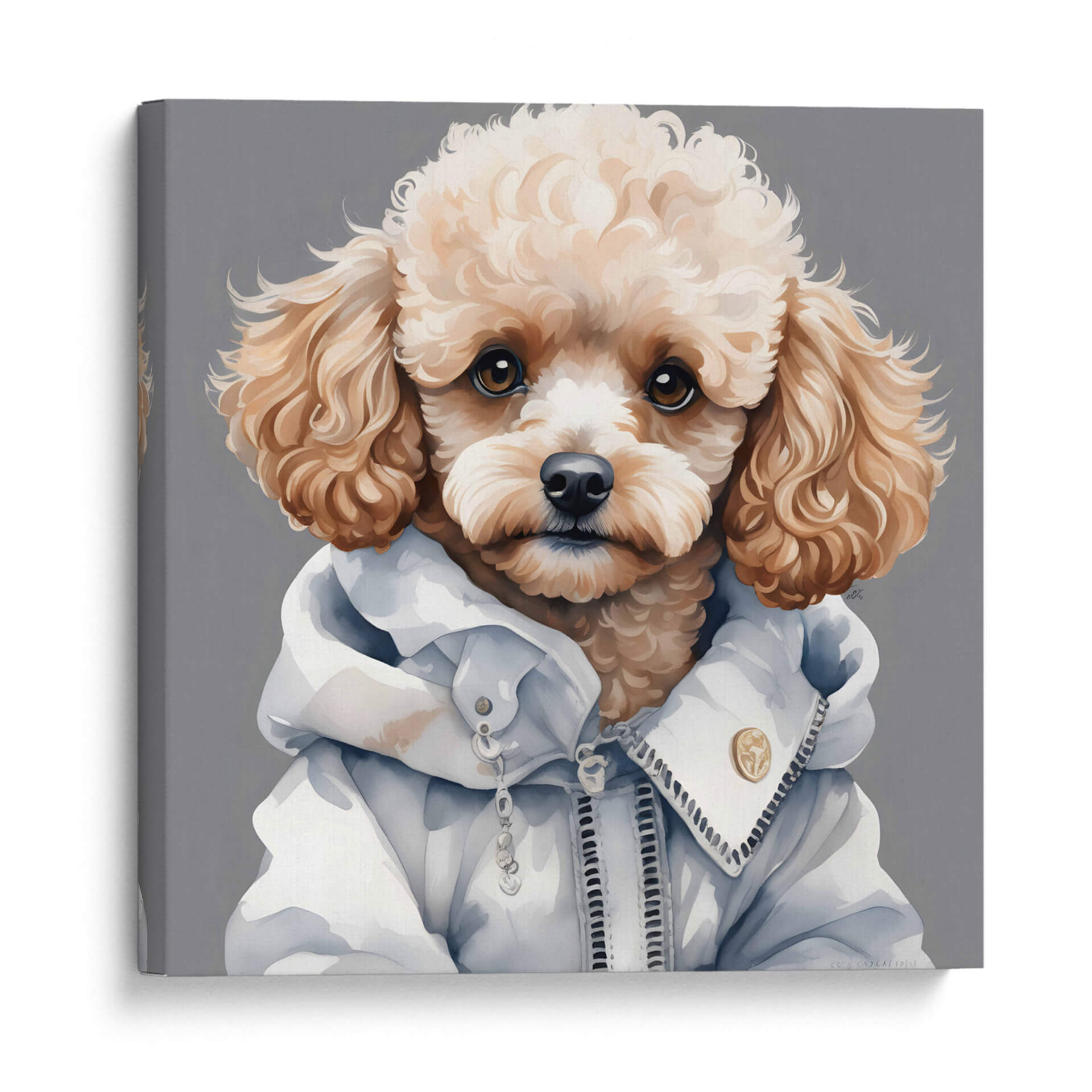 Embellece tu espacio con este cautivador cuadro decorativo de un caniche macho a la moda, una obra de arte contemporáneo que irradia estilo y personalidad. La pieza presenta un primer plano del elegante caniche, con su característico pelaje rizado y ojos expresivos, vestido con una moderna chaqueta blanca con detalles de cremallera y botones. La paleta de colores, dominada por tonos neutros y suaves, crea una atmósfera serena y sofisticada, perfecta para complementar una variedad de estilos decorativos, desde el minimalista hasta el moderno. El fondo grisáceo realza la figura del perro, convirtiéndolo en un punto focal instantáneo. La técnica artística evoca una sensación de ternura y audacia a la vez, ideal para quienes buscan añadir un toque de originalidad y calidez a su hogar u oficina. Este cuadro decorativo es una elección excepcional para amantes de los animales y del arte que aprecian la fusión de la moda y la expresión artística. Transforma cualquier habitación en una galería personal con esta pieza única que seguramente generará conversación y admiración. Su encanto atemporal y su diseño contemporáneo lo convierten en una adición versátil para salas de estar, dormitorios, estudios o cualquier lugar donde se desee un toque de elegancia canina.