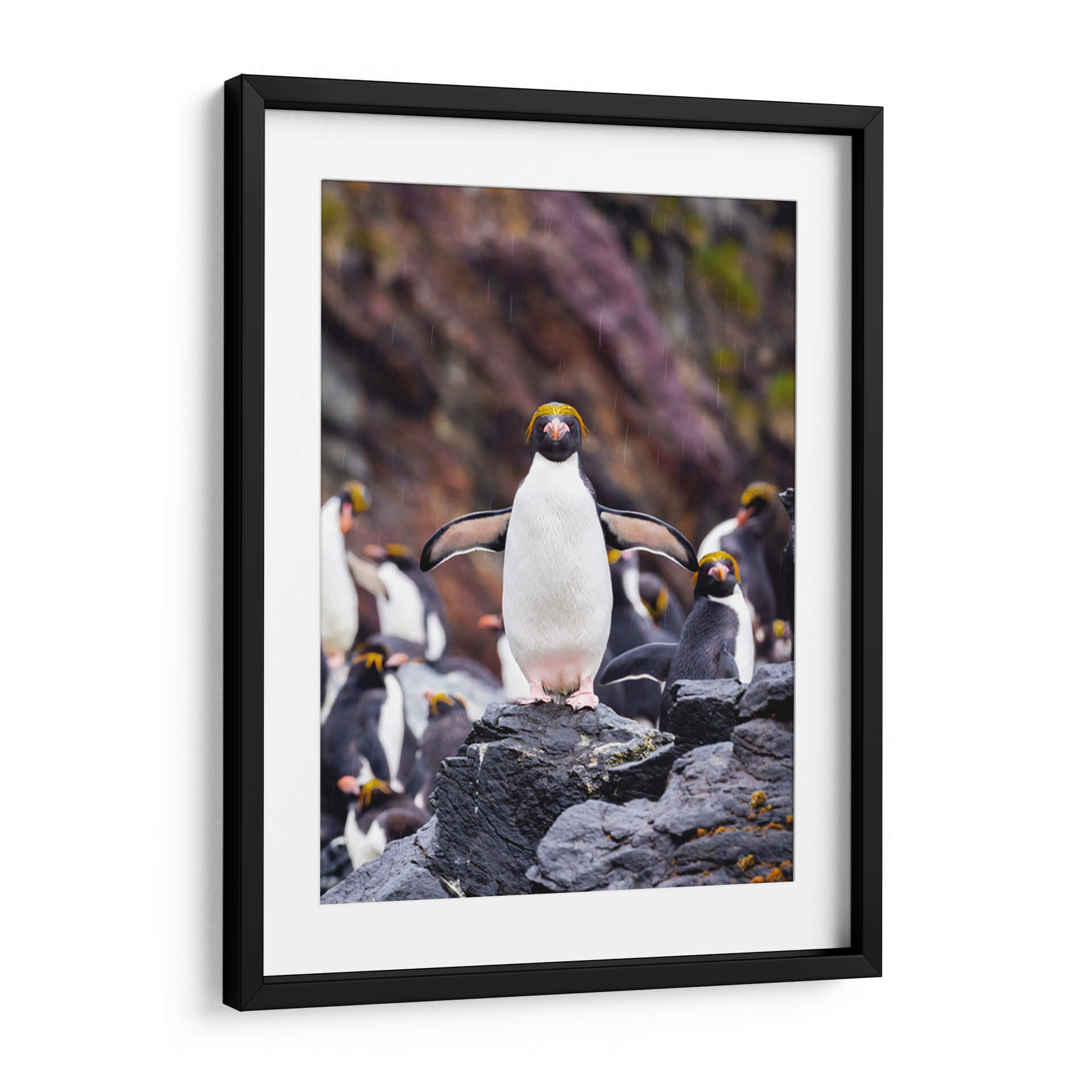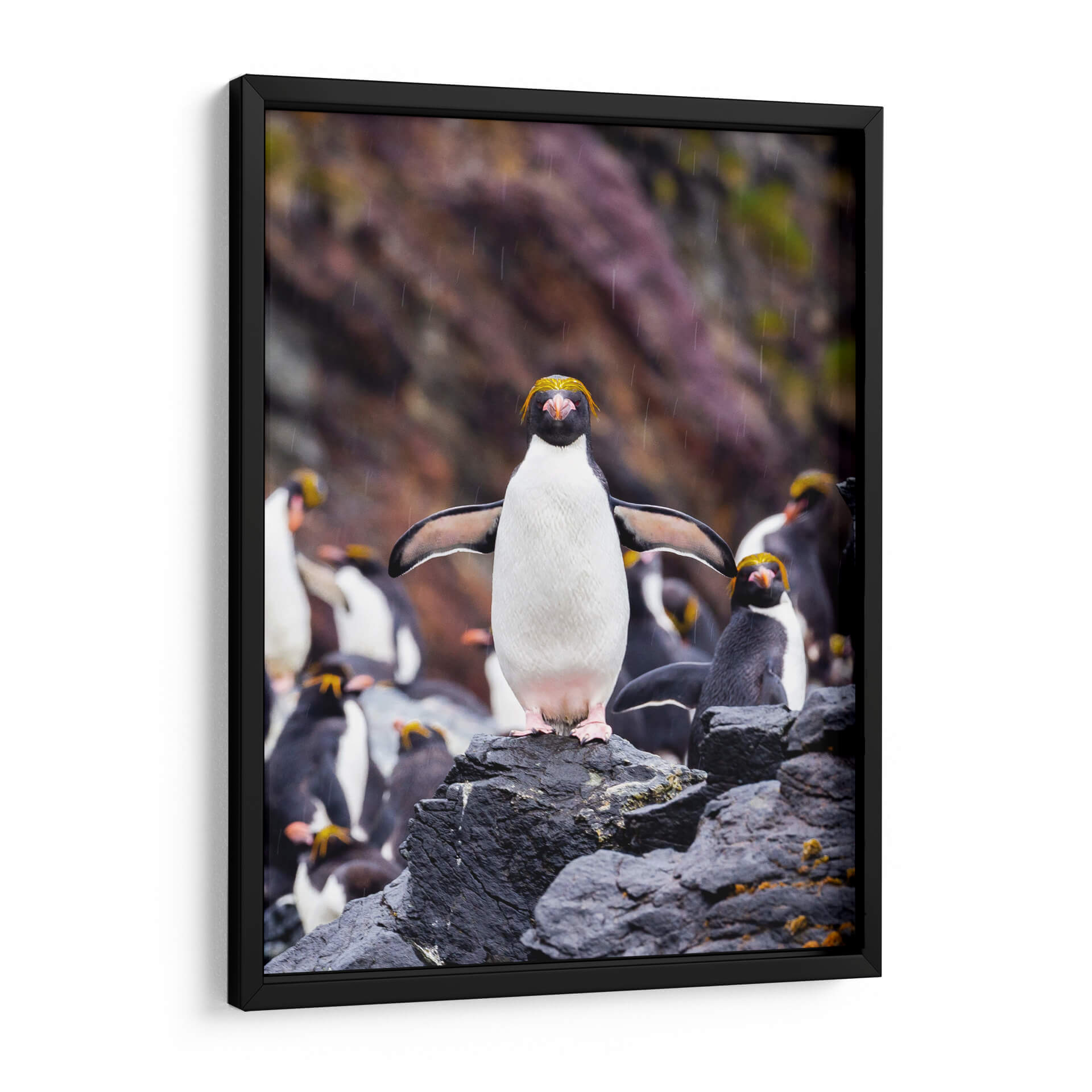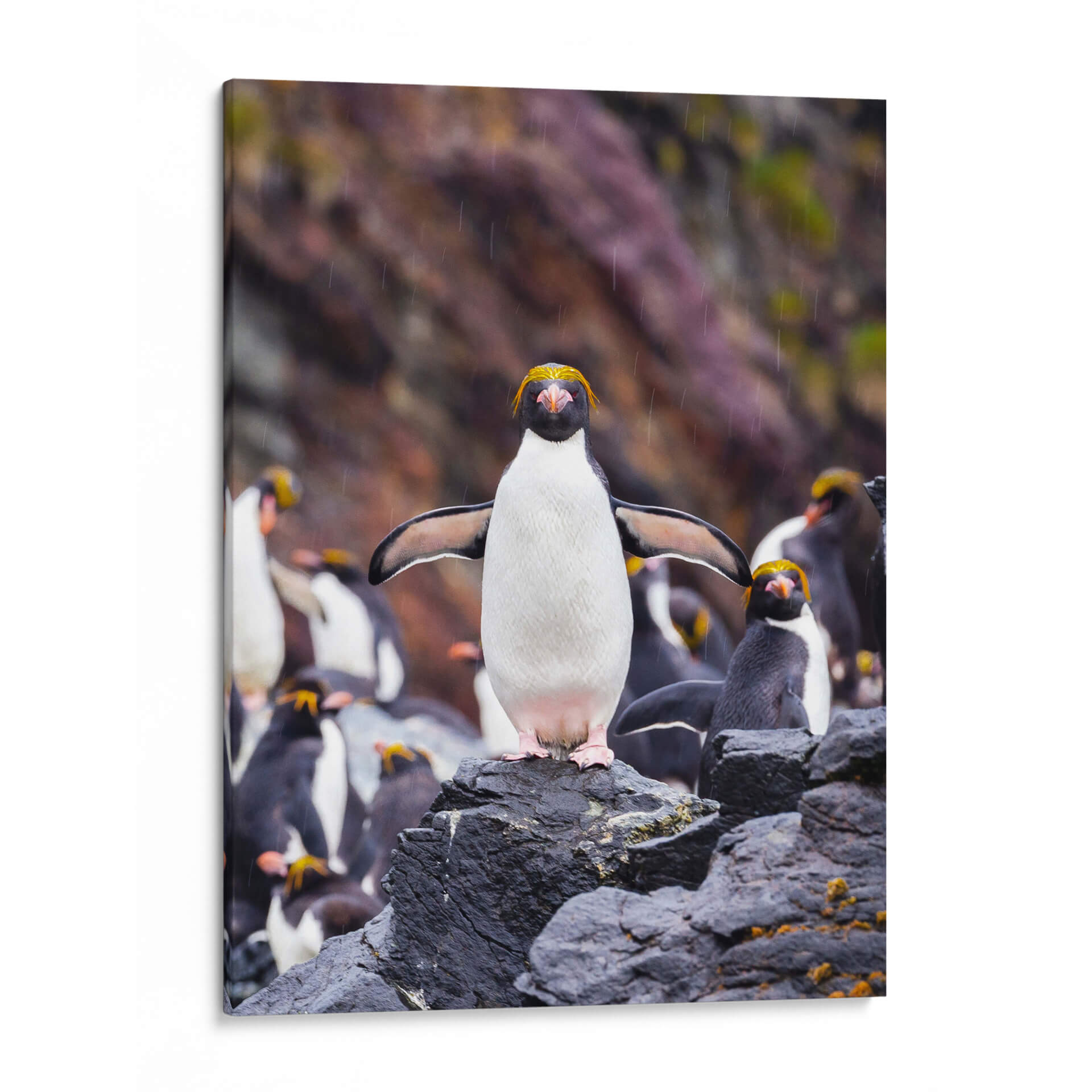 Captura la esencia de la vida silvestre con este cautivador cuadro decorativo que presenta un pingüino en primer plano, con sus brazos extendidos en una pose distintiva. La obra de Carlos Montaño, titulada 'Pingüino Maraconi de frente', sumerge al espectador en un ambiente natural y ligeramente melancólico, acentuado por la sutil presencia de lluvia. Los colores vibrantes del penacho amarillo del pingüino contrastan con los tonos oscuros y terrosos del fondo rocoso y el ambiente lluvioso, creando una imagen de gran impacto visual. Los pingüinos en el fondo, representados con detalle y profundidad, añaden una sensación de comunidad y pertenencia a la escena. Este cuadro es ideal para aquellos que buscan inyectar personalidad y un toque de la naturaleza salvaje a sus espacios, ya sea una sala de estar moderna, un despacho o un dormitorio. Su composición centrada y la mirada directa del pingüino principal generan una conexión inmediata con el observador. Transmite una sensación de audacia y singularidad, perfecto para quienes aprecian la belleza de la fauna y desean una pieza de arte que inspire conversación y refleje un espíritu aventurero. Añade un toque de la majestuosidad del mundo natural a tu decoración con esta impresionante obra.