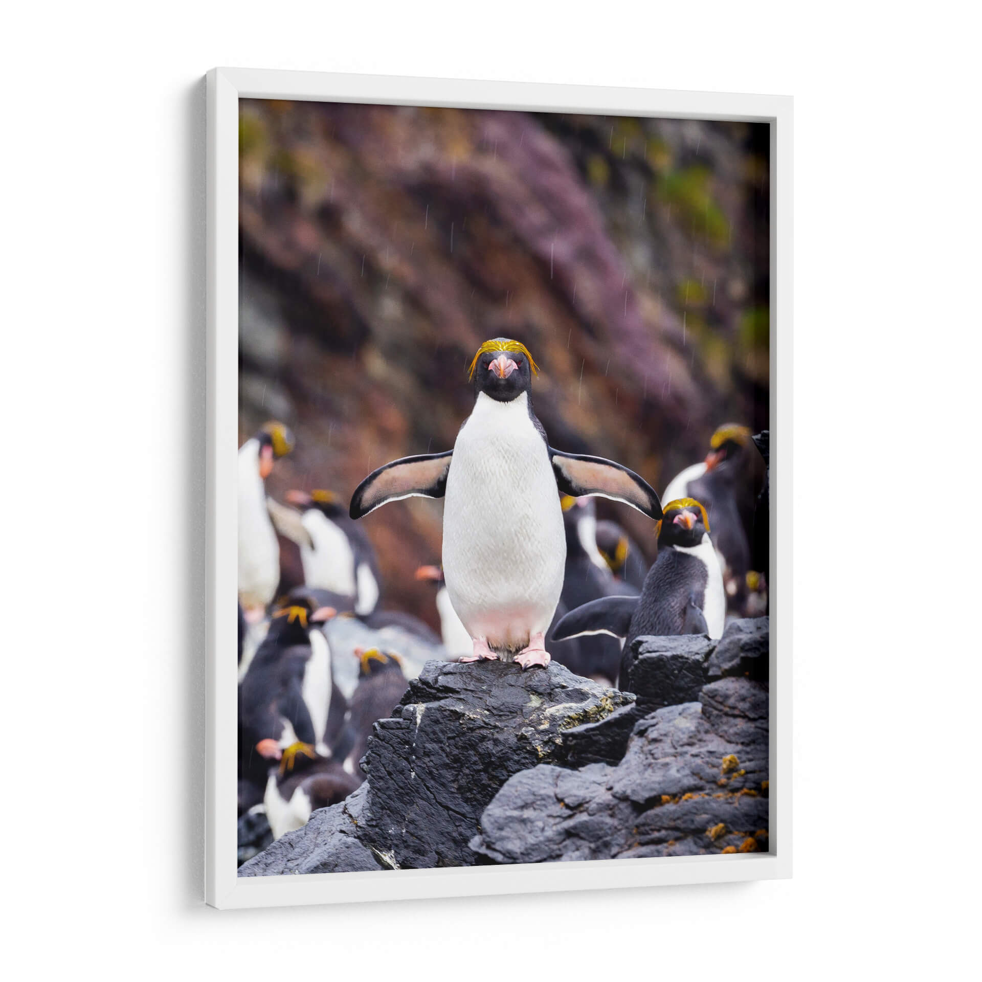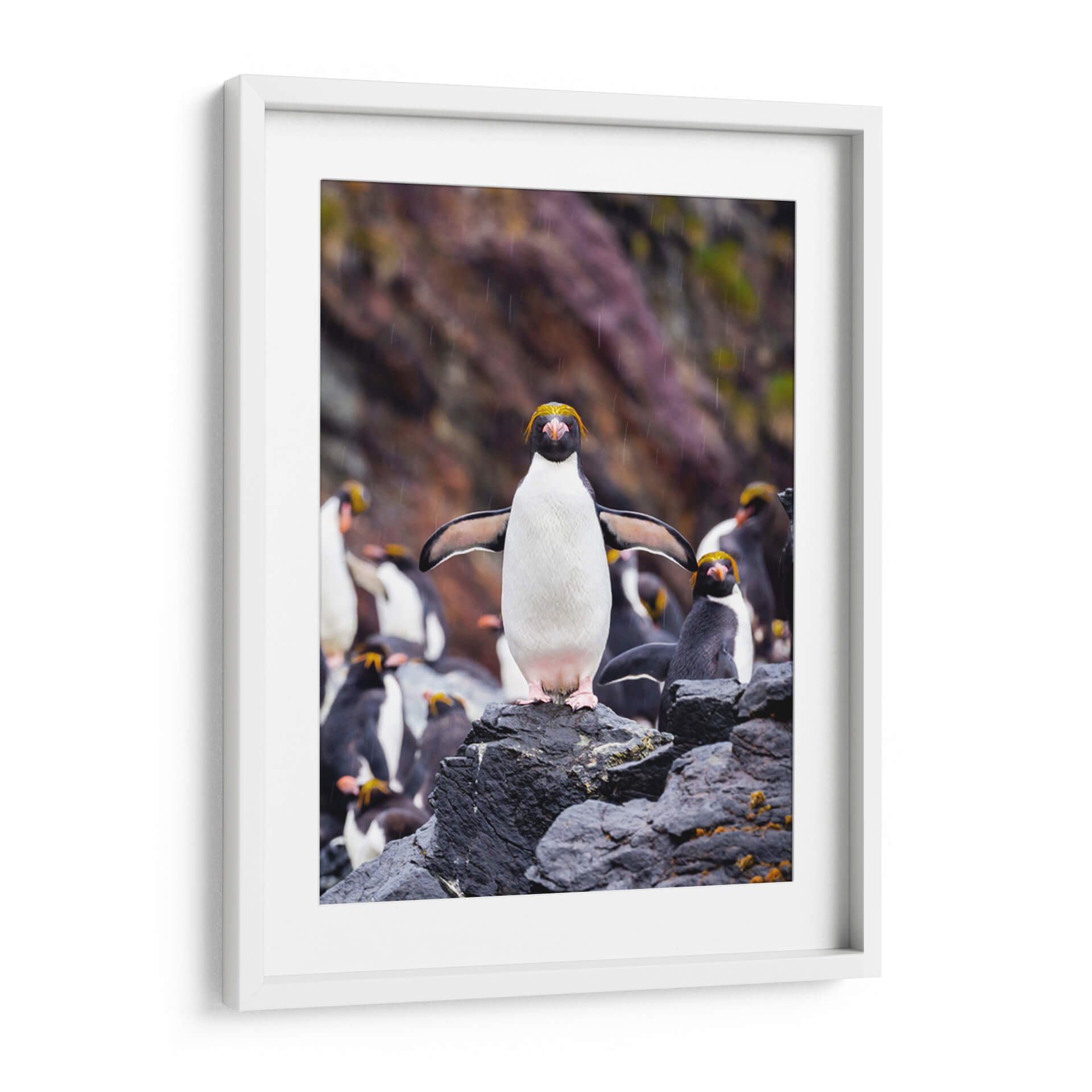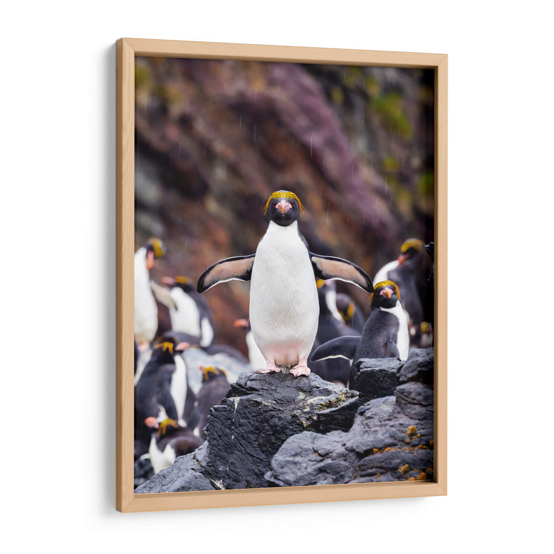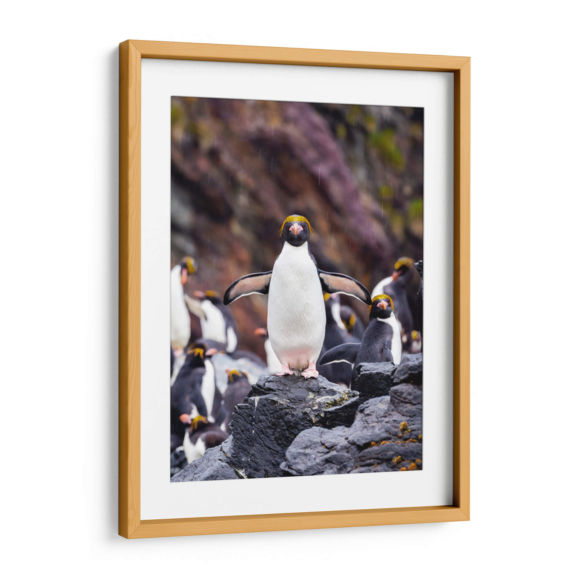 Captura la esencia de la vida silvestre con este cautivador cuadro decorativo que presenta un pingüino en primer plano, con sus brazos extendidos en una pose distintiva. La obra de Carlos Montaño, titulada 'Pingüino Maraconi de frente', sumerge al espectador en un ambiente natural y ligeramente melancólico, acentuado por la sutil presencia de lluvia. Los colores vibrantes del penacho amarillo del pingüino contrastan con los tonos oscuros y terrosos del fondo rocoso y el ambiente lluvioso, creando una imagen de gran impacto visual. Los pingüinos en el fondo, representados con detalle y profundidad, añaden una sensación de comunidad y pertenencia a la escena. Este cuadro es ideal para aquellos que buscan inyectar personalidad y un toque de la naturaleza salvaje a sus espacios, ya sea una sala de estar moderna, un despacho o un dormitorio. Su composición centrada y la mirada directa del pingüino principal generan una conexión inmediata con el observador. Transmite una sensación de audacia y singularidad, perfecto para quienes aprecian la belleza de la fauna y desean una pieza de arte que inspire conversación y refleje un espíritu aventurero. Añade un toque de la majestuosidad del mundo natural a tu decoración con esta impresionante obra.