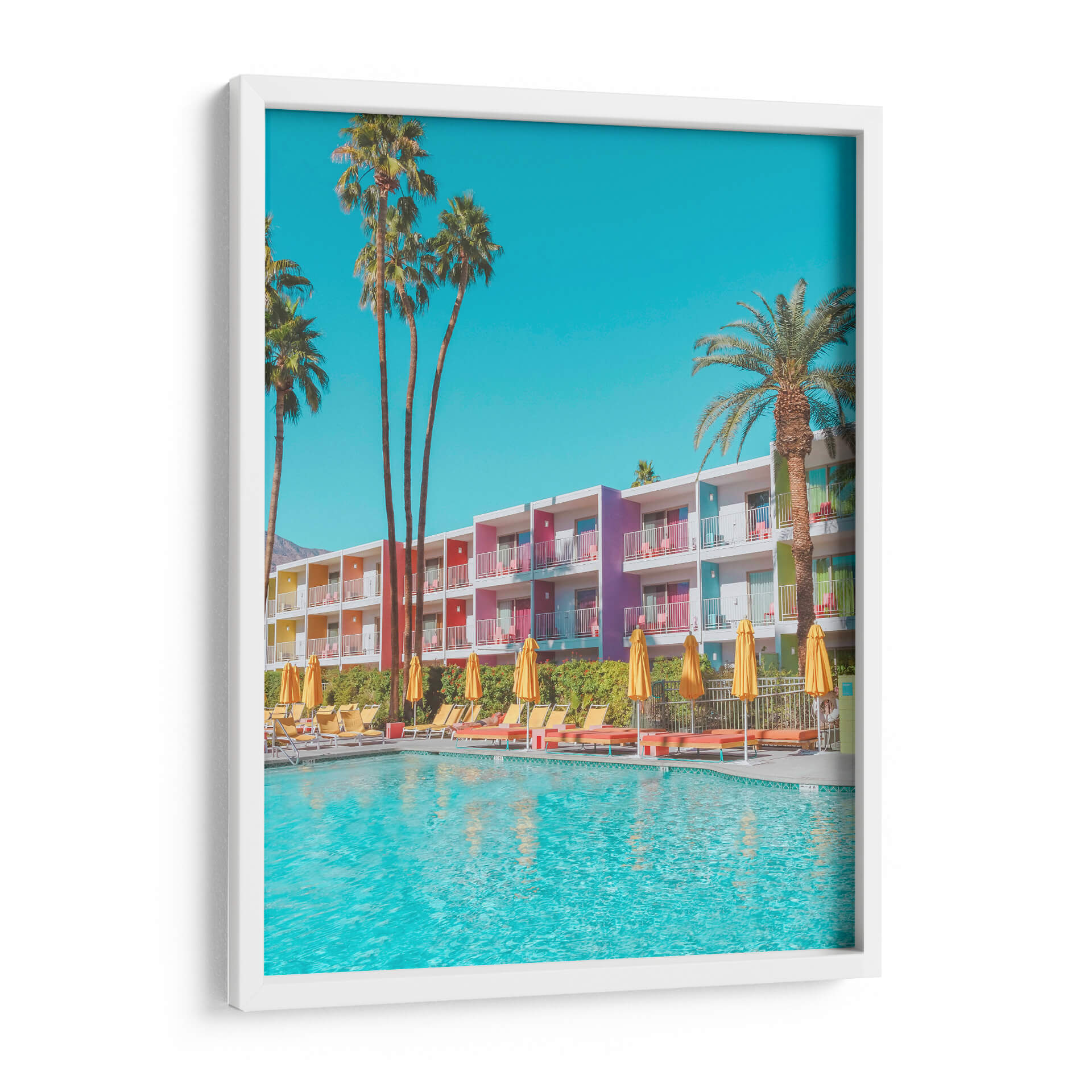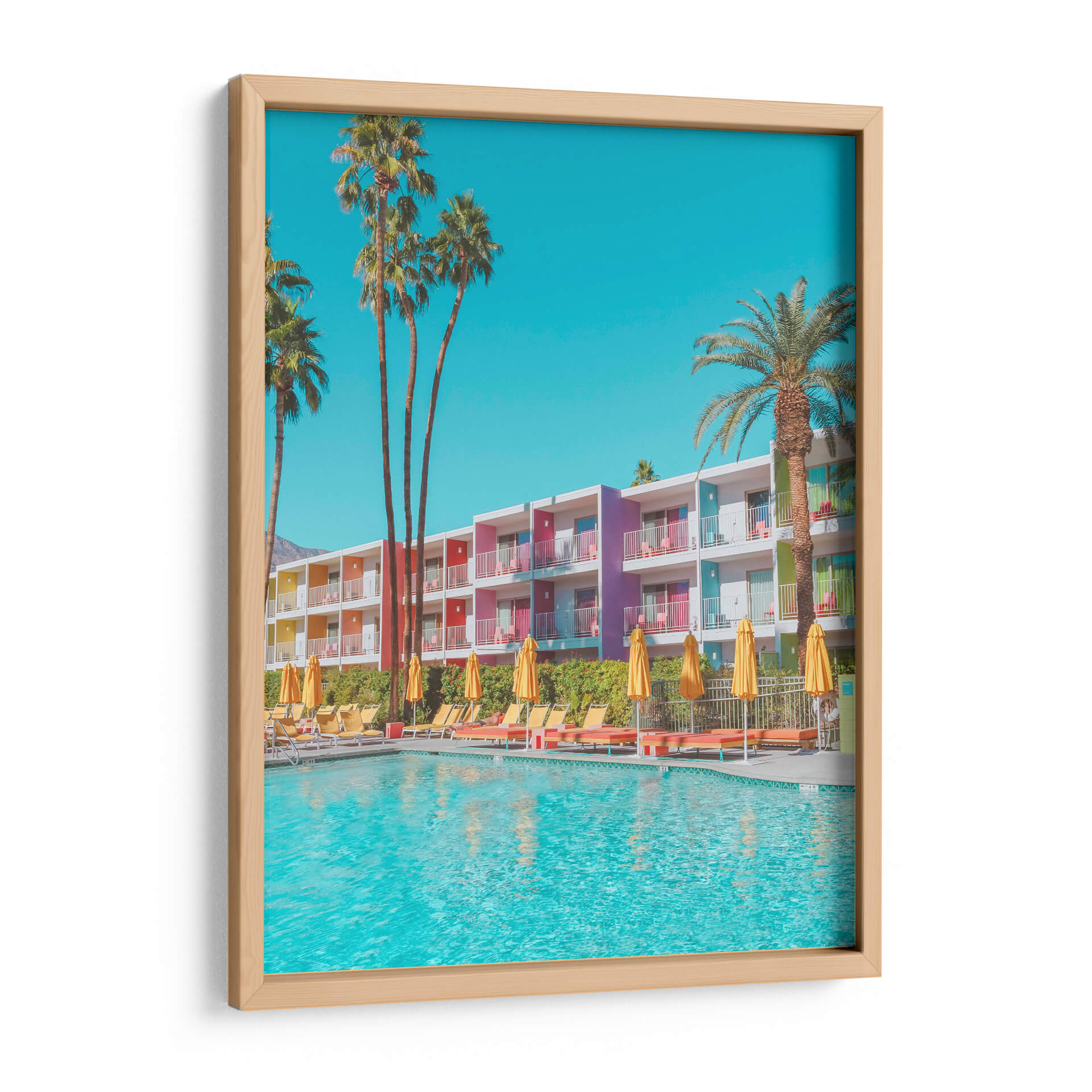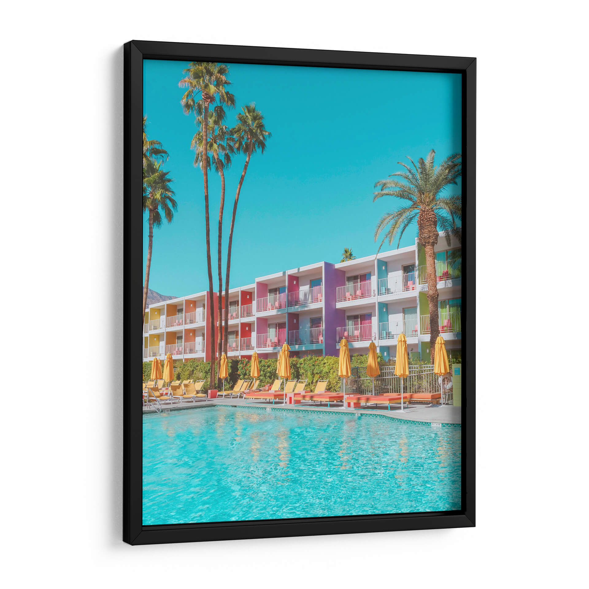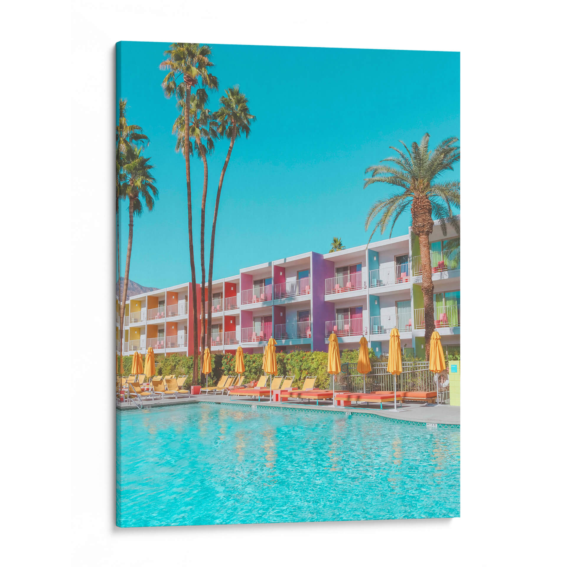 Sumérgete en la vibrante escena de Palm Springs con este cautivador cuadro decorativo, "Piscina del hotel Saguaro". La obra de Tom Windeknecht captura la esencia de un día soleado y relajado, invitándote a un oasis de tranquilidad y color. La imponente paleta de azules celestes y turquesas intensos del cielo y la piscina contrasta de manera exquisita con los vibrantes tonos pastel del hotel, que incluyen rosas, amarillos, púrpuras y blancos, creando una atmósfera de alegría y sofisticación moderna. Las esbeltas palmeras se alzan majestuosas contra el cielo despejado, añadiendo un toque exótico y tropical que evoca vacaciones y descanso. Las hileras de tumbonas y sombrillas amarillas invitan a la contemplación, sugiriendo un espacio de ocio y placer. Este cuadro es una celebración de la arquitectura retro y la vida al aire libre, transmitiendo una sensación de calma y escapismo. Ideal para transformar cualquier espacio, desde una sala de estar moderna hasta un dormitorio sereno o una oficina con un toque de personalidad, este lienzo decorativo aportará un aire de vacación perpetua y estilo inconfundible a tu hogar. Un recordatorio visual de la belleza del diseño y la serenidad del verano.