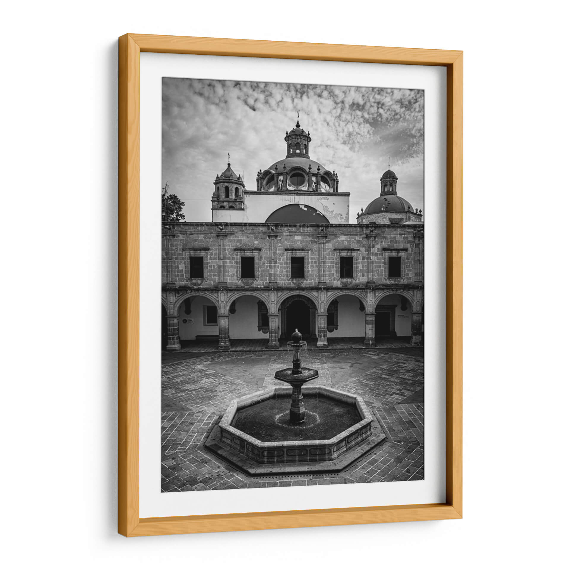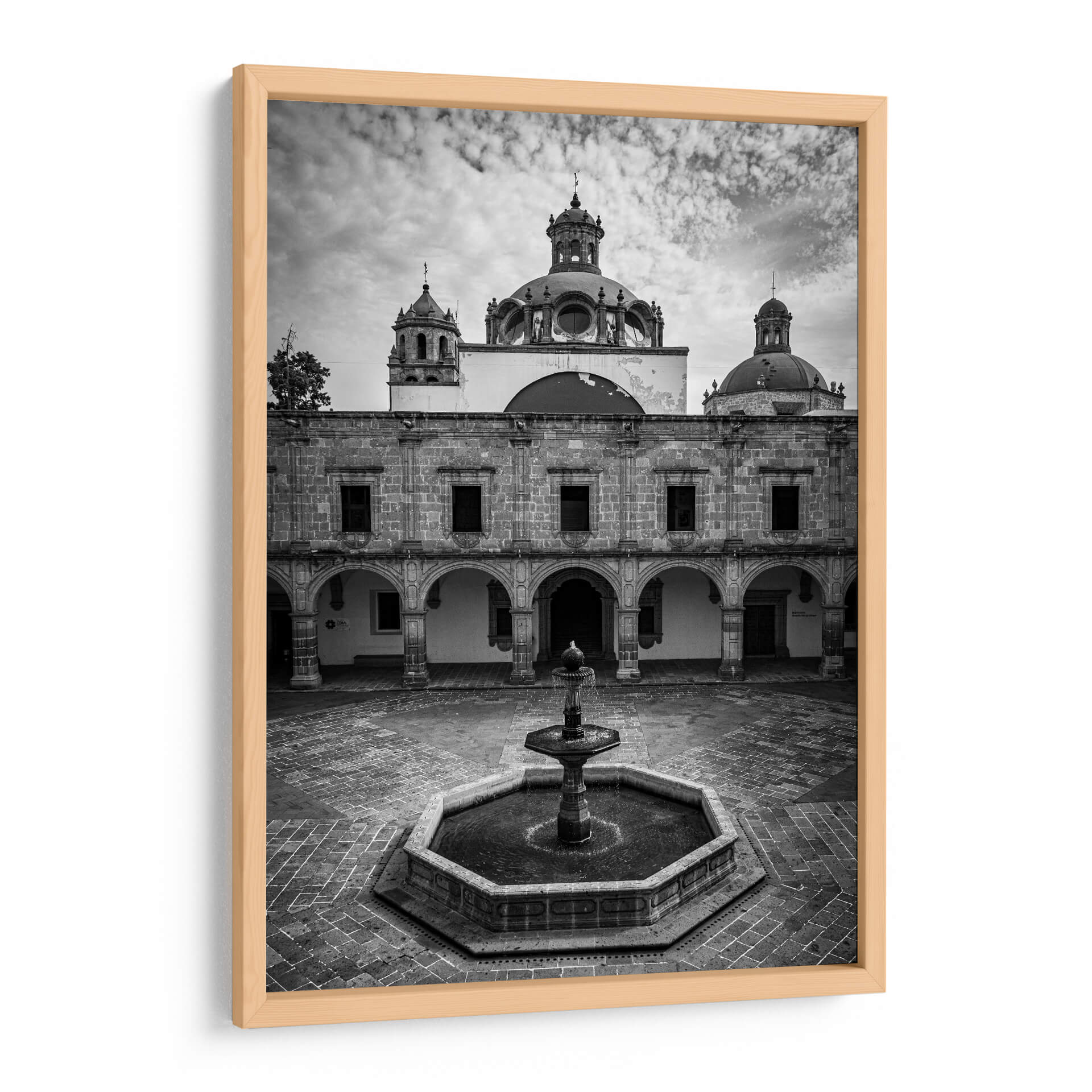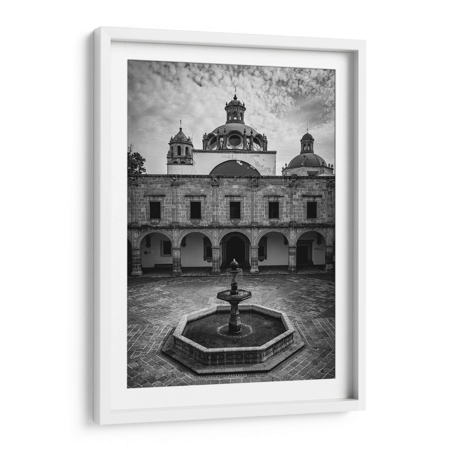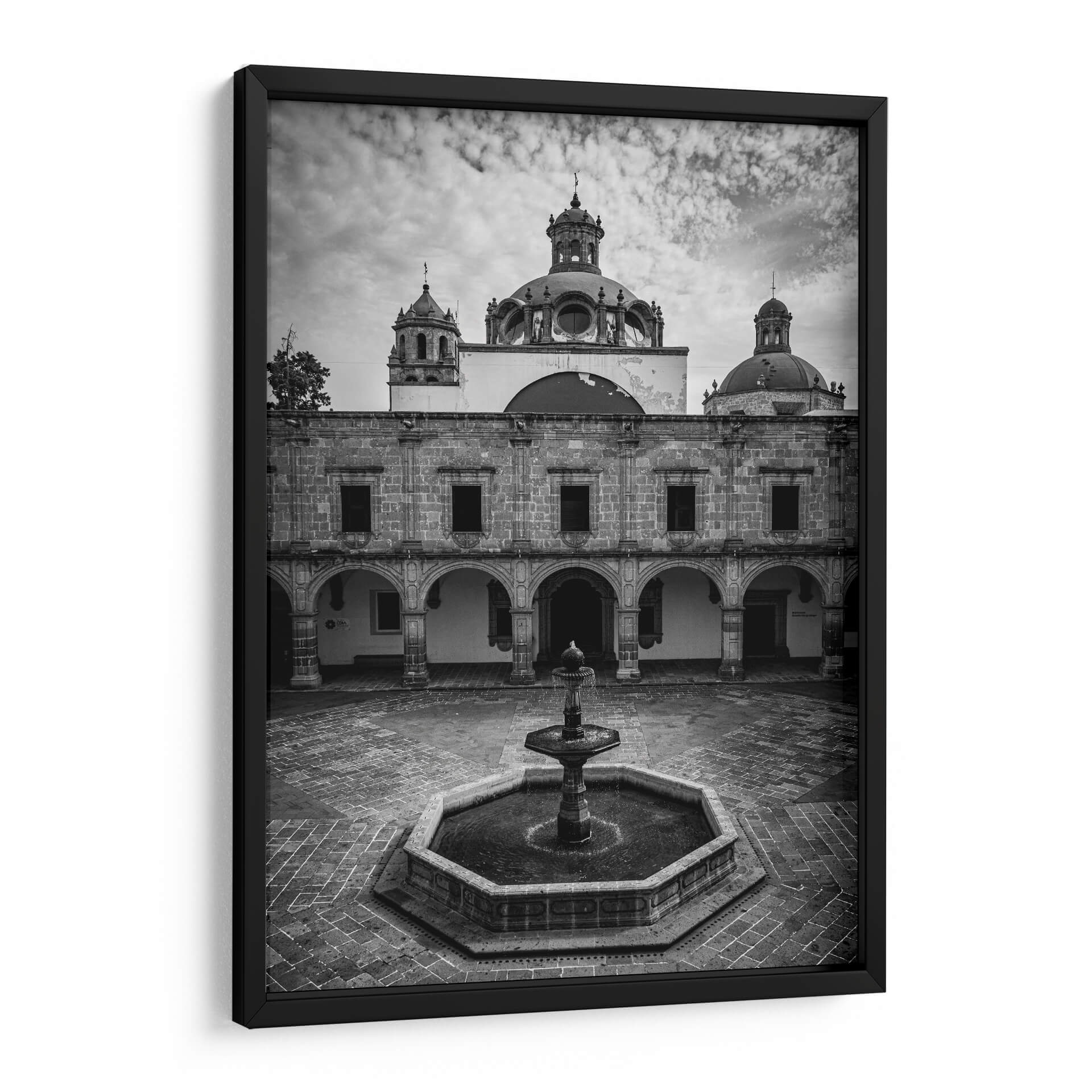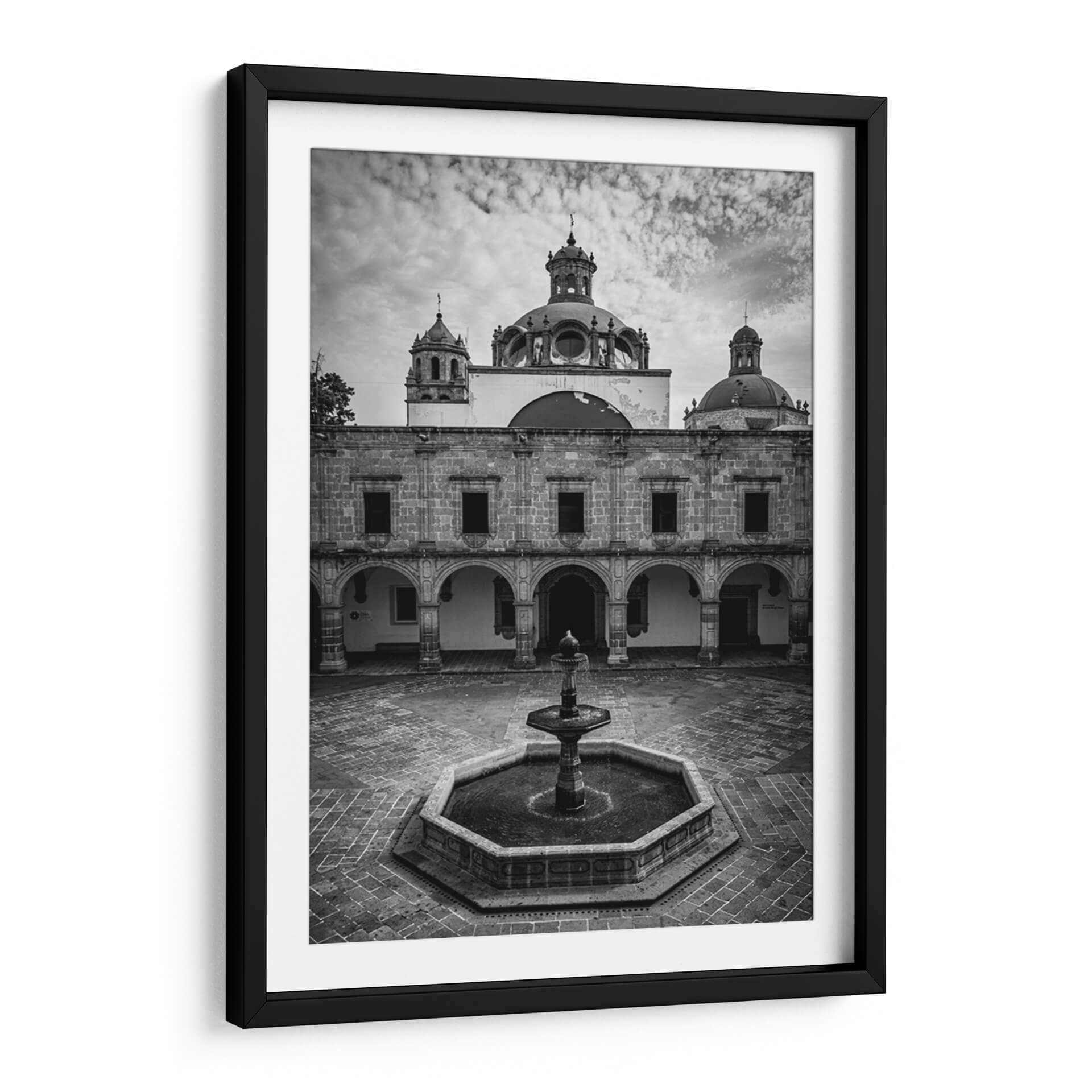 Sumérgete en la serena belleza arquitectónica de la Plaza Principal de Palacio Clavijero con esta cautivadora obra de arte en blanco y negro. La fotografía captura magistralmente la imponente fachada del palacio, destacando sus detalles históricos, las elegantes arcadas y la cúpula central que se eleva hacia un cielo nublado. La ausencia de color realza las texturas de la piedra y la profundidad de las sombras, creando una atmósfera de solemnidad y contemplación. En el centro del patio, una fuente de agua añade un elemento de dinamismo y frescura a la escena pétrea. Este cuadro decorativo es una pieza excepcional para quienes aprecian la arquitectura histórica y la fotografía de autor. Su estilo atemporal y su paleta monocromática lo convierten en un complemento perfecto para una variedad de espacios interiores, desde salas de estar clásicas hasta oficinas modernas, aportando un toque de elegancia, historia y refinamiento visual. La composición simétrica y los elementos arquitectónicos definidos invitan a la reflexión y al disfrute de la belleza arquitectónica en su máxima expresión. Ideal para añadir un punto focal con carácter y sofisticación a tu hogar u oficina.