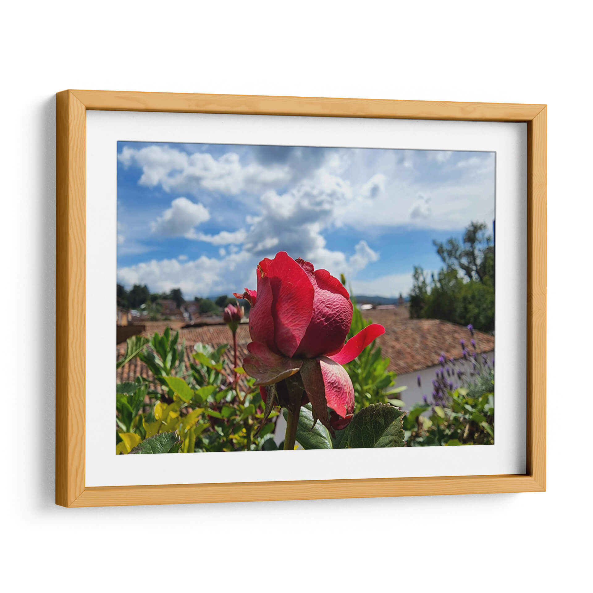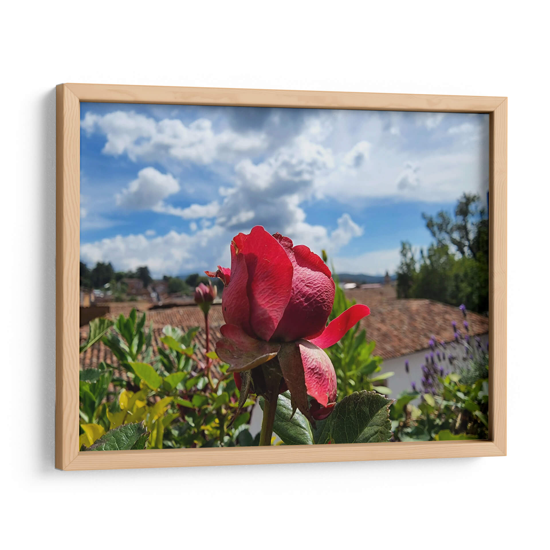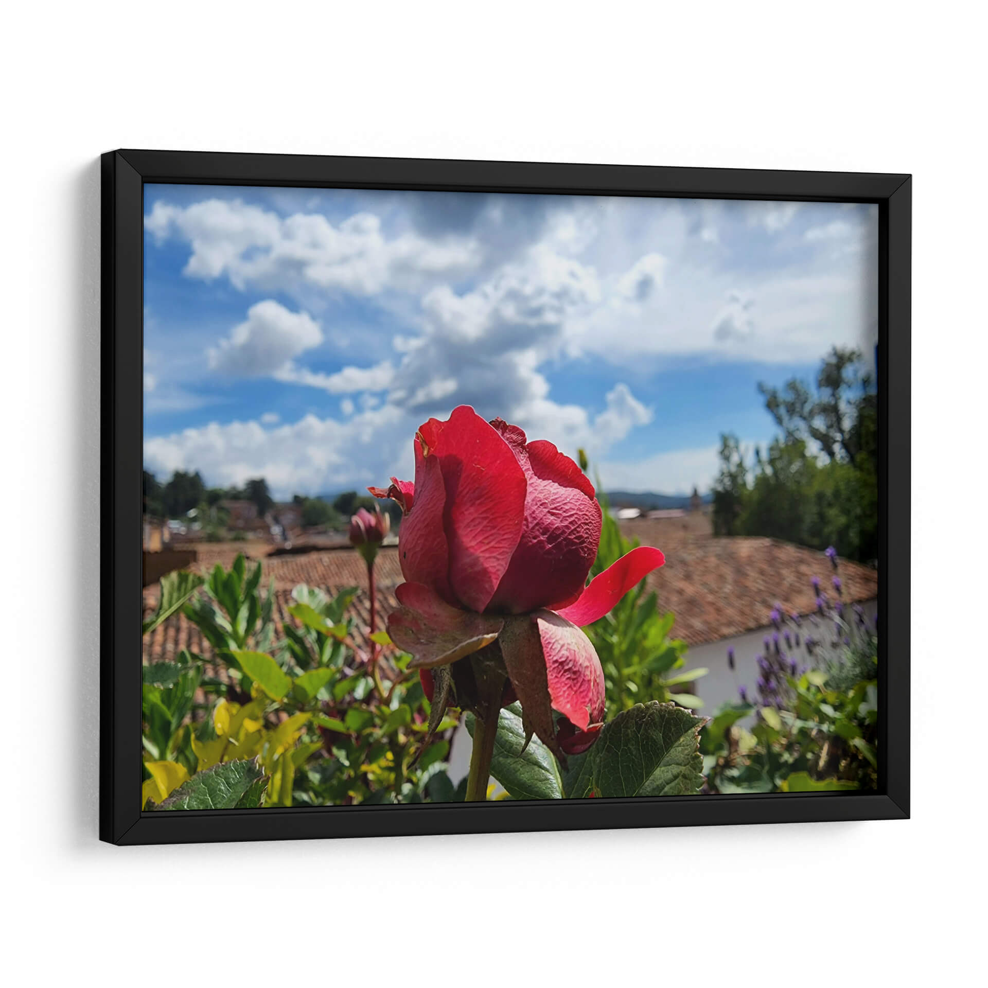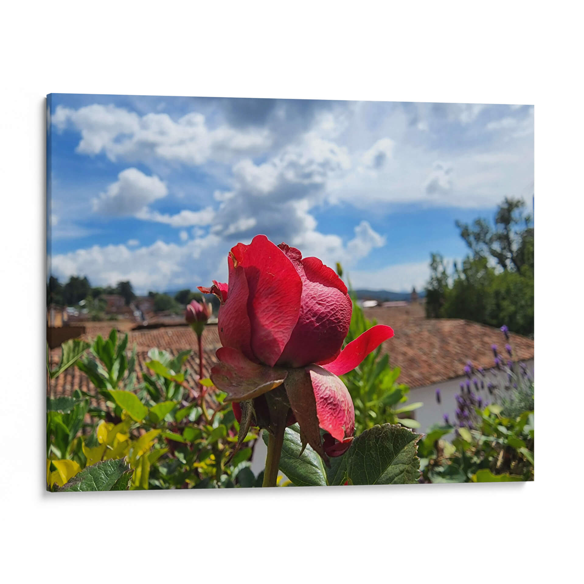 Sumérgete en la belleza serena de "Rosa en los tejados", una obra del artista Salvador Gallardo que captura la delicadeza de una rosa roja vibrante en primer plano, con un telón de fondo evocador de tejas ocres y un cielo azul salpicado de nubes algodonosas. Esta pieza, que fusiona la fotografía con un toque pictórico, transmite una sensación de calma y contemplación, invitando a la reflexión sobre la naturaleza y la arquitectura tradicional. Los tonos intensos de la rosa contrastan armoniosamente con los verdes exuberantes de la vegetación circundante y los cálidos colores terrosos del paisaje urbano, creando una composición visualmente rica y equilibrada. Ideal para añadir un punto focal de elegancia y color a cualquier estancia, desde una sala de estar moderna hasta un rincón tranquilo en un dormitorio o estudio. "Rosa en los tejados" no es solo un cuadro decorativo, sino una ventana a un momento de paz y belleza efímera, perfecta para quienes buscan arte que inspire serenidad y conecte con la esencia de lo cotidiano.