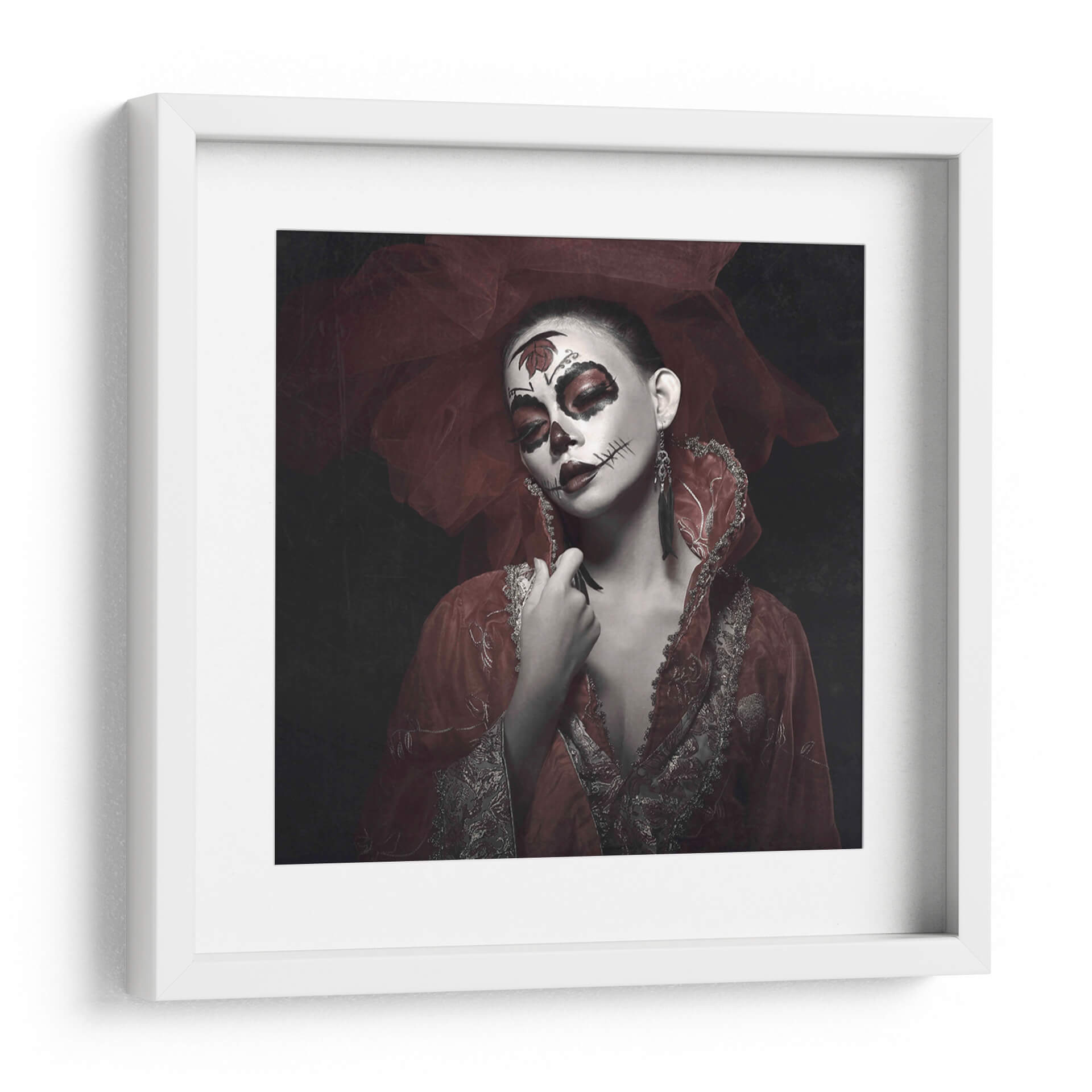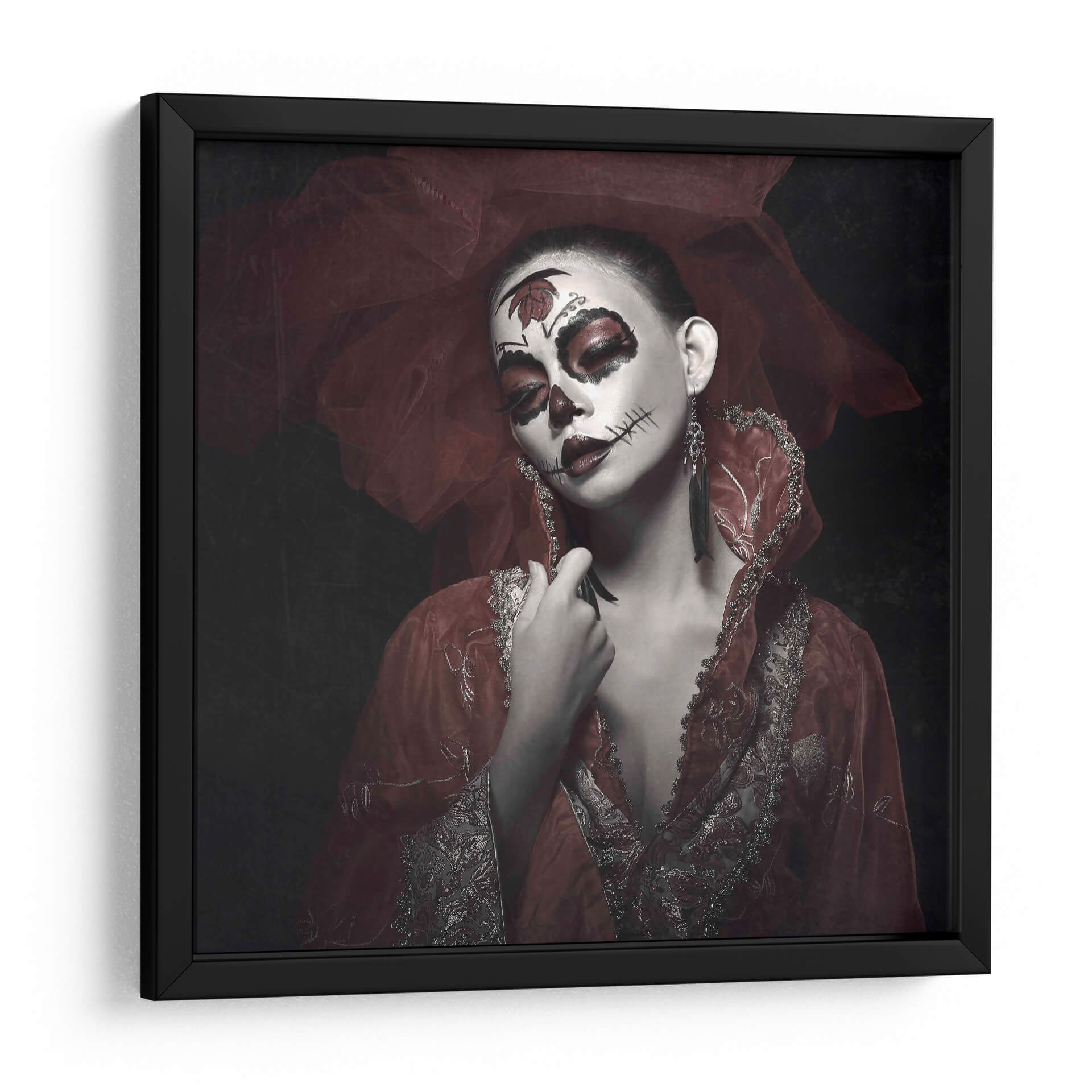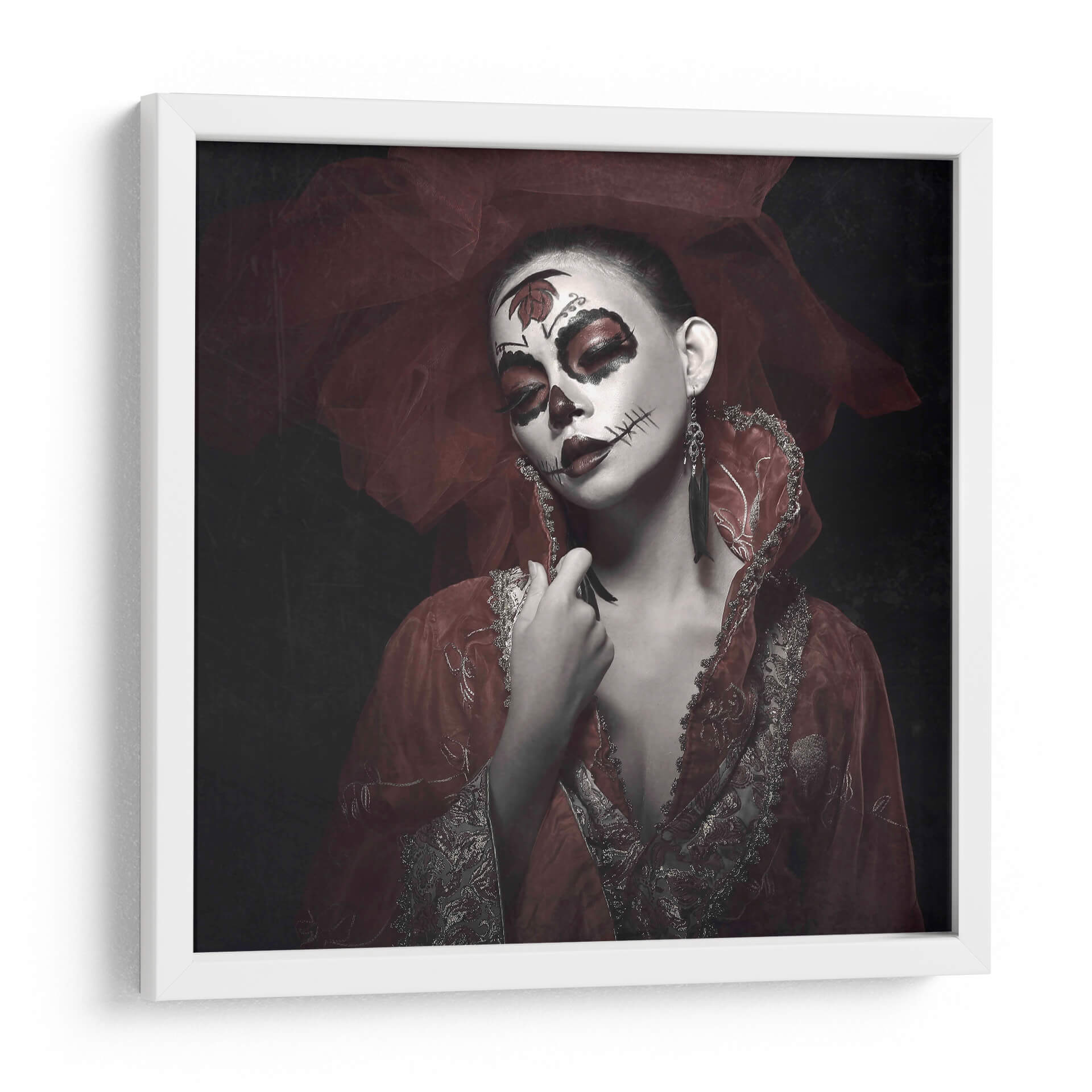 Sumérgete en la misteriosa y cautivadora obra de arte 'Rose Rei' de Abr Abe. Este cuadro decorativo presenta un retrato impactante de una mujer con un elaboradísimo maquillaje inspirado en el Día de Muertos, acentuado por toques de rojo vibrante en los ojos y labios. La delicada tela roja, que envuelve la cabeza y los hombros, añade un aura de drama y sofisticación, contrastando elegantemente con el fondo oscuro y tenue. Los detalles intrincados del vestuario, con bordados plateados y dorados, evocan una sensación de opulencia y tradición. La expresión serena de la modelo, a pesar del dramático maquillaje, crea una fascinante dualidad entre la vida y la muerte, la celebración y la solemnidad. 'Rose Rei' es una pieza que sin duda generará conversación y se convertirá en el punto focal de cualquier espacio, ideal para quienes buscan añadir un toque de arte audaz y emocional a su decoración. Perfecta para salones, estudios o cualquier lugar que se beneficie de una declaración artística única y memorable, esta obra invita a la contemplación y celebra la belleza en su forma más enigmática.