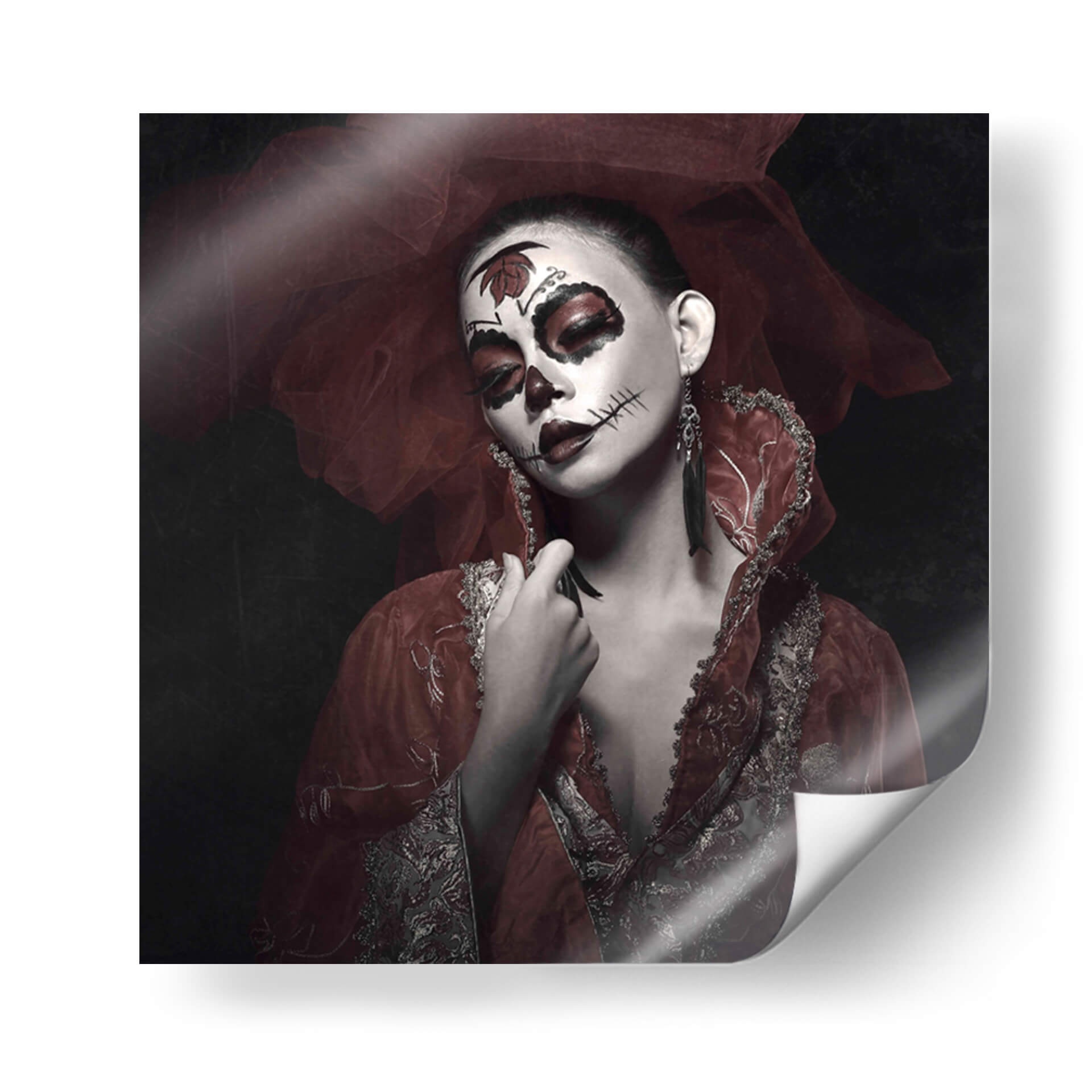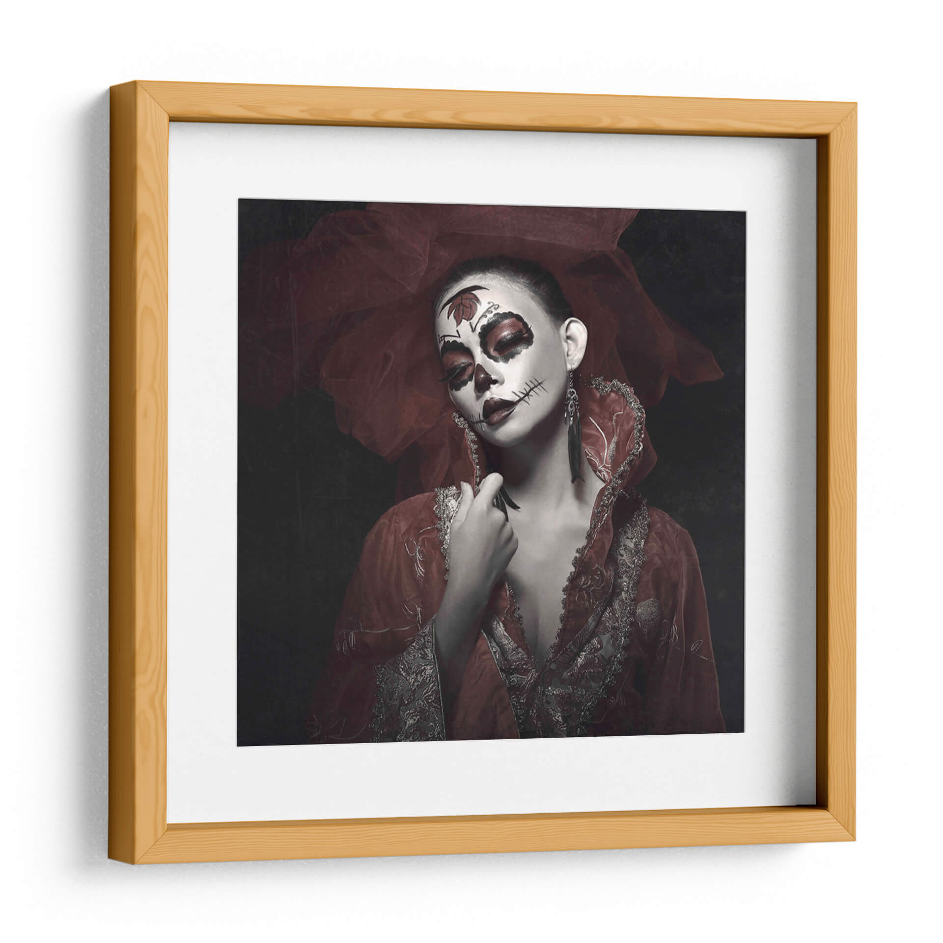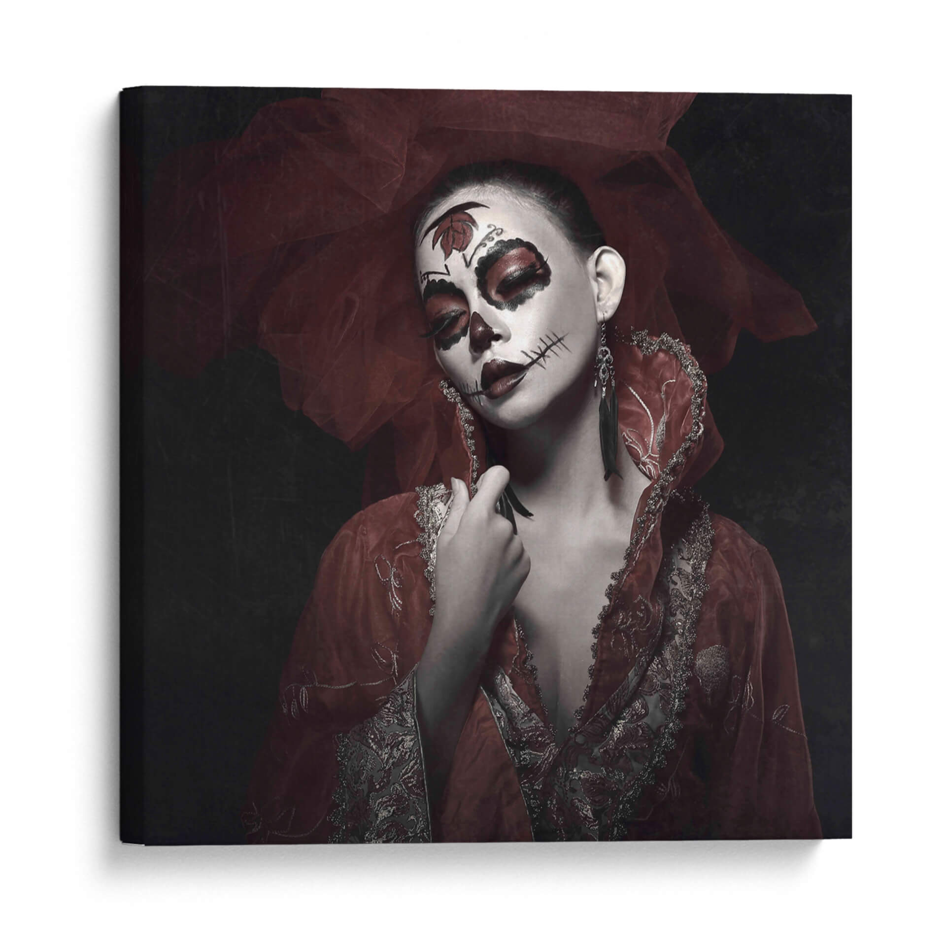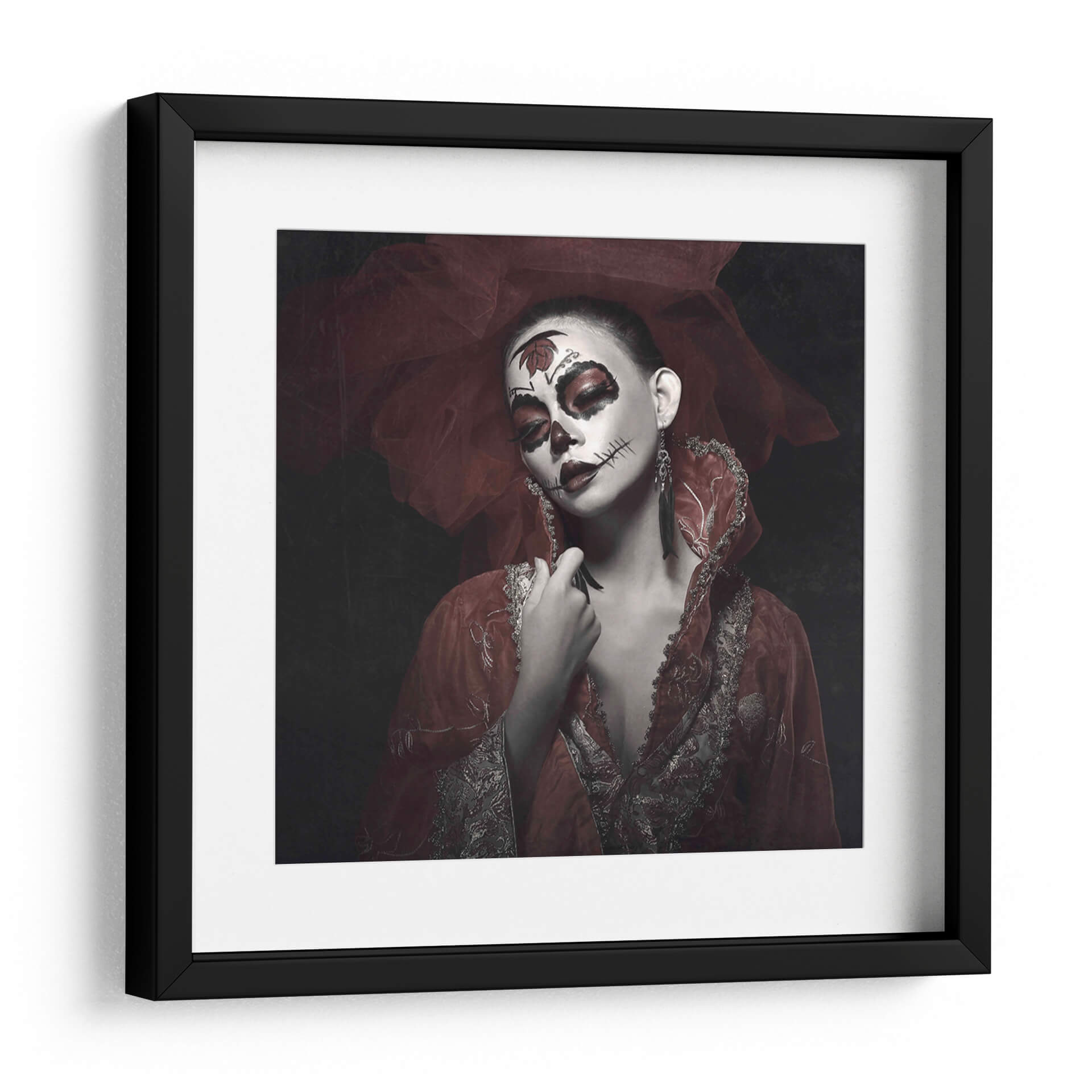 Sumérgete en la misteriosa y cautivadora obra de arte 'Rose Rei' de Abr Abe. Este cuadro decorativo presenta un retrato impactante de una mujer con un elaboradísimo maquillaje inspirado en el Día de Muertos, acentuado por toques de rojo vibrante en los ojos y labios. La delicada tela roja, que envuelve la cabeza y los hombros, añade un aura de drama y sofisticación, contrastando elegantemente con el fondo oscuro y tenue. Los detalles intrincados del vestuario, con bordados plateados y dorados, evocan una sensación de opulencia y tradición. La expresión serena de la modelo, a pesar del dramático maquillaje, crea una fascinante dualidad entre la vida y la muerte, la celebración y la solemnidad. 'Rose Rei' es una pieza que sin duda generará conversación y se convertirá en el punto focal de cualquier espacio, ideal para quienes buscan añadir un toque de arte audaz y emocional a su decoración. Perfecta para salones, estudios o cualquier lugar que se beneficie de una declaración artística única y memorable, esta obra invita a la contemplación y celebra la belleza en su forma más enigmática.