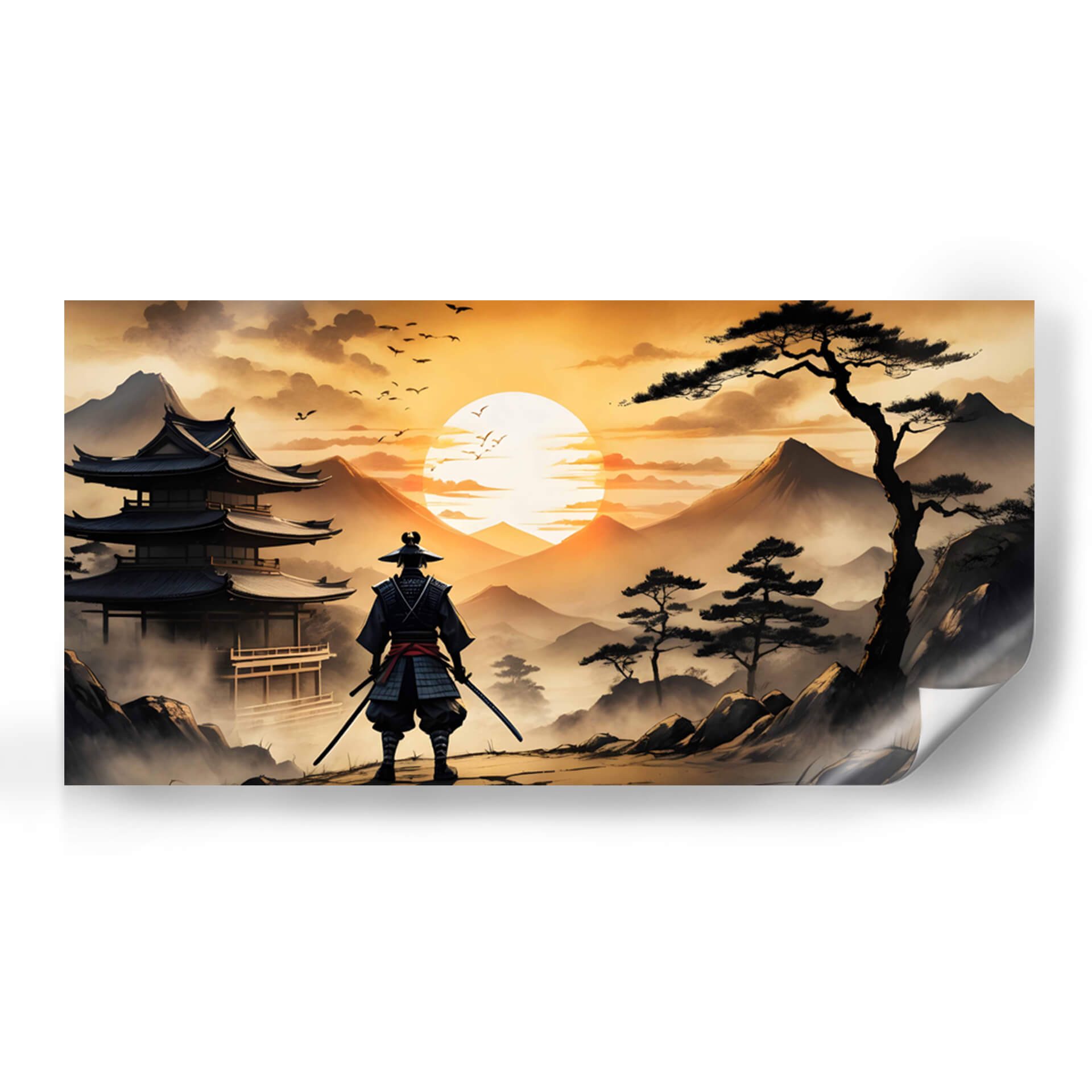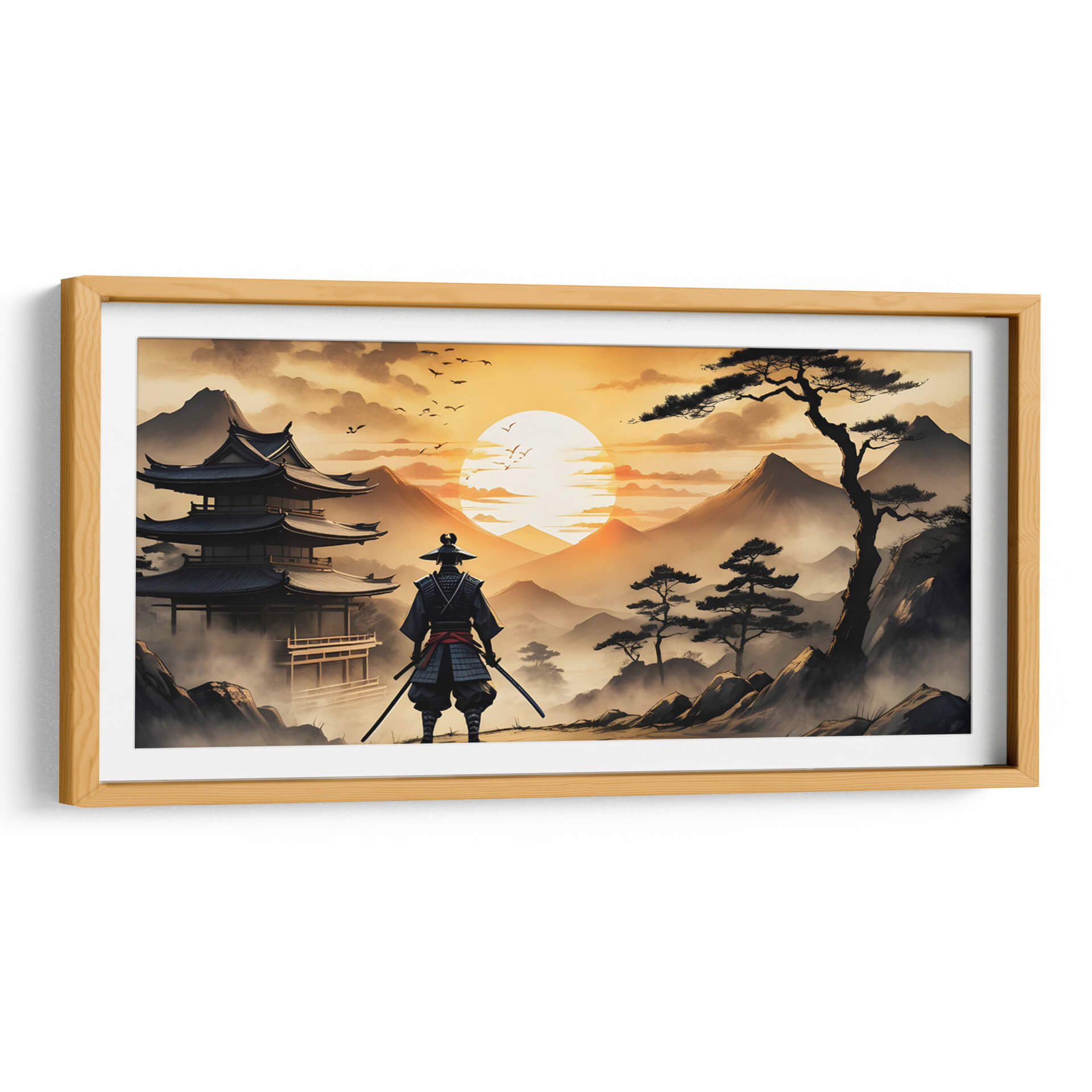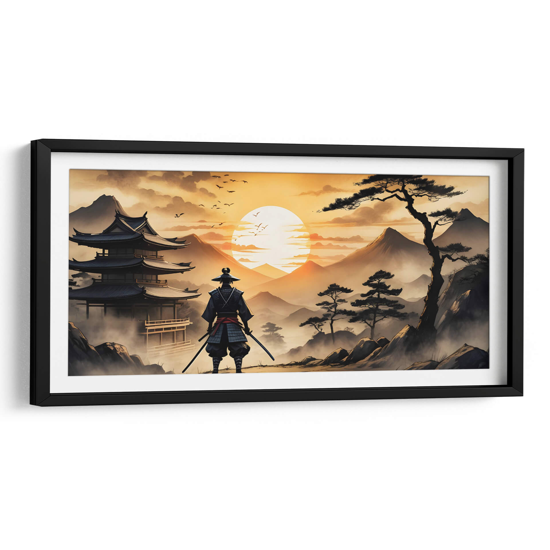 Sumérgete en la serenidad y el misterio del antiguo Japón con "Samurai III", una obra de arte digital que captura la esencia de la disciplina y la contemplación. La pieza presenta un imponente guerrero samurái de espaldas, con su armadura tradicional y espadas listas, contemplando un vasto paisaje montañoso al amanecer o atardecer. El sol naciente o poniente, representado como un gran orbe luminoso, baña la escena con tonos cálidos de naranja, ámbar y ocre, creando una atmósfera etérea y pacífica. En el fondo, una pagoda tradicional japonesa se alza majestuosa, envuelta en una ligera neblina que añade profundidad y misticismo. Los pinos estilizados y las siluetas de las montañas completan la composición, evocando un sentido de tradición y conexión con la naturaleza. Este cuadro decorativo es perfecto para infundir calma, fortaleza y un toque de la cultura oriental a tu hogar u oficina. Su estilo único lo convierte en un punto focal ideal para salas de estar modernas, estudios o incluso dormitorios, invitando a la reflexión y al aprecio por la belleza atemporal.