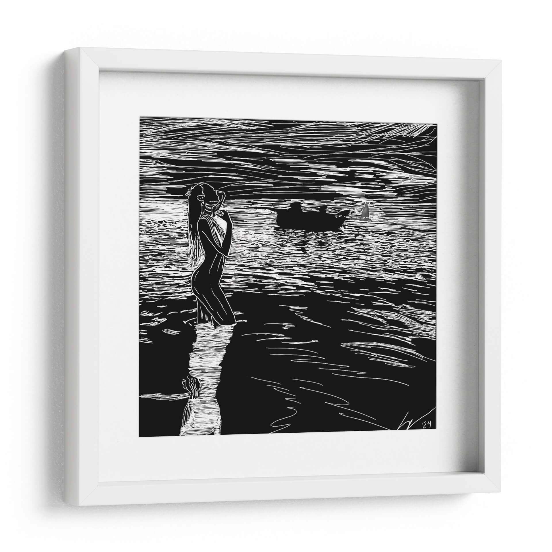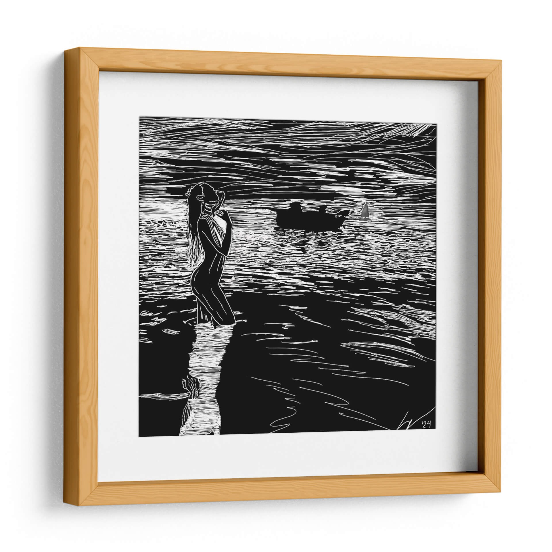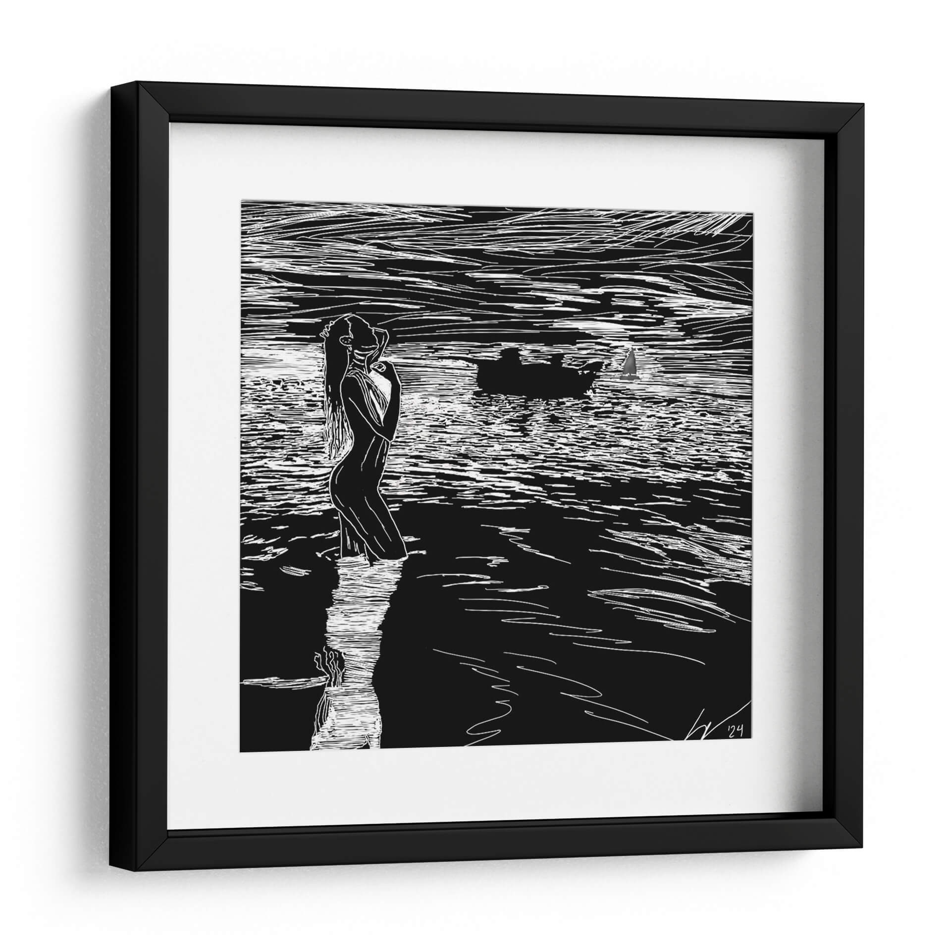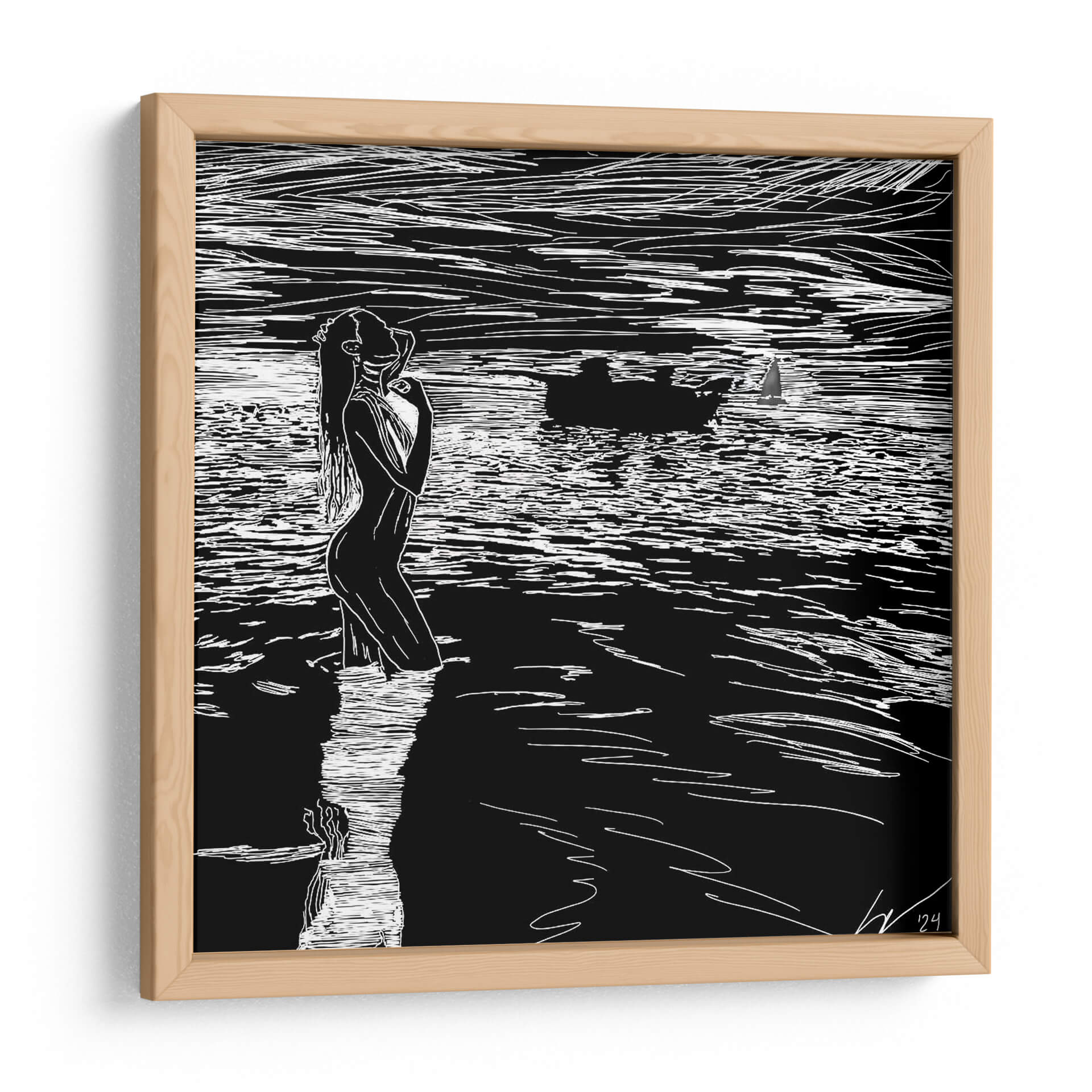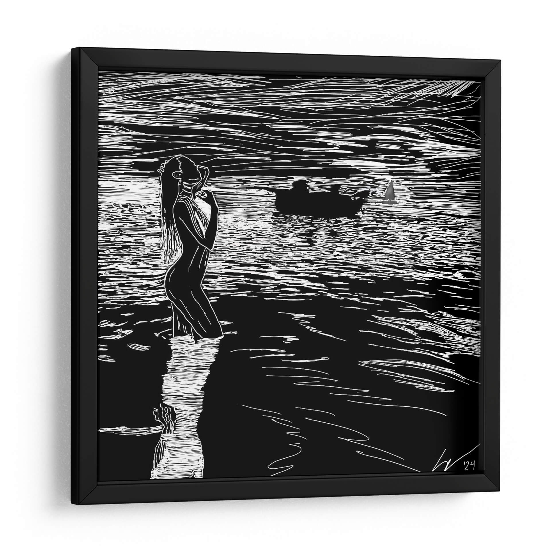 Sumérgete en la serena belleza de "Silueta Desnudo Mar", una obra de arte contemporáneo que captura la esencia de la conexión humana con el océano. Esta pieza presenta una figura femenina en primer plano, emergiendo del agua con una pose reflexiva, mientras una barca y un velero navegan en el horizonte. La obra utiliza un fuerte contraste en blanco y negro, con trazos dinámicos que evocan el movimiento del agua y la atmósfera etérea del mar. El estilo minimalista y expresionista crea una sensación de misterio y contemplación, invitando al espectador a perderse en la escena. Los sutiles reflejos en el agua y la silueta definida de la figura principal añaden profundidad y carácter. "Silueta Desnudo Mar" es ideal para espacios que buscan un toque de elegancia introspectiva, como dormitorios, baños o estudios. Su audaz paleta monocromática la convierte en un punto focal versátil, capaz de complementar tanto decoraciones modernas como clásicas. Transforma tu hogar en un santuario de calma y arte con esta cautivadora pieza de 2HumanKind, un cuadro decorativo que inspira paz y evoca la libertad del mar.