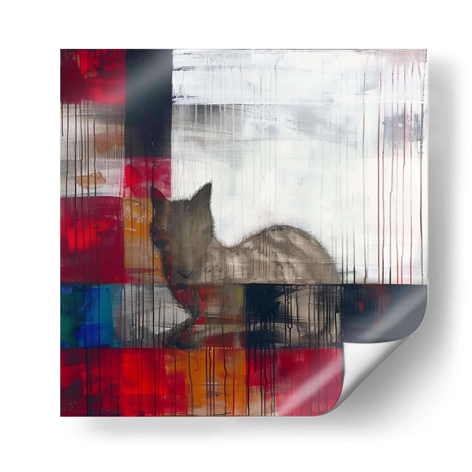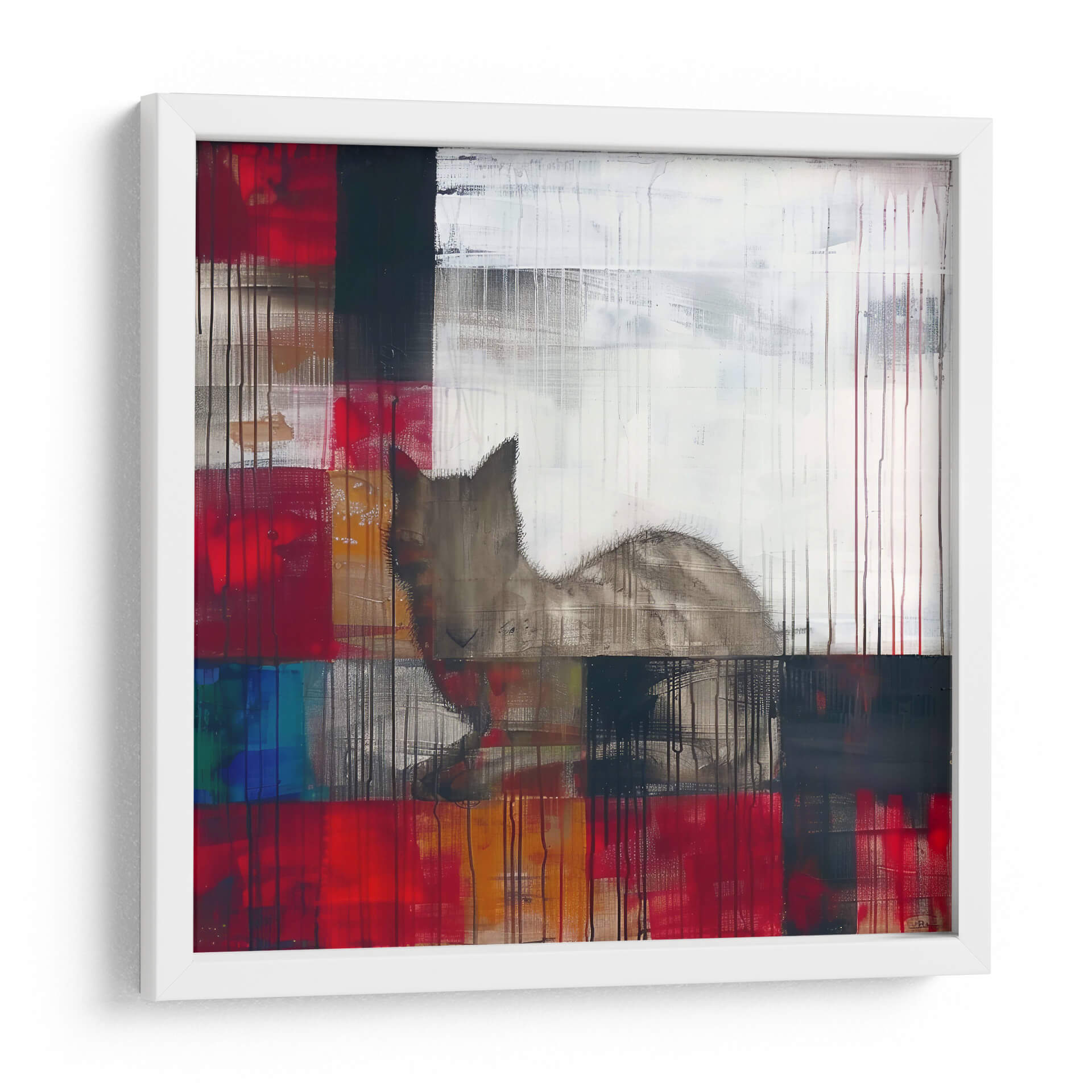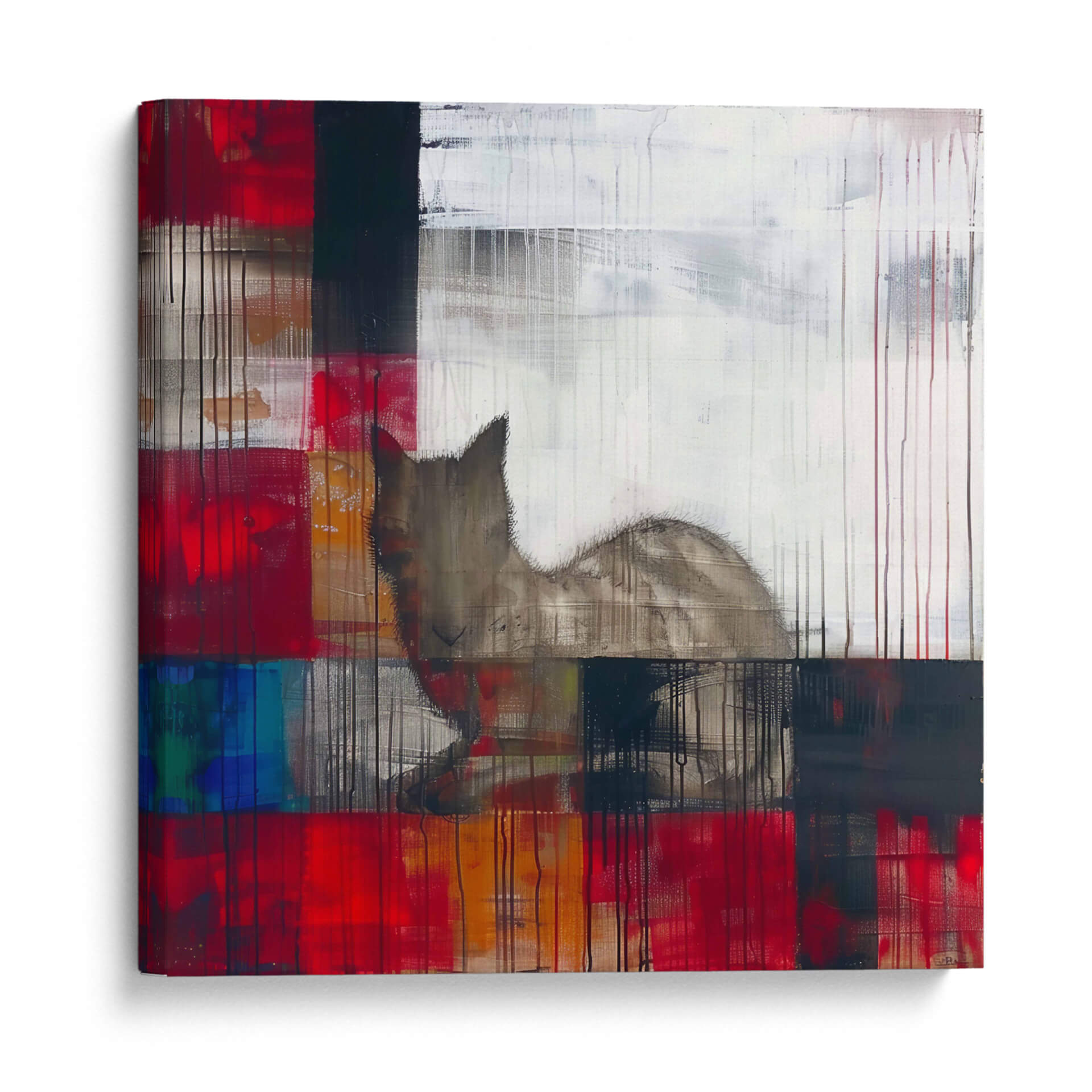 Sumérgete en el enigmático mundo de "Sueños", una obra maestra del arte contemporáneo de Cecilia Flores. Esta pieza abstracta explora la dualidad de la emoción y la forma, con una audaz paleta de colores que abarca vibrantes rojos, profundos azules y toques de blanco y negro, contrastando con cálidos tonos tierra. La composición, caracterizada por bloques de color superpuestos y líneas verticales que evocan lluvia o texturas, crea un efecto dinámico y texturizado. En el centro de esta explosión de color y forma, emerge la silueta etérea de un felino, cuya mirada parece perdida en sus propios pensamientos, confiriendo a la obra un aire de misterio y contemplación. "Sueños" es una invitación a la introspección, perfecta para aquellos que buscan una pieza de arte decorativo que estimule la imaginación y añada profundidad a cualquier espacio. Ideal para salas de estar modernas, estudios o cualquier rincón que necesite un toque de sofisticación y narrativa visual, este cuadro decorativo es un punto focal que inspira conversación y refleja un gusto por el arte abstracto con alma.
