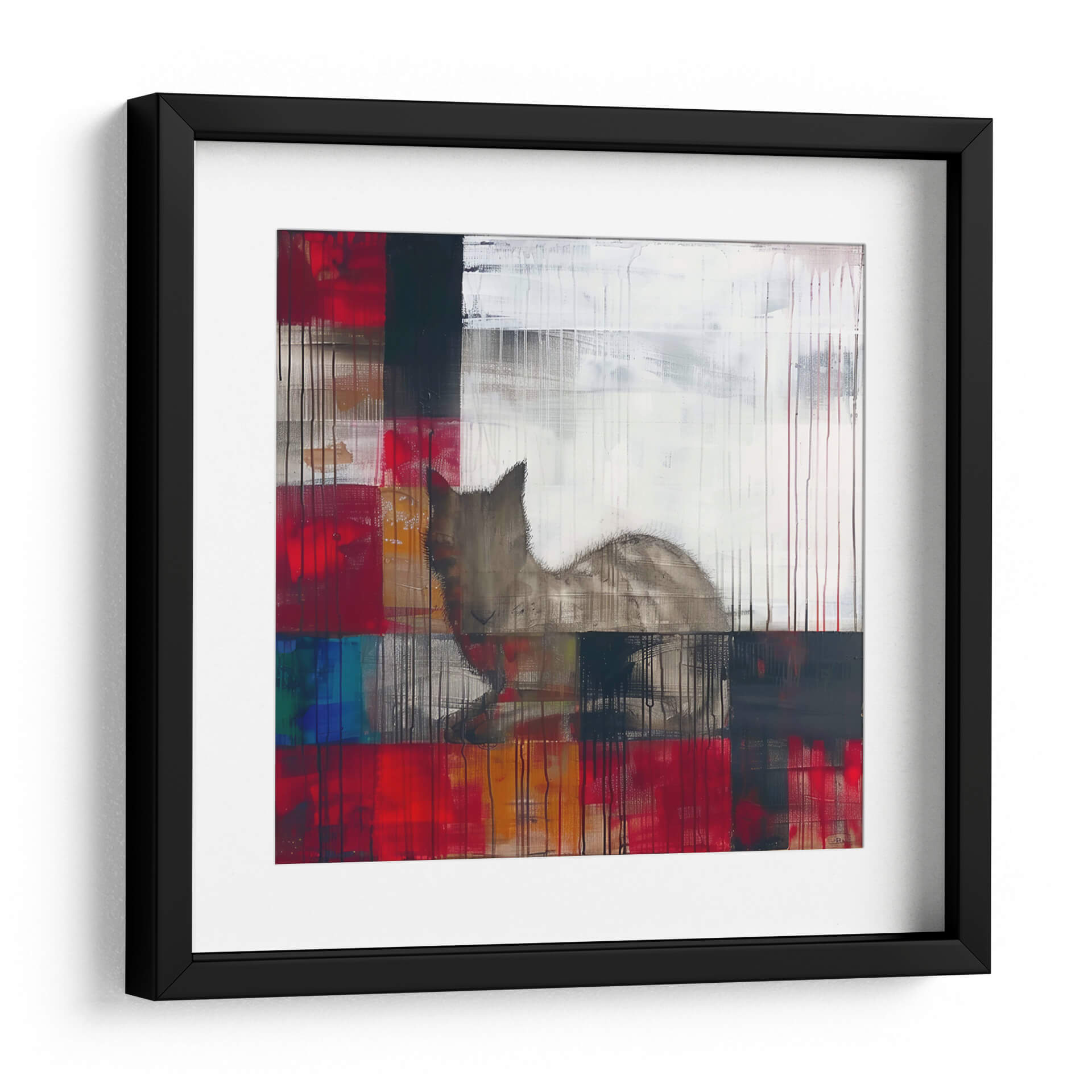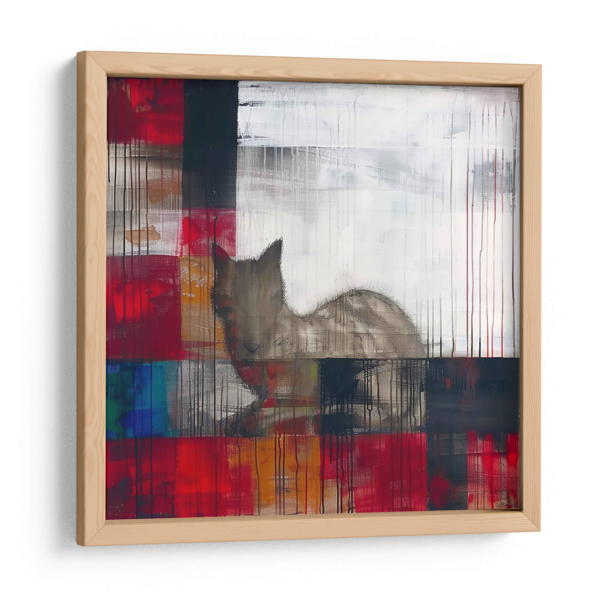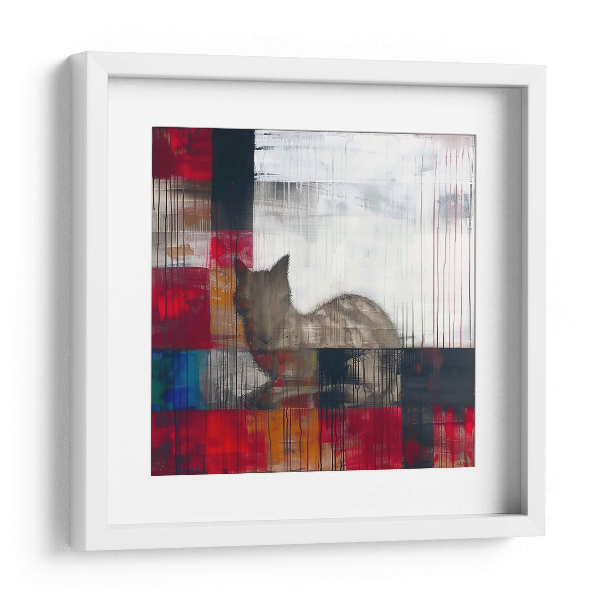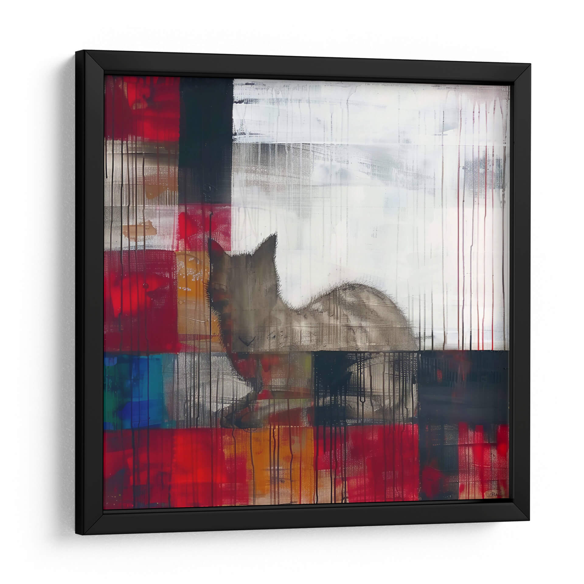 Sumérgete en el enigmático mundo de "Sueños", una obra maestra del arte contemporáneo de Cecilia Flores. Esta pieza abstracta explora la dualidad de la emoción y la forma, con una audaz paleta de colores que abarca vibrantes rojos, profundos azules y toques de blanco y negro, contrastando con cálidos tonos tierra. La composición, caracterizada por bloques de color superpuestos y líneas verticales que evocan lluvia o texturas, crea un efecto dinámico y texturizado. En el centro de esta explosión de color y forma, emerge la silueta etérea de un felino, cuya mirada parece perdida en sus propios pensamientos, confiriendo a la obra un aire de misterio y contemplación. "Sueños" es una invitación a la introspección, perfecta para aquellos que buscan una pieza de arte decorativo que estimule la imaginación y añada profundidad a cualquier espacio. Ideal para salas de estar modernas, estudios o cualquier rincón que necesite un toque de sofisticación y narrativa visual, este cuadro decorativo es un punto focal que inspira conversación y refleja un gusto por el arte abstracto con alma.