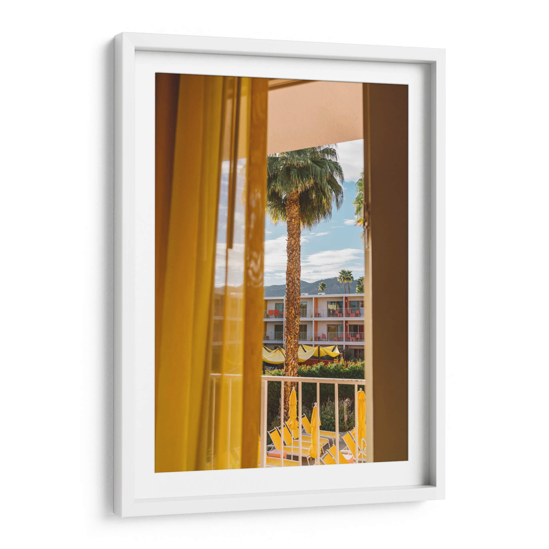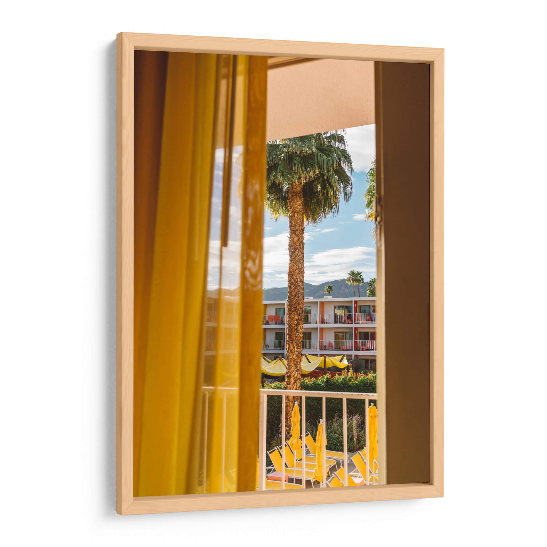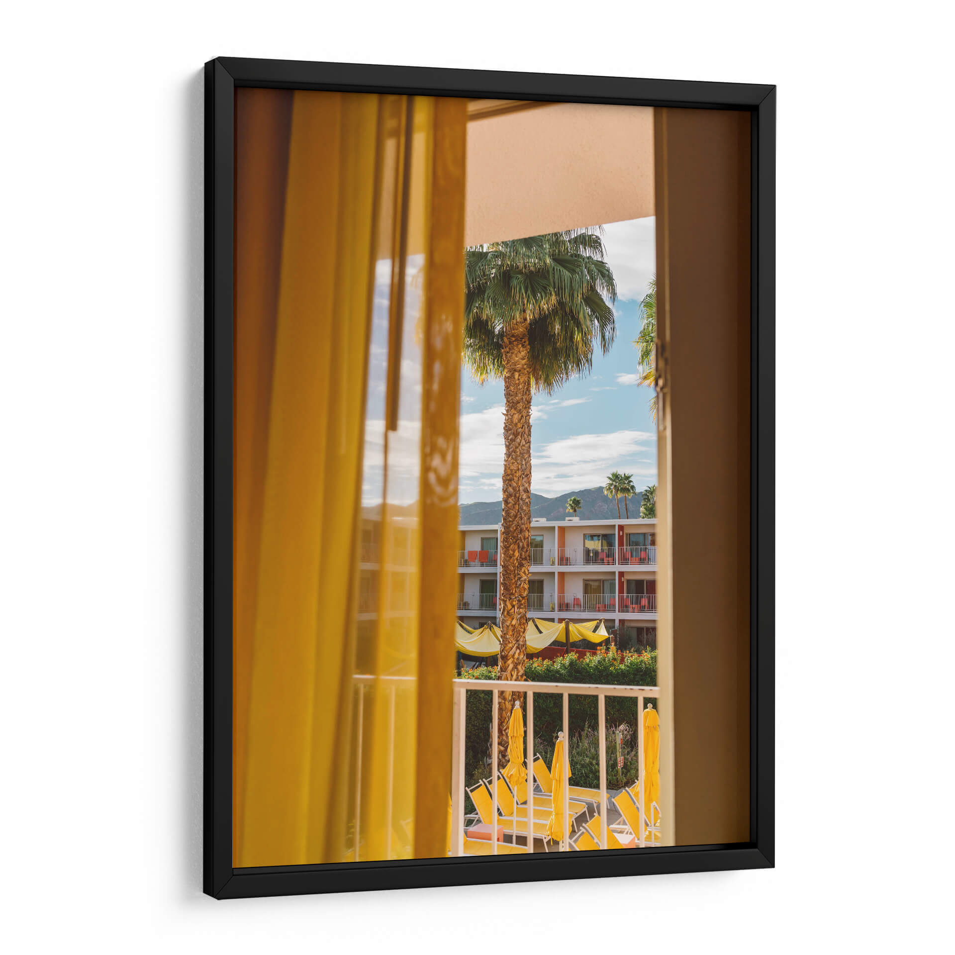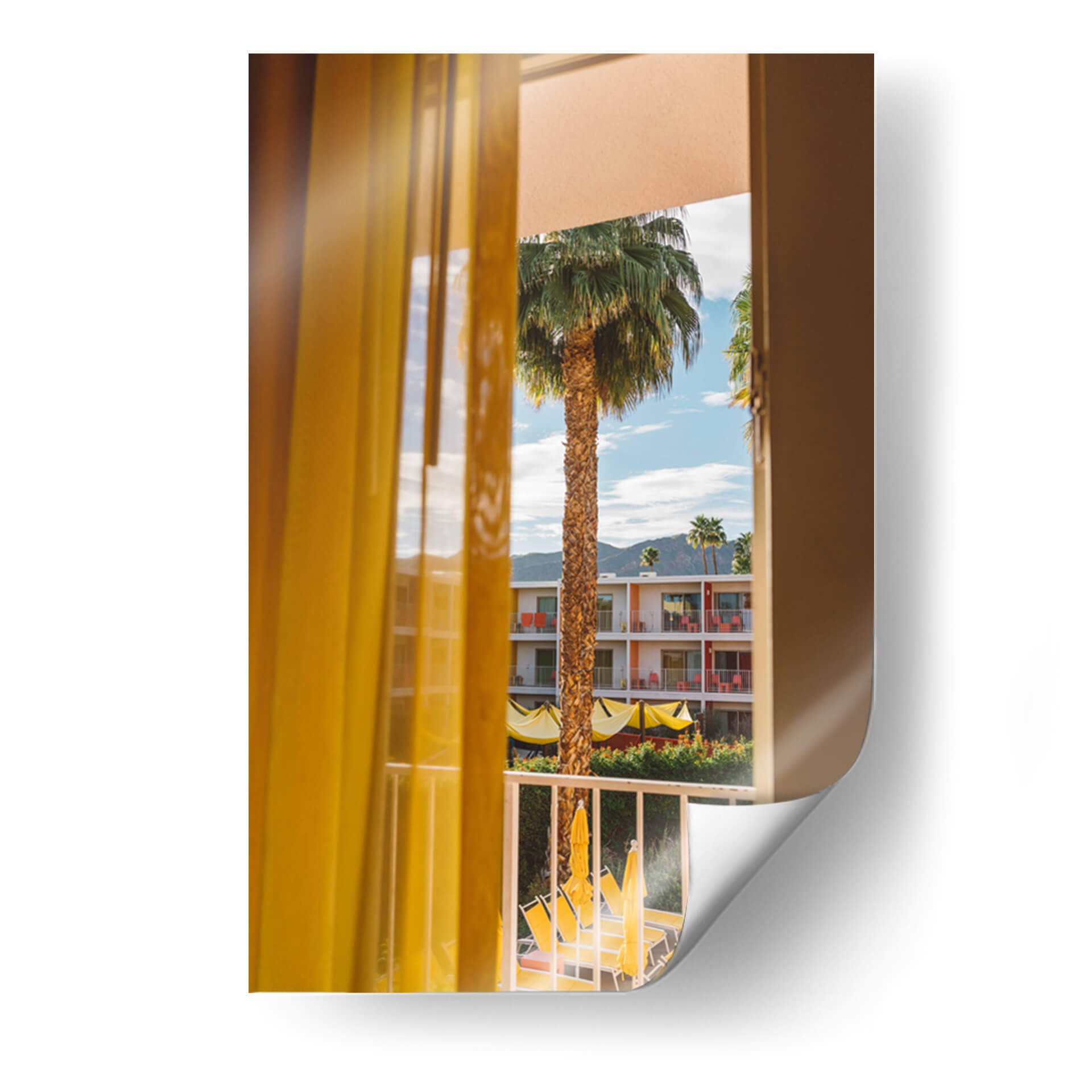 Sumérgete en la calidez y el encanto de "Sueños de Palm Springs", una obra de Bethany Young que captura la esencia de un día soleado y relajado. A través de la ventana, se revela un paisaje vibrante donde una esbelta palmera se alza majestuosa contra un cielo azul salpicado de nubes. Los colores cálidos predominan, con el amarillo brillante de las cortinas y parasoles que contrastan maravillosamente con los tonos tierra de la arquitectura del hotel y el verde exuberante de la vegetación. La composición fotográfica, con la perspectiva de mirar a través de una cortina, añade una sensación de intimidad y descubrimiento, invitando al espectador a ser parte de la escena. Esta pieza evoca una atmósfera de vacaciones, tranquilidad y un toque de nostalgia por la arquitectura retro. Es ideal para añadir un punto de interés y una dosis de sol a cualquier espacio, ya sea una sala de estar, un dormitorio o una oficina. "Sueños de Palm Springs" es más que una imagen; es una invitación a la evasión y al disfrute de los pequeños placeres de la vida, perfecta para quienes buscan un arte que transmita optimismo y estilo.