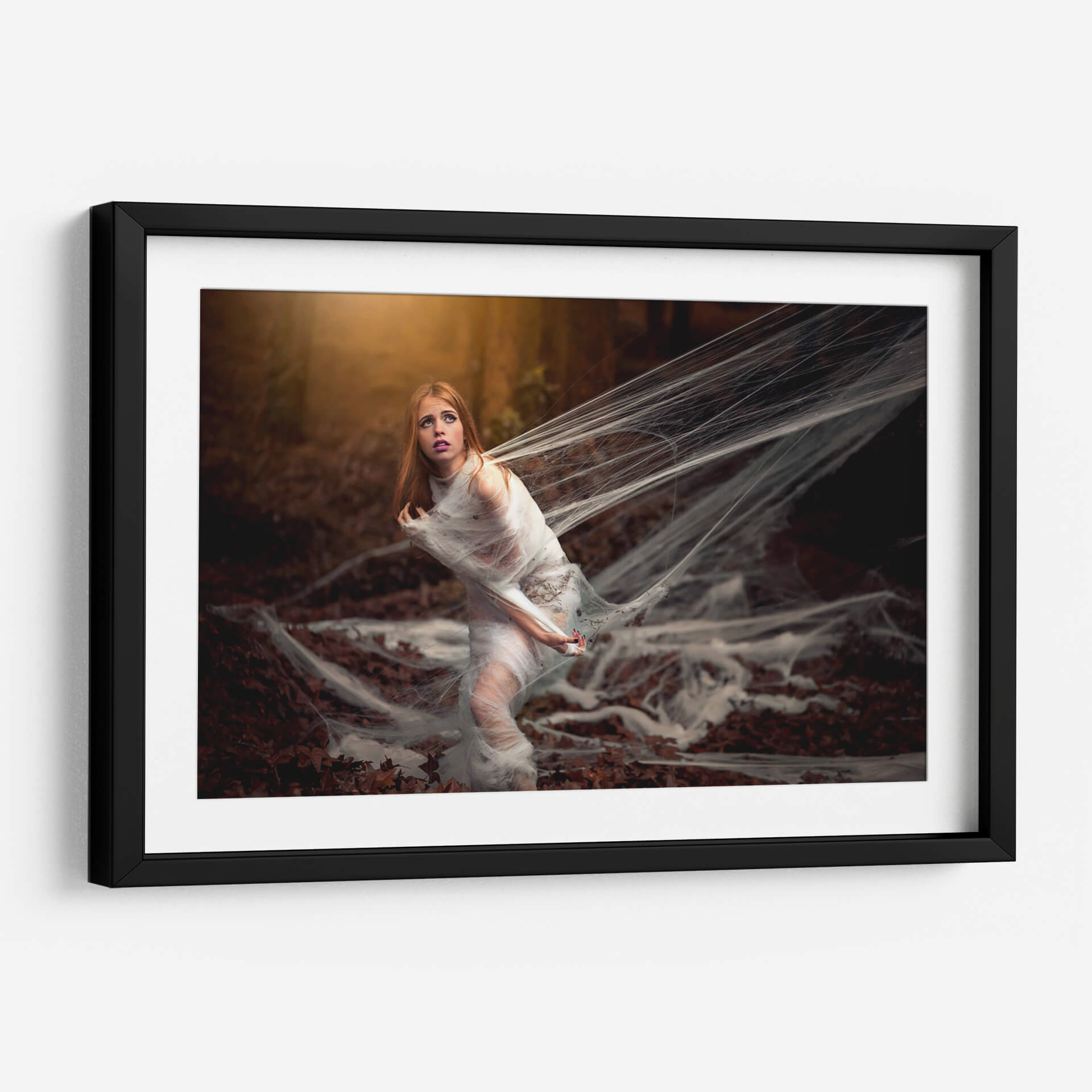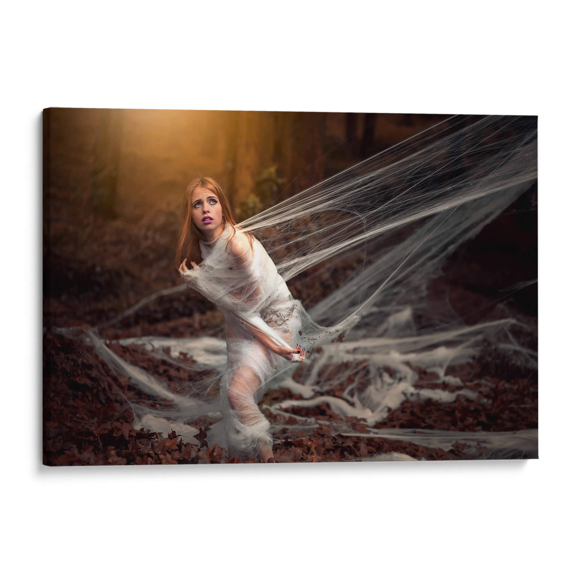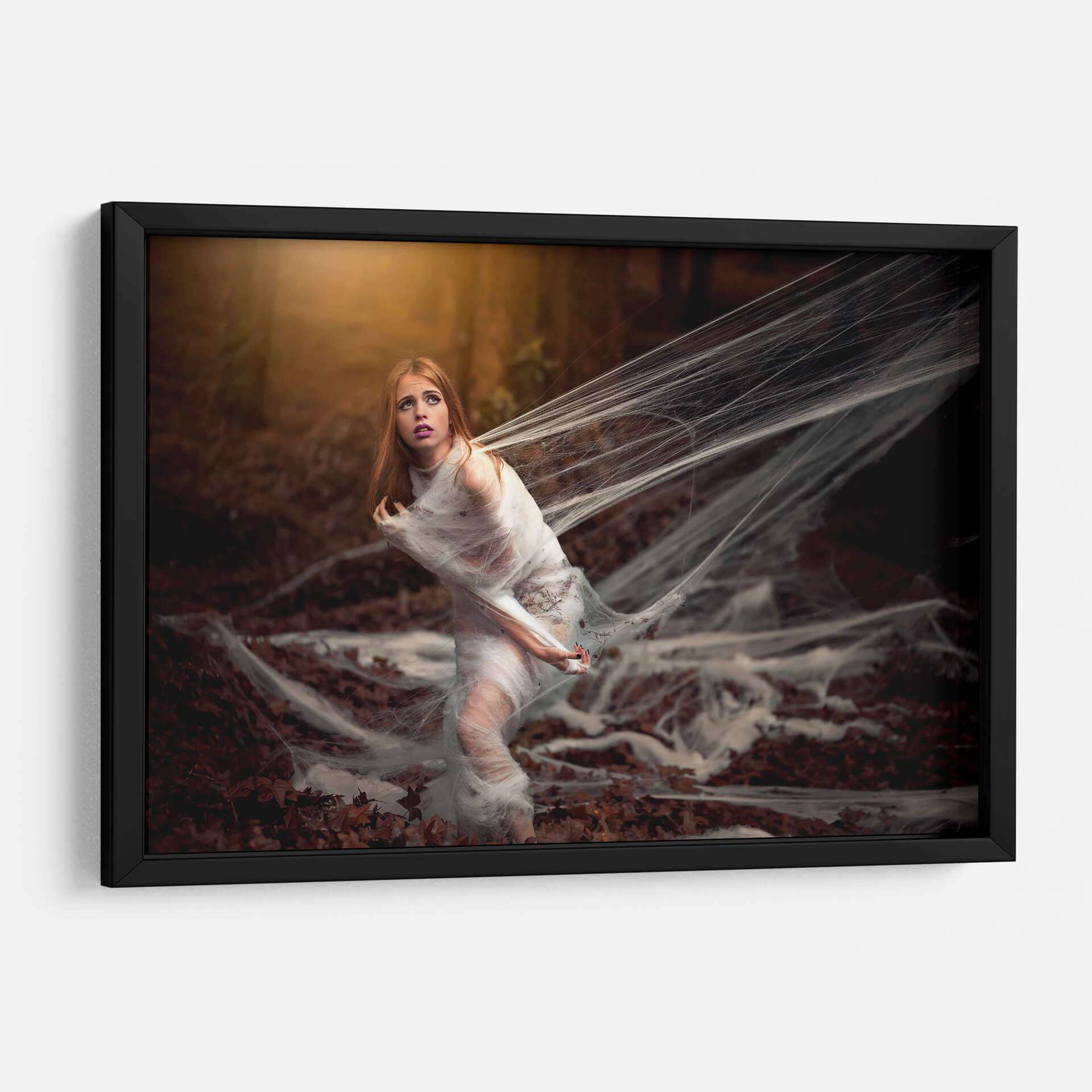 Sumérgete en la enigmática obra "Telaraña" de c.santos, una pieza visualmente impactante que cautiva por su atmósfera misteriosa y su delicada narrativa. La imagen presenta a una figura femenina envuelta en finas y etéreas hebras, evocando la sensación de estar atrapada o protegida por una delicada red. El entorno, un bosque otoñal cubierto de hojas secas, complementa la paleta de colores terrosos y cálidos, con un haz de luz dorada filtrándose entre los árboles que añade un toque de esperanza o introspección. El estilo fotográfico, con un enfoque nítido en la figura central y un desenfoque suave en el fondo, dirige la atención del espectador hacia la expresión de la mujer y la textura intrincada de la telaraña. Esta obra es ideal para aquellos que buscan añadir un toque de intriga, simbolismo y belleza melancólica a su hogar u oficina. Transmite una sensación de fragilidad, resiliencia y la intrincada conexión entre la naturaleza y la experiencia humana. "Telaraña" es un cuadro decorativo que invita a la reflexión, perfecto para espacios que buscan un punto focal que inspire conversación y evoque emociones profundas, transformando cualquier pared en una ventana a un mundo onírico y simbólico.