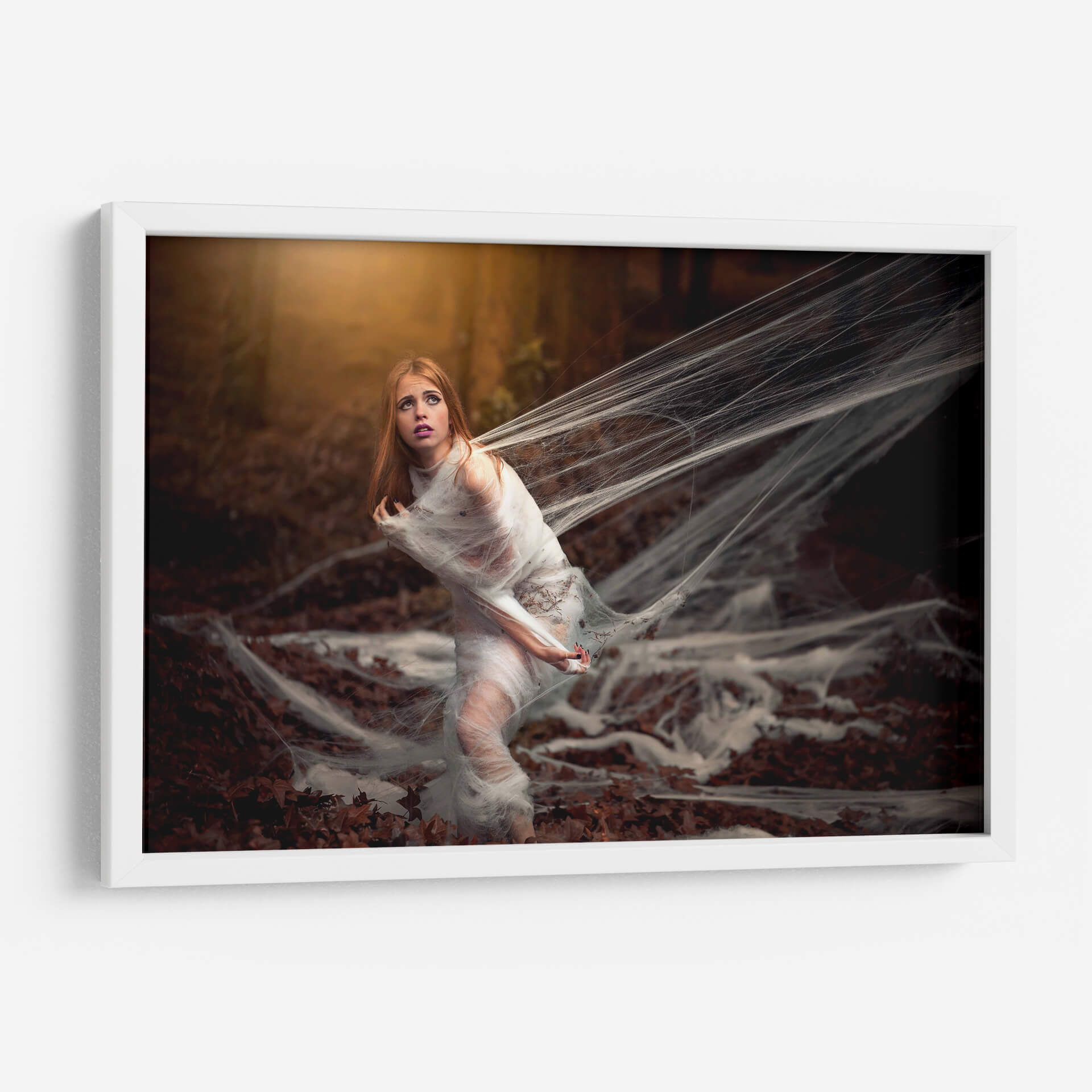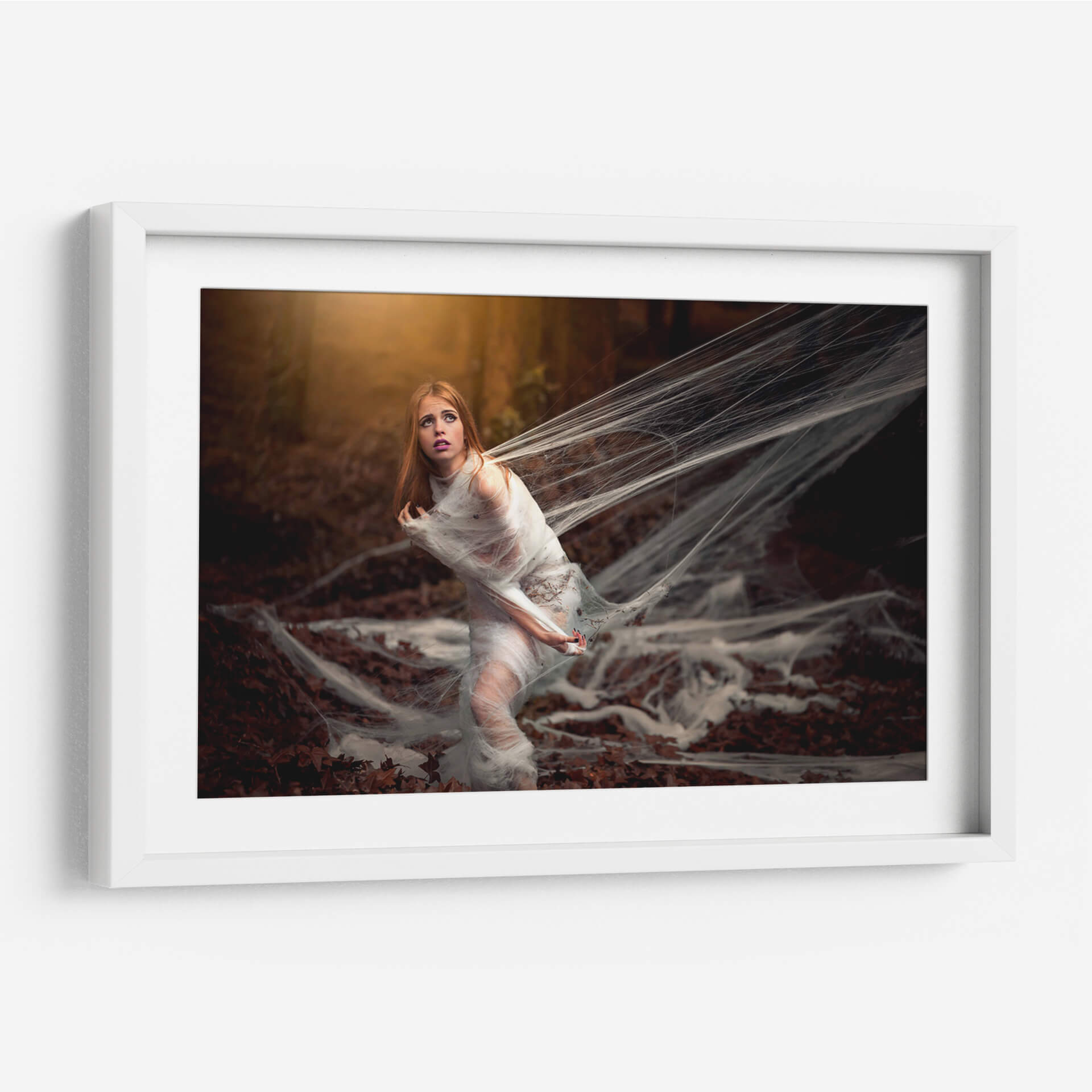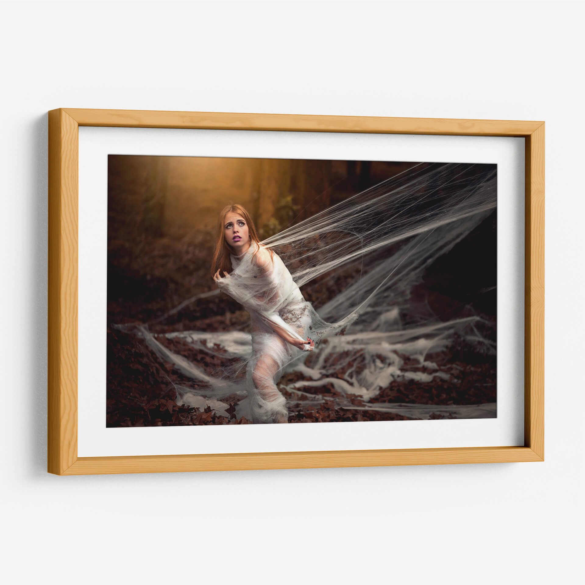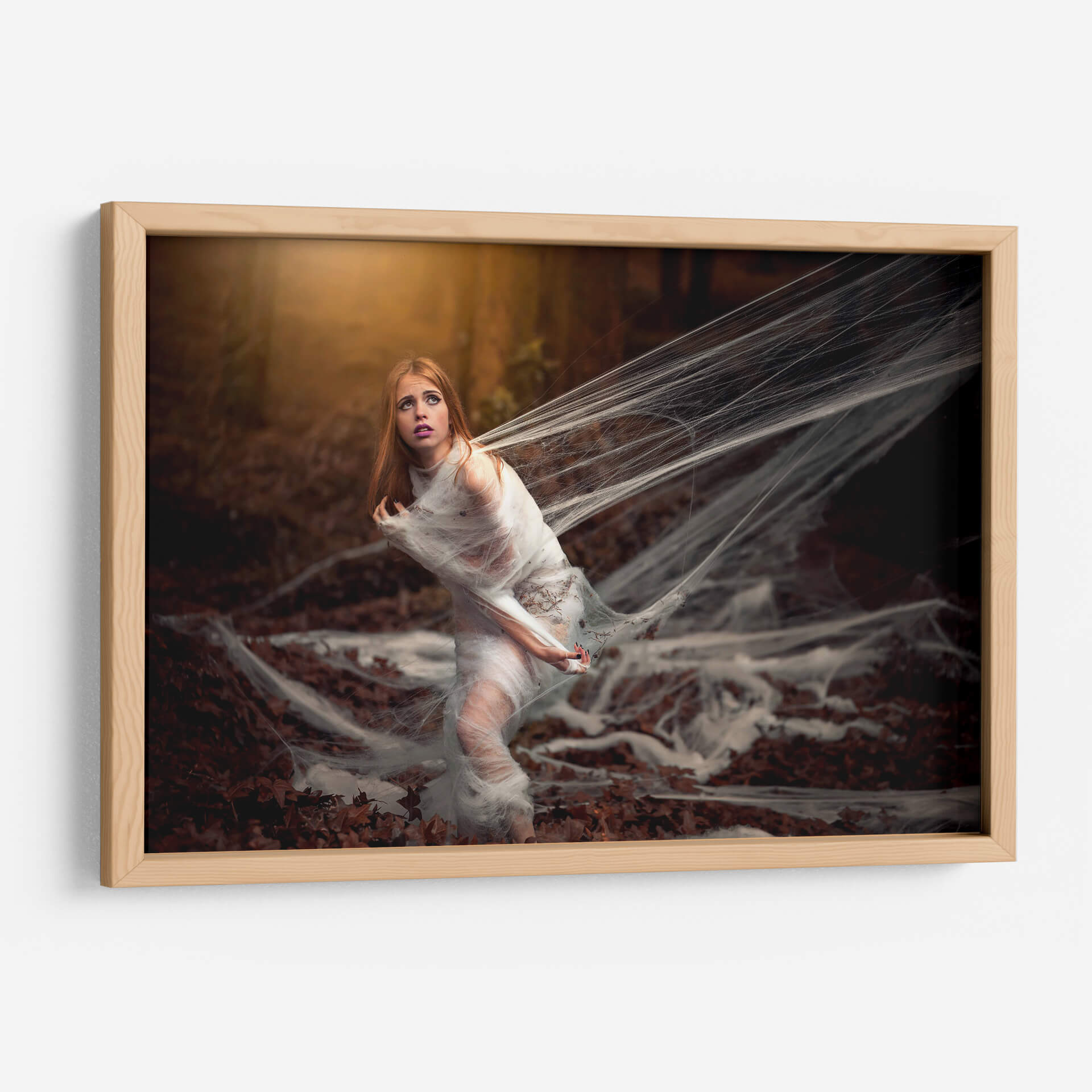 Sumérgete en la enigmática obra "Telaraña" de c.santos, una pieza visualmente impactante que cautiva por su atmósfera misteriosa y su delicada narrativa. La imagen presenta a una figura femenina envuelta en finas y etéreas hebras, evocando la sensación de estar atrapada o protegida por una delicada red. El entorno, un bosque otoñal cubierto de hojas secas, complementa la paleta de colores terrosos y cálidos, con un haz de luz dorada filtrándose entre los árboles que añade un toque de esperanza o introspección. El estilo fotográfico, con un enfoque nítido en la figura central y un desenfoque suave en el fondo, dirige la atención del espectador hacia la expresión de la mujer y la textura intrincada de la telaraña. Esta obra es ideal para aquellos que buscan añadir un toque de intriga, simbolismo y belleza melancólica a su hogar u oficina. Transmite una sensación de fragilidad, resiliencia y la intrincada conexión entre la naturaleza y la experiencia humana. "Telaraña" es un cuadro decorativo que invita a la reflexión, perfecto para espacios que buscan un punto focal que inspire conversación y evoque emociones profundas, transformando cualquier pared en una ventana a un mundo onírico y simbólico.