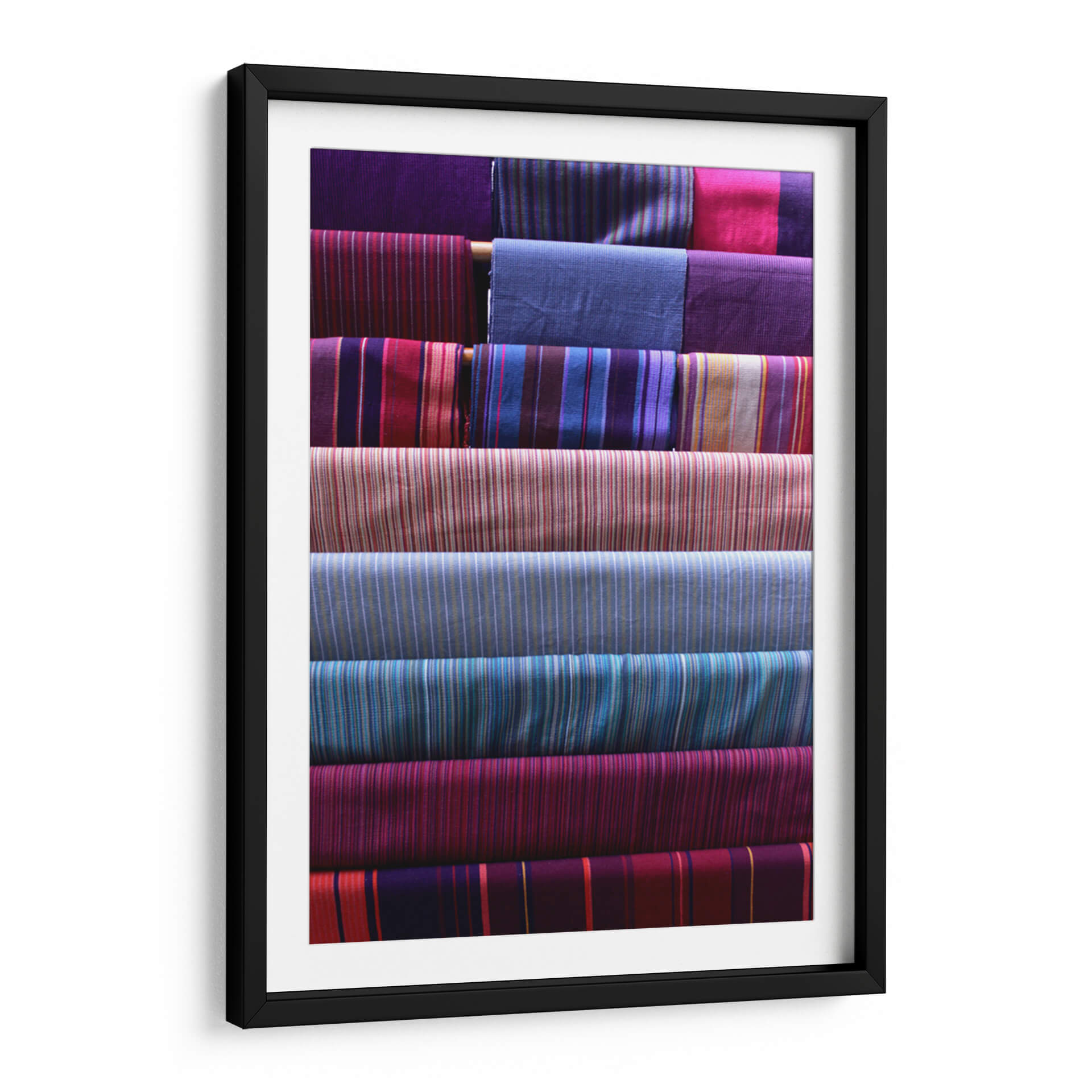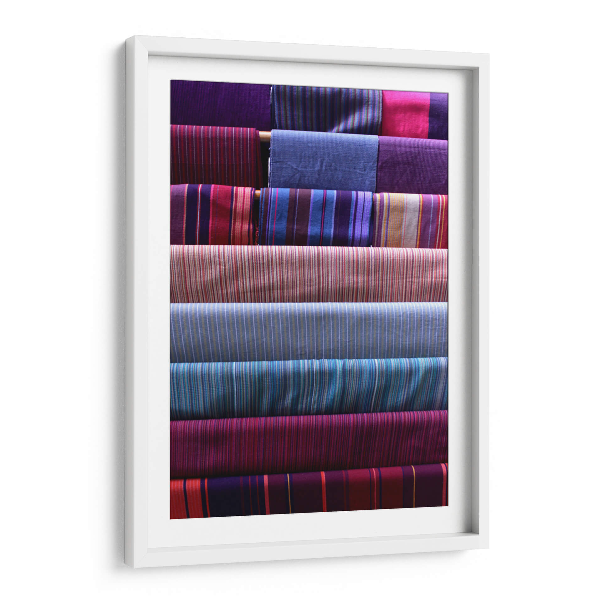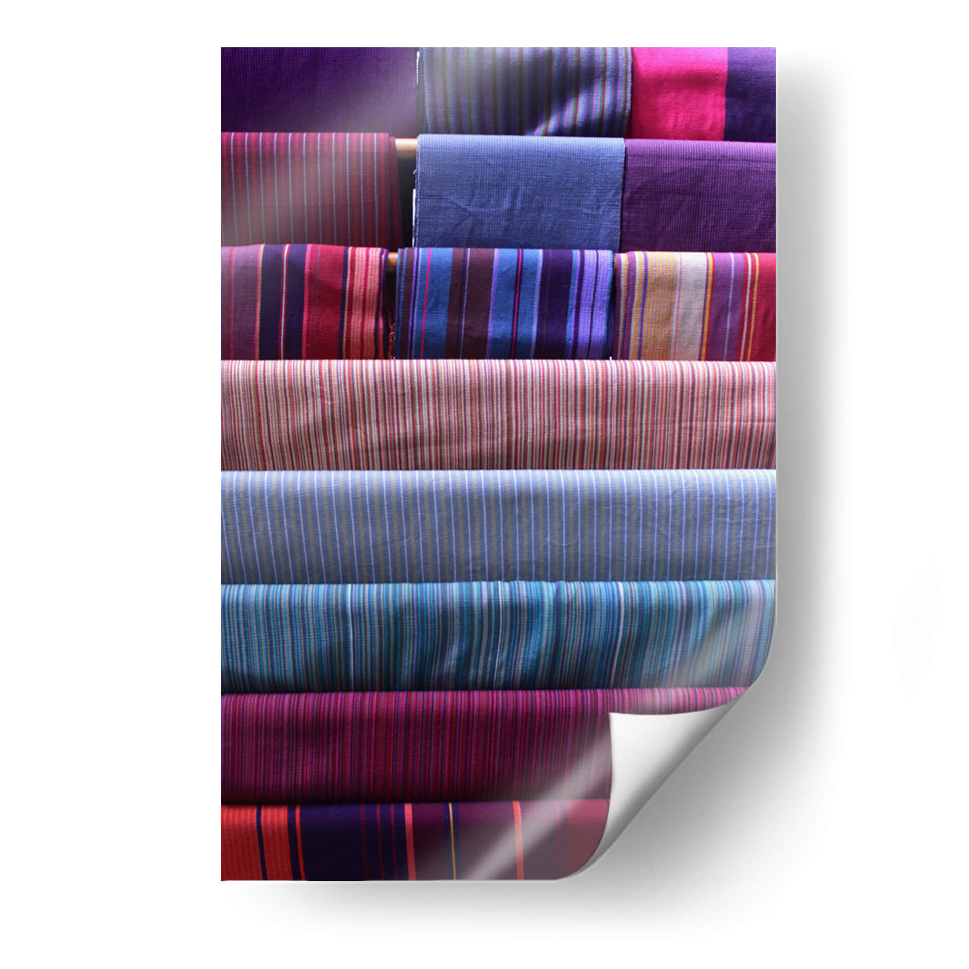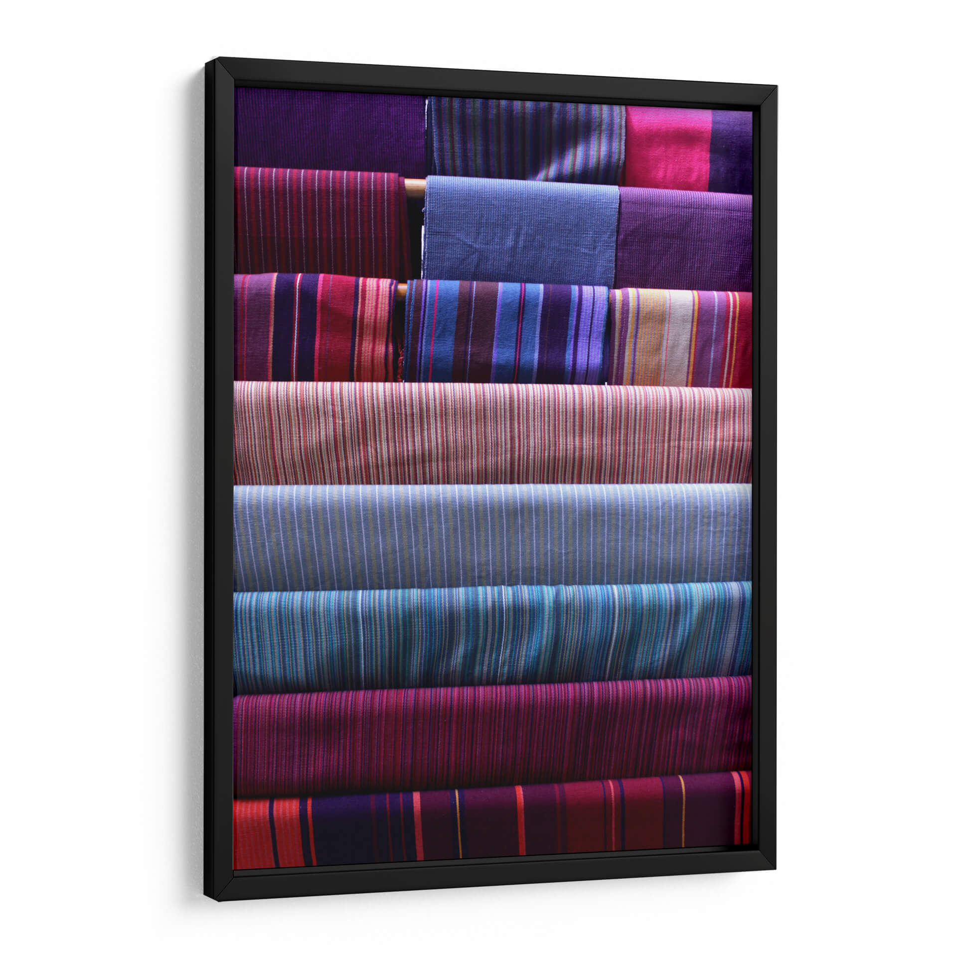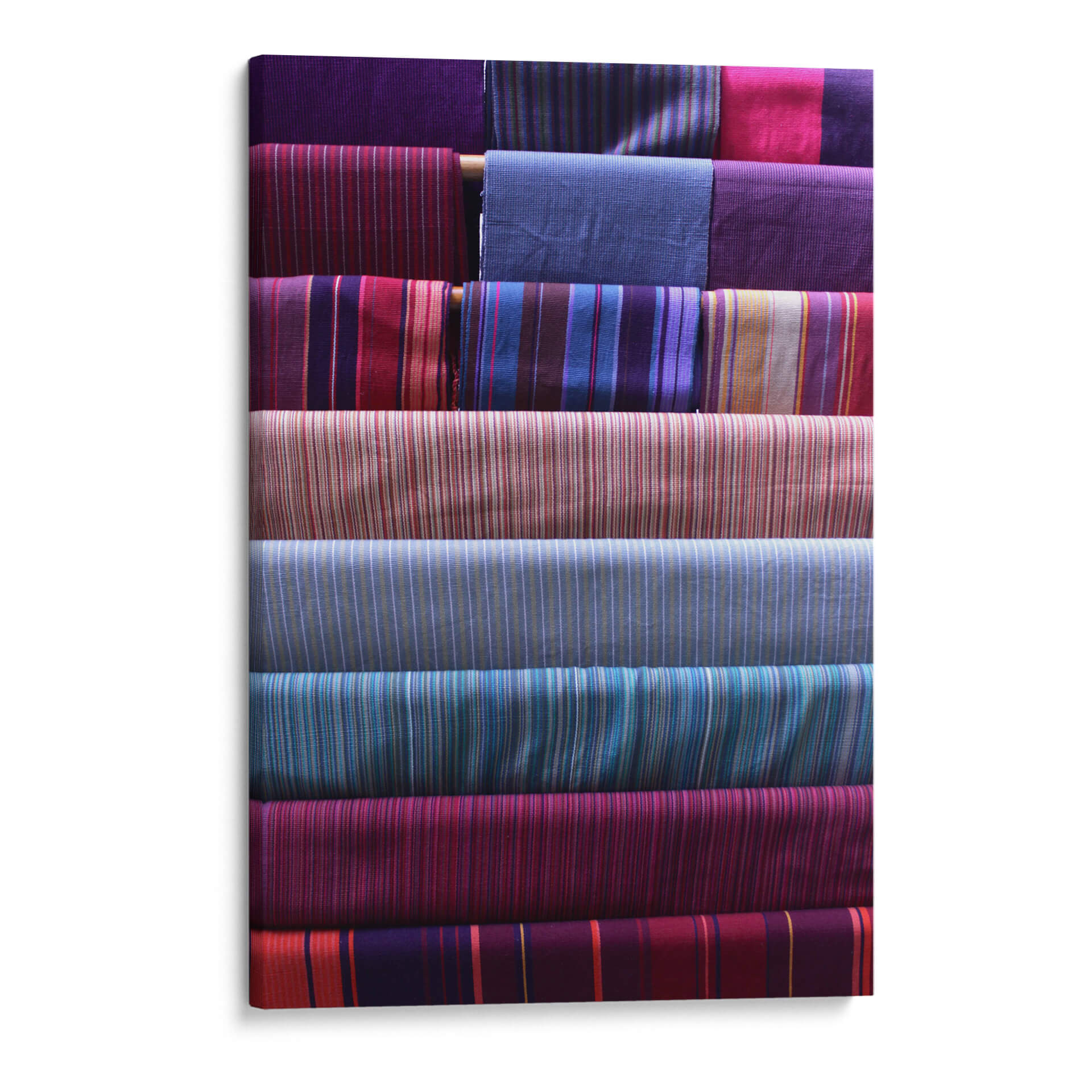 Sumérgete en la riqueza visual de "Telas y Texturas", una obra de arte contemporáneo que celebra la belleza intrínseca de los tejidos. Este cuadro decorativo presenta una composición cuidadosamente organizada de rollos de tela, cada uno exhibiendo patrones de rayas vibrantes y variadas. La paleta de colores es un festín para los sentidos, con profundos tonos de púrpura, azul índigo, fucsia, carmesí y toques de dorado y beige que se entrelazan creando una armonía visual cautivadora. La obra evoca una sensación de orden, artesanía y sofisticación, perfecta para añadir un toque de calidez y color a cualquier espacio. Su estilo abstracto, centrado en la textura y el patrón, la convierte en una pieza versátil, ideal para salones modernos, dormitorios serenos u oficinas creativas. "Telas y Texturas" no es solo una decoración de pared, es una invitación a apreciar la simplicidad elegante de los materiales y la habilidad del artista para transformarlos en una pieza de arte inspiradora. Añade profundidad y carácter a tu hogar con este lienzo único que irradia textura y color.