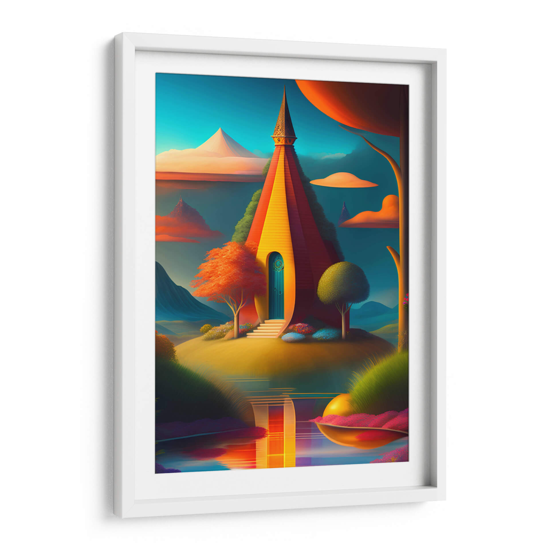 Adéntrate en un mundo de ensueño con "Templo Surrealista", una obra de arte digital que redefine la imaginación. Esta pieza cautivadora presenta una estructura cónica vibrante, reminiscentes de un templo místico, elevada sobre una colina serena. Rodeada de un paisaje onírico con montañas etéreas, árboles de colores vibrantes y un cielo azul profundo salpicado de nubes anaranjadas, la composición invita a la contemplación. La paleta de colores, que oscila entre tonos cálidos de rojo, amarillo y naranja, y los fríos azules del cielo y el agua, crea un contraste hipnótico que evoca misterio y tranquilidad. Cada detalle, desde la puerta azul turquesa hasta el reflejo en el agua, añade una capa de surrealismo y fantasía. "Templo Surrealista" es ideal para quienes buscan un cuadro decorativo que infunda sus espacios con un toque de magia y originalidad. Perfecto para salones modernos, estudios creativos u oficinas, esta obra de arte contemporáneo será un punto focal que inspire conversaciones y transporte a quienes lo contemplen a dimensiones insospechadas. DEA Digital Esoteric Art nos ofrece una visión única, fusionando lo espiritual con lo visual de una manera inolvidable.