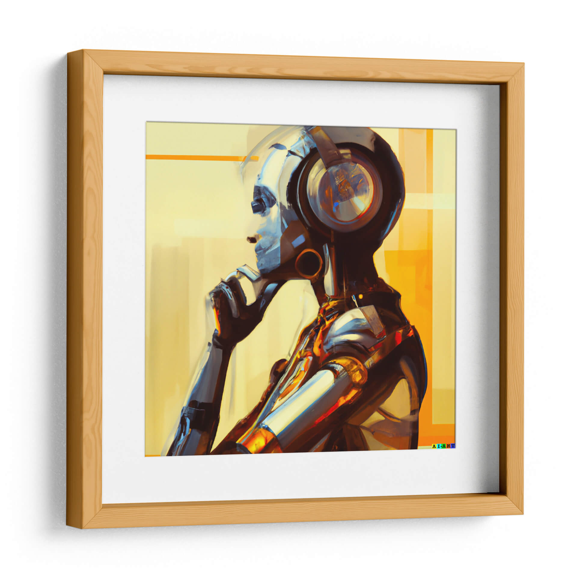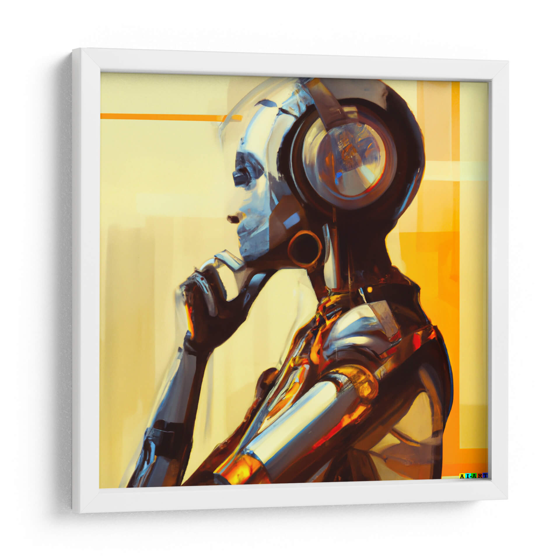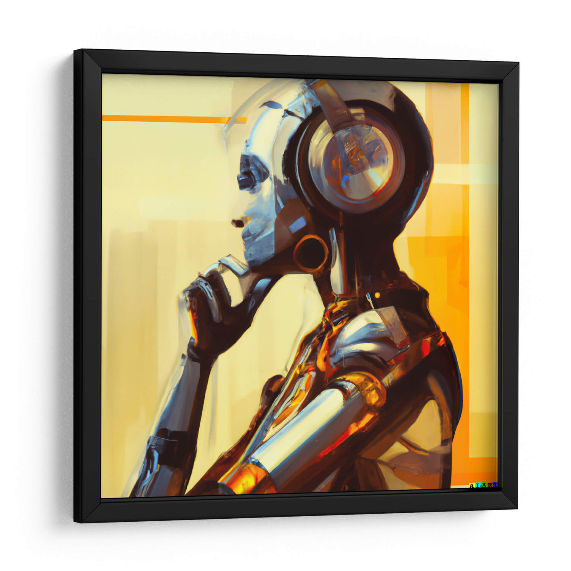 Sumérgete en el fascinante universo de "The Artificial Think 2:5", una obra de arte digital que explora la intersección entre la inteligencia artificial y la introspección humana. Este cautivador cuadro decorativo presenta una figura robótica en un momento de profunda reflexión, con sus audífonos puestos, sugiriendo una conexión con el mundo sonoro o digital. La paleta de colores, dominada por tonos cálidos de amarillo y ocre, se ve contrastada por los fríos y metálicos reflejos de la figura, creando una dinámica visual impactante. La composición, con un enfoque en el perfil de la figura y su gesto pensativo, invita a la contemplación y al misterio. El estilo semi-abstracto y las pinceladas visibles aportan una textura y profundidad únicas, haciendo que cada detalle cobre vida. Esta pieza es perfecta para espacios que buscan un toque de modernidad, tecnología y un aire de misterio intelectual. Ideal para oficinas, estudios o cualquier rincón de tu hogar donde quieras fomentar la reflexión y la conversación. "The Artificial Think 2:5" no es solo una decoración; es una ventana a la mente artificial y a las preguntas que plantea sobre la conciencia y la existencia en la era digital.
