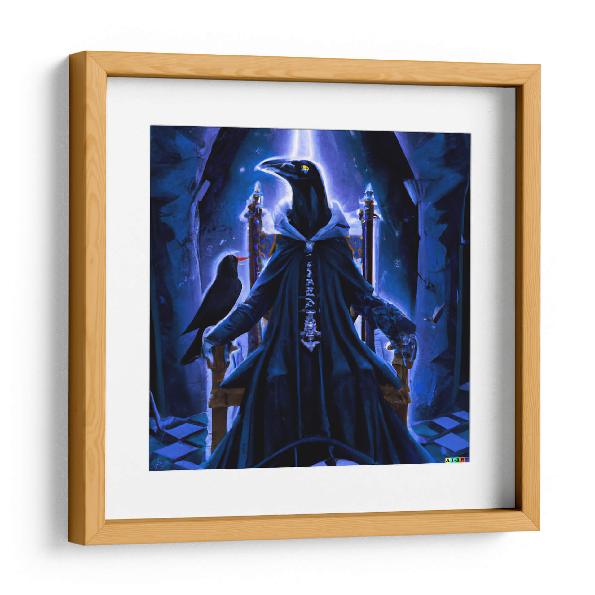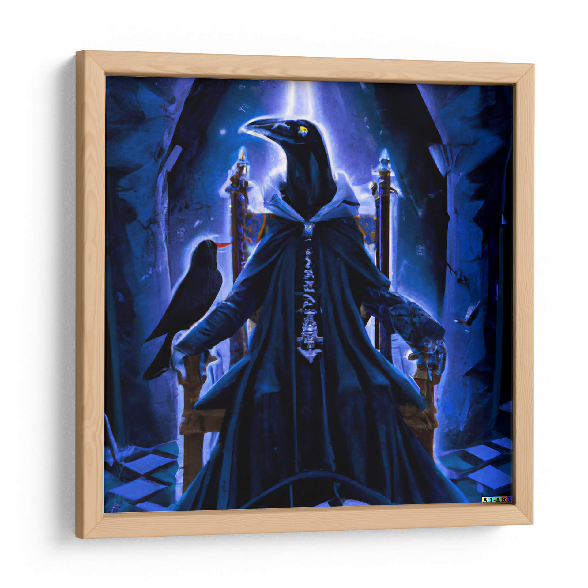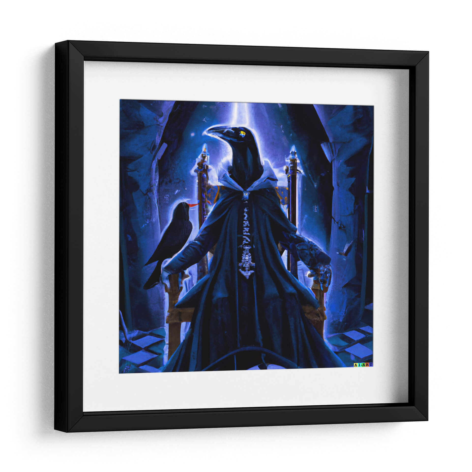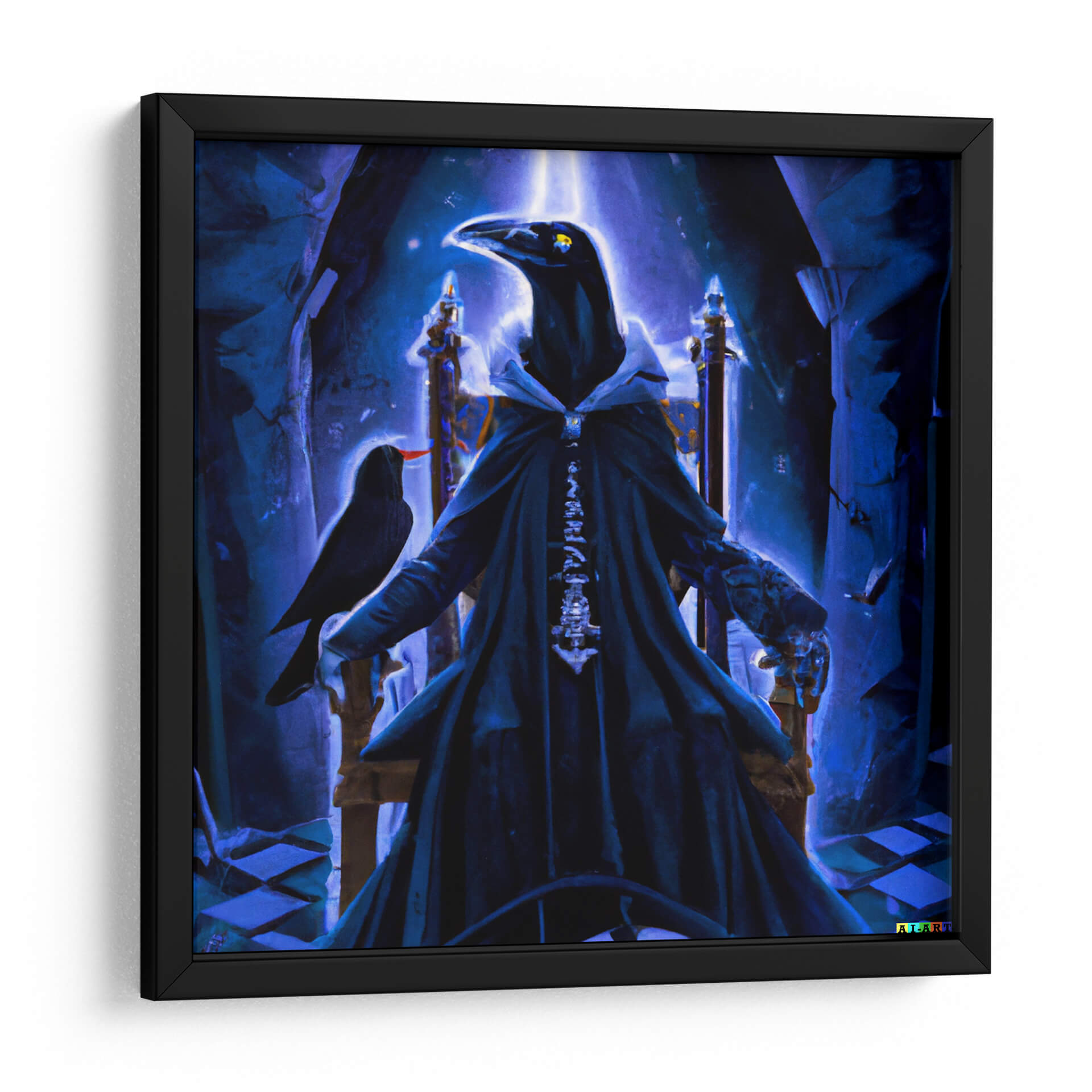 Sumérgete en el misterio y la majestuosidad con "The Raven Lord litted", una obra de arte digital que evoca un aura de poder y enigmática realeza. Esta impactante pieza presenta una figura imponente, con cabeza de cuervo, sentada en un trono suntuoso, vestida con una túnica oscura y detallada que realza su presencia dominante. La paleta de colores, dominada por intensos tonos de azul y un brillo etéreo, crea una atmósfera casi sobrenatural, llena de intriga y profundidad. La composición, con el cuervo posado en su brazo y el juego de luces y sombras, añade un toque de misticismo y narratividad a la escena. Ideal para aquellos que buscan añadir un elemento de fantasía oscura y sofisticación a su decoración, este cuadro decorativo es perfecto para salas de estar, estudios u oficinas que deseen transmitir una sensación de autoridad y elegancia inusual. "The Raven Lord litted" no es solo una imagen, es una declaración de estilo, una invitación a explorar lo desconocido y a rodearse de arte que cuenta historias.