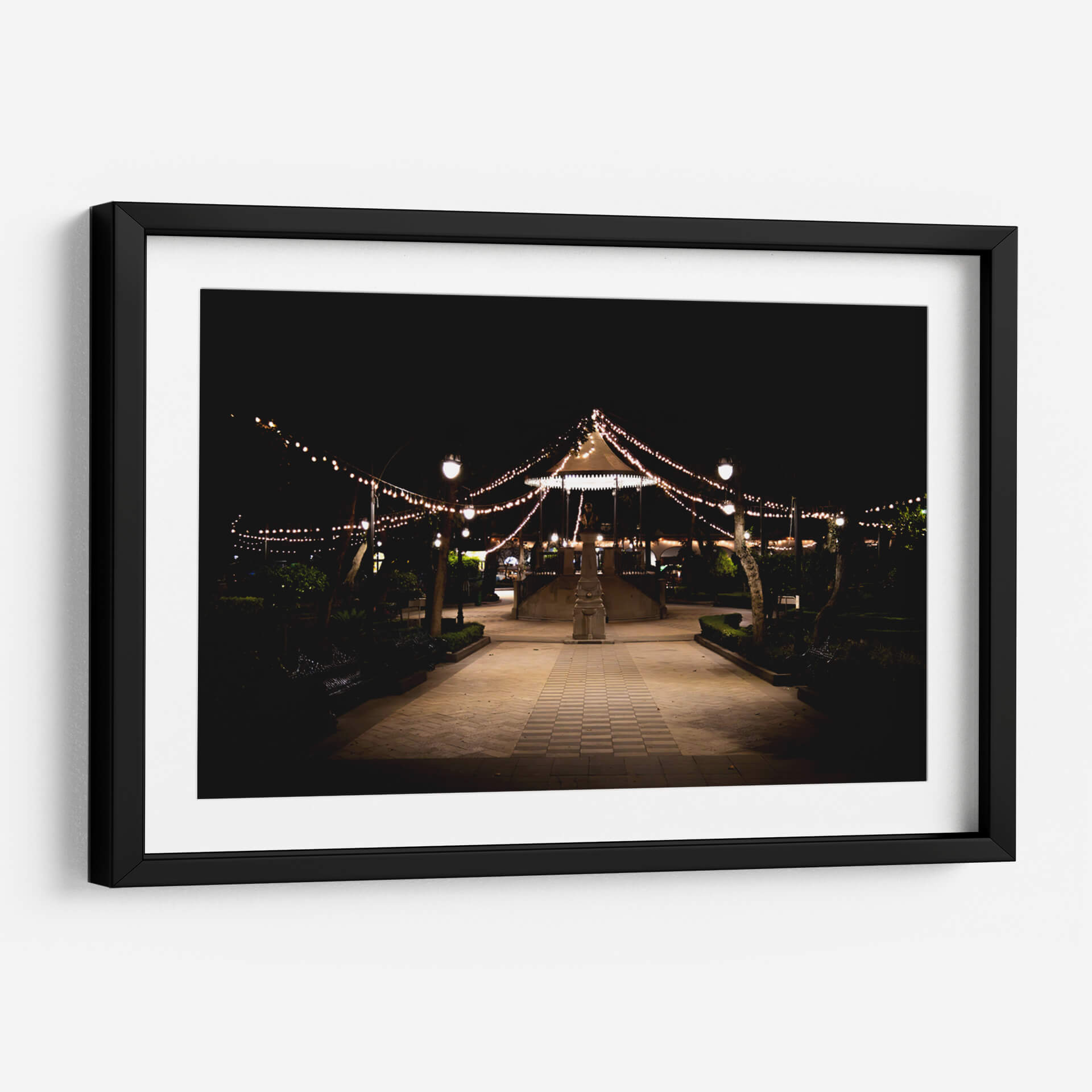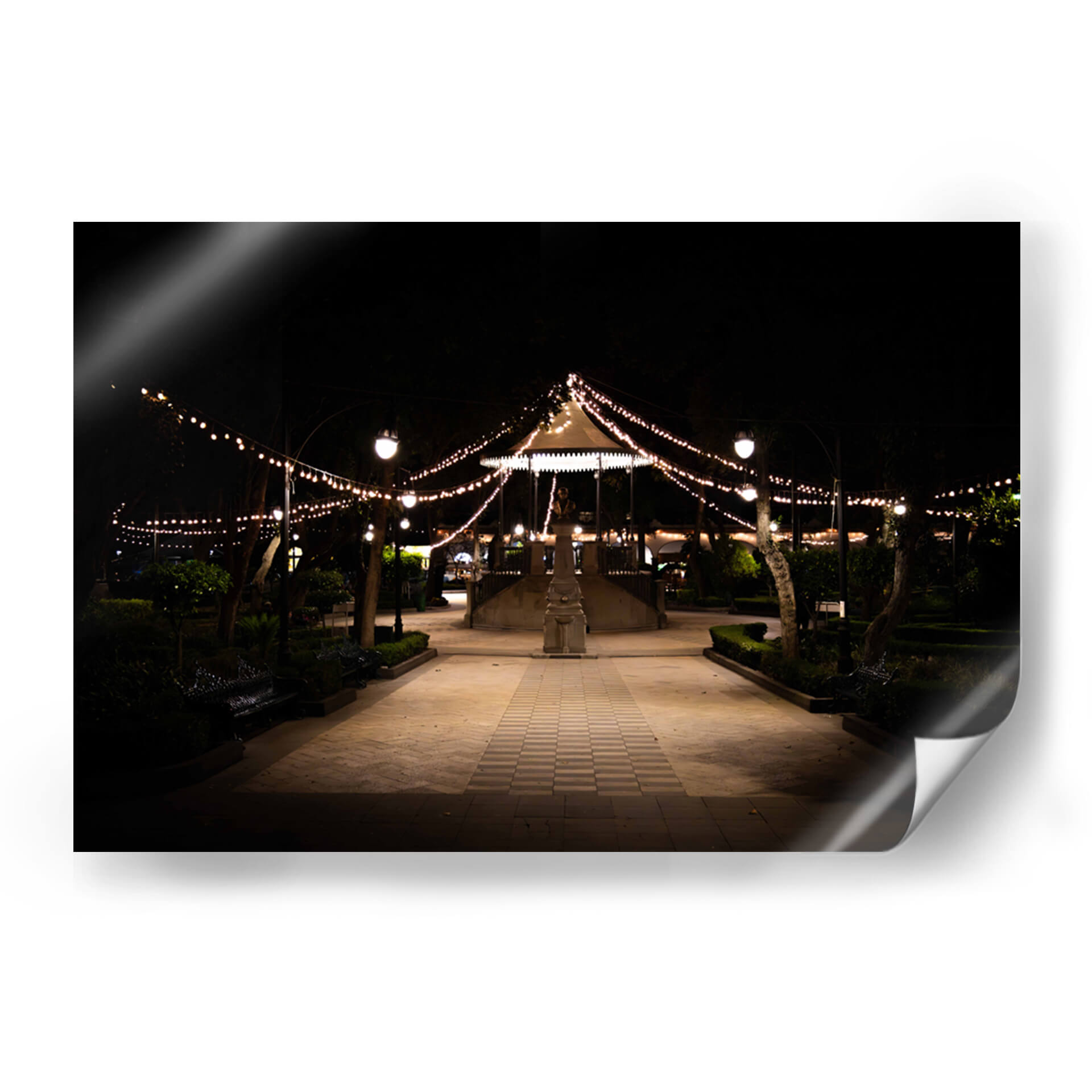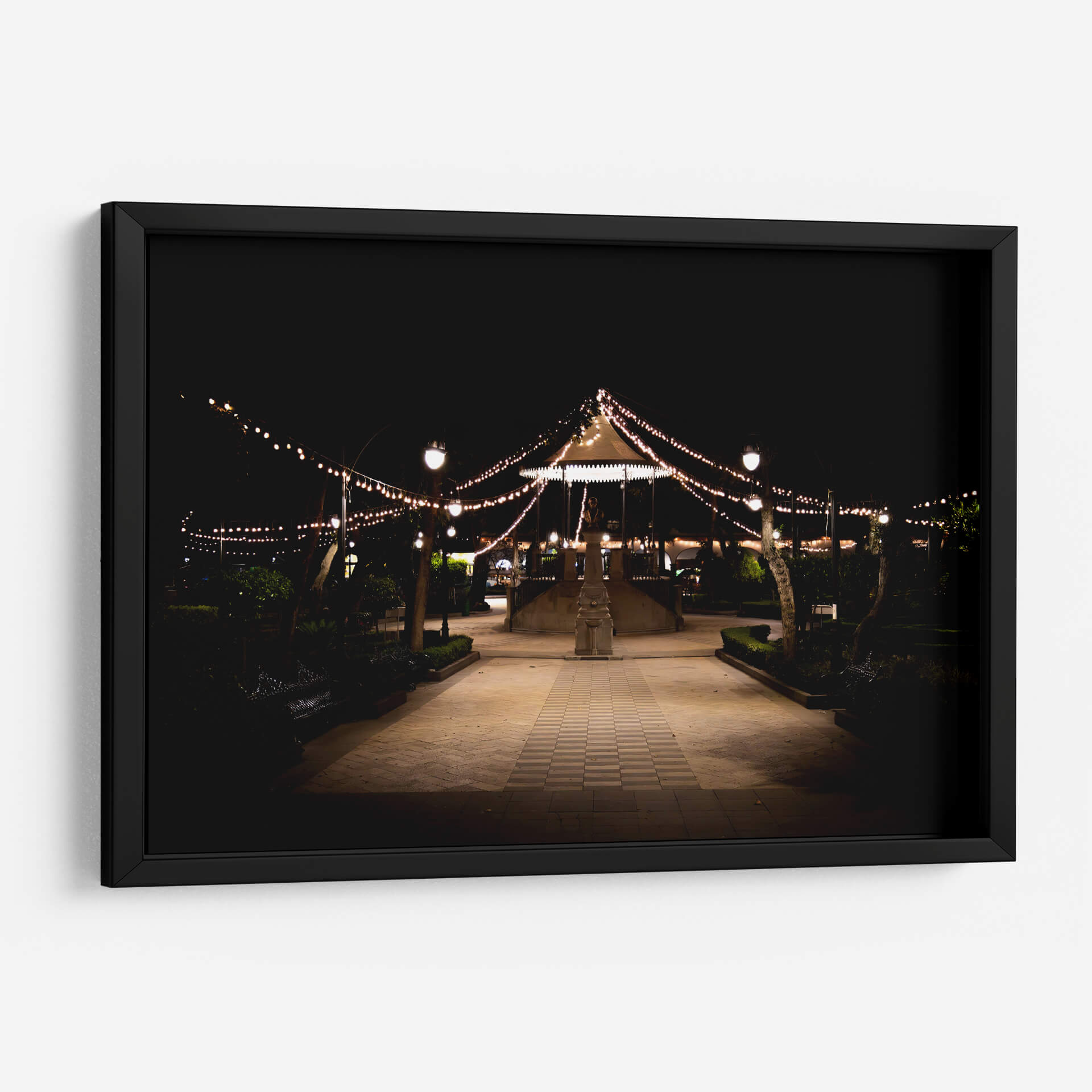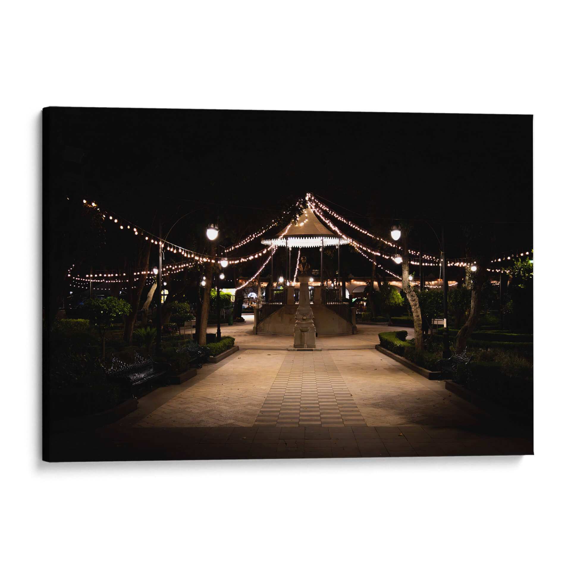 Transporta tus sentidos a una noche mágica con este cuadro decorativo "Tlalpan" de Alan050. La obra captura la serena belleza de un parque iluminado por la noche, con delicadas guirnaldas de luces que bañan el camino y un kiosco central en un ambiente de ensueño. Los tonos oscuros del cielo nocturno contrastan sutilmente con el cálido resplandor de las bombillas, creando una atmósfera íntima y acogedora. La composición, con el sendero que se adentra hacia el kiosco y la arquitectura sutilmente iluminada, invita a la contemplación y al paseo imaginario. Este cuadro es ideal para añadir un toque de elegancia y misterio a tu sala de estar, recibidor o incluso a un espacio de trabajo que busque inspiración. La fotografía, con su enfoque nítido y el juego de luces y sombras, evoca una sensación de paz y nostalgia, transportándote a un momento de tranquilidad urbana. "Tlalpan" es más que una simple decoración; es una invitación a revivir la magia de las noches estrelladas y la quietud de los espacios públicos bellamente iluminados. Perfecta para quienes buscan arte que hable de serenidad y momentos capturados en el tiempo.