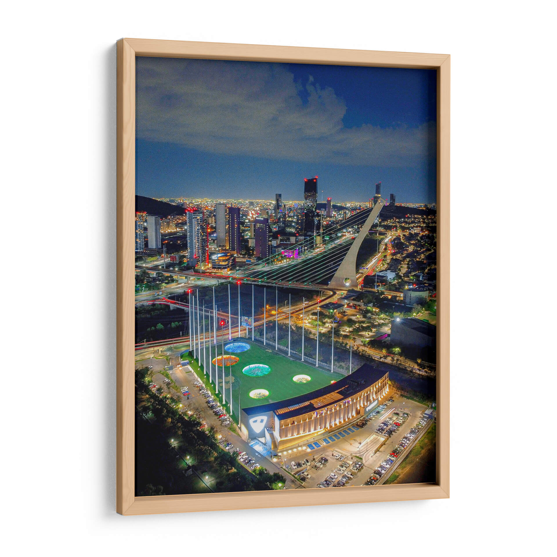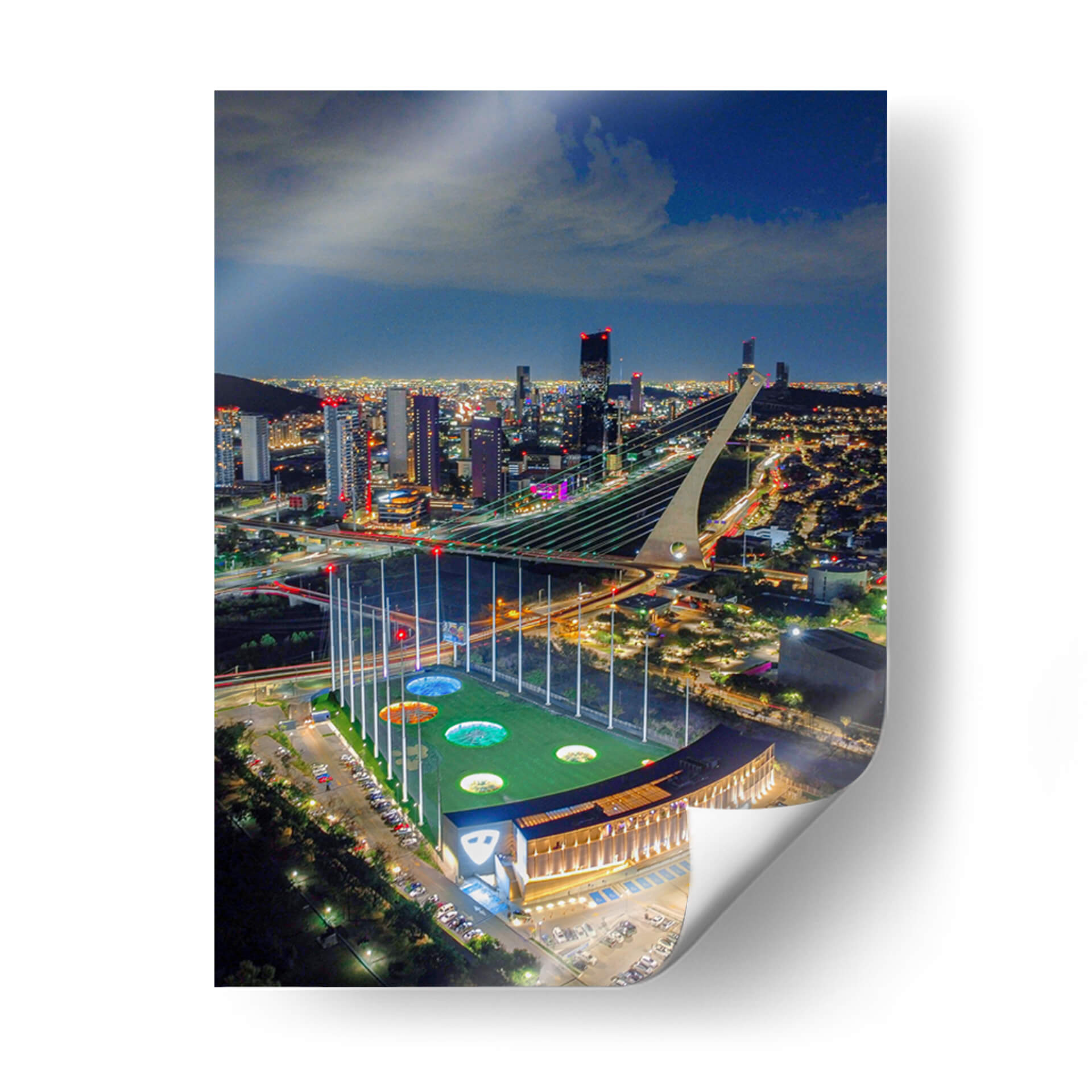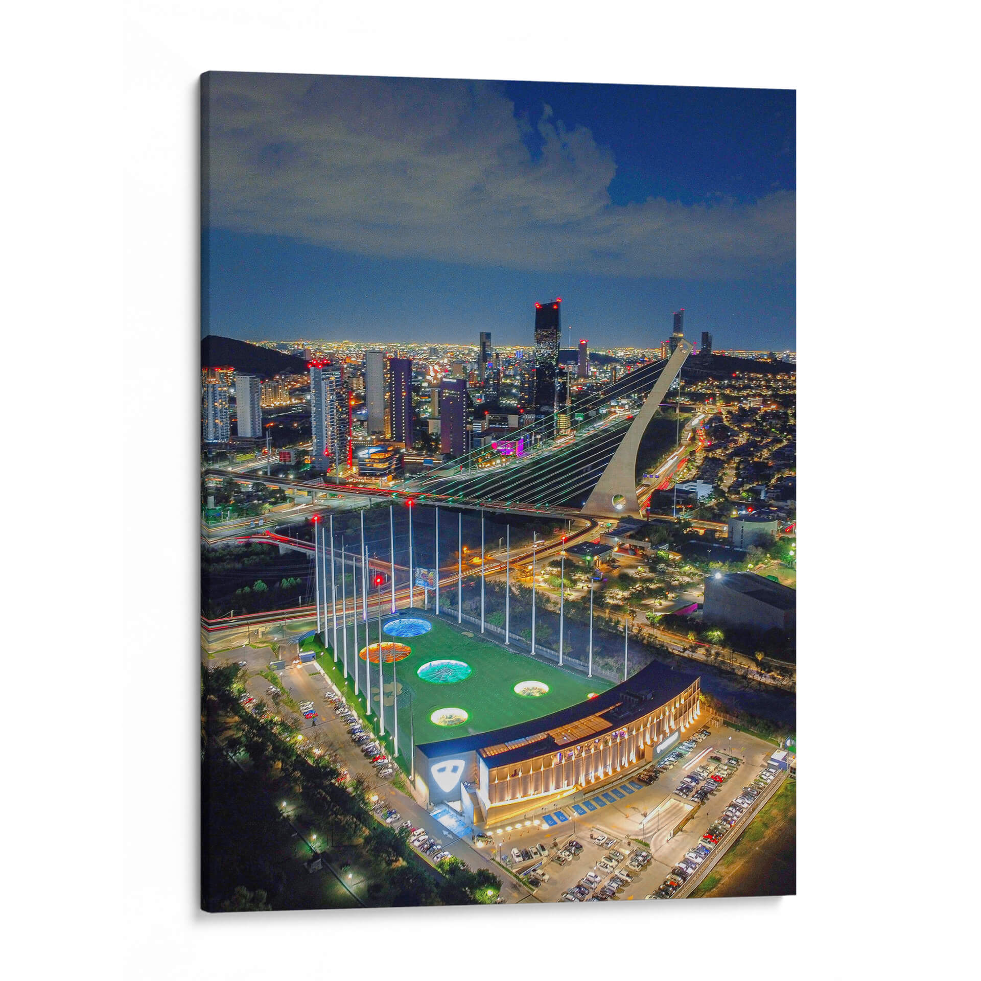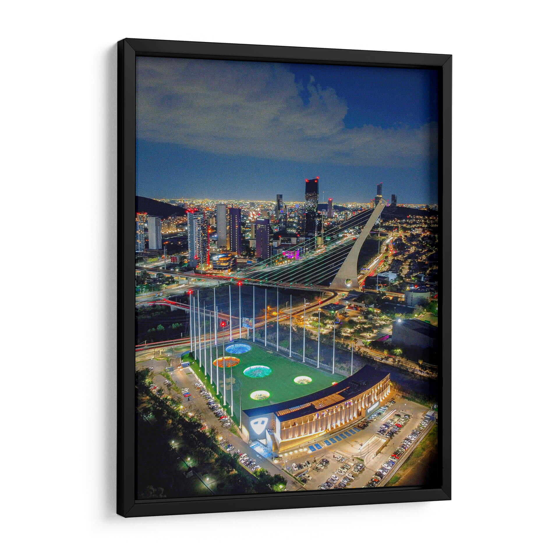 Captura la vibrante energía de la noche urbana con "Top Golf Mty", una obra de arte que inmortaliza la majestuosidad de un campo de golf iluminado bajo el cielo estrellado y el resplandor de una ciudad moderna. Esta pieza, un testimonio visual del talento de Abner Fabian, te transporta a un momento de conexión entre el deporte y la urbe. La composición aérea ofrece una perspectiva única, destacando las luces cálidas del edificio del club y el campo de juego, contrastando con las luces más frías y distantes de los rascacielos que delinean el horizonte. El uso audaz de la luz y la sombra crea una atmósfera dinámica, llena de vida y movimiento, perfecta para infundir a cualquier espacio una sensación de sofisticación y entretenimiento. Ideal para salas de estar, oficinas o cualquier ambiente que busque un punto focal cautivador y moderno. Este cuadro decorativo es más que una imagen; es una invitación a experimentar la fusión entre la arquitectura imponente, el paisaje nocturno y la emoción del juego.