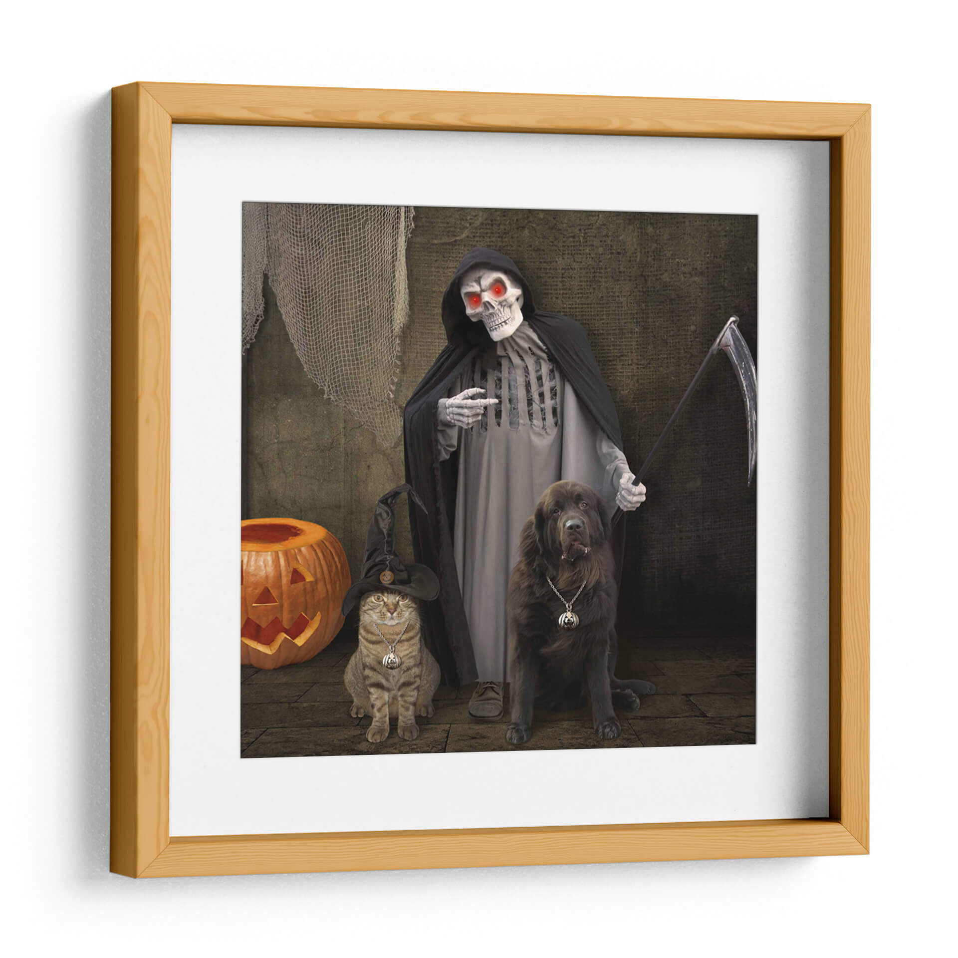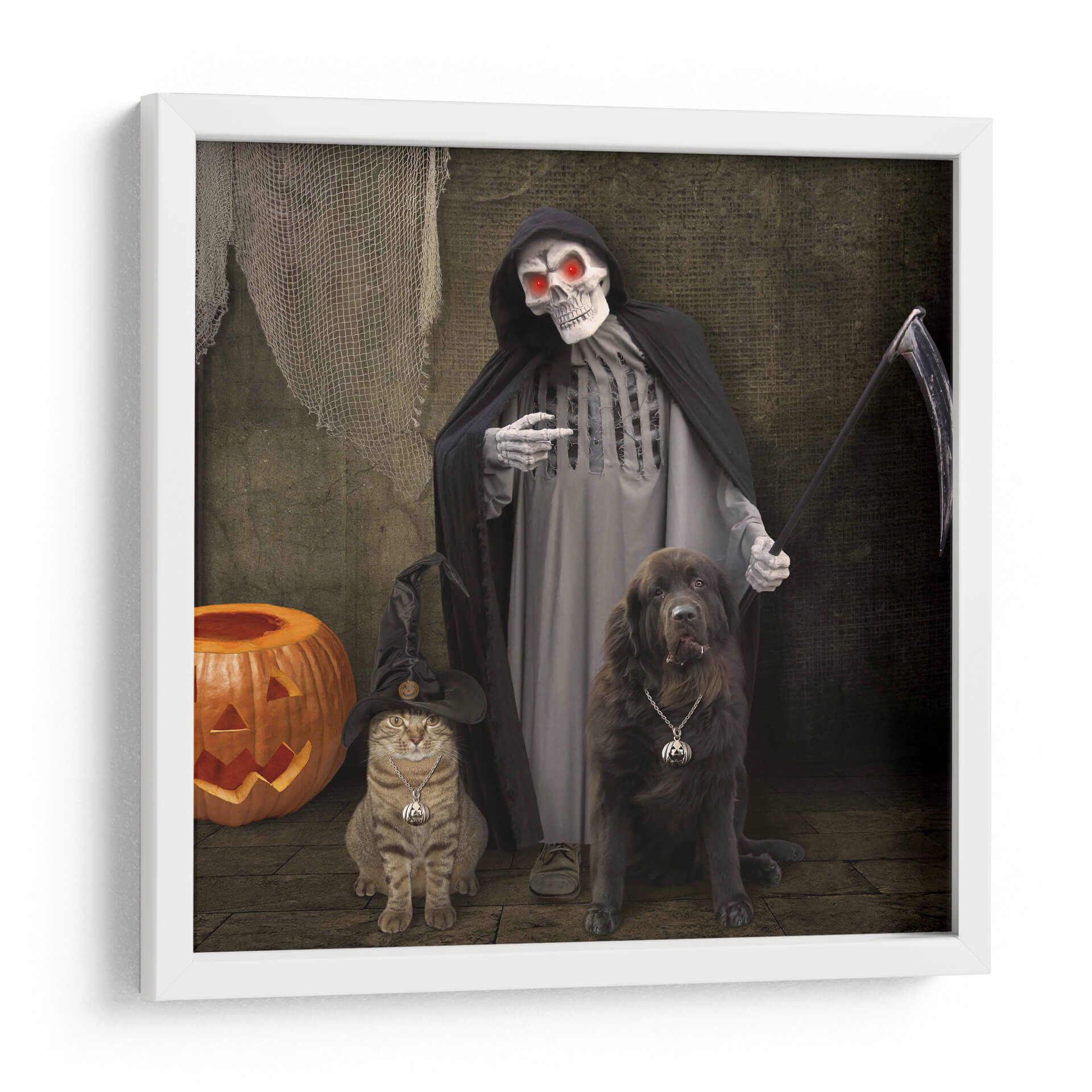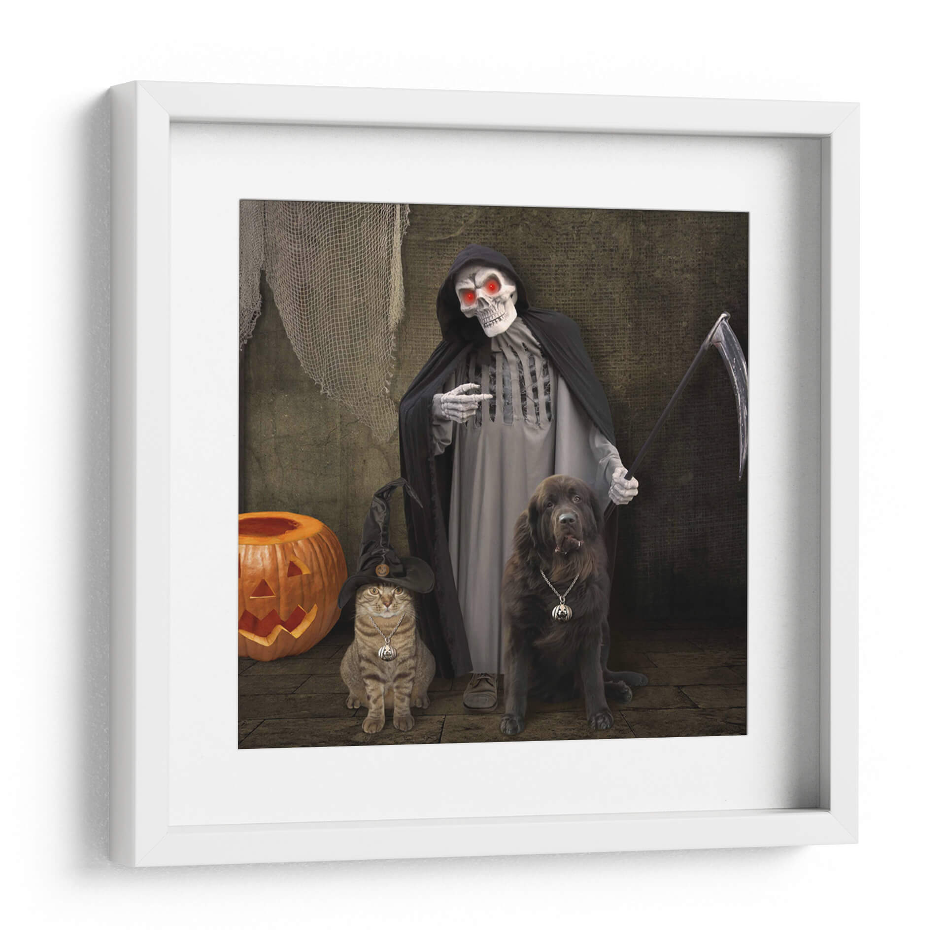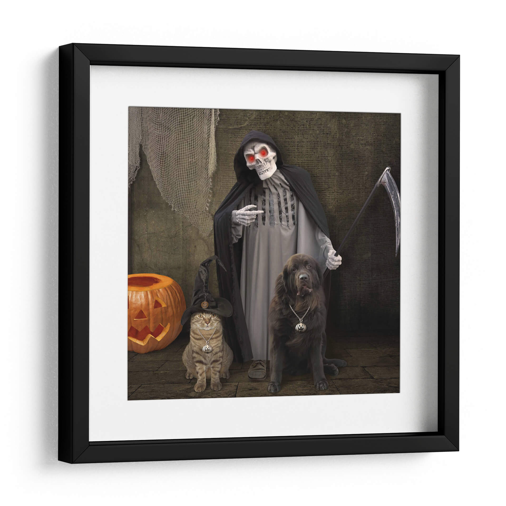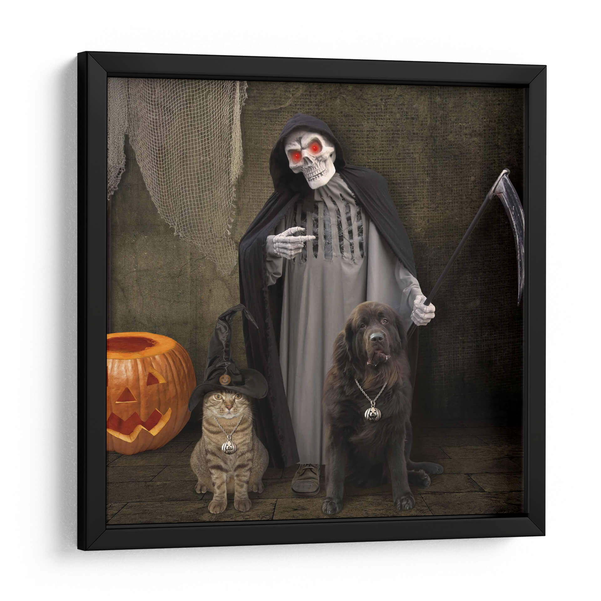 Celebra la temporada más espeluznante y divertida con este cuadro decorativo "¡Tranquilos! ¡Ya llega Halloween!". La obra maestra de Iryna Kuznetsova (Iridi) captura la esencia de Halloween de una manera única y encantadora, fusionando elementos icónicos de la festividad con personajes adorables. En el centro de la composición, la figura de la Parca, con sus ojos rojos brillantes y túnica oscura, se erige como un guardián juguetón. A su lado, un gato atigrado con sombrero de bruja y un imponente perro negro, ambos luciendo collares temáticos, añaden un toque de ternura y misterio a la escena. El fondo texturizado, junto a una calabaza tallada que ilumina con su interior anaranjado, transporta al espectador a una atmósfera de noche de brujas. Los tonos oscuros y terrosos predominantes se ven realzados por los destellos rojos de la Parca y el cálido resplandor de la calabaza, creando un contraste visual cautivador. Este cuadro decorativo es perfecto para añadir un toque de humor y estilo a tu hogar u oficina durante la temporada de Halloween, o como una pieza de conversación durante todo el año. Ideal para salas de estar, estudios o cualquier espacio que busque una decoración original y con carácter.