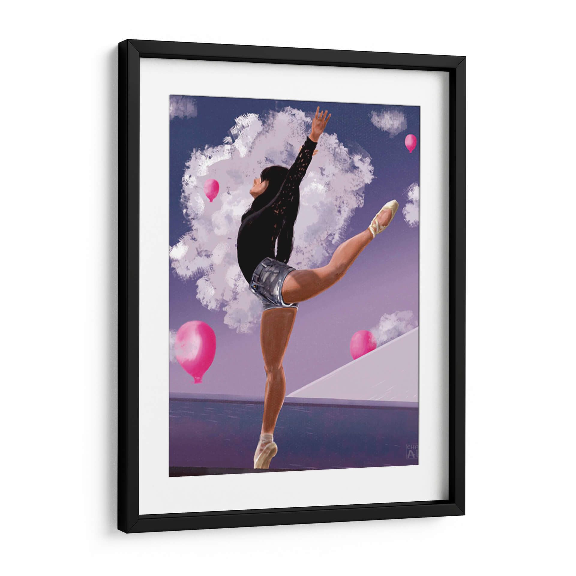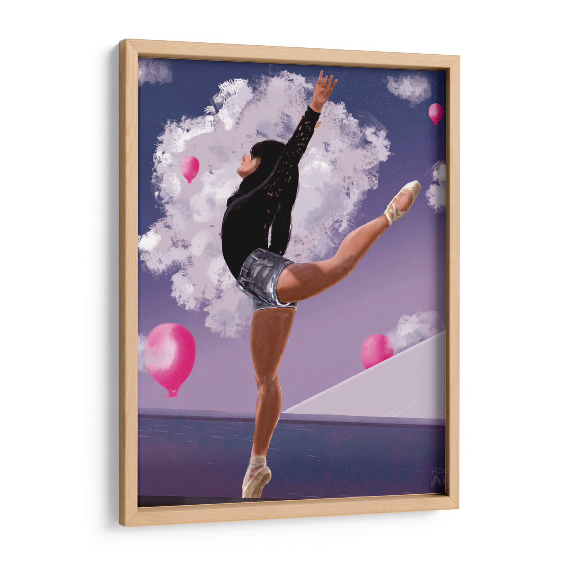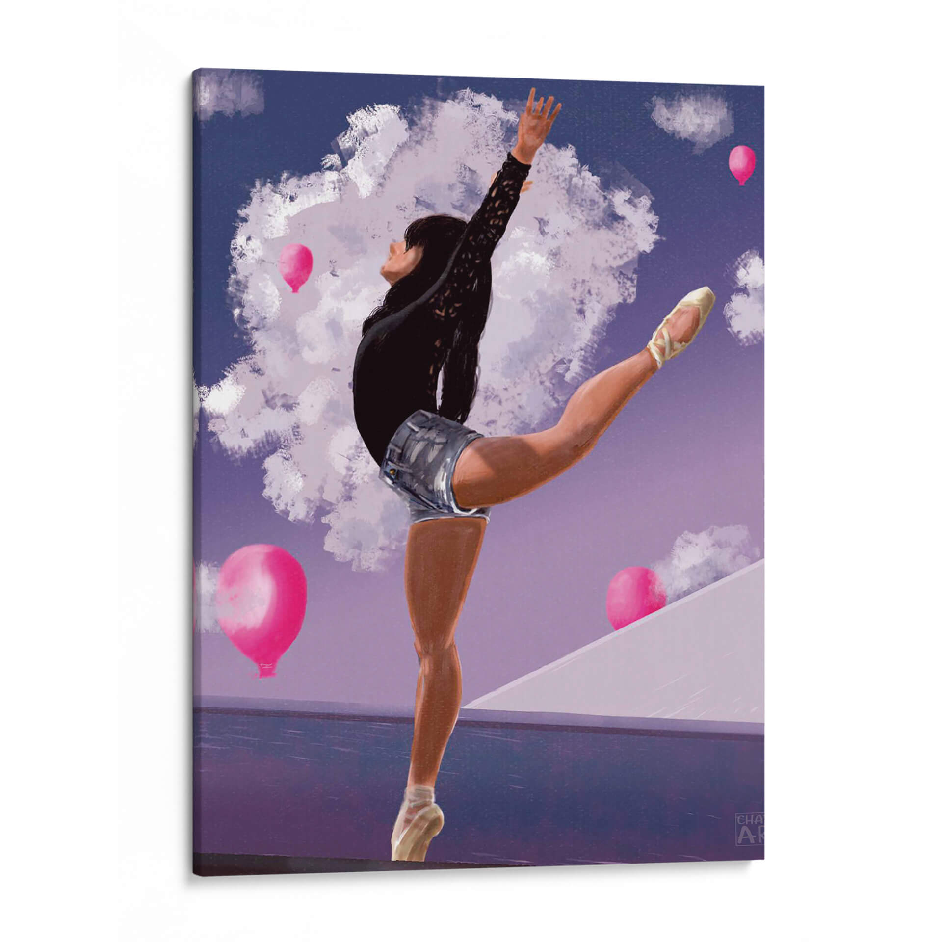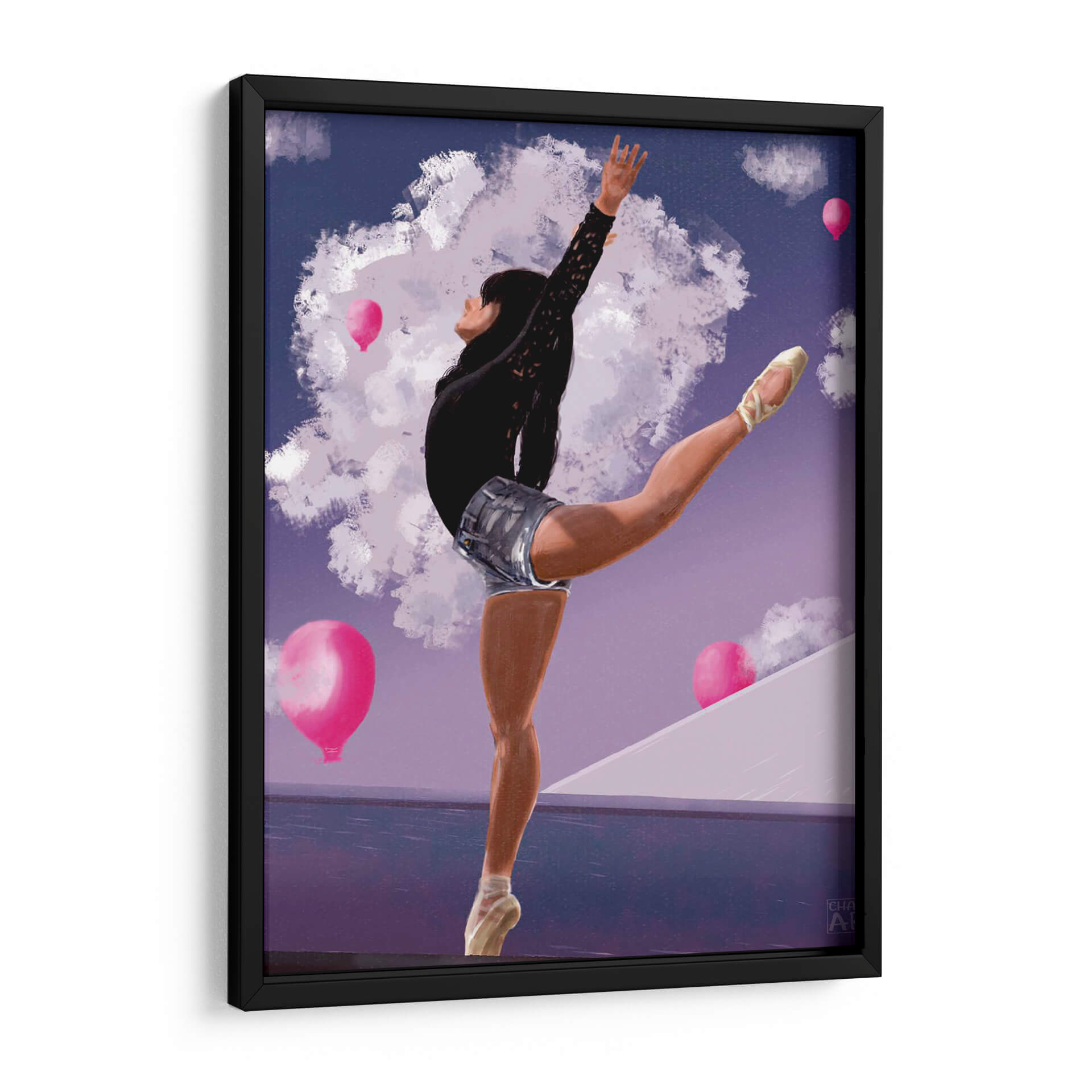Captura la esencia de la danza y la libertad con 'Último despertar', una obra de arte que evoca movimiento y ensueño. Esta pieza presenta a una bailarina en una pose grácil y dinámica, con el brazo extendido hacia el cielo y una pierna elevada en un arabesque perfecto. Su atuendo, una mezcla de encaje negro y shorts vaqueros, añade un toque contemporáneo a la clásica elegancia del ballet. El fondo se compone de un cielo púrpura crepuscular, salpicado de nubes etéreas y globos de color rosa vibrante que flotan libremente, creando una atmósfera onírica y festiva. La composición, con la bailarina centrada y los elementos flotantes distribuidos armónicamente, dirige la mirada hacia la figura principal y su expresión de anhelo o celebración. Los tonos fríos del cielo contrastan con el cálido tono de piel de la bailarina y el rosa intenso de los globos, generando un equilibrio visual cautivador. Este cuadro decorativo es ideal para añadir un toque de inspiración y color a cualquier espacio, desde una sala de estar moderna hasta un dormitorio o una oficina, invitando a la reflexión sobre la superación personal y la belleza del movimiento.
