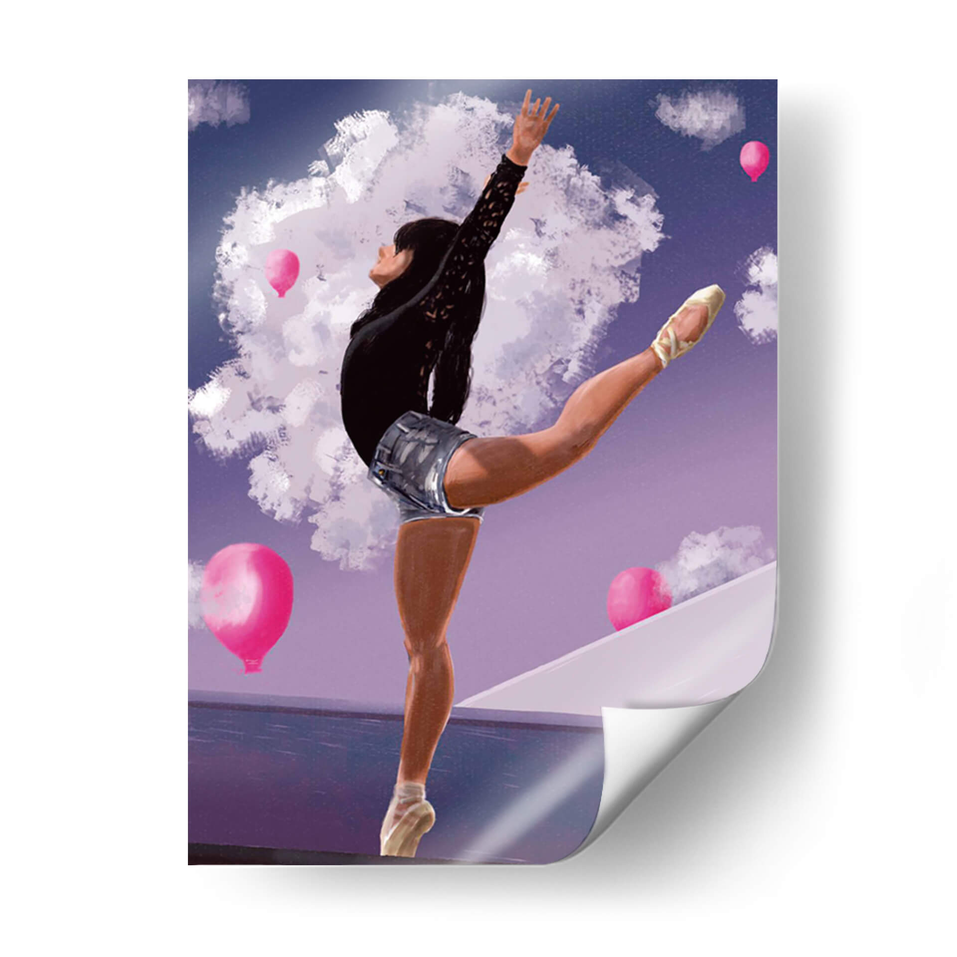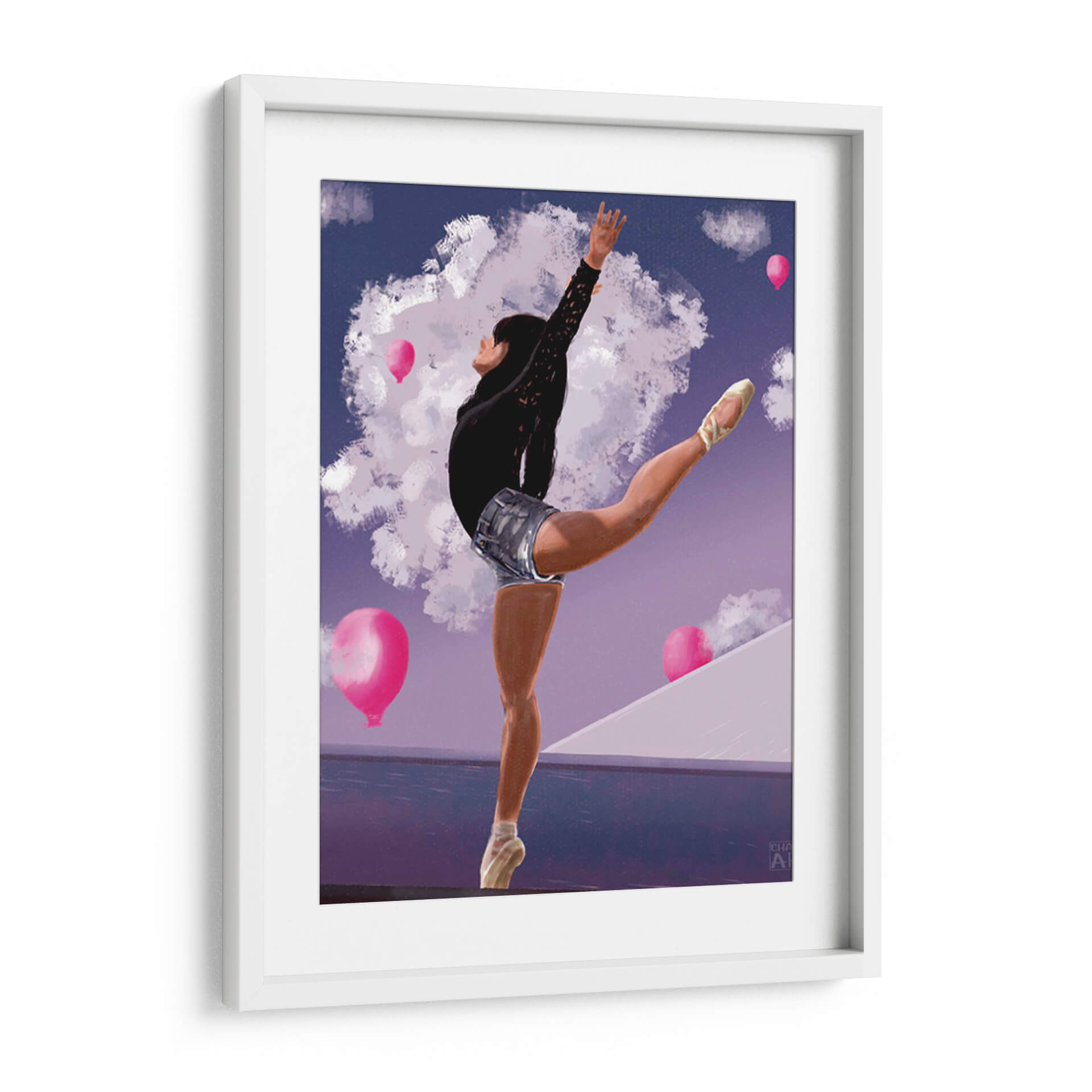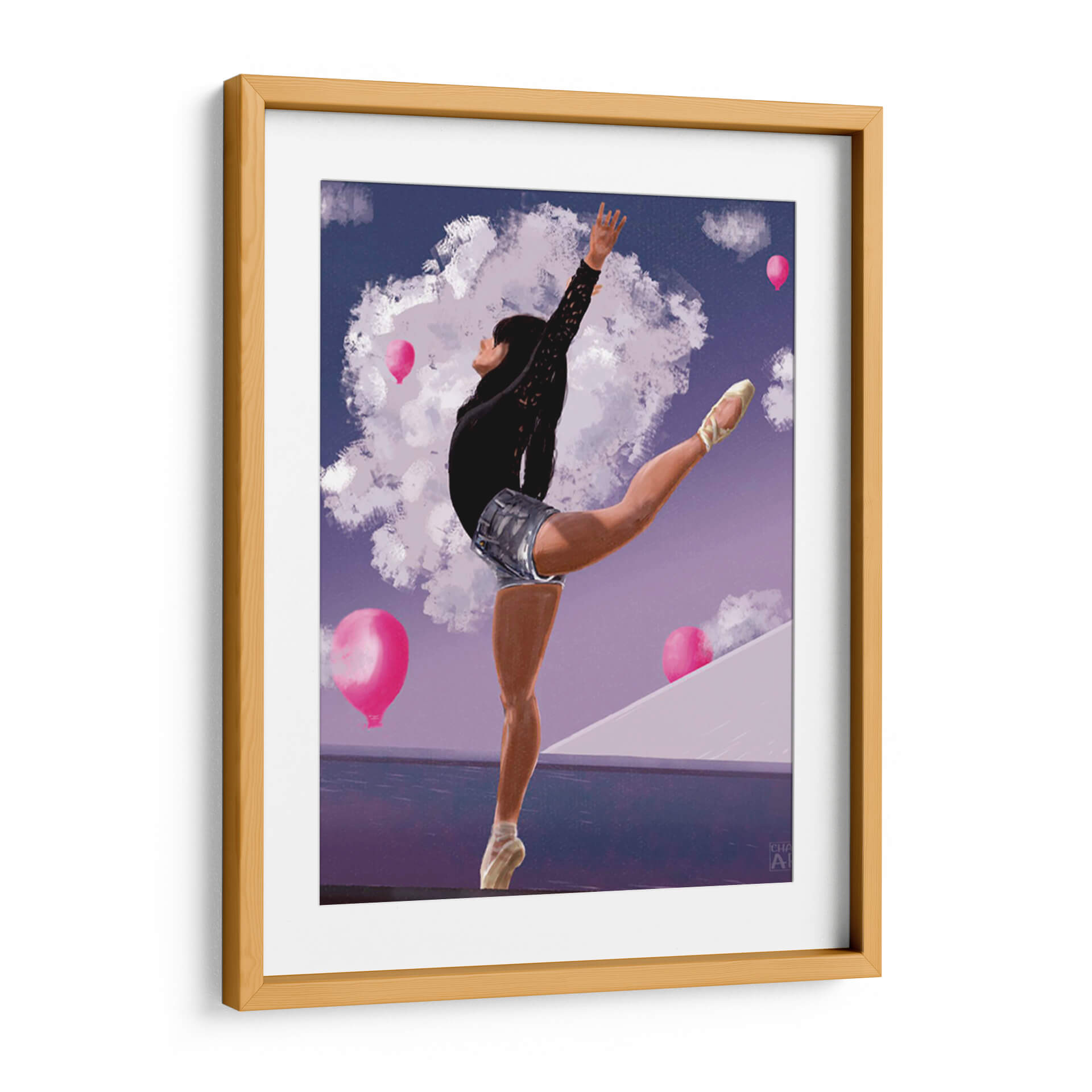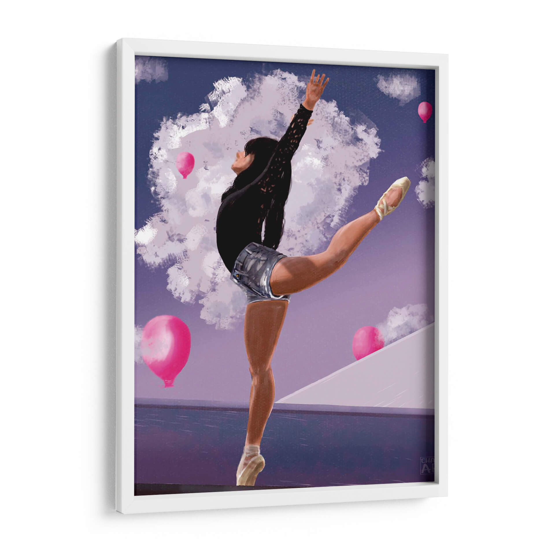 Captura la esencia de la danza y la libertad con 'Último despertar', una obra de arte que evoca movimiento y ensueño. Esta pieza presenta a una bailarina en una pose grácil y dinámica, con el brazo extendido hacia el cielo y una pierna elevada en un arabesque perfecto. Su atuendo, una mezcla de encaje negro y shorts vaqueros, añade un toque contemporáneo a la clásica elegancia del ballet. El fondo se compone de un cielo púrpura crepuscular, salpicado de nubes etéreas y globos de color rosa vibrante que flotan libremente, creando una atmósfera onírica y festiva. La composición, con la bailarina centrada y los elementos flotantes distribuidos armónicamente, dirige la mirada hacia la figura principal y su expresión de anhelo o celebración. Los tonos fríos del cielo contrastan con el cálido tono de piel de la bailarina y el rosa intenso de los globos, generando un equilibrio visual cautivador. Este cuadro decorativo es ideal para añadir un toque de inspiración y color a cualquier espacio, desde una sala de estar moderna hasta un dormitorio o una oficina, invitando a la reflexión sobre la superación personal y la belleza del movimiento.