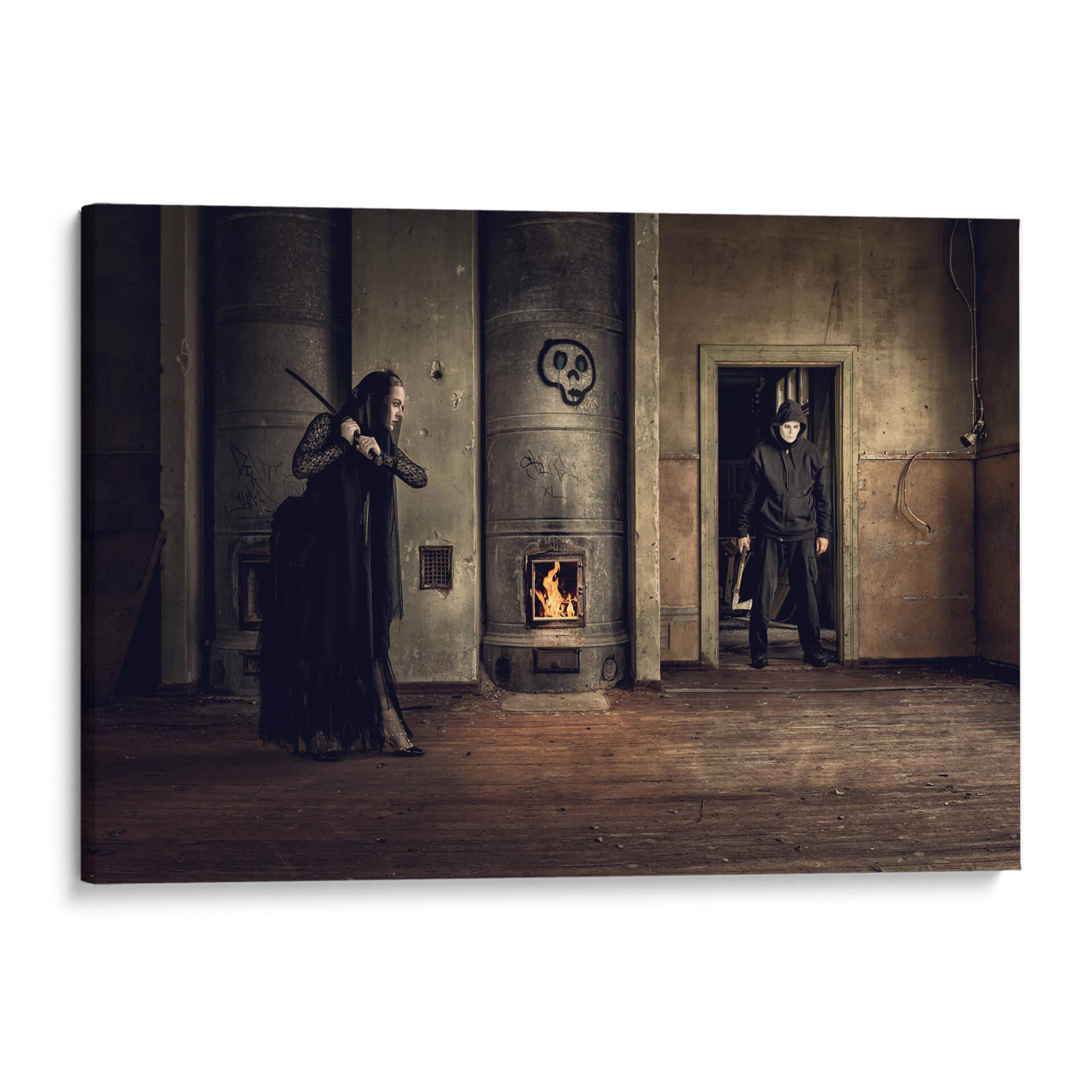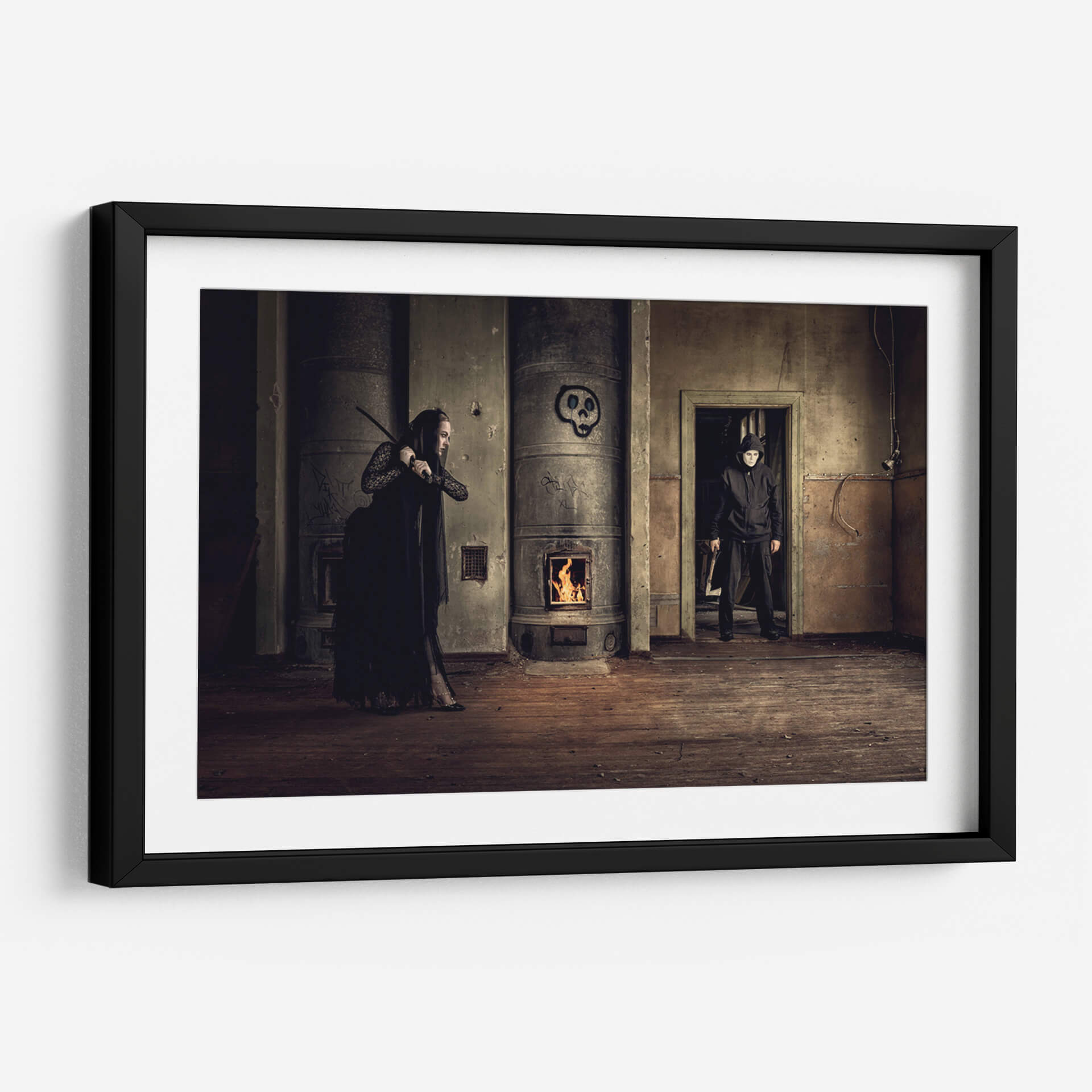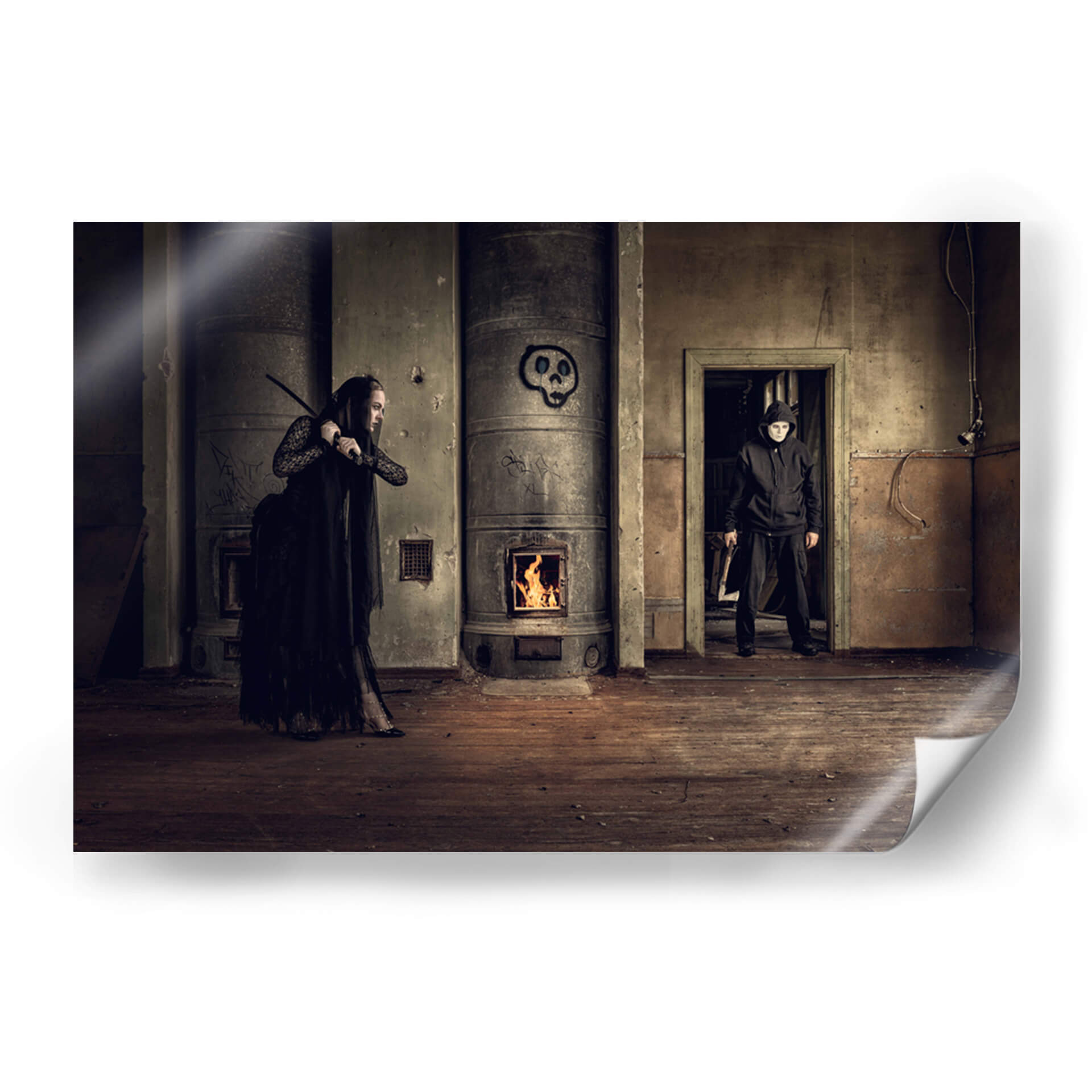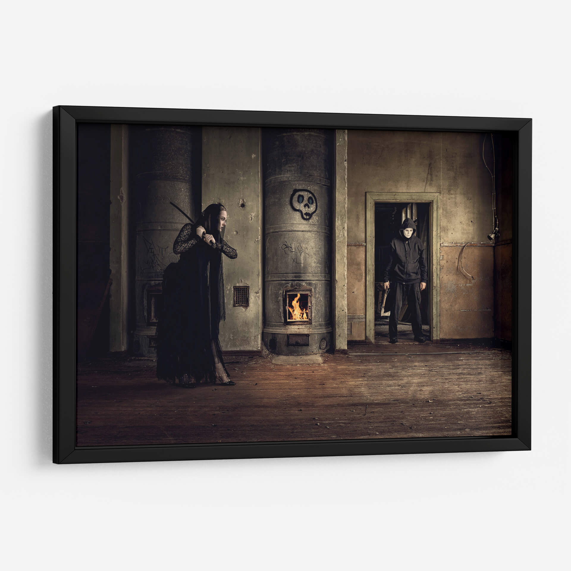 Sumérgete en la atmósfera enigmática de 'Un Extraño en la Puerta', una obra de arte cautivadora del artista Petri Damsten. Esta pieza, con su composición dramática y paleta de colores sombría, evoca un sentido de misterio y suspense. La escena se desarrolla en un entorno desolado, donde una figura femenina vestida de negro, empuñando lo que parece ser una katana, se enfrenta a una presencia amenazante en una puerta abierta. El fuego crepitante en una estufa antigua añade un toque de calidez inquietante a la cruda realidad del espacio. Los tonos terrosos y los contrastes de luz y sombra crean una profundidad visual que invita a la contemplación. Este cuadro decorativo es perfecto para aquellos que buscan añadir un toque de intriga y sofisticación a su hogar u oficina. Su estilo único lo convierte en un punto focal excepcional para salas de estar, estudios o incluso espacios comerciales que buscan una estética audaz y memorable. 'Un Extraño en la Puerta' no es solo una imagen, es una narrativa visual que estimula la imaginación y despierta conversaciones, ideal para coleccionistas de arte contemporáneo y amantes de las piezas con carácter.