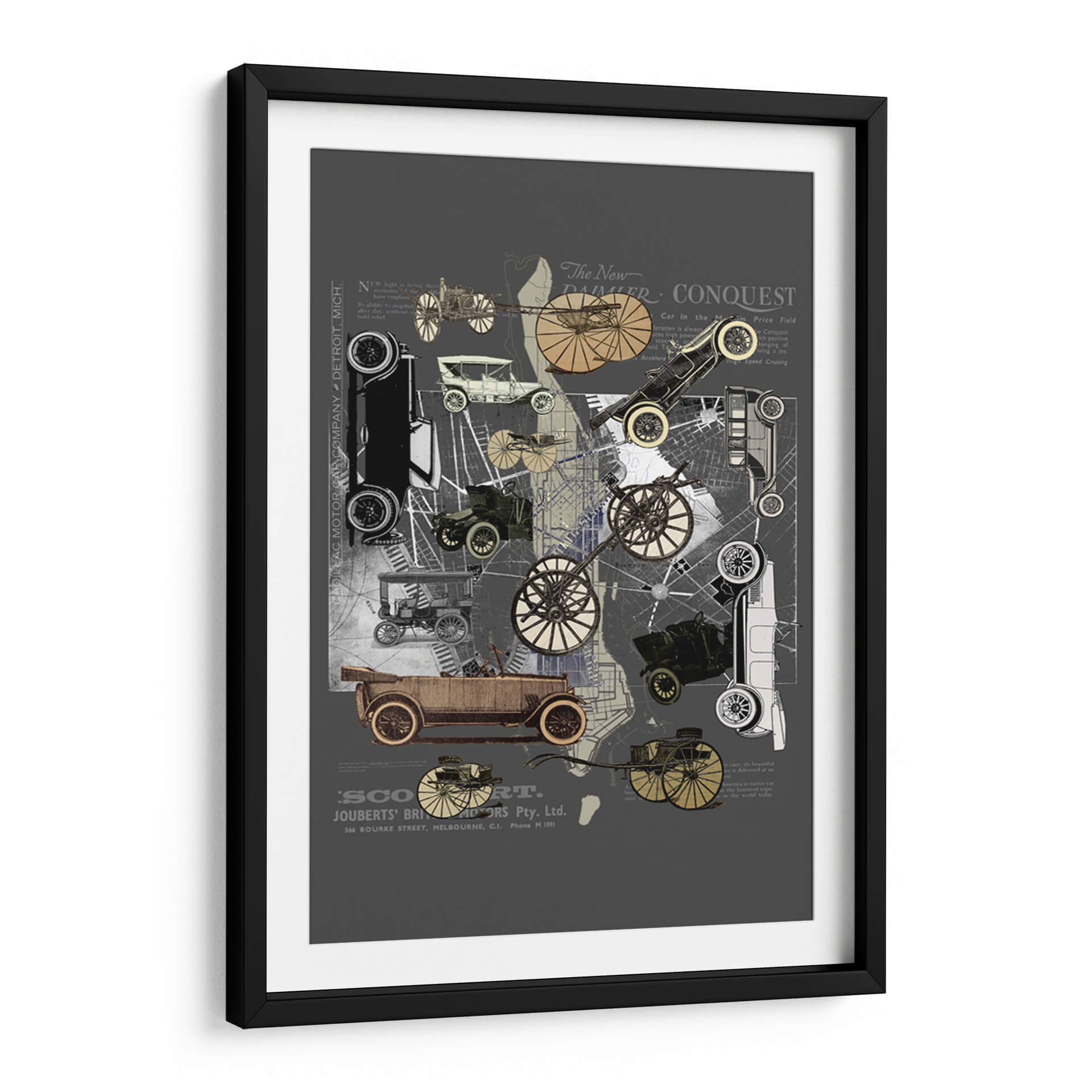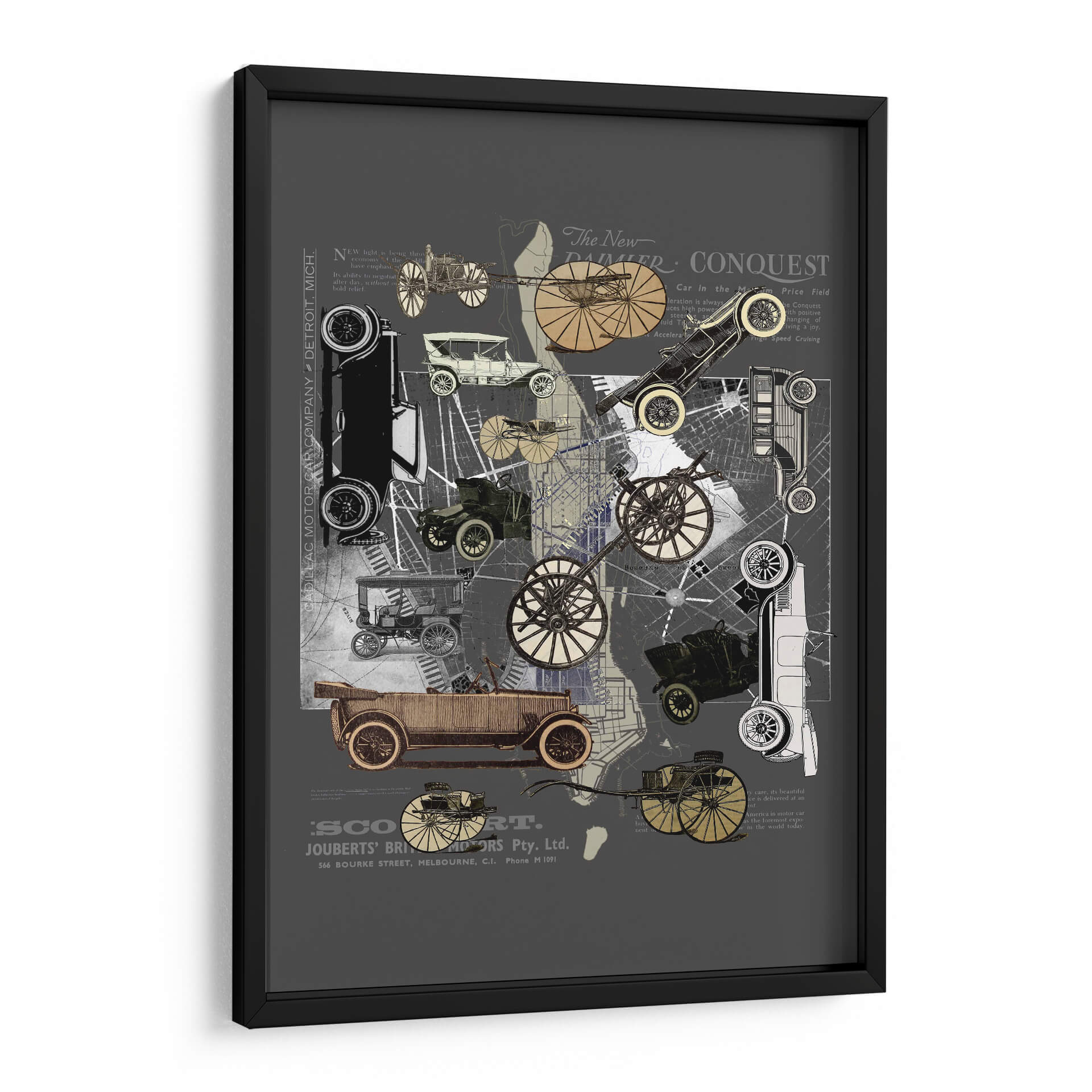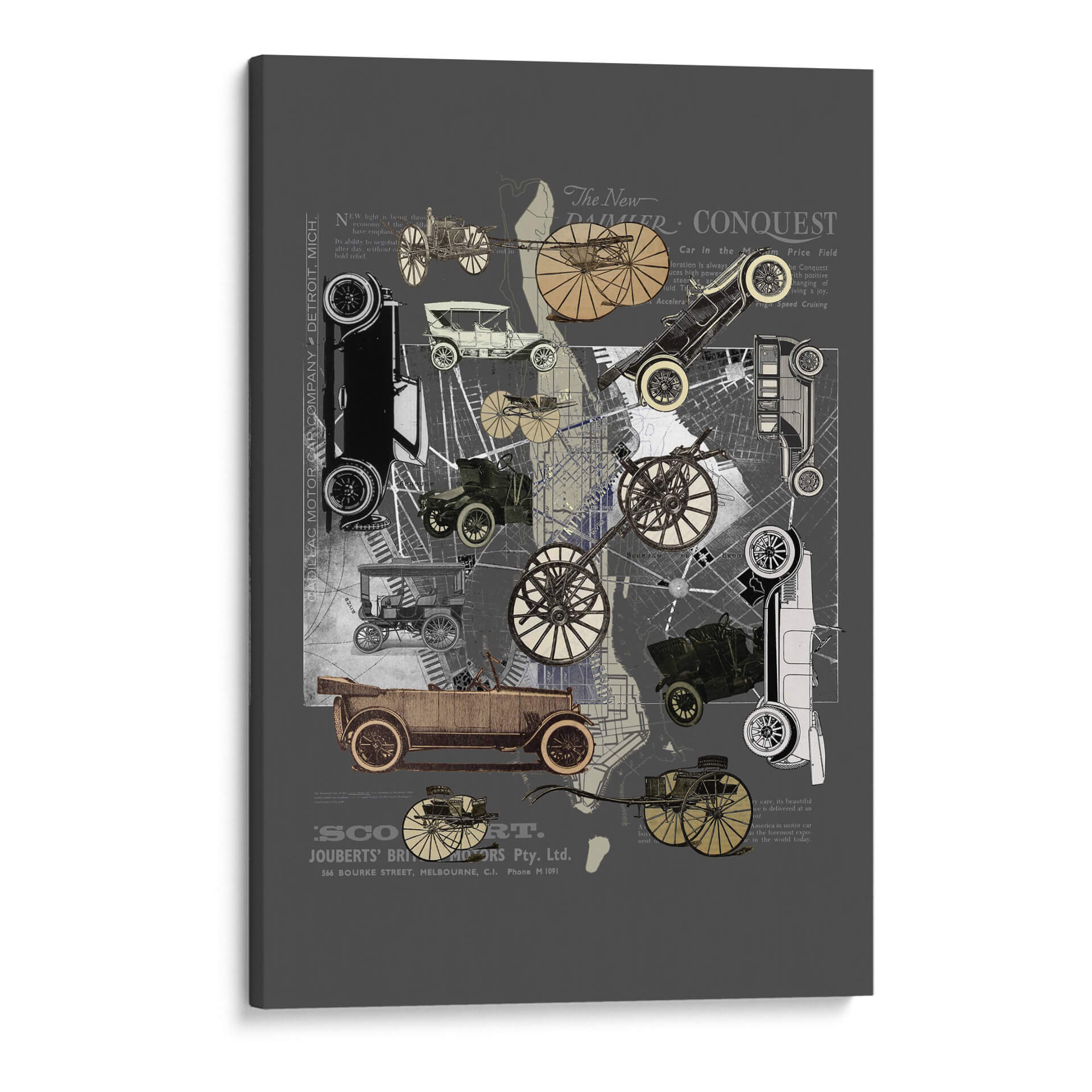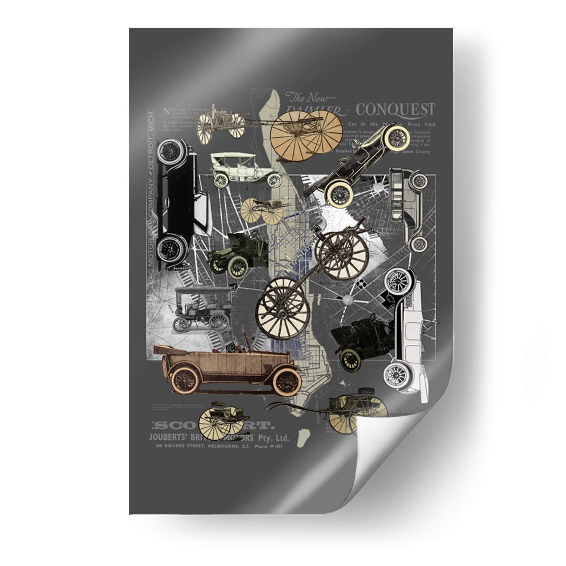 Sumérgete en la nostalgia y el encanto de una era pasada con este cautivador cuadro decorativo 'Vehículos de Nueva York' de Pawel Pacholec. La obra presenta un collage artístico que entrelaza imágenes de automóviles clásicos de principios del siglo XX, mapas urbanos y fragmentos de texto antiguo, creando una composición dinámica y llena de detalles. La paleta de colores, dominada por tonos grises, sepia y acentos dorados, evoca una sensación de autenticidad histórica y sofisticación. El estilo, que combina elementos de collage, vintage y gráfico, es perfecto para quienes aprecian el diseño retro y la historia del transporte. Este cuadro decorativo es ideal para añadir un toque de carácter único a cualquier espacio, desde una sala de estar moderna hasta una oficina con inspiración industrial o un estudio. Su temática sobre la evolución de la movilidad urbana y el diseño automotriz atraerá a entusiastas de los coches clásicos y amantes del arte con un gusto por lo nostálgico. Transforma tu pared en una ventana al pasado con esta pieza evocadora y estilizada, un verdadero homenaje a la ingeniería y la estética de antaño.