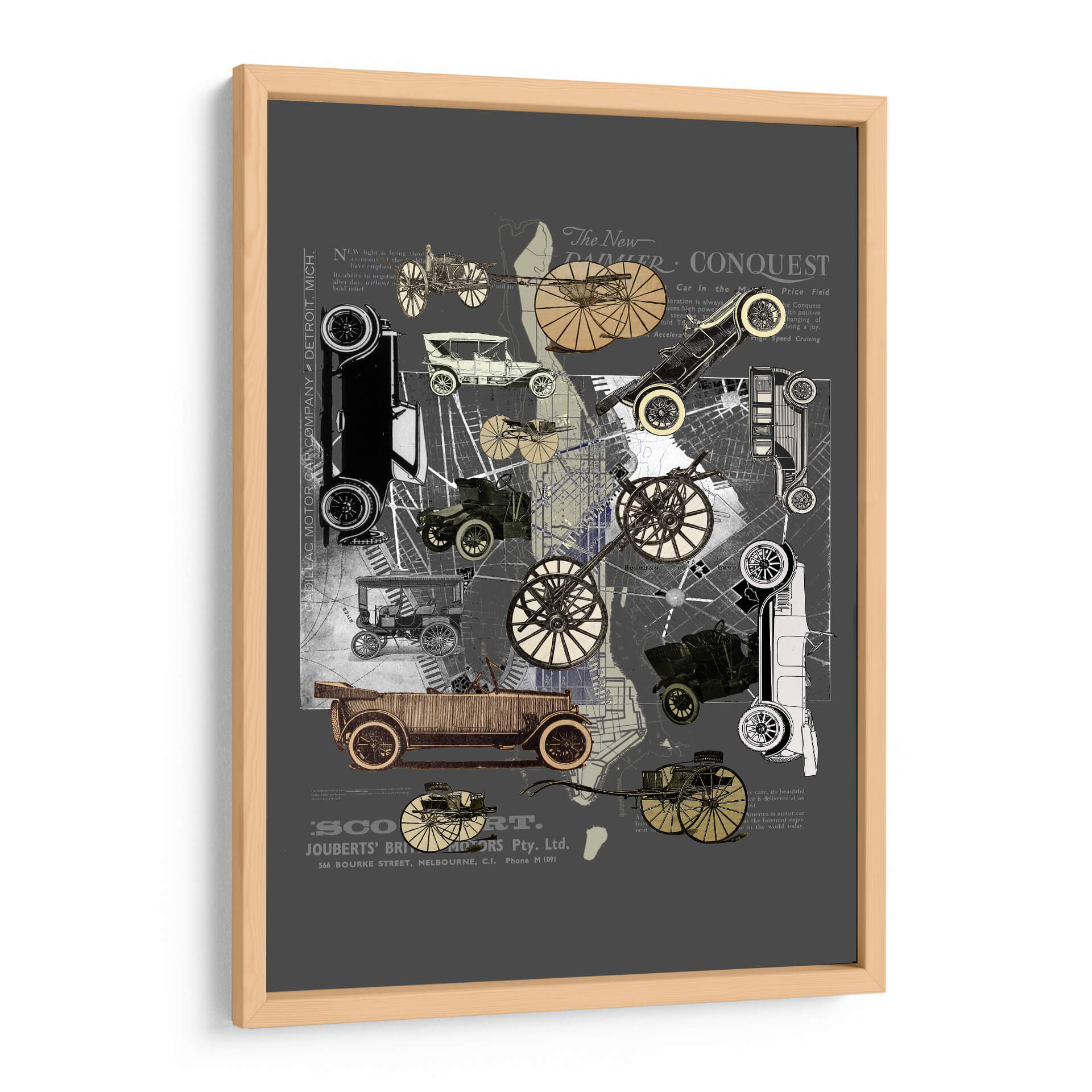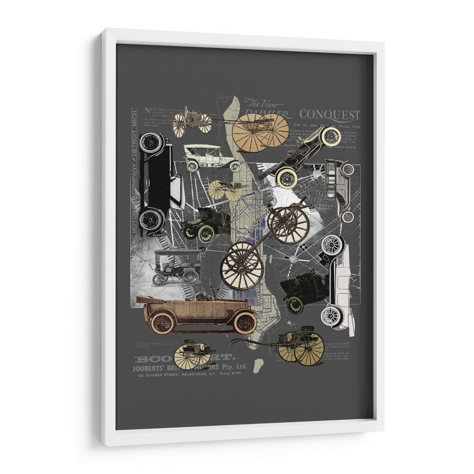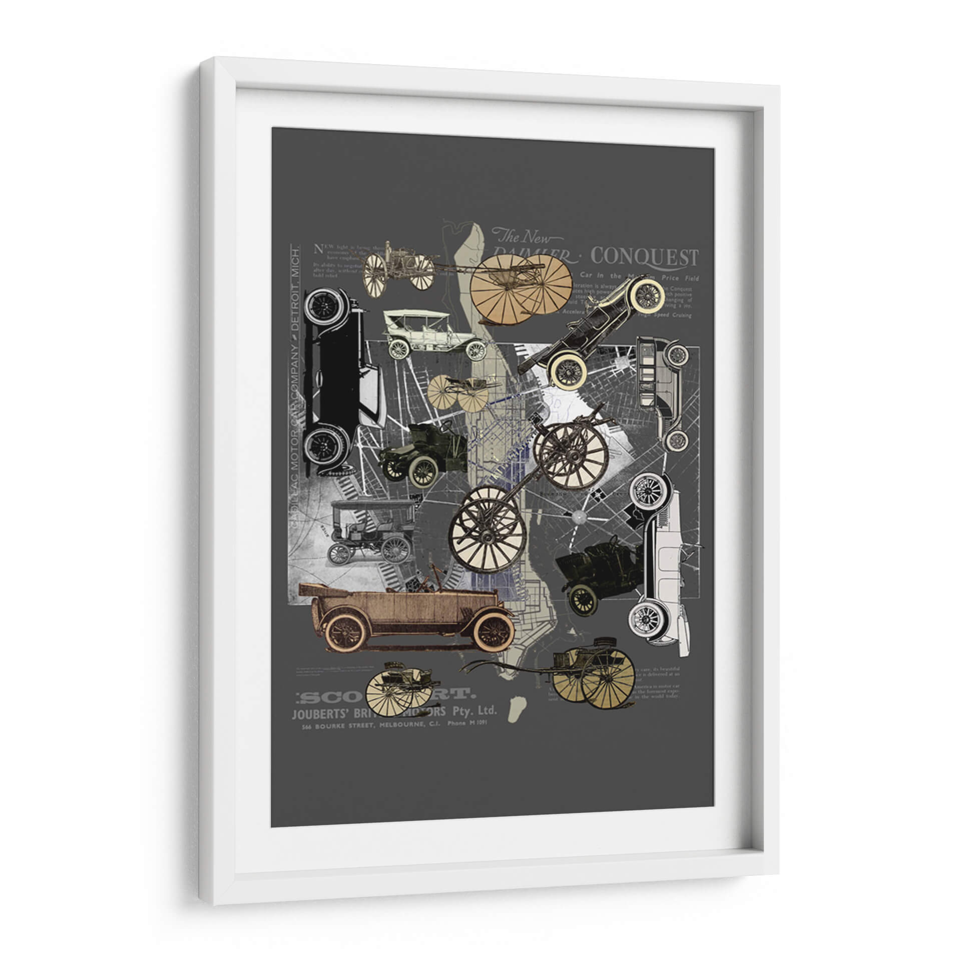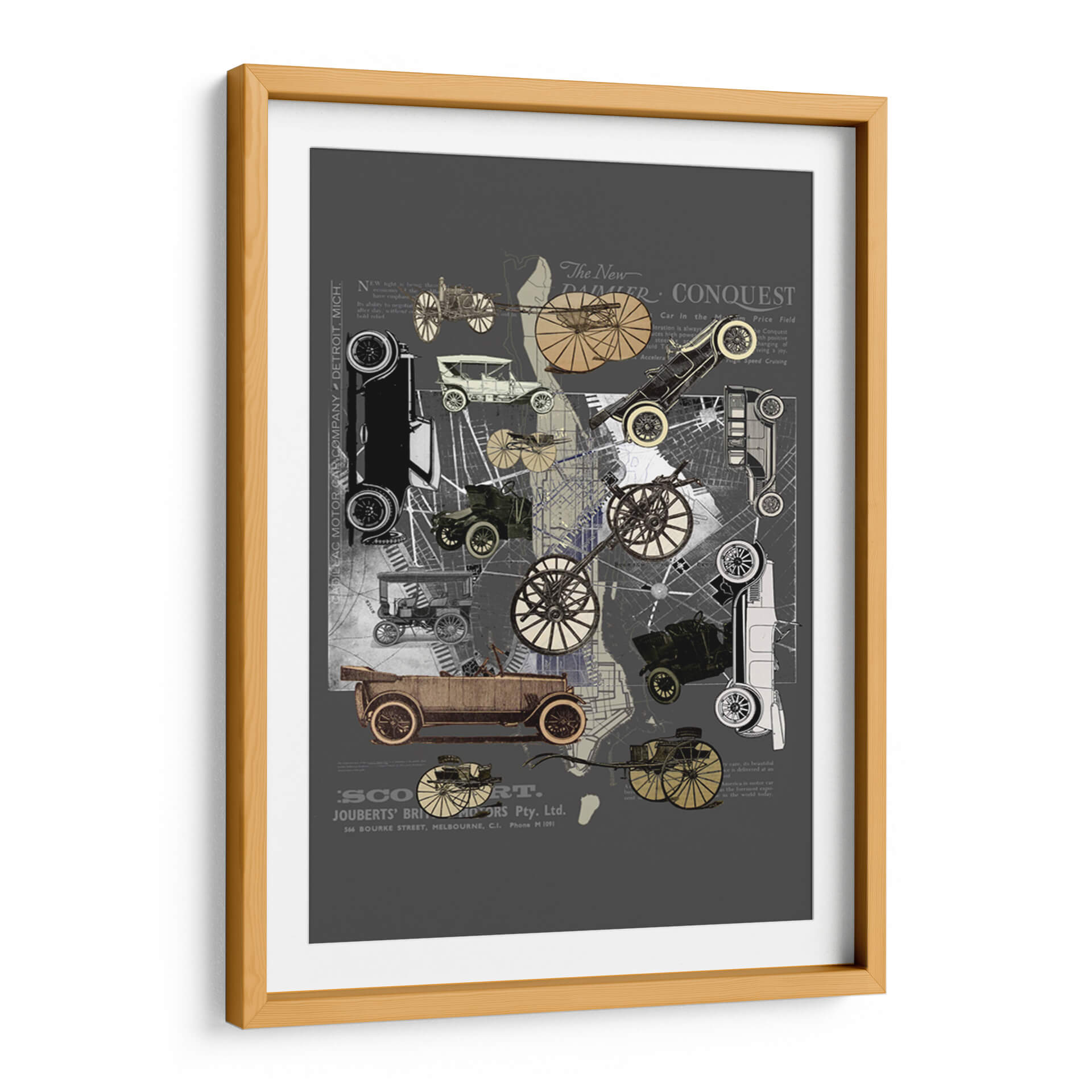 Sumérgete en la nostalgia y el encanto de una era pasada con este cautivador cuadro decorativo 'Vehículos de Nueva York' de Pawel Pacholec. La obra presenta un collage artístico que entrelaza imágenes de automóviles clásicos de principios del siglo XX, mapas urbanos y fragmentos de texto antiguo, creando una composición dinámica y llena de detalles. La paleta de colores, dominada por tonos grises, sepia y acentos dorados, evoca una sensación de autenticidad histórica y sofisticación. El estilo, que combina elementos de collage, vintage y gráfico, es perfecto para quienes aprecian el diseño retro y la historia del transporte. Este cuadro decorativo es ideal para añadir un toque de carácter único a cualquier espacio, desde una sala de estar moderna hasta una oficina con inspiración industrial o un estudio. Su temática sobre la evolución de la movilidad urbana y el diseño automotriz atraerá a entusiastas de los coches clásicos y amantes del arte con un gusto por lo nostálgico. Transforma tu pared en una ventana al pasado con esta pieza evocadora y estilizada, un verdadero homenaje a la ingeniería y la estética de antaño.