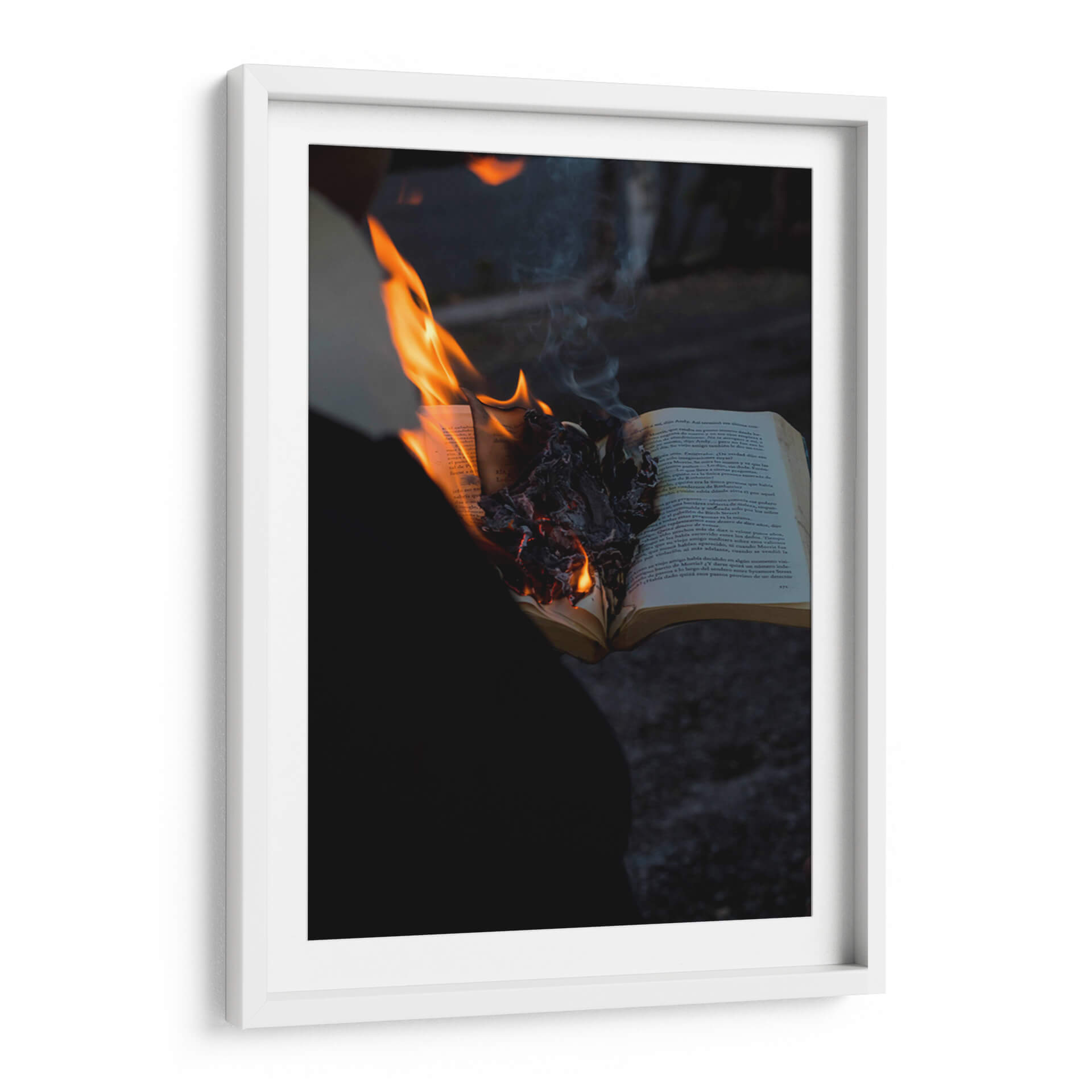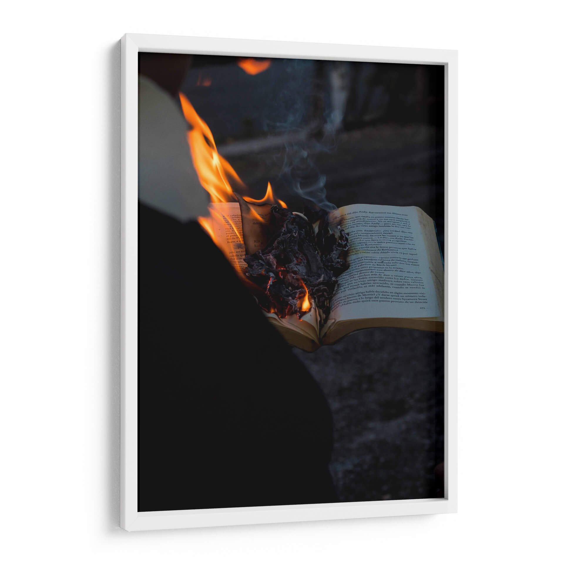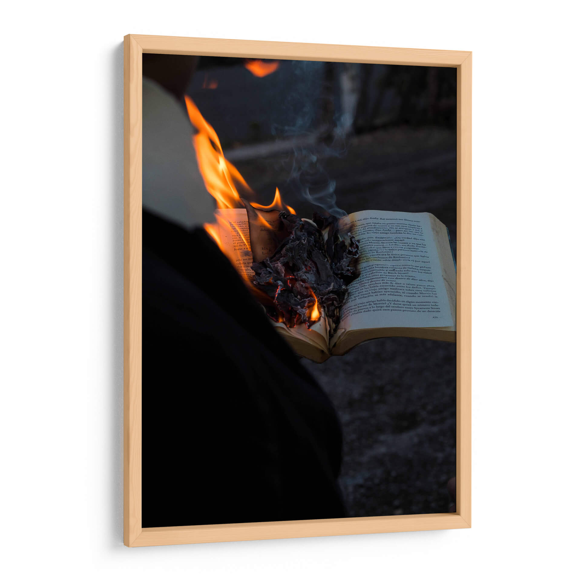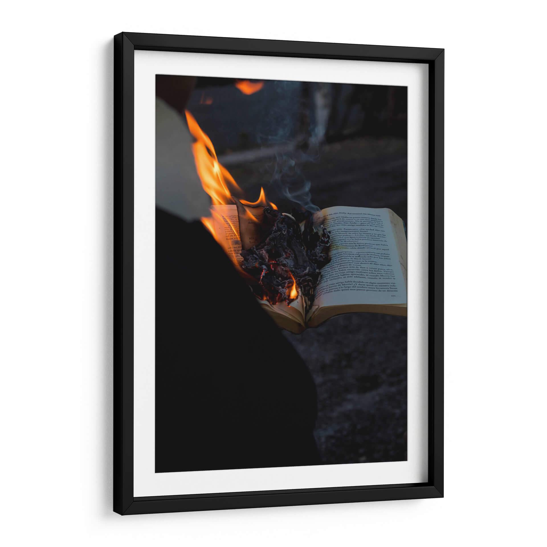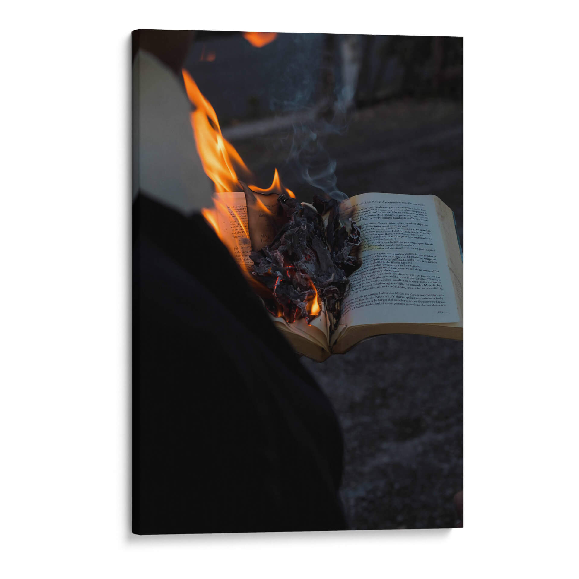 Sumérgete en la intensidad y el simbolismo de "Verdad", una obra de arte contemporáneo del artista Wara-Wara. Esta impactante pieza captura el momento dramático en que un libro se consume en llamas, con lenguas de fuego anaranjadas y amarillas danzando sobre sus páginas y un humo denso ascendiendo en espiral. La paleta de colores se centra en los tonos cálidos y vibrantes del fuego, contrastando con el negro profundo del fondo y la vestimenta, creando una atmósfera de poder y transformación. El estilo fotográfico y el enfoque en el detalle, como las letras legibles en las páginas aún intactas, otorgan a la obra una cualidad casi tangible y provocan una profunda reflexión. "Verdad" es ideal para espacios que buscan un punto focal audaz y un tema de conversación intrigante, como una sala de estar moderna, un estudio o una oficina vanguardista. Este cuadro decorativo invita a cuestionar el conocimiento, la destrucción y la revelación, aportando una dimensión conceptual única a tu decoración. Descubre la fuerza visual y el mensaje enigmático de esta pieza que transformará cualquier pared en un lienzo de ideas.