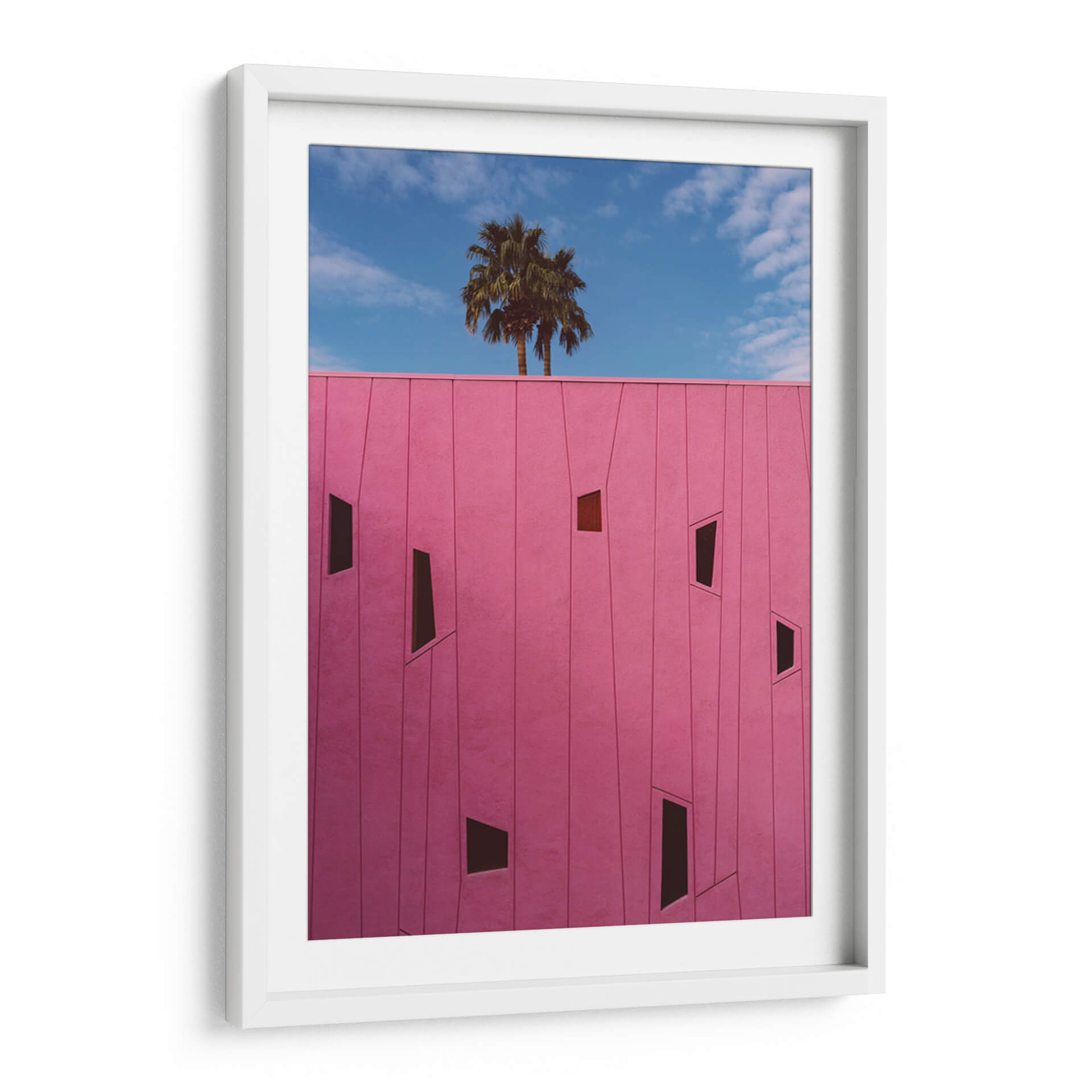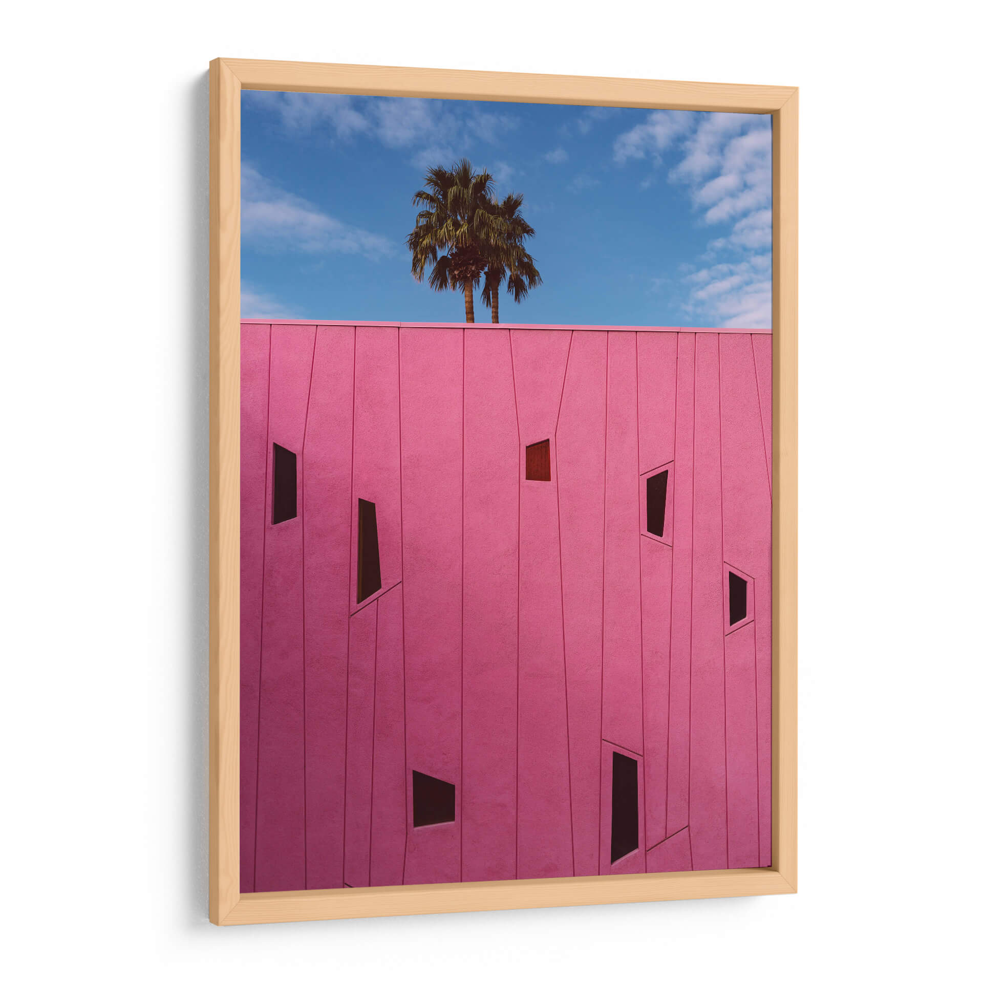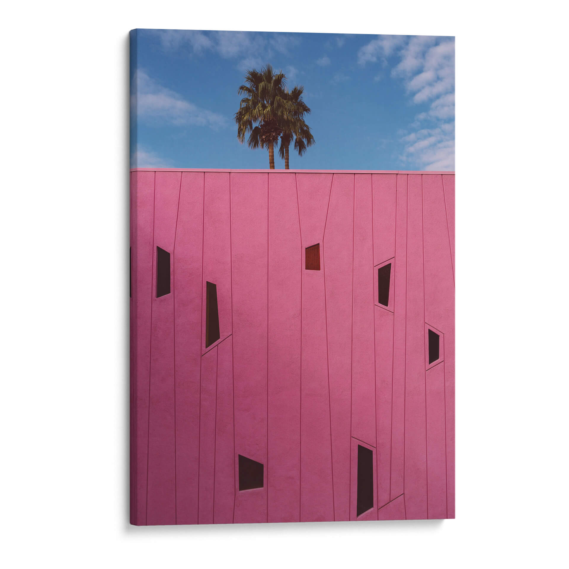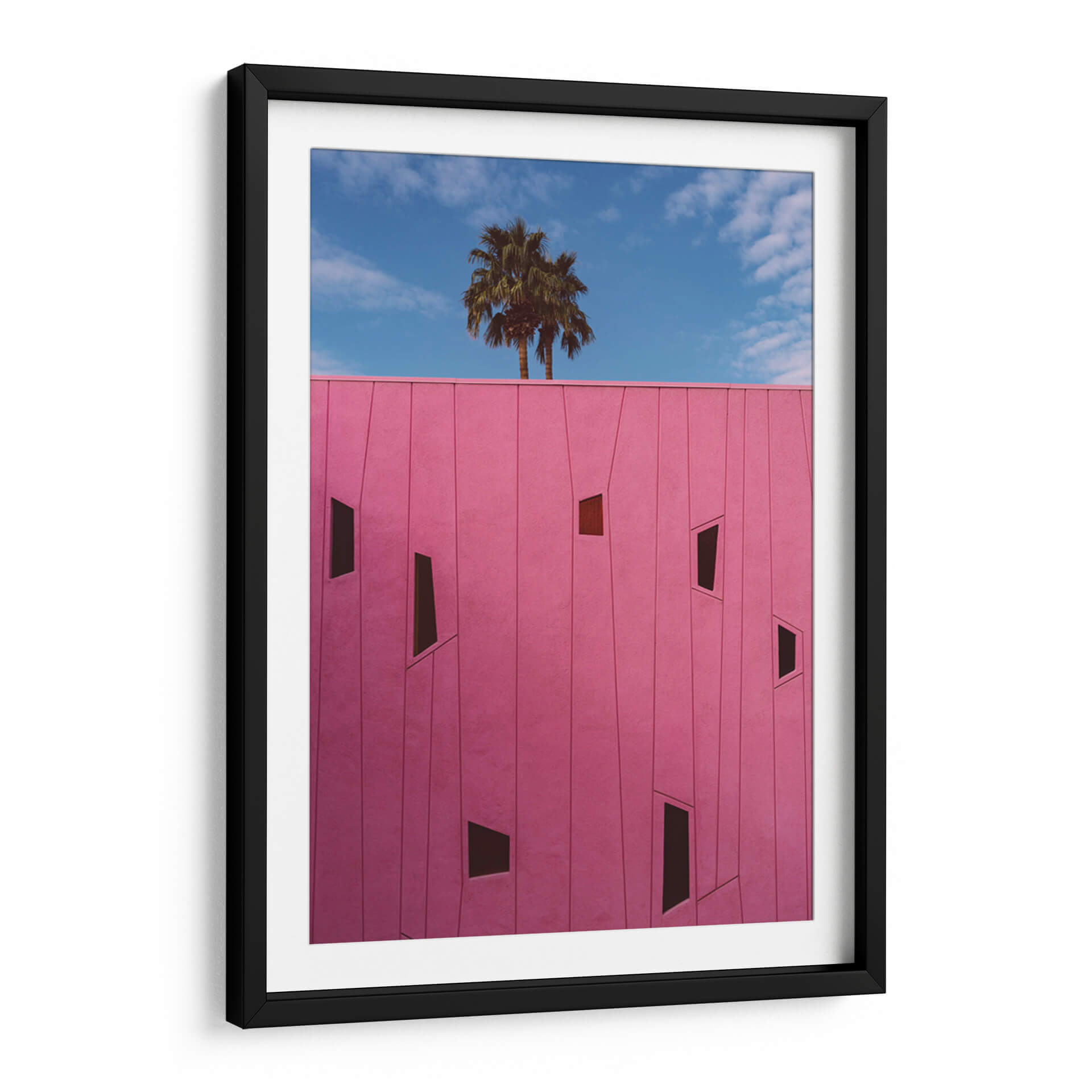 Sumérgete en la vibrante atmósfera de Palm Springs con 'Vibras de Palm Springs III', una obra de arte que captura la esencia del modernismo californiano. Esta pieza destaca por su audaz paleta de colores, dominada por un vibrante rosa fucsia que reviste una estructura arquitectónica geométrica. La fachada, con sus líneas verticales y aberturas irregulares en tonos oscuros, crea un juego de luces y sombras que añade profundidad y misterio. Sobre esta superficie texturizada, se alza una pareja de palmeras icónicas, sus siluetas verdes recortándose contra un cielo azul intenso salpicado de nubes algodonosas. La composición minimalista, pero impactante, evoca una sensación de calma vacacional y un estilo de vida sofisticado. Ideal para añadir un toque de color y carácter a salones modernos, estudios o espacios exteriores que busquen reflejar un espíritu contemporáneo y una estética playera chic. Este cuadro decorativo es una invitación a evocar el sol, la brisa cálida y el encanto único de Palm Springs en tu propio hogar, transformando cualquier pared en un lienzo de inspiración y estilo.