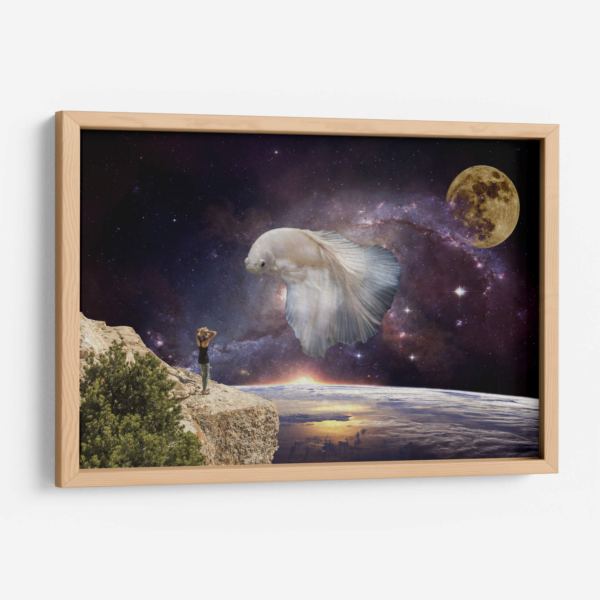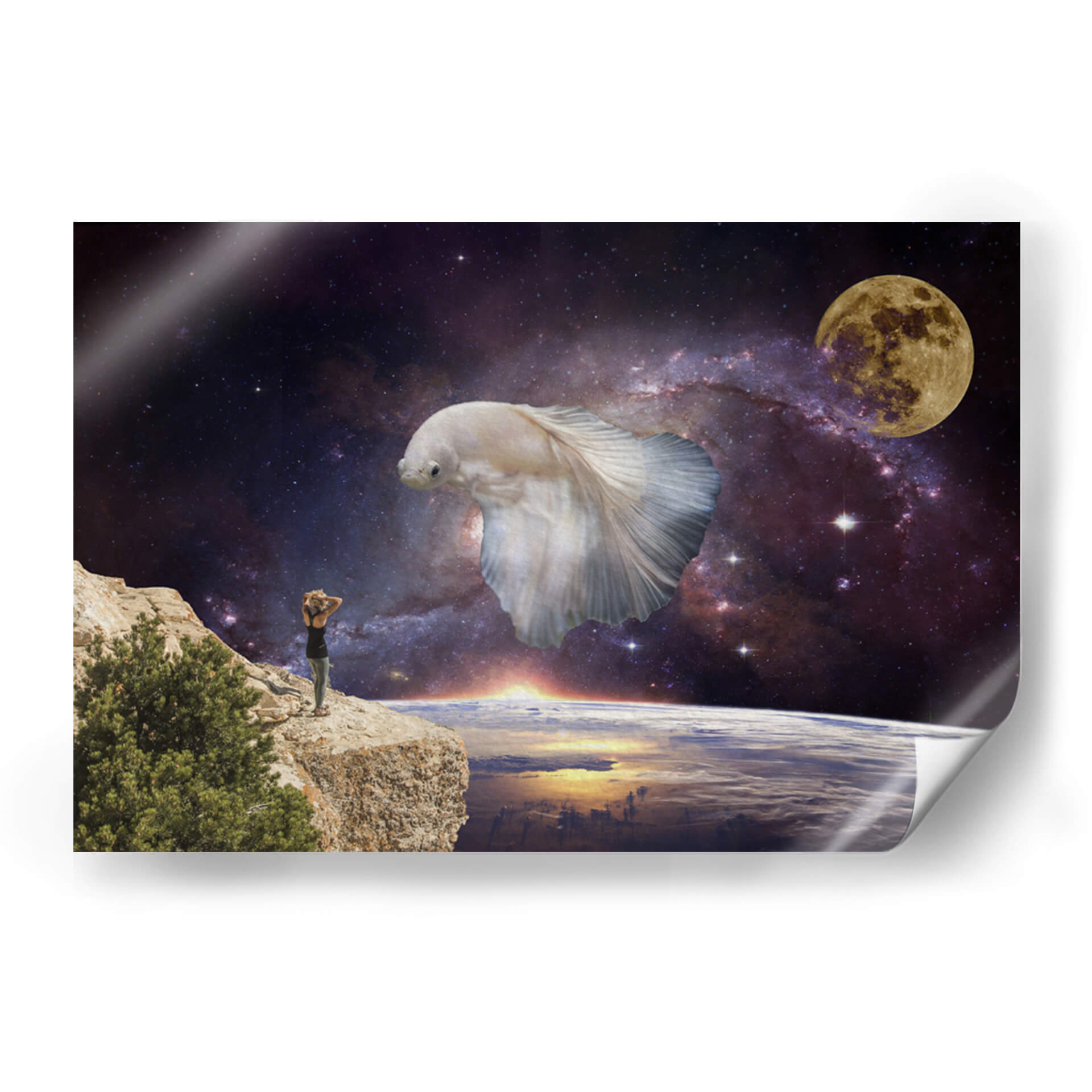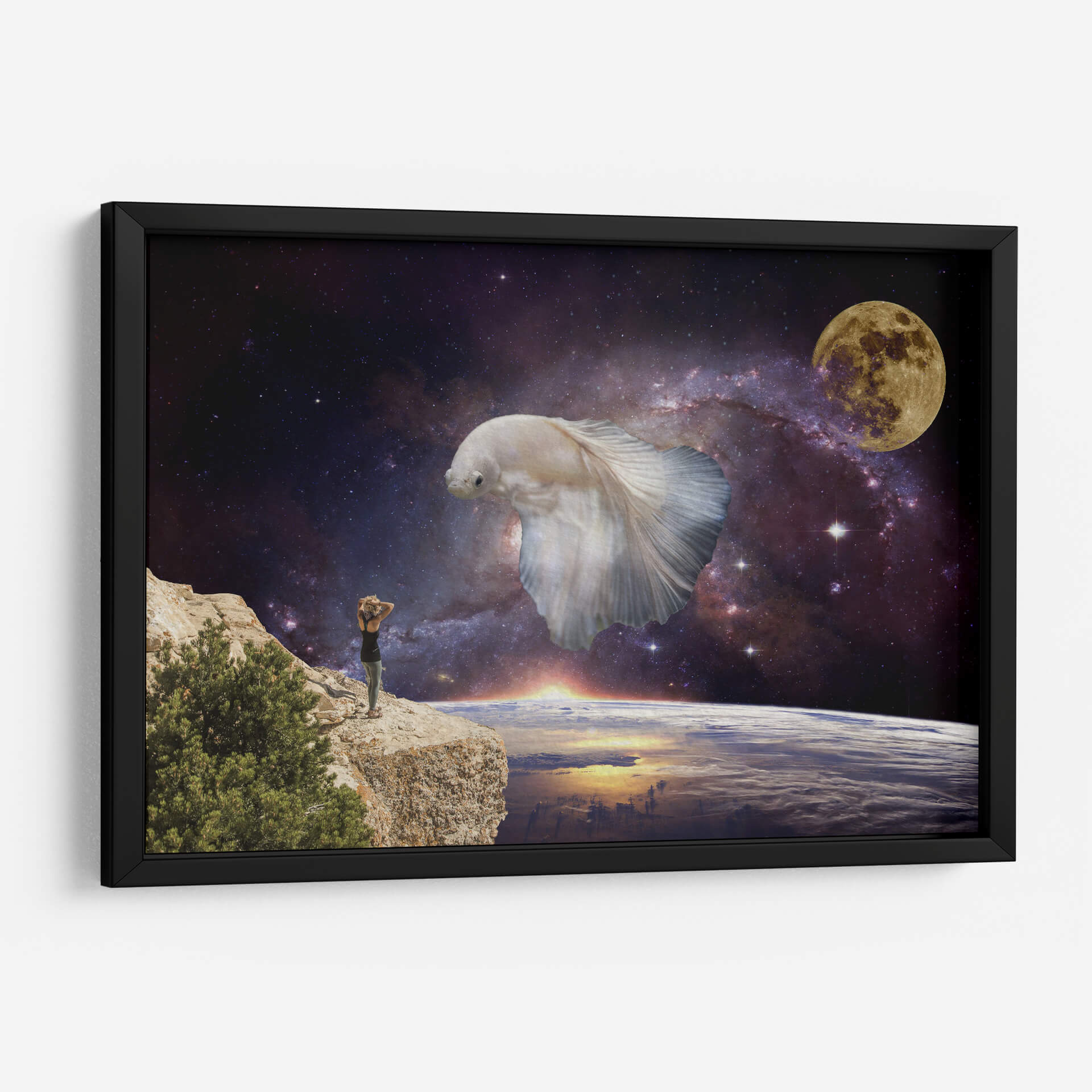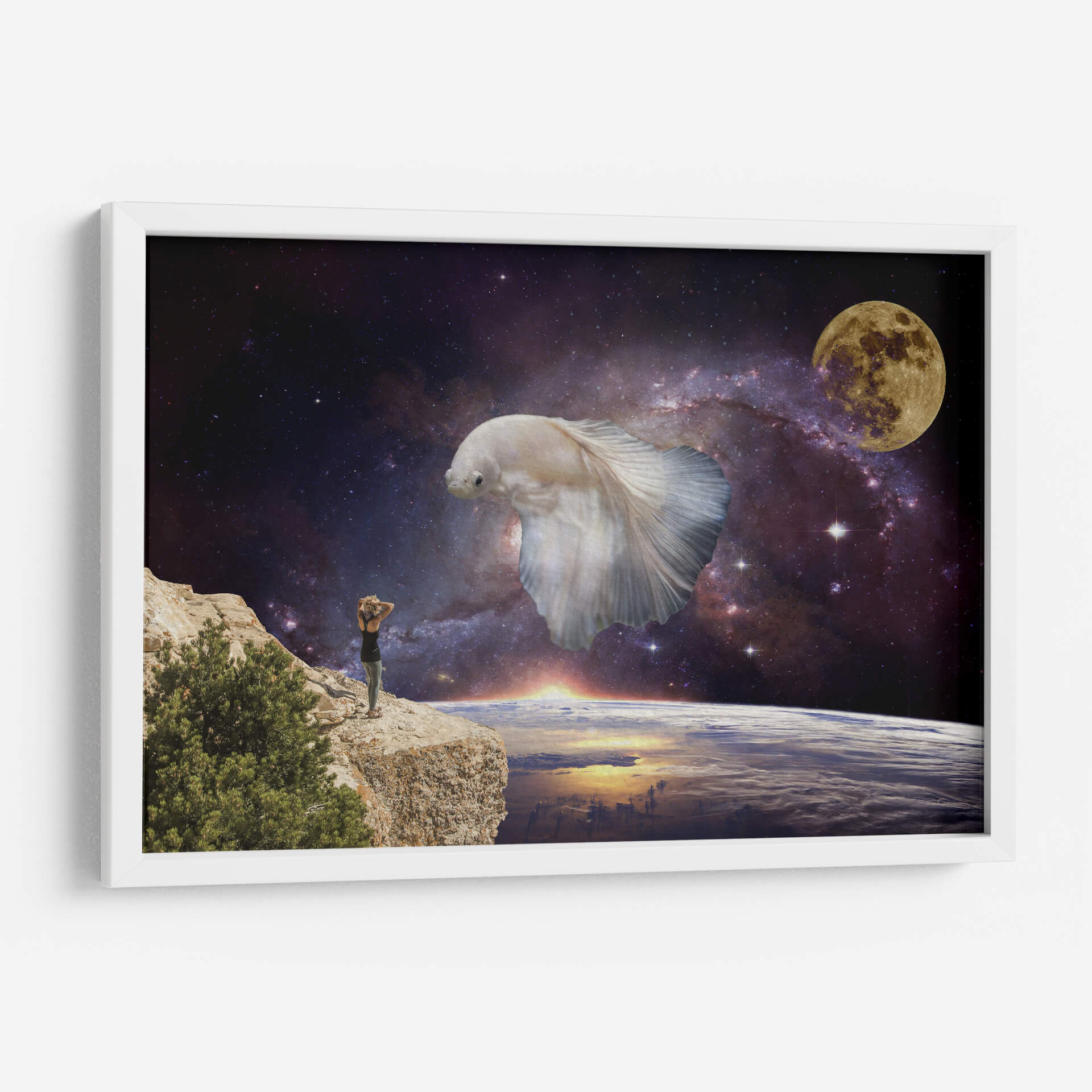 Sumérgete en la inmensidad del cosmos con "Visiones", una obra de arte digital que te transporta a un plano de ensueño. Esta pieza única presenta una imponente figura de pez betta blanco flotando majestuosamente en el espacio exterior, rodeado por una nebulosa vibrante y la serena luz de la luna llena. En primer plano, una persona se alza sobre un acantilado rocoso, contemplando la Tierra desde una perspectiva cósmica, con el sol amaneciendo en el horizonte. La paleta de colores, dominada por profundos azules y púrpuras del espacio, contrasta con los tonos cálidos del amanecer y el blanco etéreo del pez, creando una atmósfera de asombro y contemplación. El estilo surrealista y la composición evocadora de "Visiones" la convierten en una elección perfecta para aquellos que buscan una decoración de pared que inspire la imaginación y fomente la reflexión sobre nuestro lugar en el universo. Ideal para salones, estudios u oficinas, este cuadro decorativo añadirá un toque de misterio y maravilla a cualquier espacio moderno.