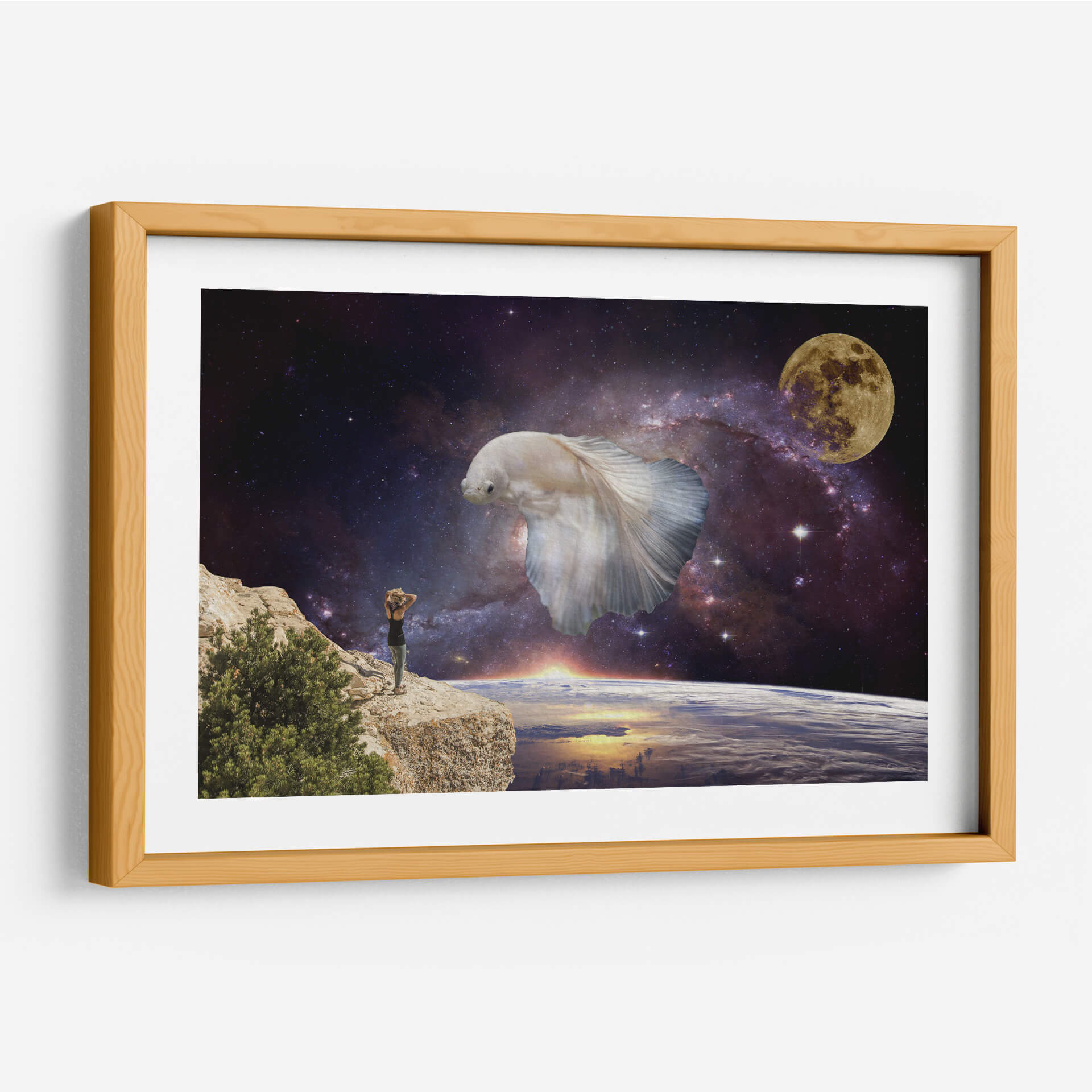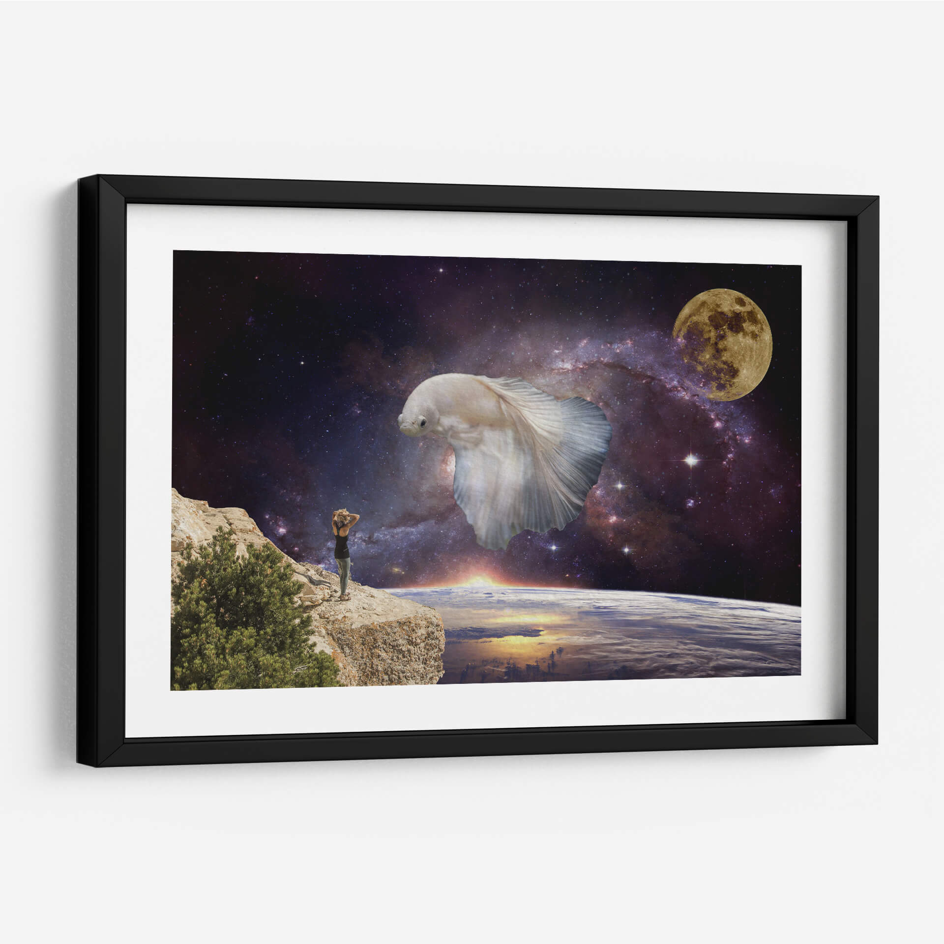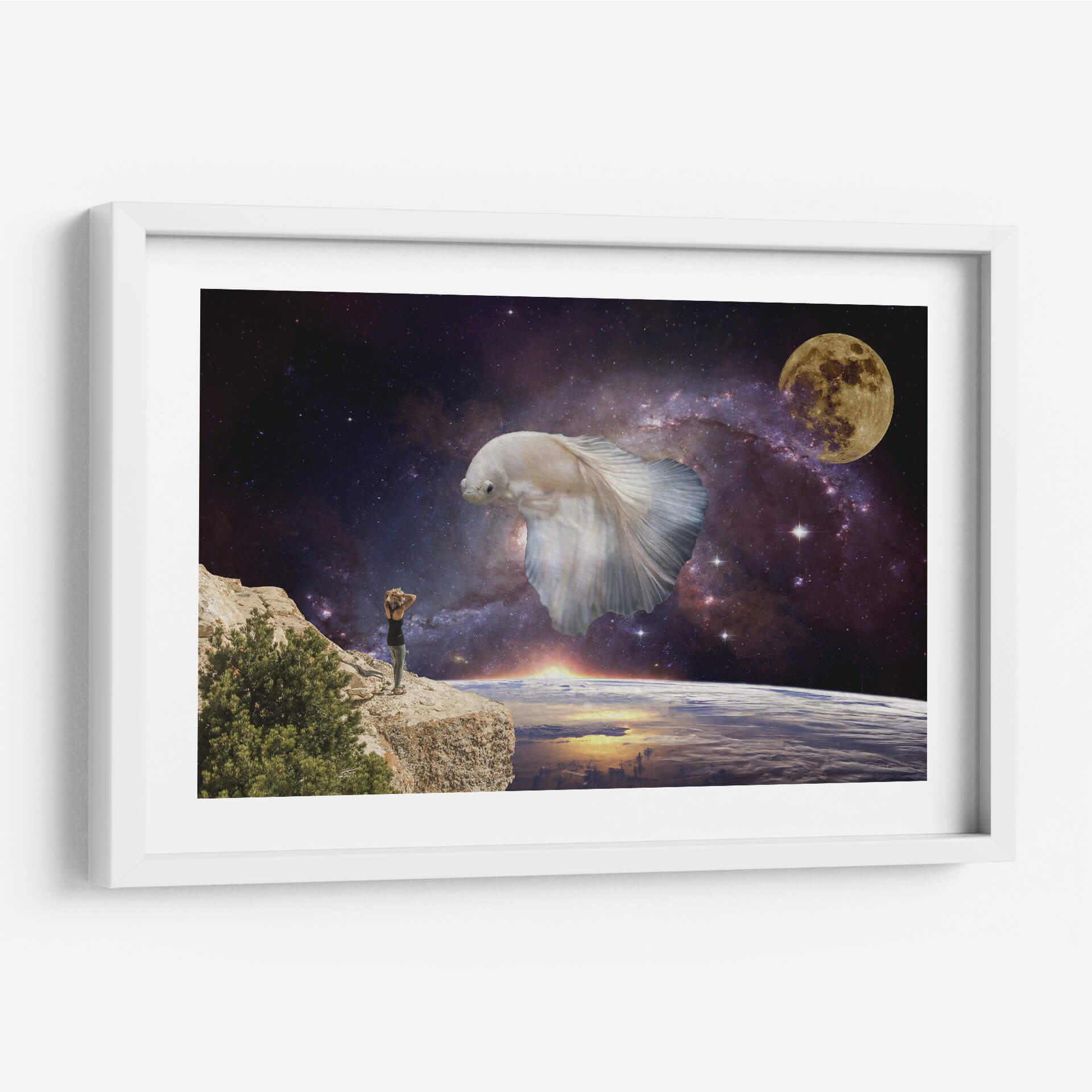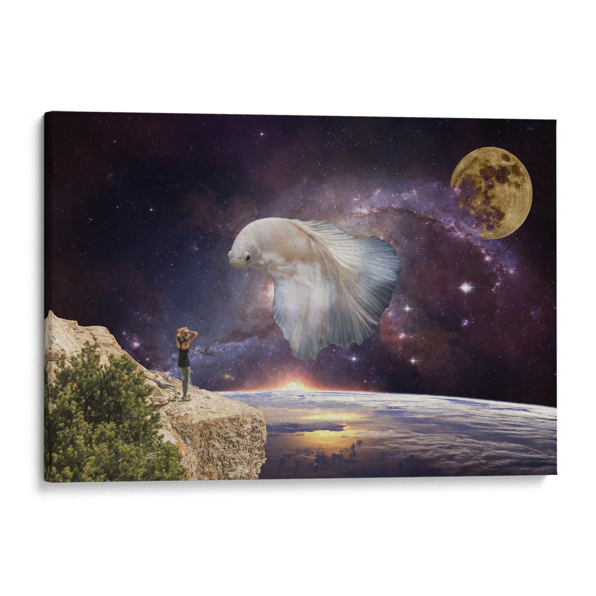 Sumérgete en la inmensidad del cosmos con "Visiones", una obra de arte digital que te transporta a un plano de ensueño. Esta pieza única presenta una imponente figura de pez betta blanco flotando majestuosamente en el espacio exterior, rodeado por una nebulosa vibrante y la serena luz de la luna llena. En primer plano, una persona se alza sobre un acantilado rocoso, contemplando la Tierra desde una perspectiva cósmica, con el sol amaneciendo en el horizonte. La paleta de colores, dominada por profundos azules y púrpuras del espacio, contrasta con los tonos cálidos del amanecer y el blanco etéreo del pez, creando una atmósfera de asombro y contemplación. El estilo surrealista y la composición evocadora de "Visiones" la convierten en una elección perfecta para aquellos que buscan una decoración de pared que inspire la imaginación y fomente la reflexión sobre nuestro lugar en el universo. Ideal para salones, estudios u oficinas, este cuadro decorativo añadirá un toque de misterio y maravilla a cualquier espacio moderno.