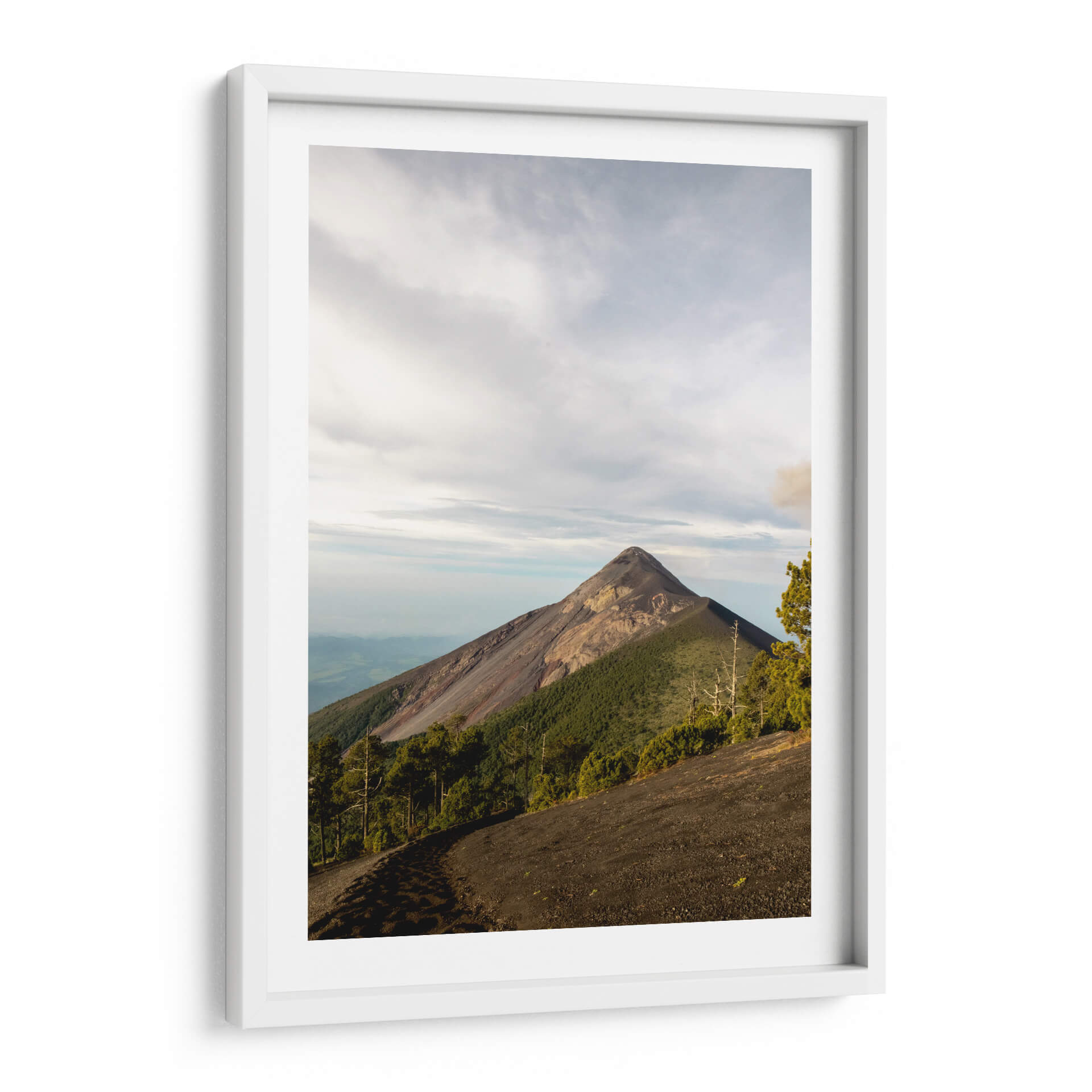 Adéntrate en la majestuosidad de la naturaleza con "Vista al Volcán de Fuego", una obra de arte que captura la imponente presencia de este coloso natural. El cuadro decorativo presenta una perspectiva que asciende por las faldas del volcán, revelando su cono perfecto y la tierra volcánica que lo rodea. La paleta de colores, dominada por tonos tierra, verdes profundos del follaje y grises del cielo nublado, crea una atmósfera de serenidad y poder primigenio. La composición, que incluye un camino serpenteante en primer plano y árboles robustos que flanquean la escena, guía la mirada hacia la majestuosidad del volcán, invitando a la contemplación. Esta pieza es ideal para añadir un toque de drama y conexión con la tierra a salones modernos, estudios o espacios que busquen evocar una sensación de aventura y asombro. El arte de Luis Martínez transmite una profunda admiración por los paisajes volcánicos, ofreciendo una ventana a la fuerza y belleza indomable del planeta. Un cuadro decorativo perfecto para amantes de la naturaleza, la fotografía de paisajes y el arte que inspira.