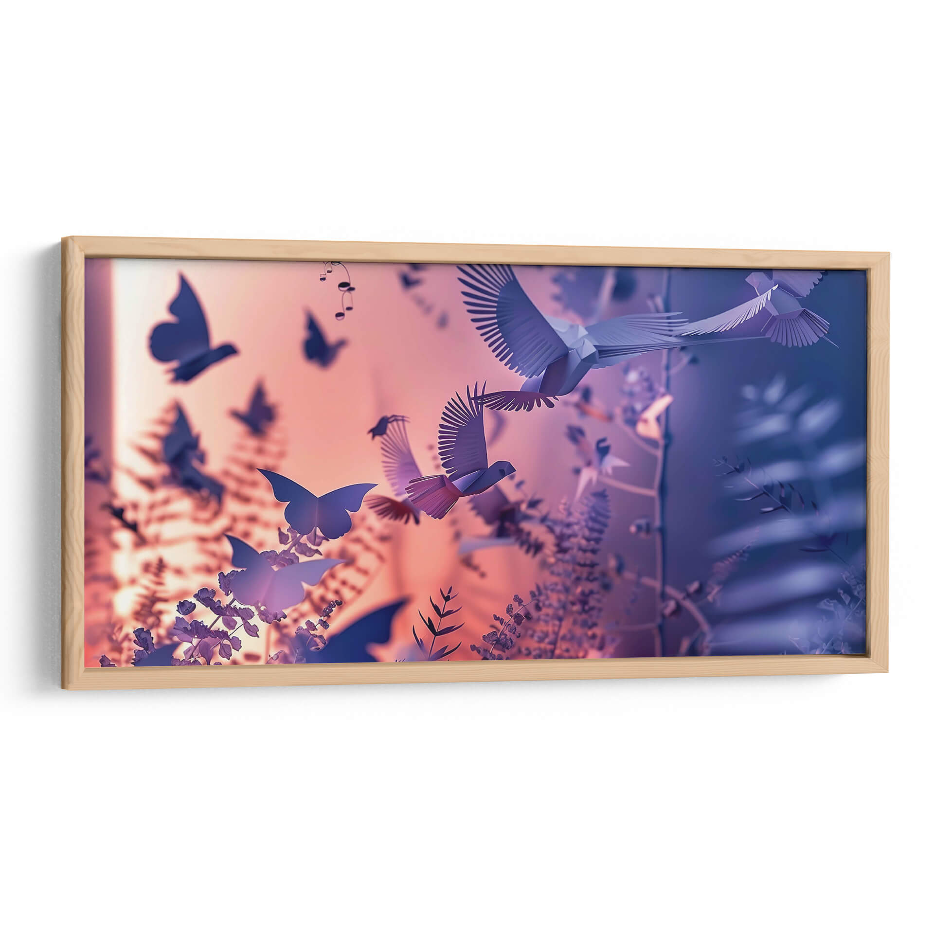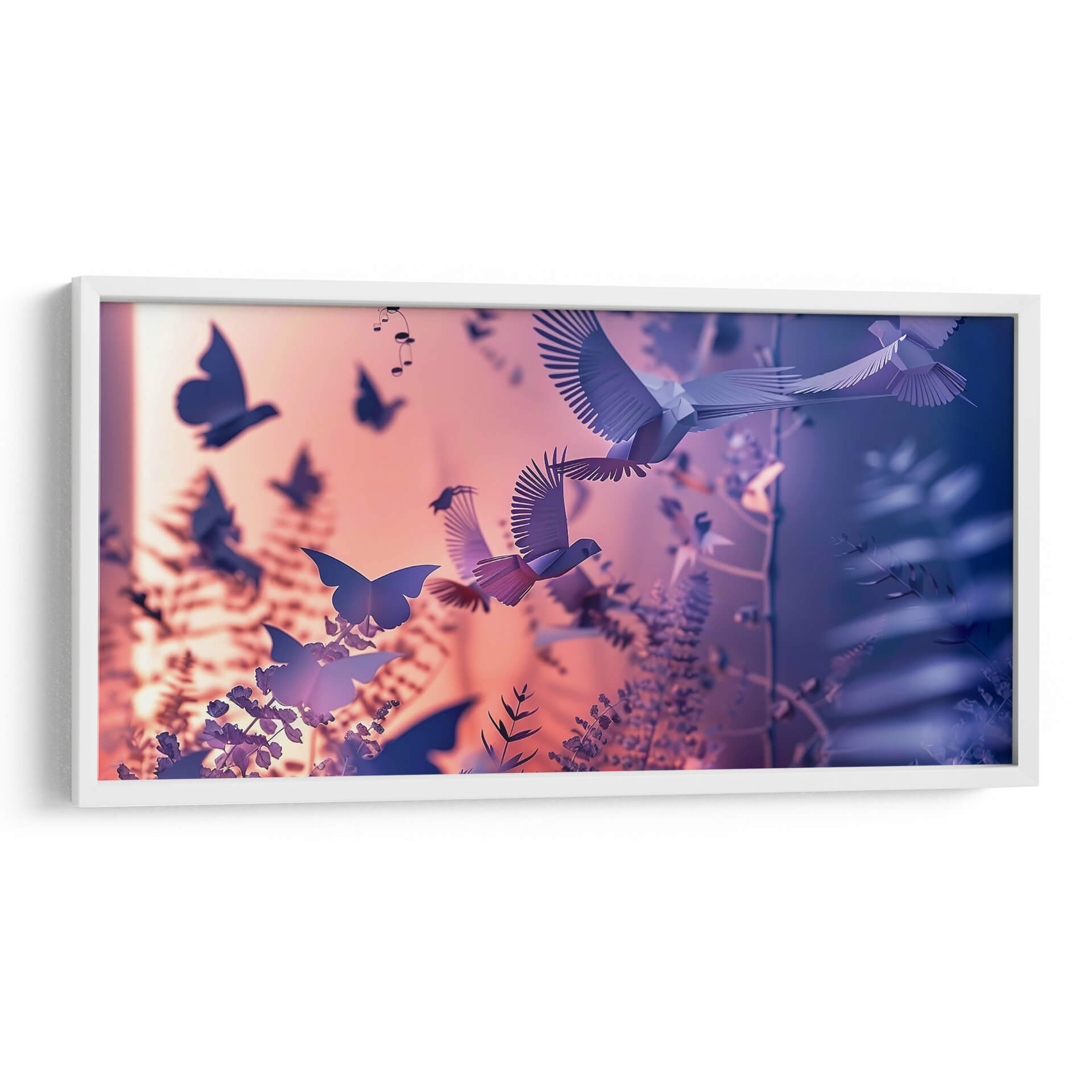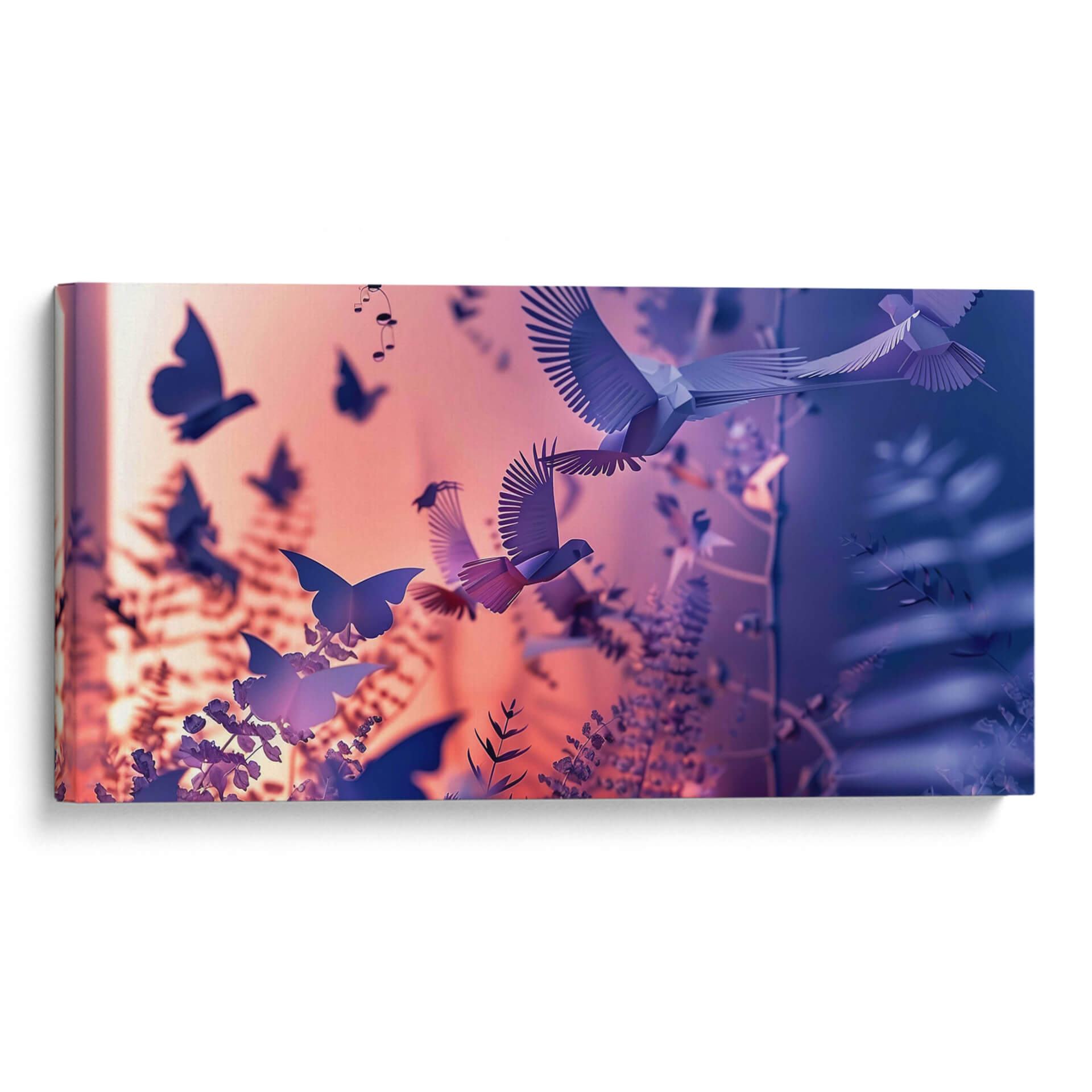 Embárquese en un viaje onírico con "Volando en un Sueño", una cautivadora obra de arte digital de Cecilia Flores. Esta pieza evoca una sensación de libertad y trascendencia, presentando siluetas de pájaros y mariposas en pleno vuelo a través de un paisaje etéreo. Los colores vibrantes y degradados, que transitan entre cálidos tonos anaranjados y profundos azules violáceos, crean una atmósfera mágica y serena. La composición dinámica, con las figuras suspendidas en un espacio sugerente, invita a la contemplación y la introspección. Es el cuadro decorativo perfecto para añadir un toque de fantasía y calma a su dormitorio, un rincón de lectura o incluso una oficina que busque inspirar la creatividad. "Volando en un Sueño" no es solo una decoración de pared, sino una ventana a un mundo de posibilidades ilimitadas, ideal para quienes buscan piezas de arte contemporáneo que hablen directamente al alma y transformen cualquier espacio en un santuario personal.
