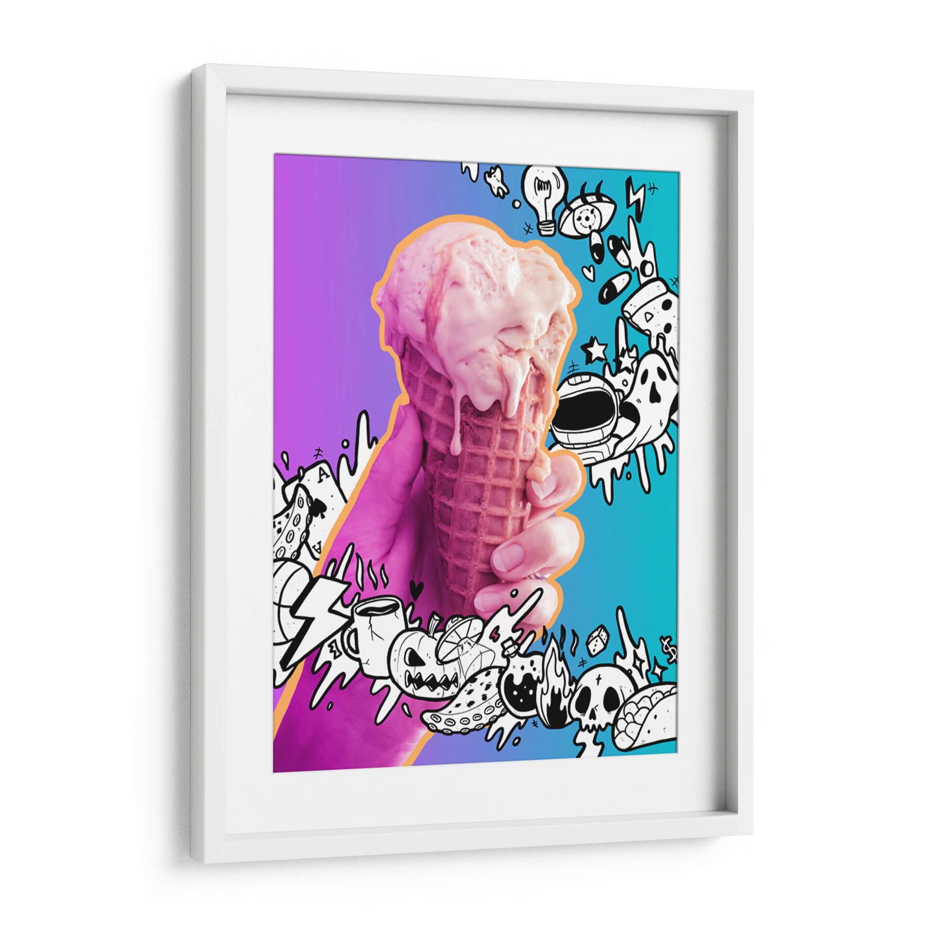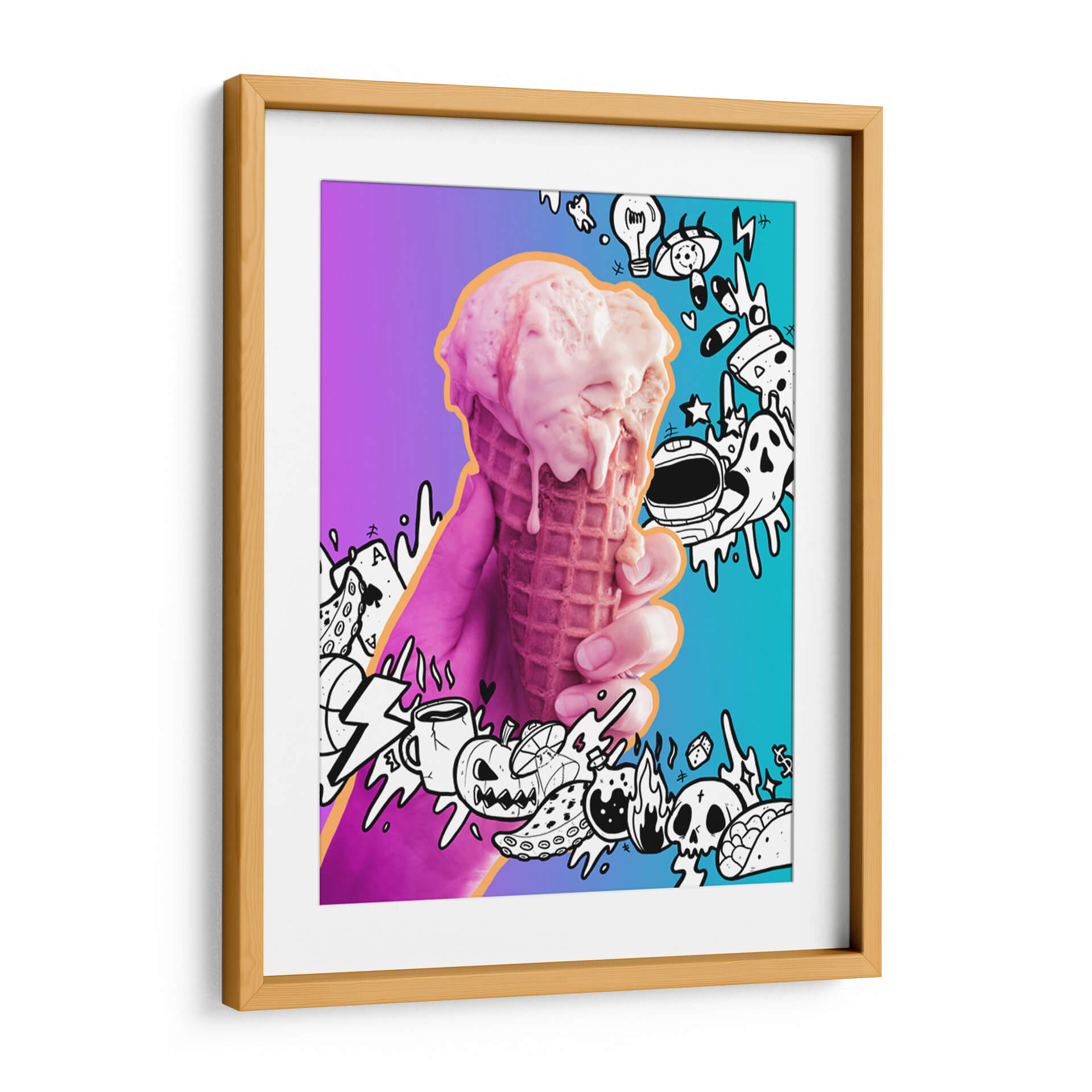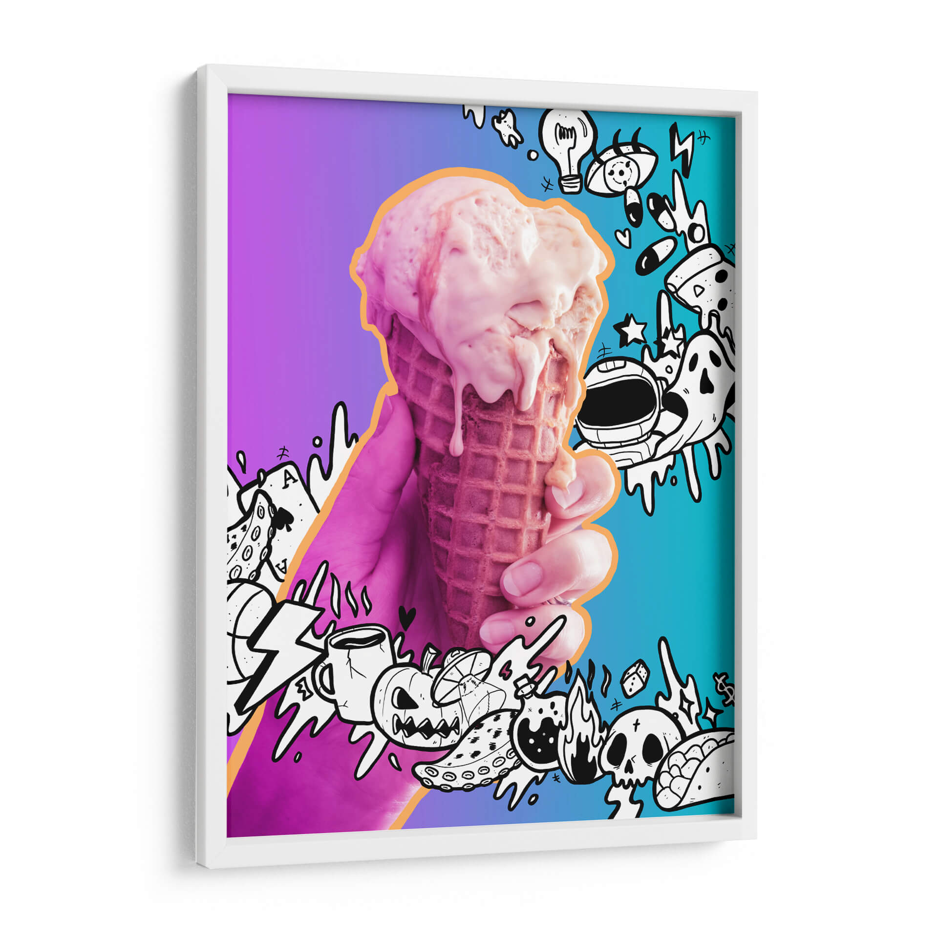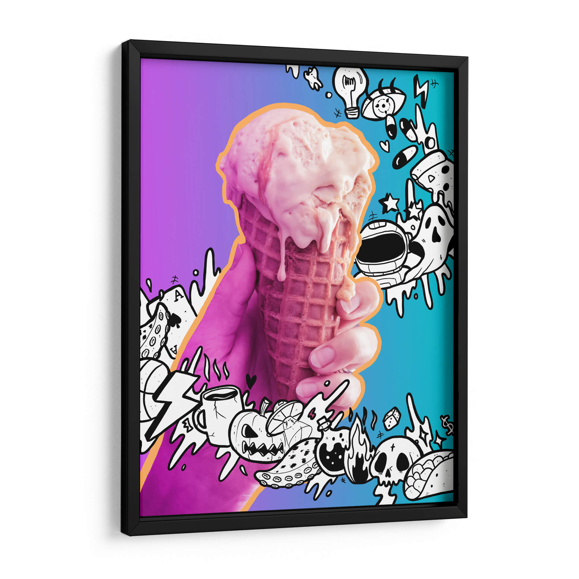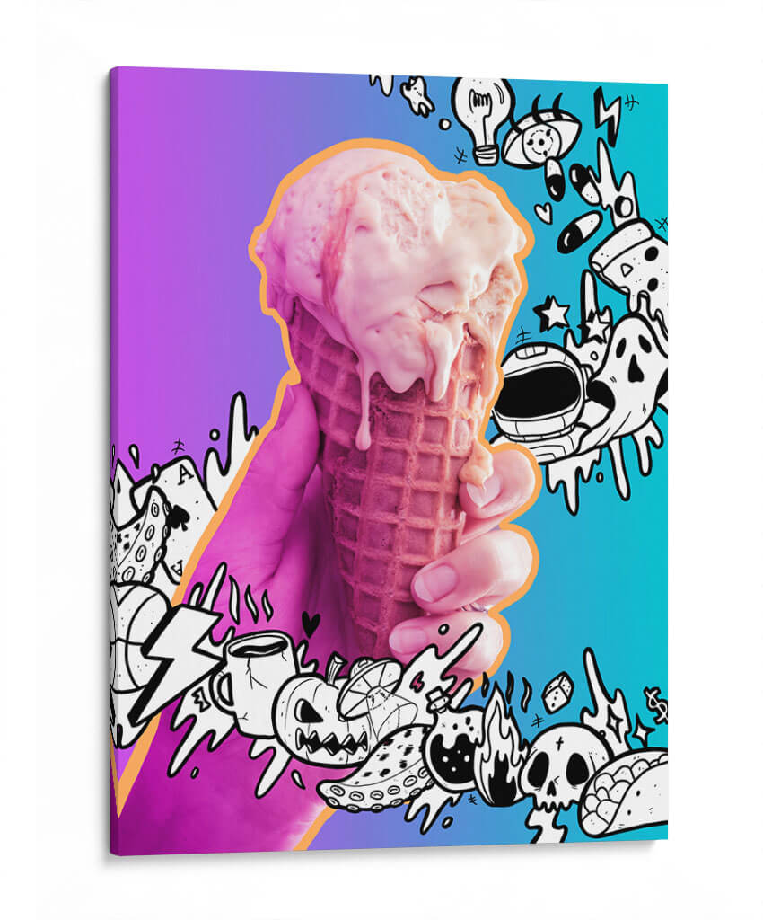 Sumérgete en el mundo lúdico y vibrante de 'Doodle Ice Cream', una obra de arte contemporáneo que captura la esencia de la diversión y el antojo. Esta pieza presenta un primer plano tentador de un helado cremoso derritiéndose en un cono crujiente, sostenido delicadamente por una mano. El fondo se desvanece de un morado intenso a un azul eléctrico, creando un contraste dinámico que realza los elementos gráficos. Alrededor del helado, una explosión de doodles y caricaturas detalladas dan vida a la composición: desde fantasmas juguetones y calaveras con sombreros hasta un astronauta contemplativo, una bombilla que representa una idea brillante, una taza humeante y divertidos iconos como tacos y calabazas de Halloween. El estilo ecléctico y lleno de energía hace de este cuadro decorativo una adición perfecta para espacios que buscan un toque de originalidad y buen humor. Ideal para la sala de estar, una cocina moderna o incluso una oficina, 'Doodle Ice Cream' aporta un aire desenfadado y creativo, invitando a la conversación y a la sonrisas. Su diseño único y la vibrante paleta de colores lo convierten en una pieza que atrae miradas y añade personalidad a cualquier ambiente, celebrando la alegría de los pequeños placeres y la imaginación sin límites.