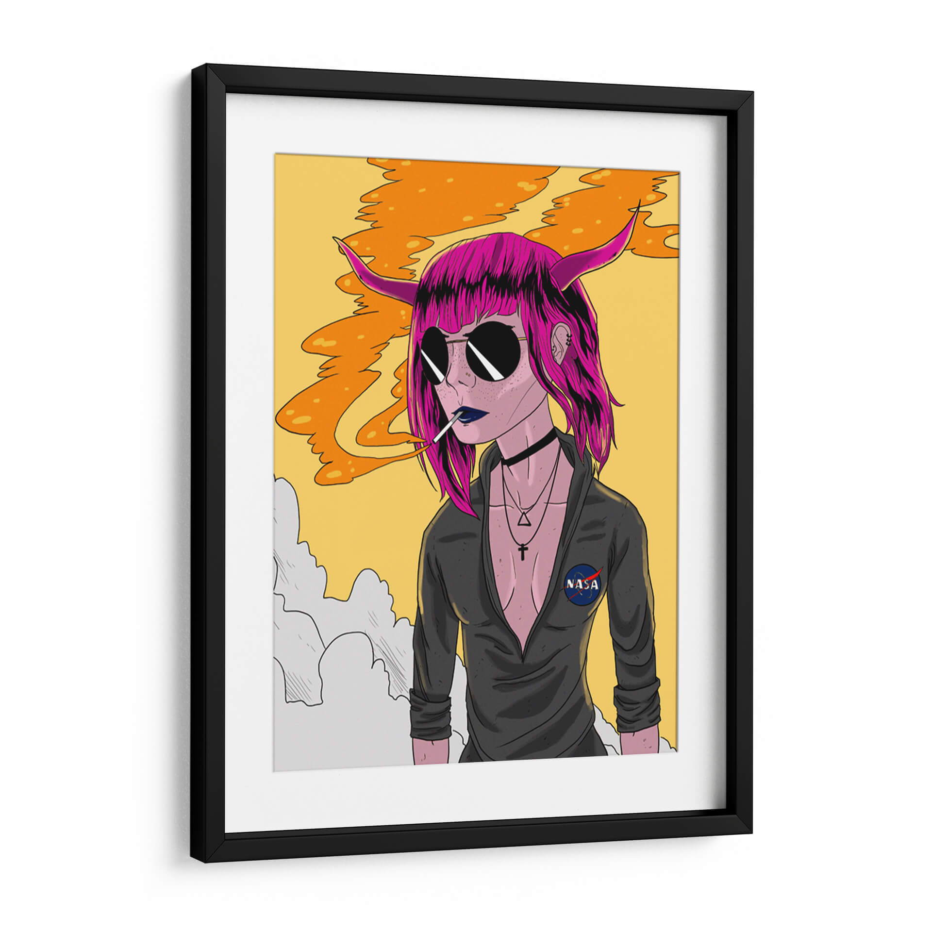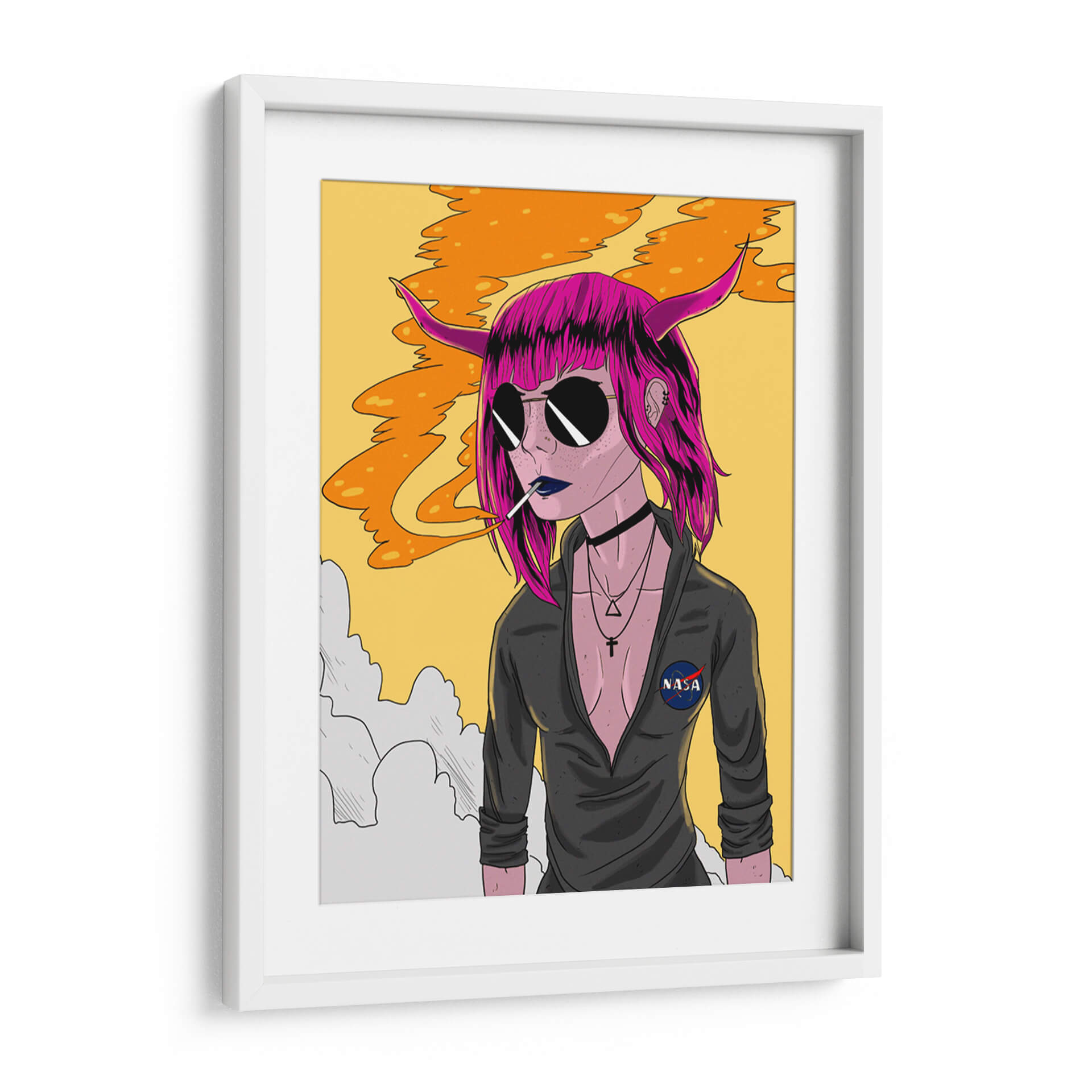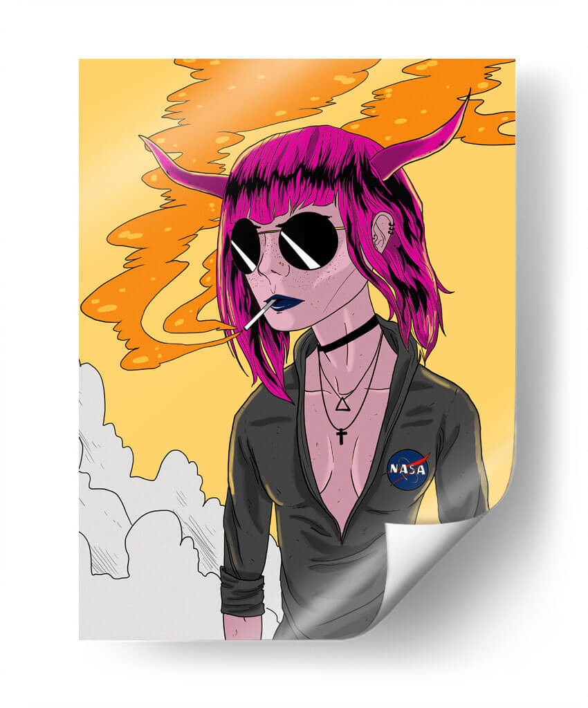 Sumérgete en el enigmático mundo de "Lucid Dream", una obra de arte digital que desafía las convenciones y cautiva la imaginación. Esta pieza, del artista Ash, presenta un retrato intrigante de una figura con cabello vibrante en tonos fucsia, cuernos sutiles y gafas de sol oscuras que ocultan su mirada. La paleta de colores, dominada por un fondo amarillo sol y pinceladas de naranja que evocan humo o energía, crea una atmósfera audaz y un tanto misteriosa. La composición, centrada en el personaje, atrae la atención hacia su expresión enigmática y el detalle de su vestimenta, con un discreto parche de la NASA que añade un toque de intriga moderna. "Lucid Dream" es más que una imagen; es una declaración de estilo y personalidad, perfecta para quienes buscan añadir un toque vanguardista y lleno de carácter a sus espacios. Ideal para salones modernos, estudios creativos u oficinas que buscan inspirar y provocar conversación. Este cuadro decorativo es una invitación a explorar los límites de la percepción y la identidad.