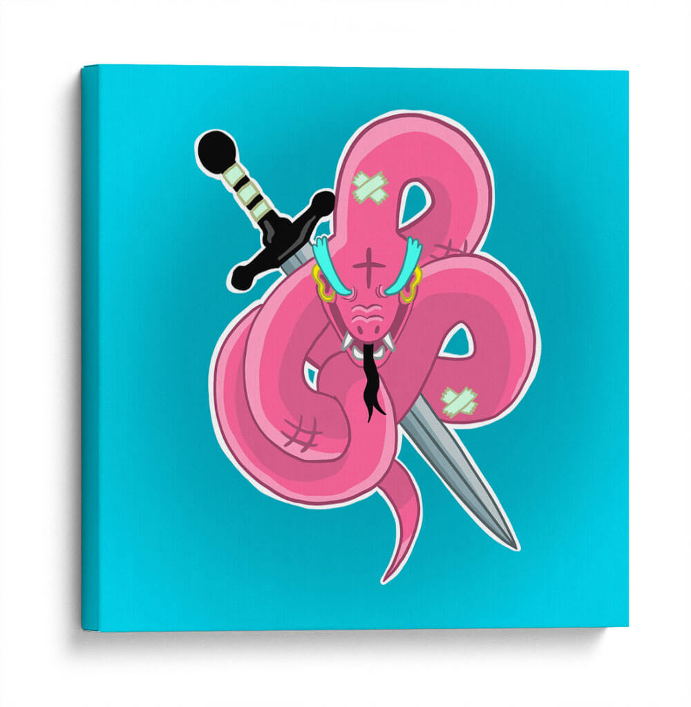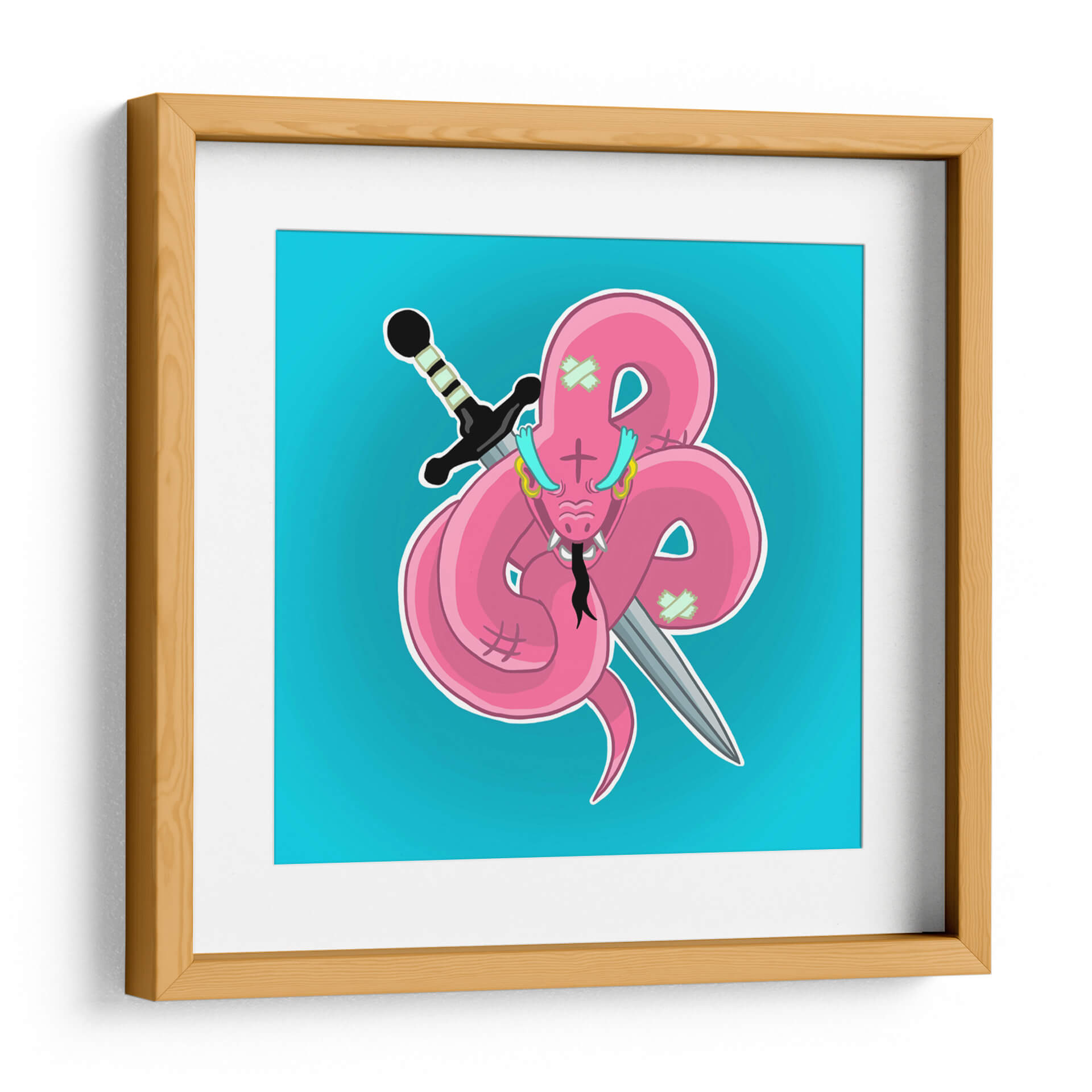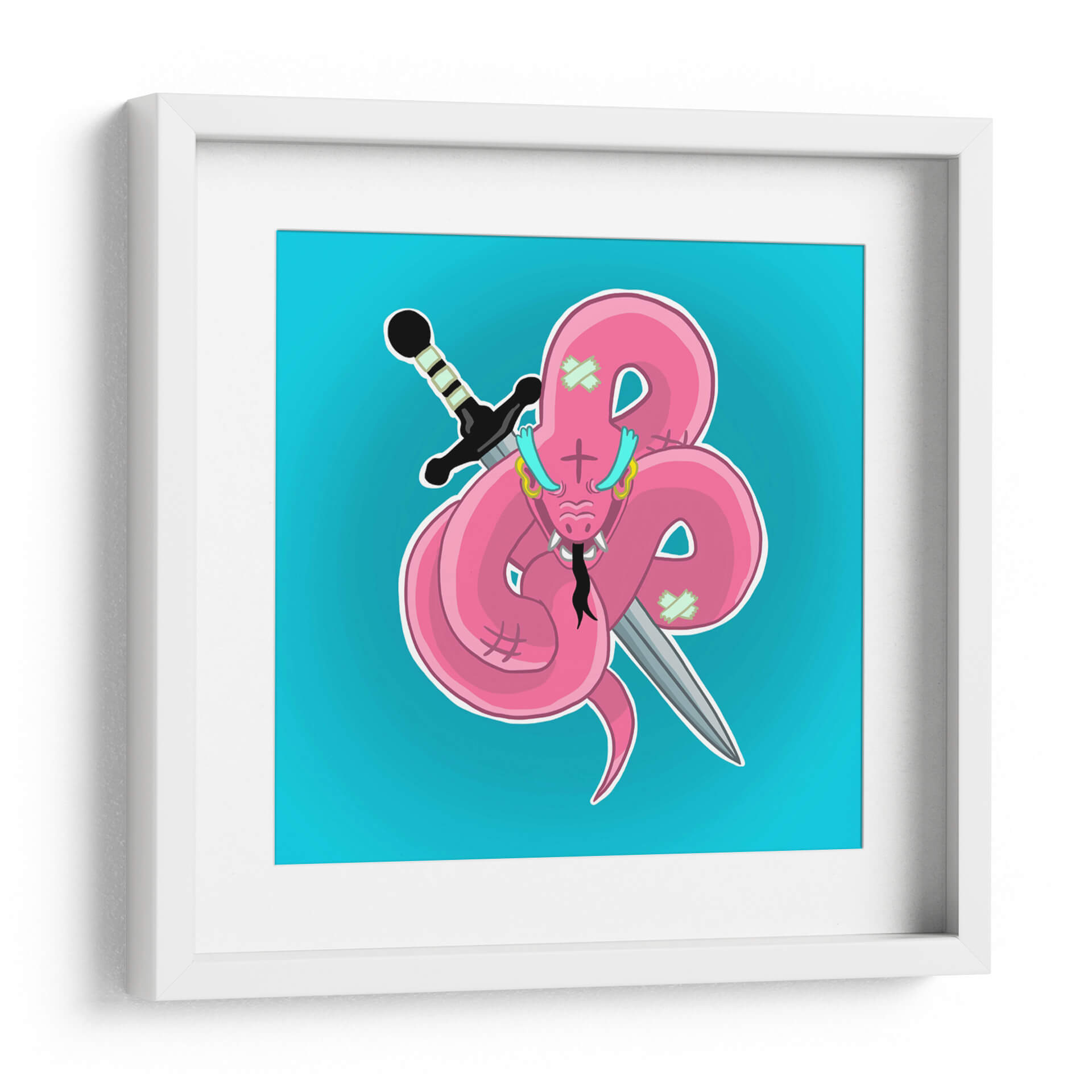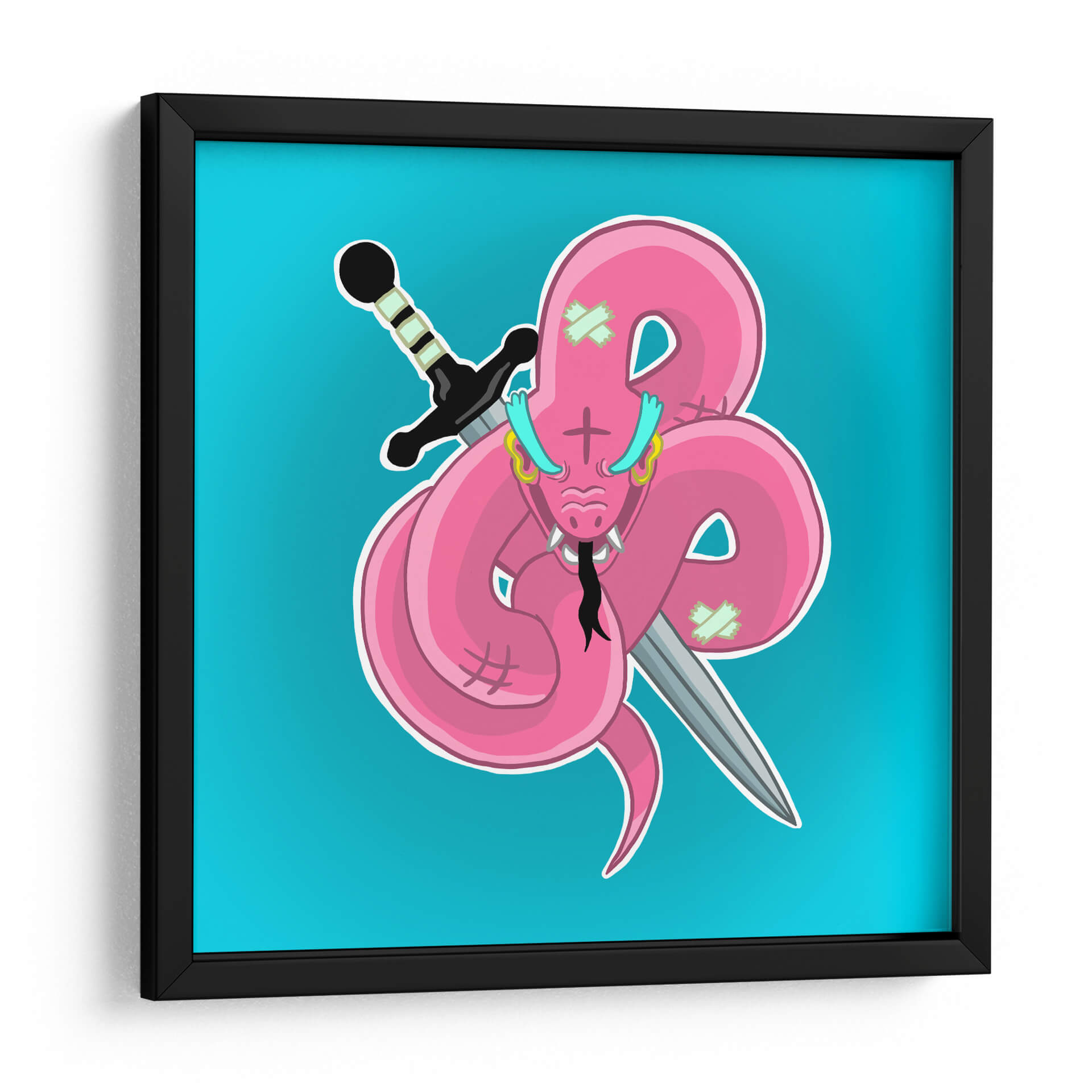Sumérgete en el enigmático mundo de "Sword Snake", una obra de arte digital que fusiona lo audaz con lo juguetón. Este cautivador cuadro decorativo presenta una serpiente estilizada de color rosa vibrante, enrollada con gracia y atravesada por una espada de diseño clásico. La paleta de colores, dominada por el rosa intenso de la serpiente y el azul cerúleo del fondo, crea un contraste llamativo que captura la atención de inmediato. Detalles sutiles como los vendajes, los anillos en las orejas y la lengua bífida asomando añaden un toque de personalidad única a la criatura. La composición es dinámica y equilibrada, con la serpiente y la espada interactuando en un baile visual que evoca tanto peligro como intriga. "Sword Snake" es ideal para añadir un toque de carácter y conversación a cualquier espacio moderno, ya sea una sala de estar, un estudio o una oficina. Su estilo audaz y contemporáneo lo convierte en una pieza de arte de pared perfecta para aquellos que buscan expresar individualidad y un gusto por lo inesperado. Este cuadro decorativo de diseño único, creado por el artista Ash, es más que una simple imagen; es una declaración de estilo que transformará tus paredes en una galería personal llena de energía y personalidad.