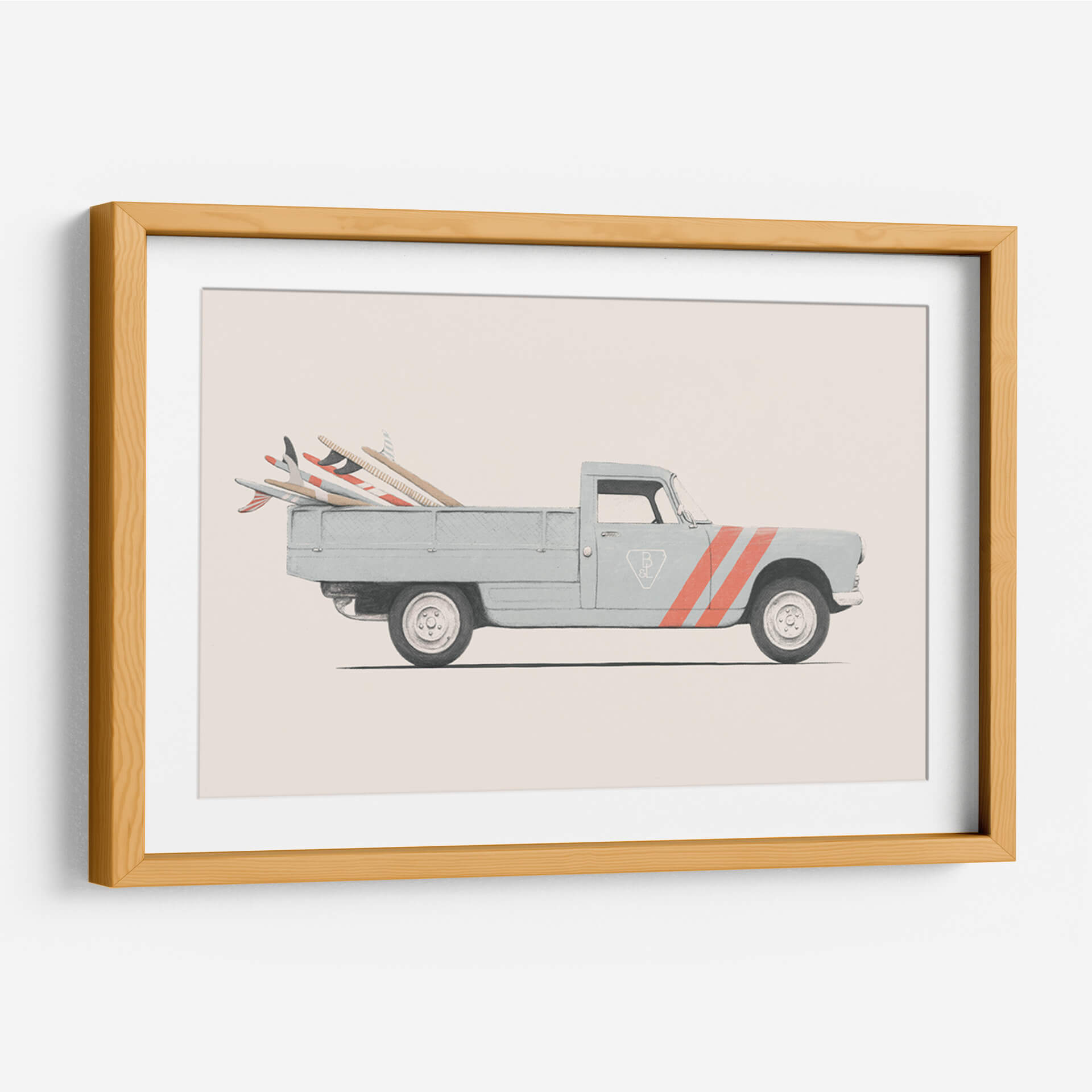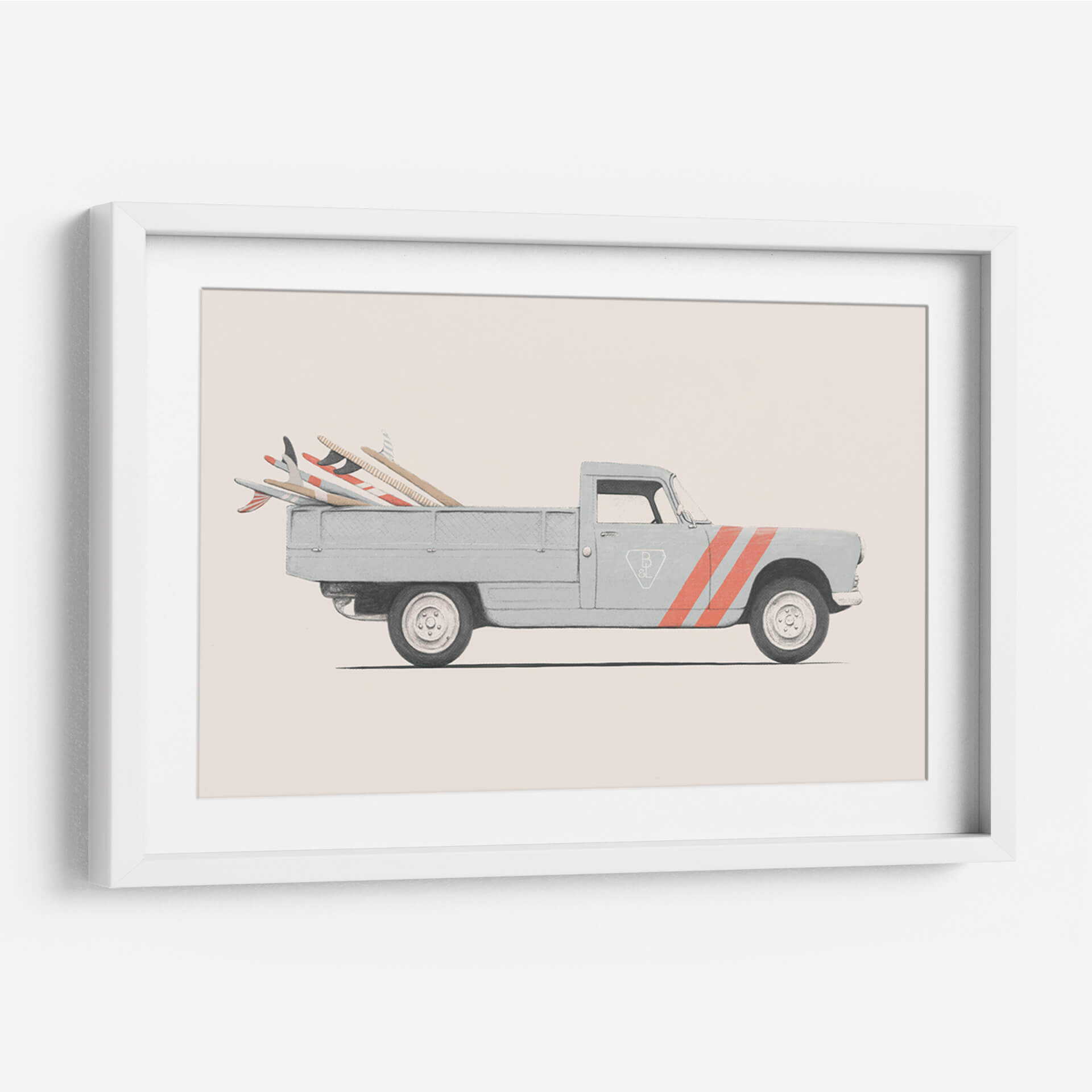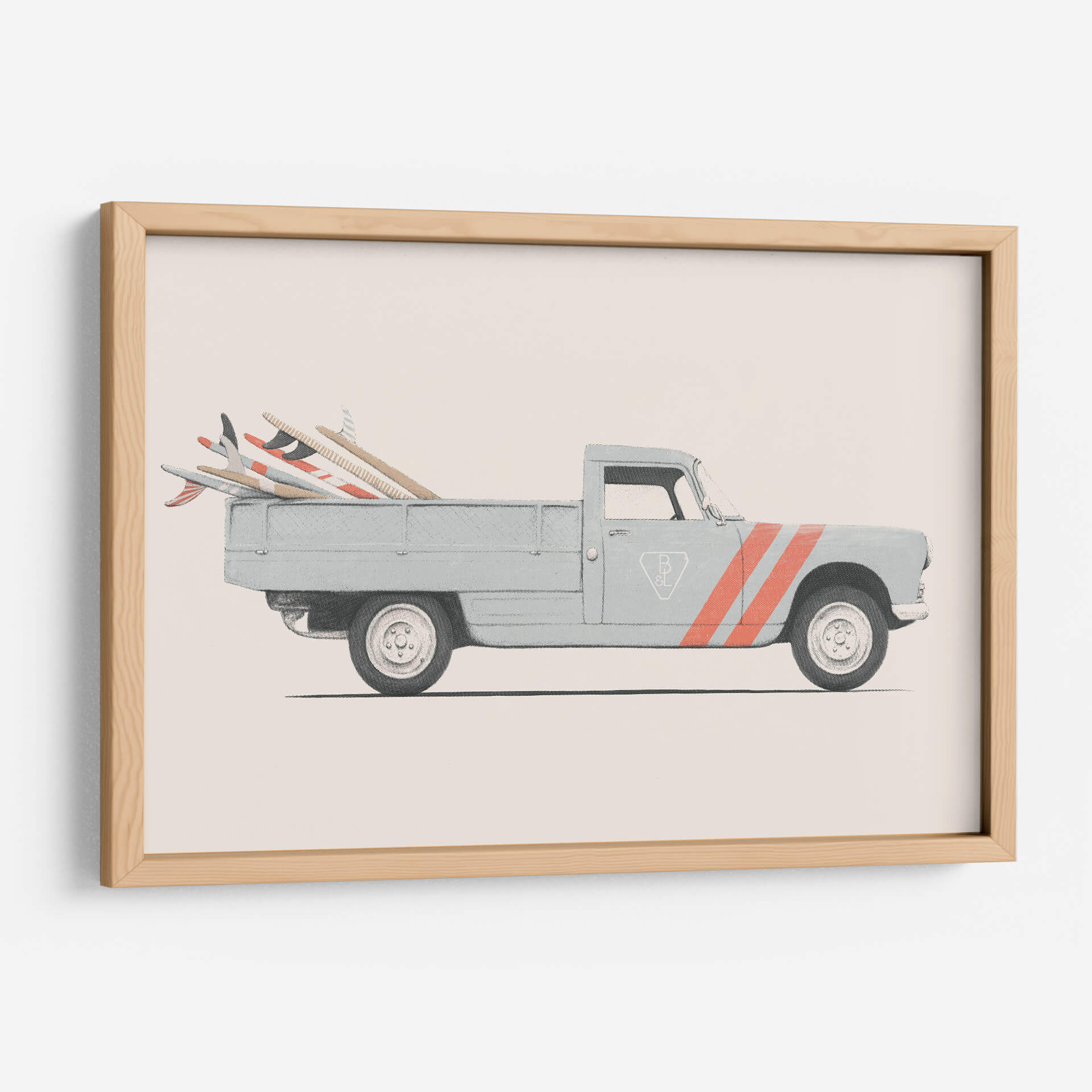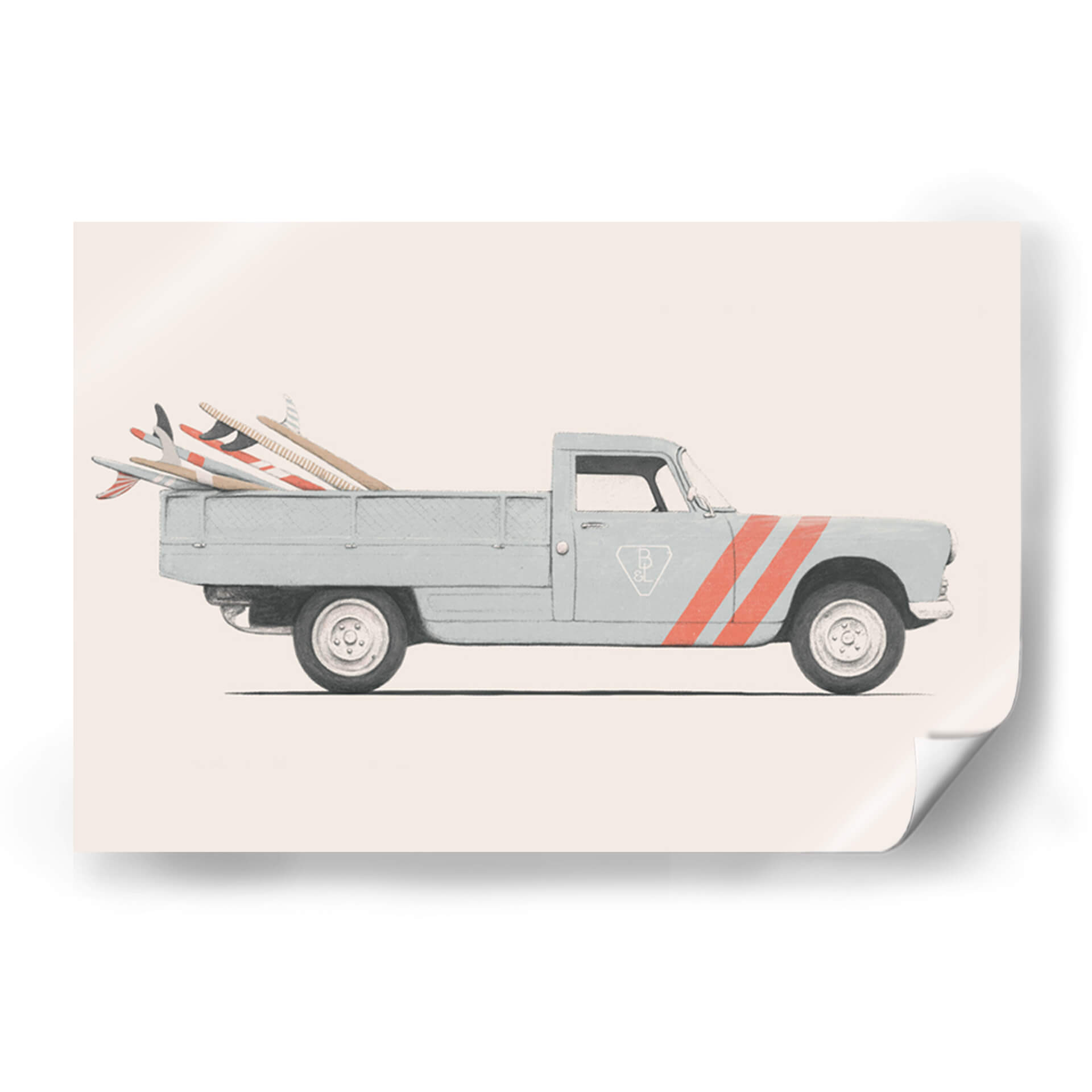 Captura la esencia de la aventura y el estilo retro con este cautivador cuadro decorativo 'Pickup' del artista Florent Bodart. La obra presenta un clásico pickup de color azul pálido, cargado con varias tablas de surf de distintos diseños, listo para emprender un viaje hacia el mar. La paleta de colores, dominada por tonos neutros y el suave azul del vehículo, contrasta sutilmente con las vibrantes rayas naranjas que adornan la puerta, añadiendo un toque de energía y dinamismo. El estilo gráfico y limpio de Bodart resalta la iconicidad del vehículo y las tablas, creando una atmósfera nostálgica y de escapada. Este cuadro decorativo es perfecto para espacios que buscan un aire relajado y veraniego, como una sala de estar, un estudio o incluso una habitación temática de playa. Su composición equilibrada y su evocadora temática lo convierten en una pieza ideal para añadir personalidad y un toque de buen rollo a cualquier decoración moderna o vintage. Transmite una sensación de libertad y la promesa de días soleados, invitando a soñar con horizontes lejanos y olas perfectas. Una obra de arte que evoca recuerdos y despierta el deseo de exploración, perfecta para amantes del surf y la estética retro.